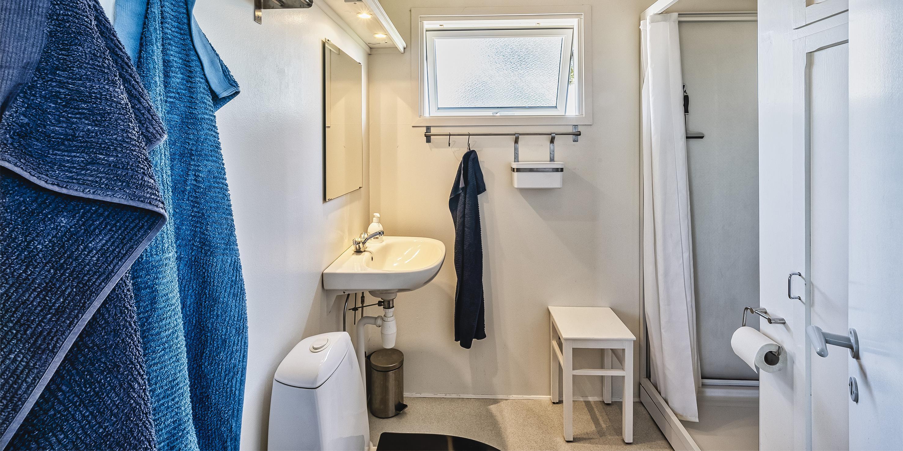 Badezimmer mit Toilette, Dusche und Waschbecken