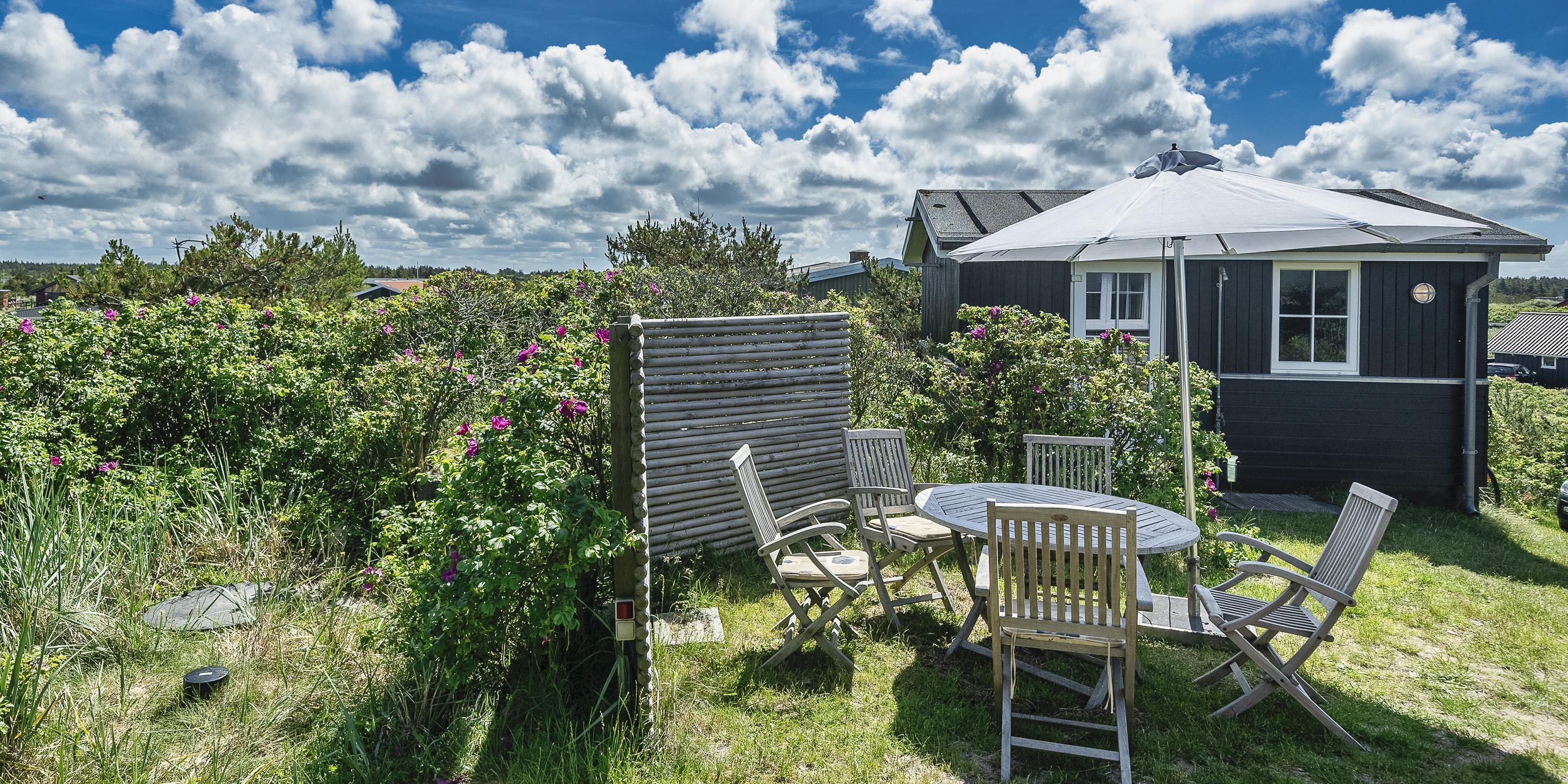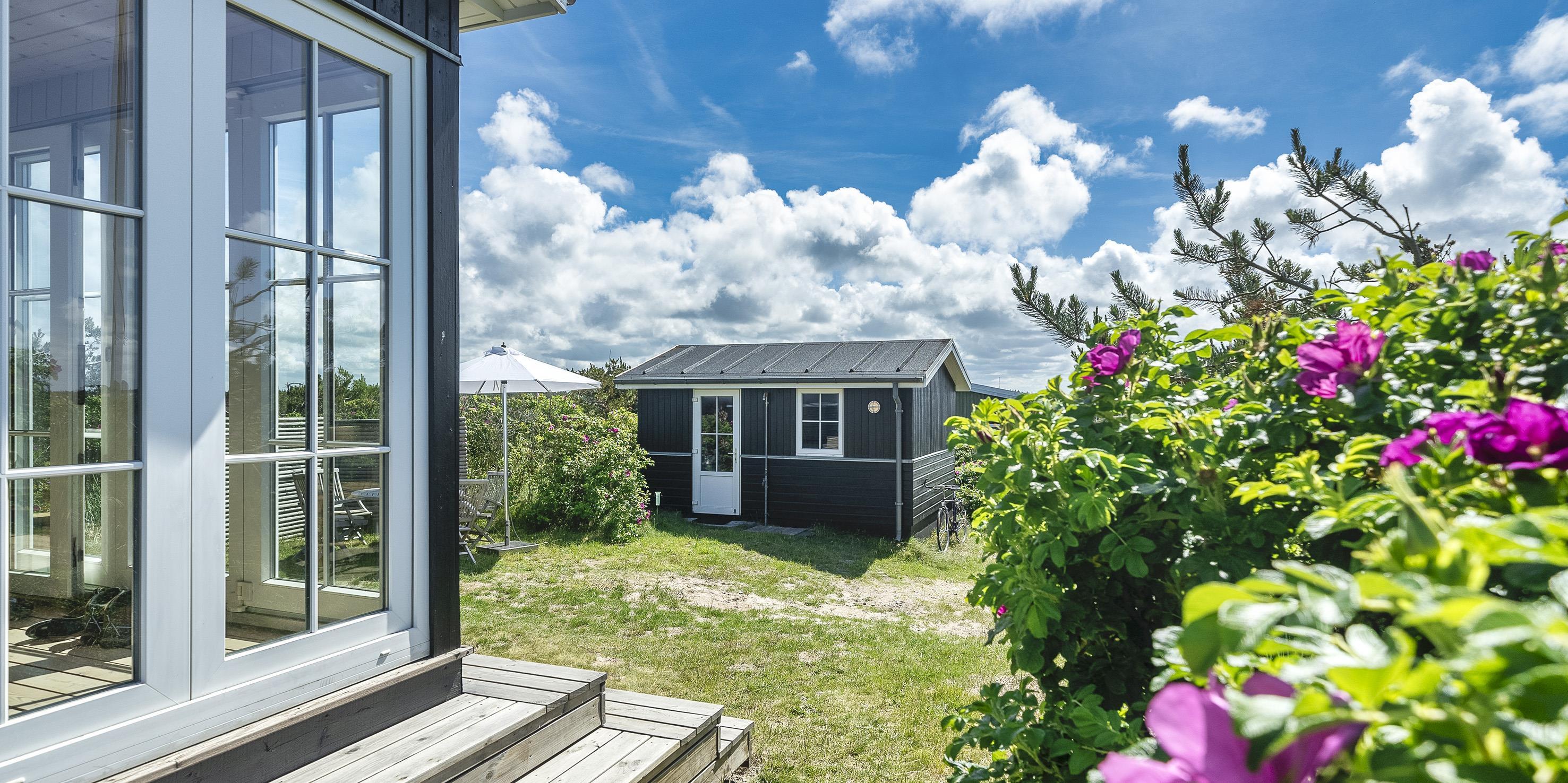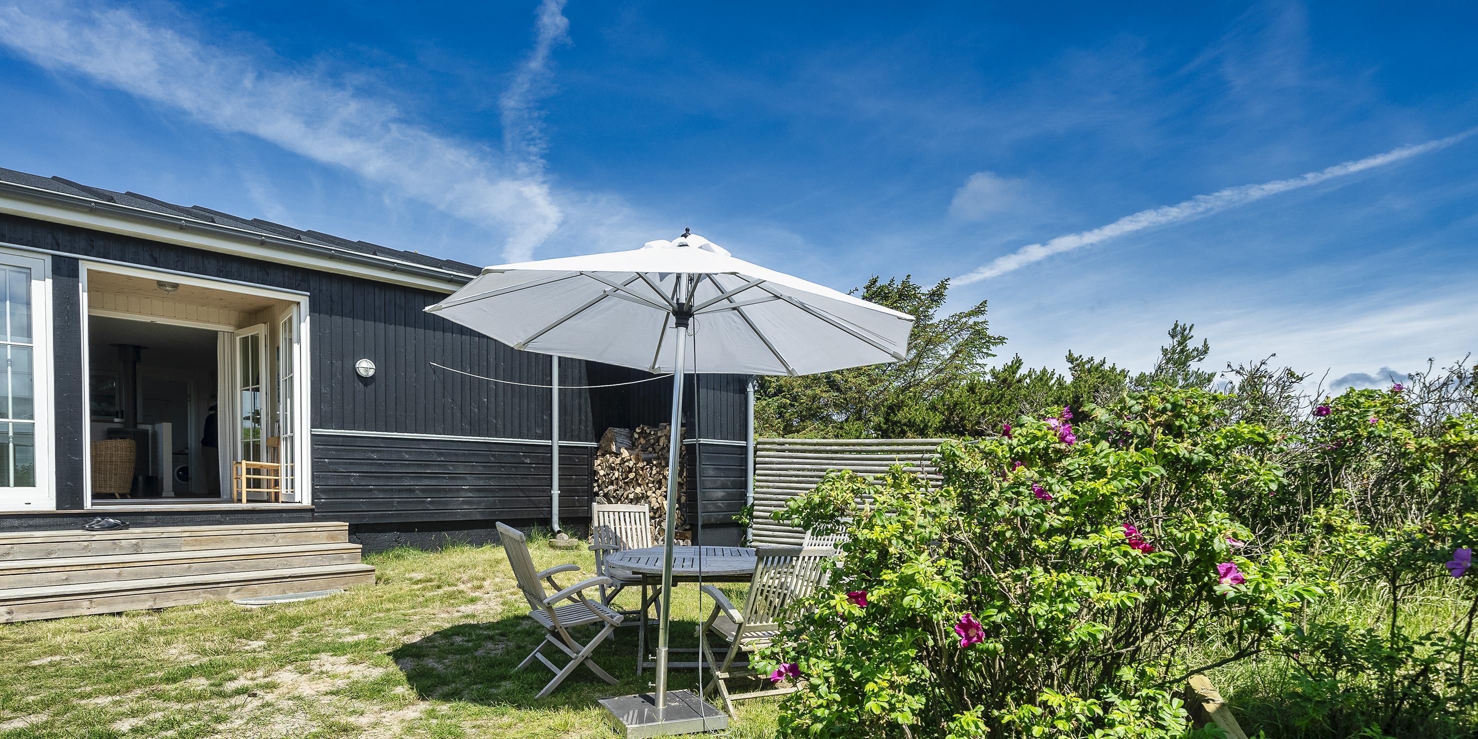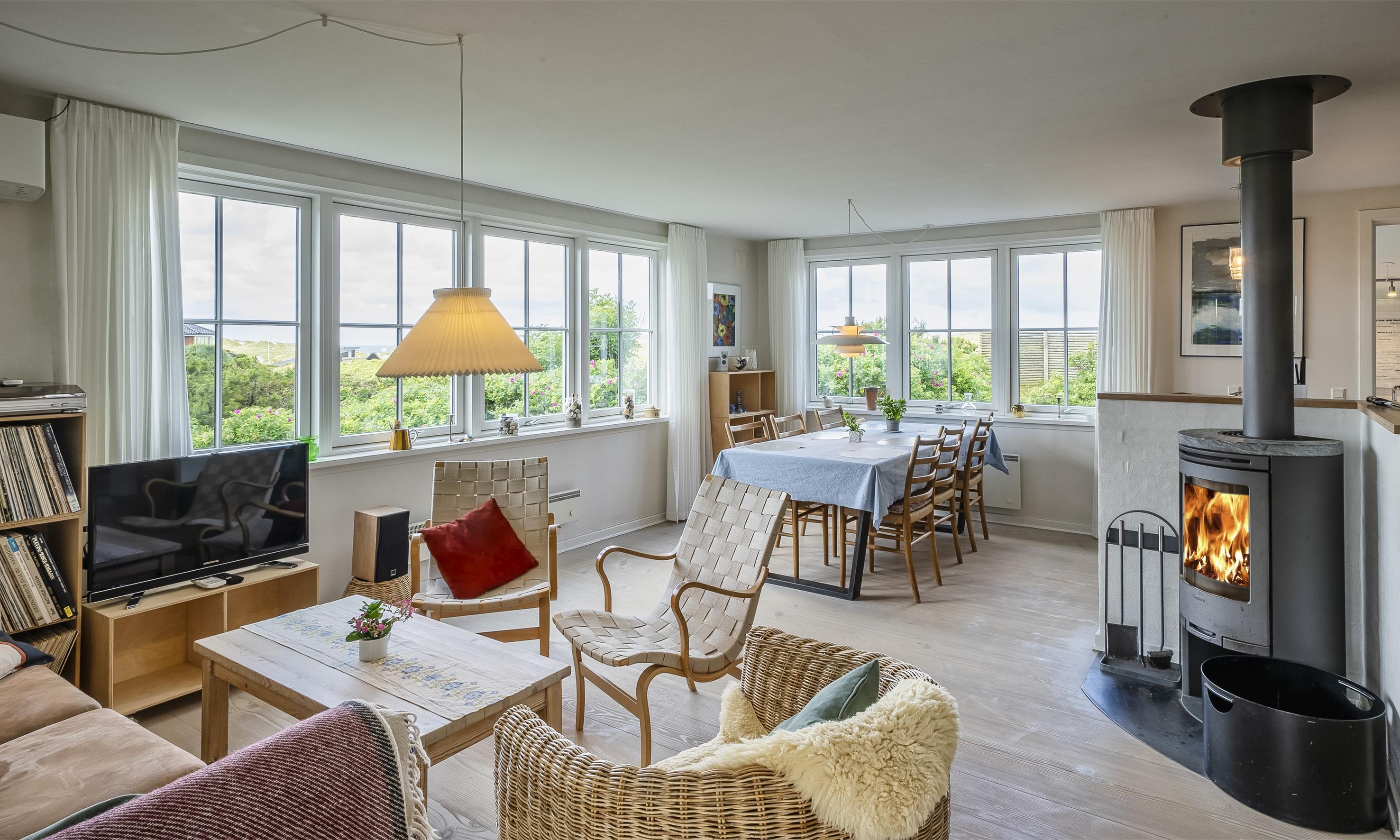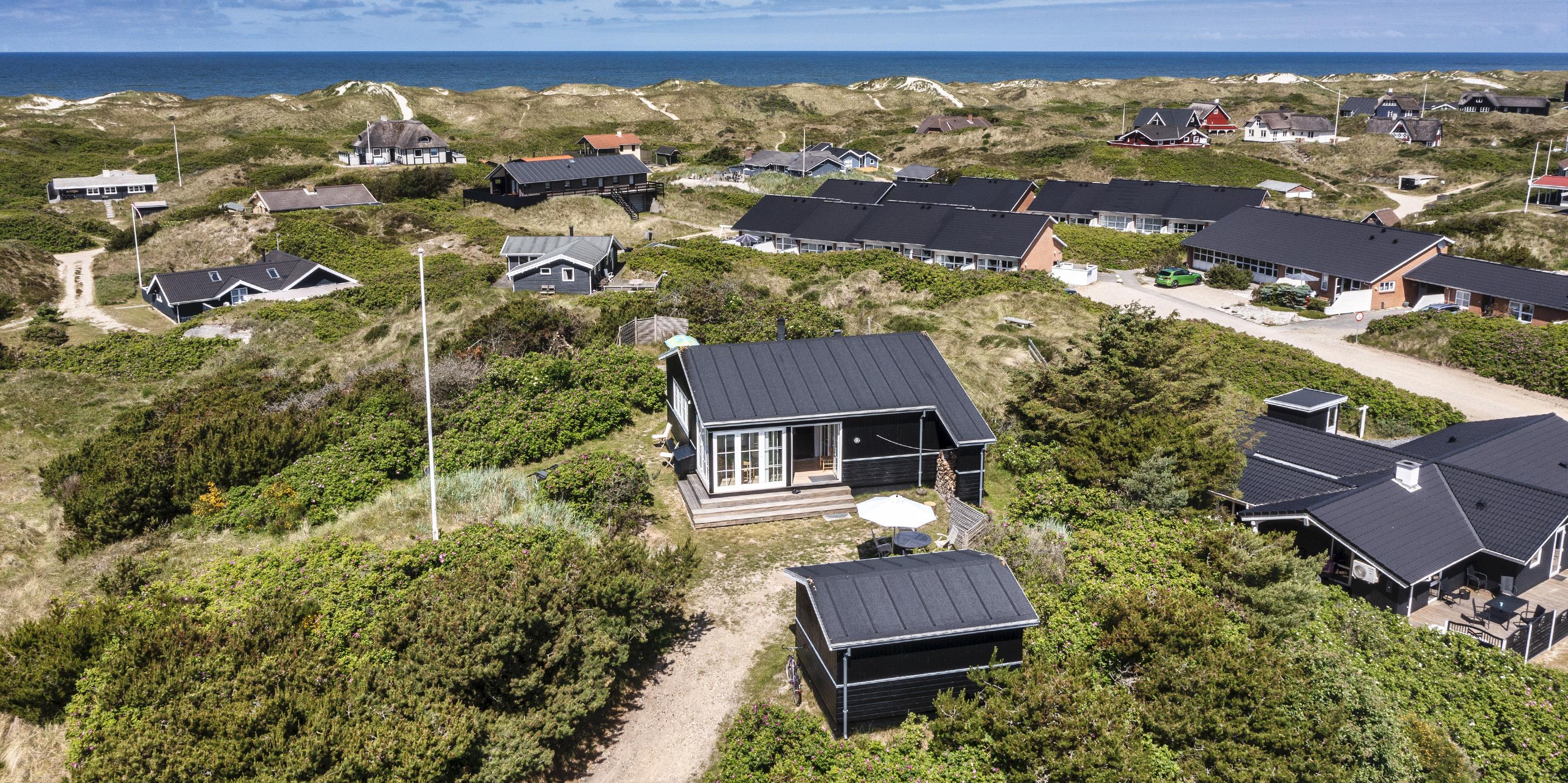 Auf einer Düne liegt dieses kleine dänisch eingerichtete Ferienhaus für 6 Personen und nur 150 Meter vom Strand entfernt. Das Ferienhaus liegt völlig ungestört und hier haben Sie vom Wohnzimmer aus einen wundervollen Meeresblick. Der Wintergarten, der noch mit schönen Holzdielen belegt ist, hat grosse Schiebetüren, wobei eine schöne warme Brise in lauer Sommernacht durch das Haus fluten kann. Die Wohnkücke ist mit dem grosszügige Wohn- und Esszimmer integriert. Vom Wohnbereich aus, kann man das Feuer im Kamin lodern sehen. Dies bringt eine wohlige Wärme ins Ferienhaus. Es befindet sich eine Warmepumpe im Ferienhaus. Mit dieser Warmepumpe haben sie die Möglichkeit die Stromkosten zu senken, denn die Warmepumpe ist energiesparend. Deutsche Fernsehprogramme werden über eine Parabol-Antenne empfangen sowie auch Chrome cash. Da ist ein Grammofon. Das Fernsehgerät hat einen HDMI-Empfang für einen Computer und Drucker. Die offene Wohnküche verfügt über einen Herd mit Cerankochfeld, einem Backofen, einen Geschirrspüler und einem Kühlschrank. Ein kleiner zusätzlicher Gefrierschrank befindet sich im Schuppen. 3 Schlafzimmer: DB + DB + 2B. Hinter dem Essbereich gelangen Sie durch eine Tür zum Hauswirtschaftsraum und dem Ausgang zur Terrasse. Die Waschmaschine befindet sich hier im Hauswirtschaftsraum. Von hier gelangen Sie dann auch in das Badezimmer, mit Dusche, WC, und einem Handwaschbecken. Hinter dem Haus befindet sich dann die Terrasse und eine gemütliche Sitzgruppe zwischen den Hagebutten-Sträuchern. Über einen weiteren Auskuck können Sie das Meer erblicken und auch über einen Teil des Ferienhausgebietes. Desweiteren befindet sich ein Gästehaus auf dem Grundstück das mit einer Sauna mit ca. 17 qm, dem Trockner und als Abstellraum gedacht ist. Zusätzliche befindet sich dort eine aussen gelegene Dusche (nur mit kaltes Wasser). Rauchen ist nicht erlaubt. Internetanschluss (W-Lan) auch verfügbar. Es sind max. 2 Haustiere erlaubt.Es stehen den Gästen 2 Fahrräder am Ferienhaus zur Verfügung, wobei wir keine Haftung übernehmen bezüglich der Benutzung und Brauchbarkeit. Ferienhaus ist 2007 erbaut worden.