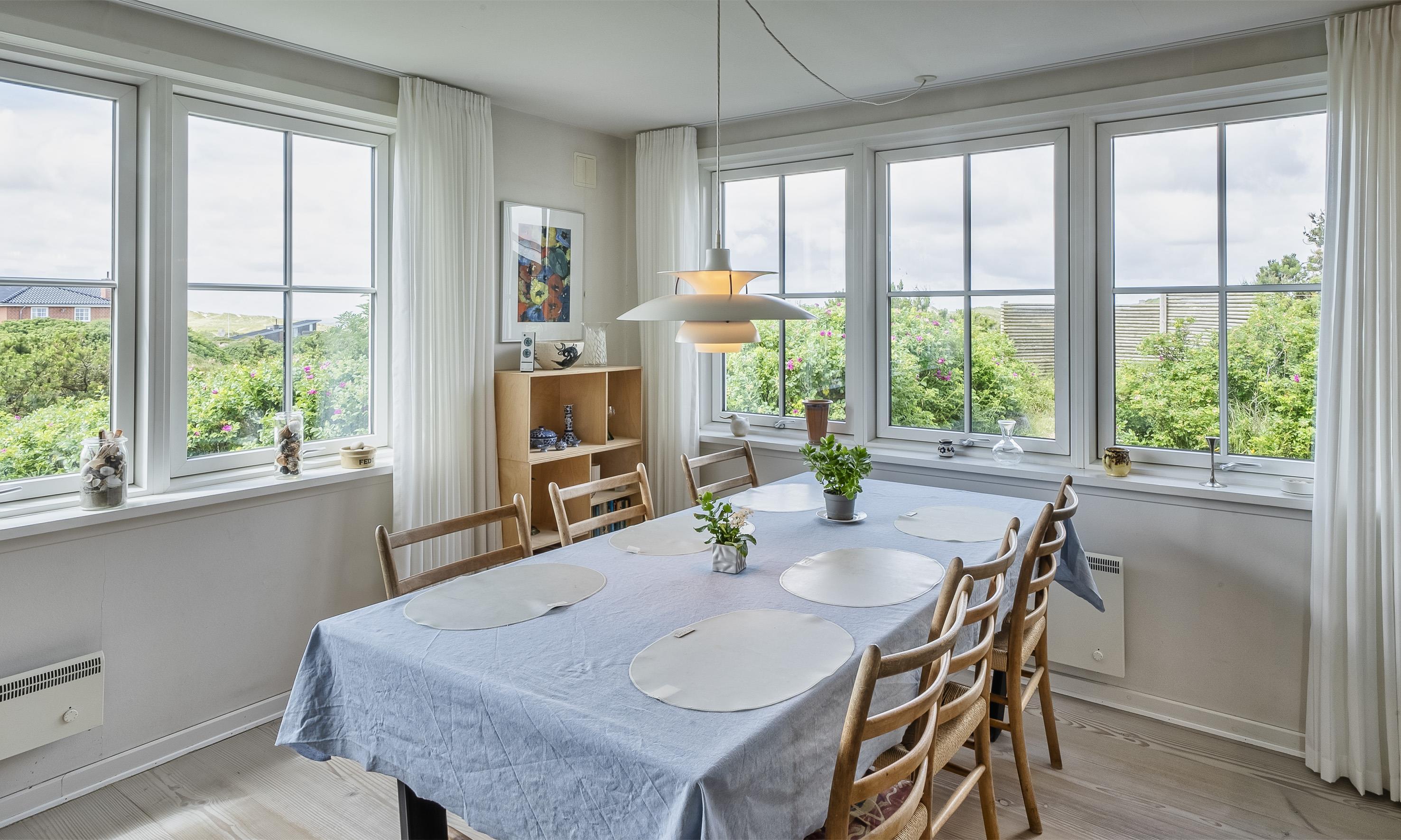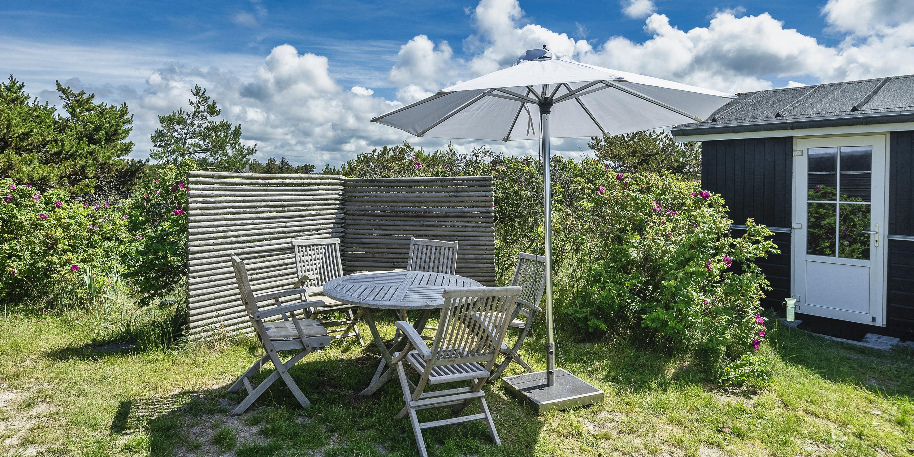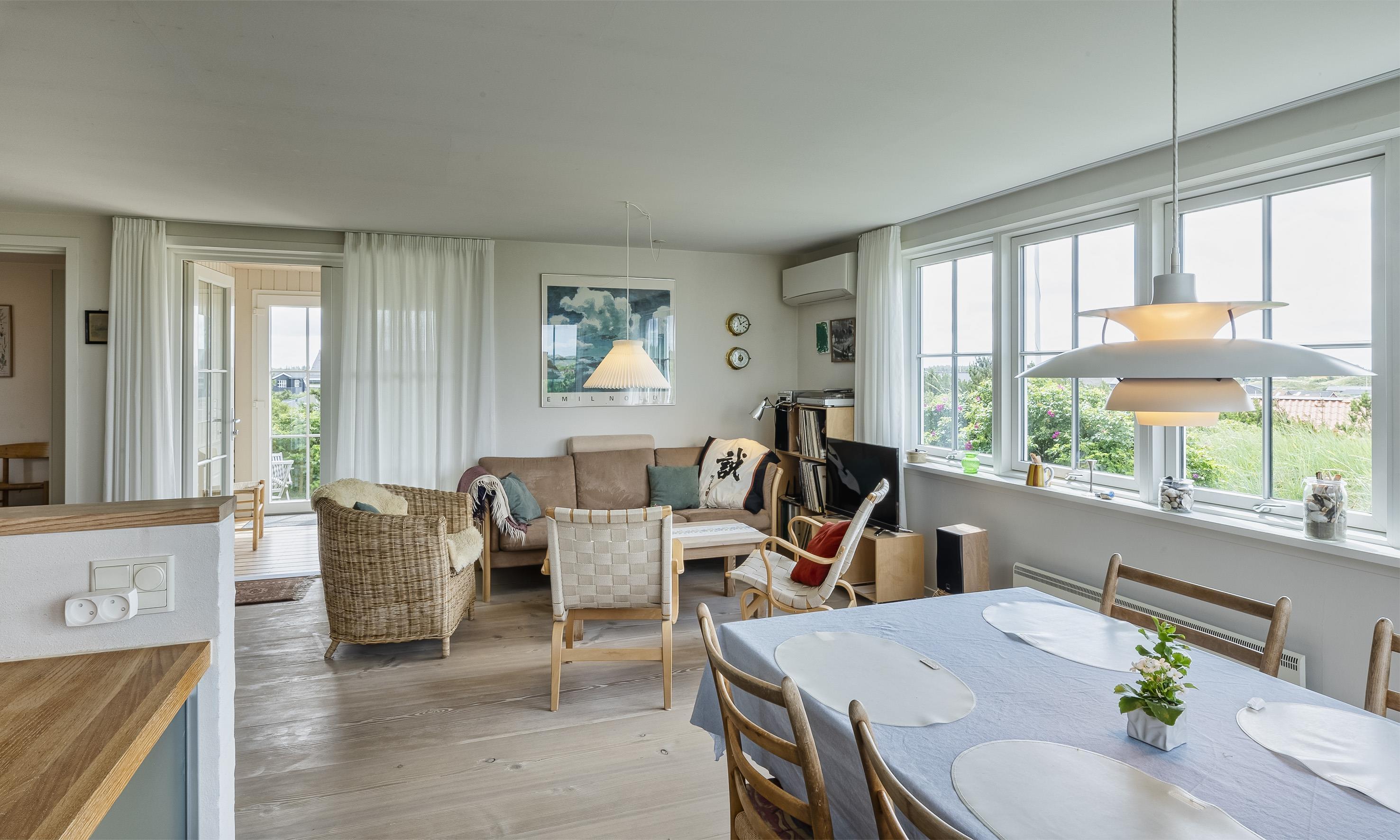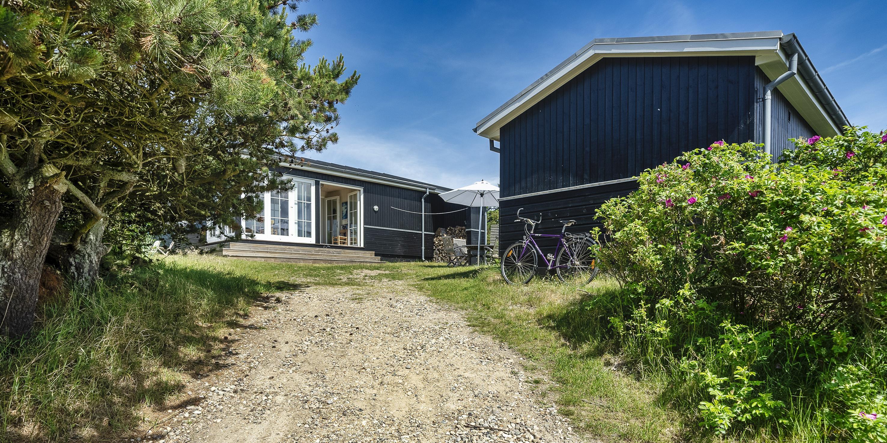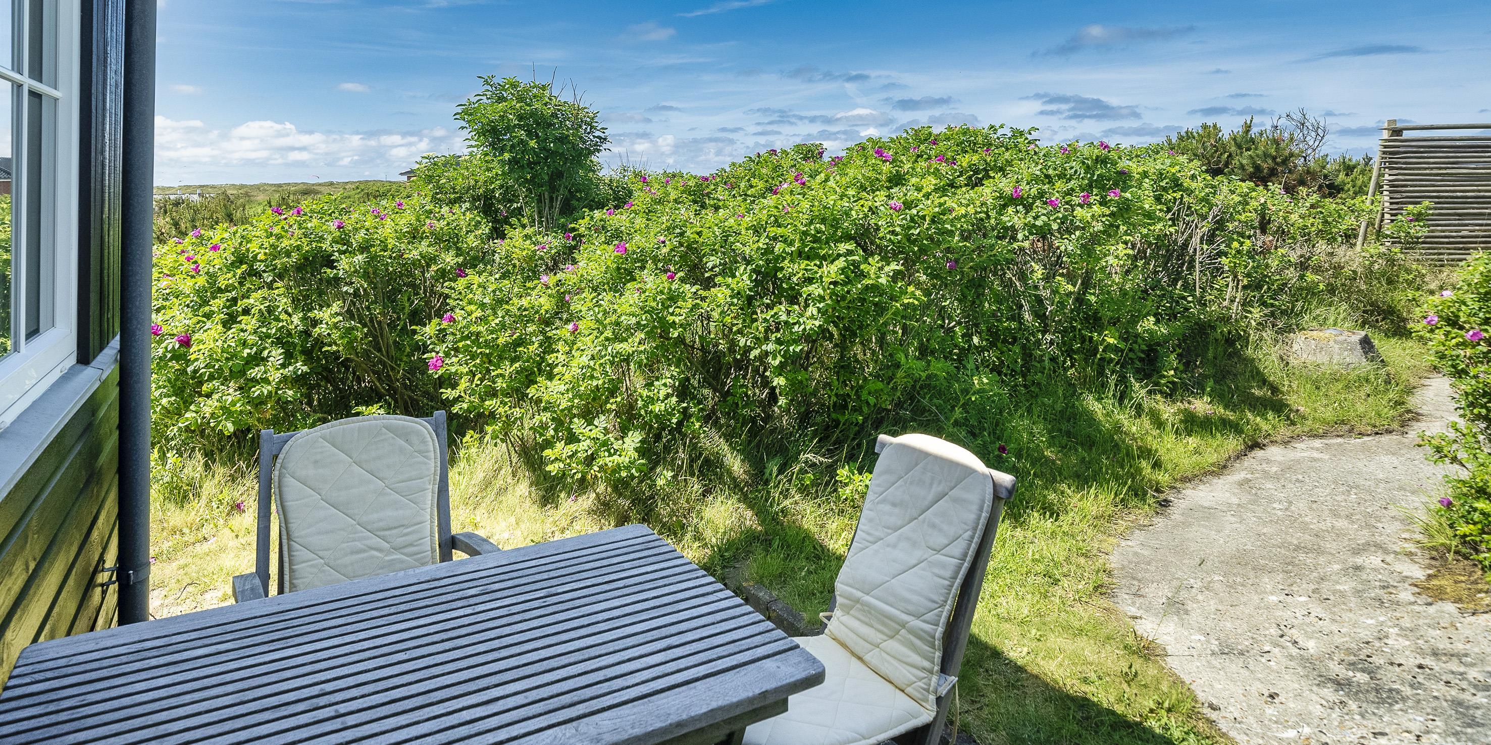 Auf einer Düne liegt dieses kleine dänisch eingerichtete Ferienhaus für 6 Personen und nur 150 Meter vom Strand entfernt. Das Ferienhaus liegt völlig ungestört und hier haben Sie vom Wohnzimmer aus einen wundervollen Meeresblick. Der Wintergarten, der noch mit schönen Holzdielen belegt ist, hat grosse Schiebetüren, wobei eine schöne warme Brise in lauer Sommernacht durch das Haus fluten kann. Die Wohnkücke ist mit dem grosszügige Wohn- und Esszimmer integriert. Vom Wohnbereich aus, kann man das Feuer im Kamin lodern sehen. Dies bringt eine wohlige Wärme ins Ferienhaus. Es befindet sich eine Warmepumpe im Ferienhaus. Mit dieser Warmepumpe haben sie die Möglichkeit die Stromkosten zu senken, denn die Warmepumpe ist energiesparend. Deutsche Fernsehprogramme werden über eine Parabol-Antenne empfangen sowie auch Chrome cash. Da ist ein Grammofon. Das Fernsehgerät hat einen HDMI-Empfang für einen Computer und Drucker. Die offene Wohnküche verfügt über einen Herd mit Cerankochfeld, einem Backofen, einen Geschirrspüler und einem Kühlschrank. Ein kleiner zusätzlicher Gefrierschrank befindet sich im Schuppen. 3 Schlafzimmer: DB + DB + 2B. Hinter dem Essbereich gelangen Sie durch eine Tür zum Hauswirtschaftsraum und dem Ausgang zur Terrasse. Die Waschmaschine befindet sich hier im Hauswirtschaftsraum. Von hier gelangen Sie dann auch in das Badezimmer, mit Dusche, WC, und einem Handwaschbecken. Hinter dem Haus befindet sich dann die Terrasse und eine gemütliche Sitzgruppe zwischen den Hagebutten-Sträuchern. Über einen weiteren Auskuck können Sie das Meer erblicken und auch über einen Teil des Ferienhausgebietes. Desweiteren befindet sich ein Gästehaus auf dem Grundstück das mit einer Sauna mit ca. 17 qm, dem Trockner und als Abstellraum gedacht ist. Zusätzliche befindet sich dort eine aussen gelegene Dusche (nur mit kaltes Wasser). Rauchen ist nicht erlaubt. Internetanschluss (W-Lan) auch verfügbar. Es sind max. 2 Haustiere erlaubt.Es stehen den Gästen 2 Fahrräder am Ferienhaus zur Verfügung, wobei wir keine Haftung übernehmen bezüglich der Benutzung und Brauchbarkeit. Ferienhaus ist 2007 erbaut worden.