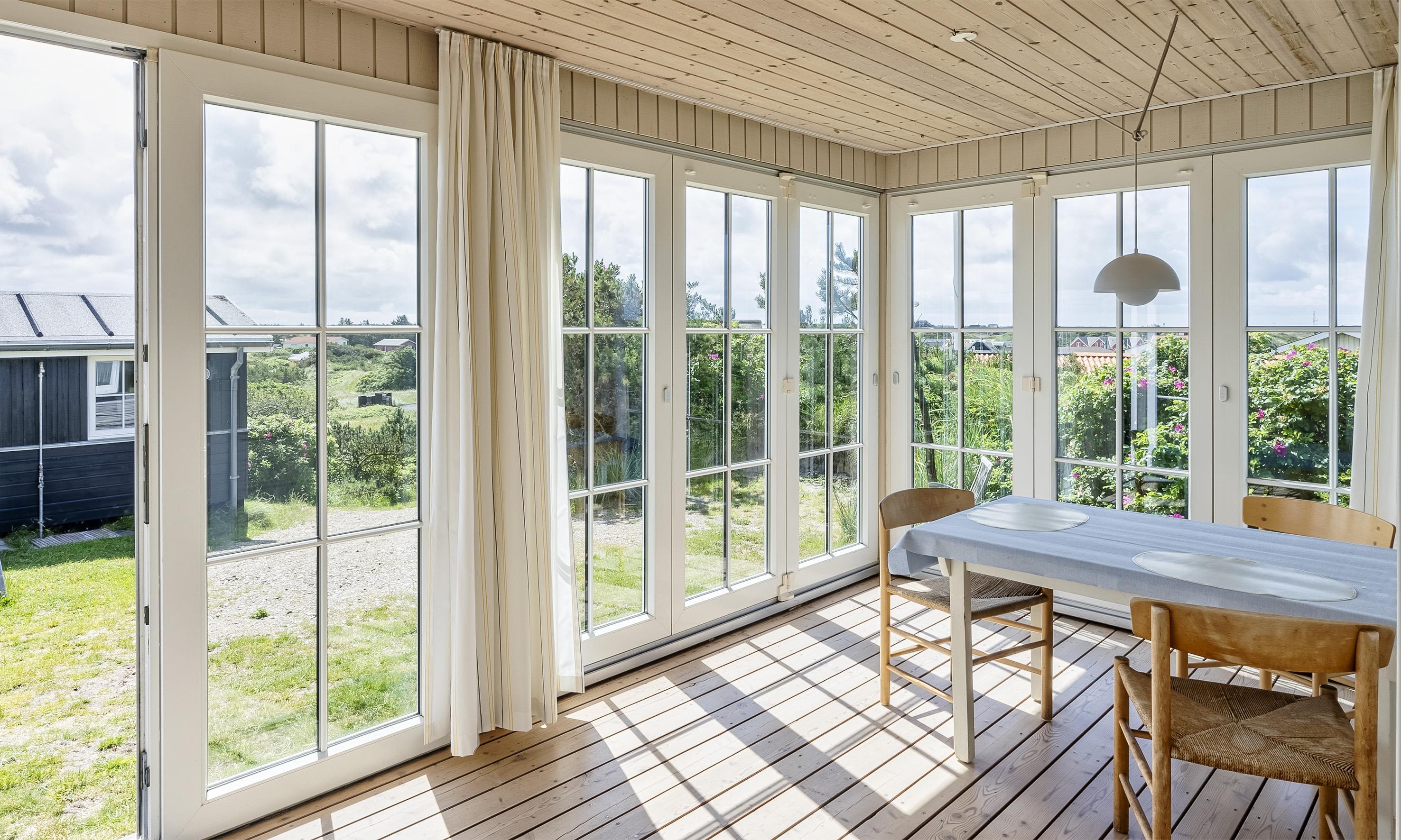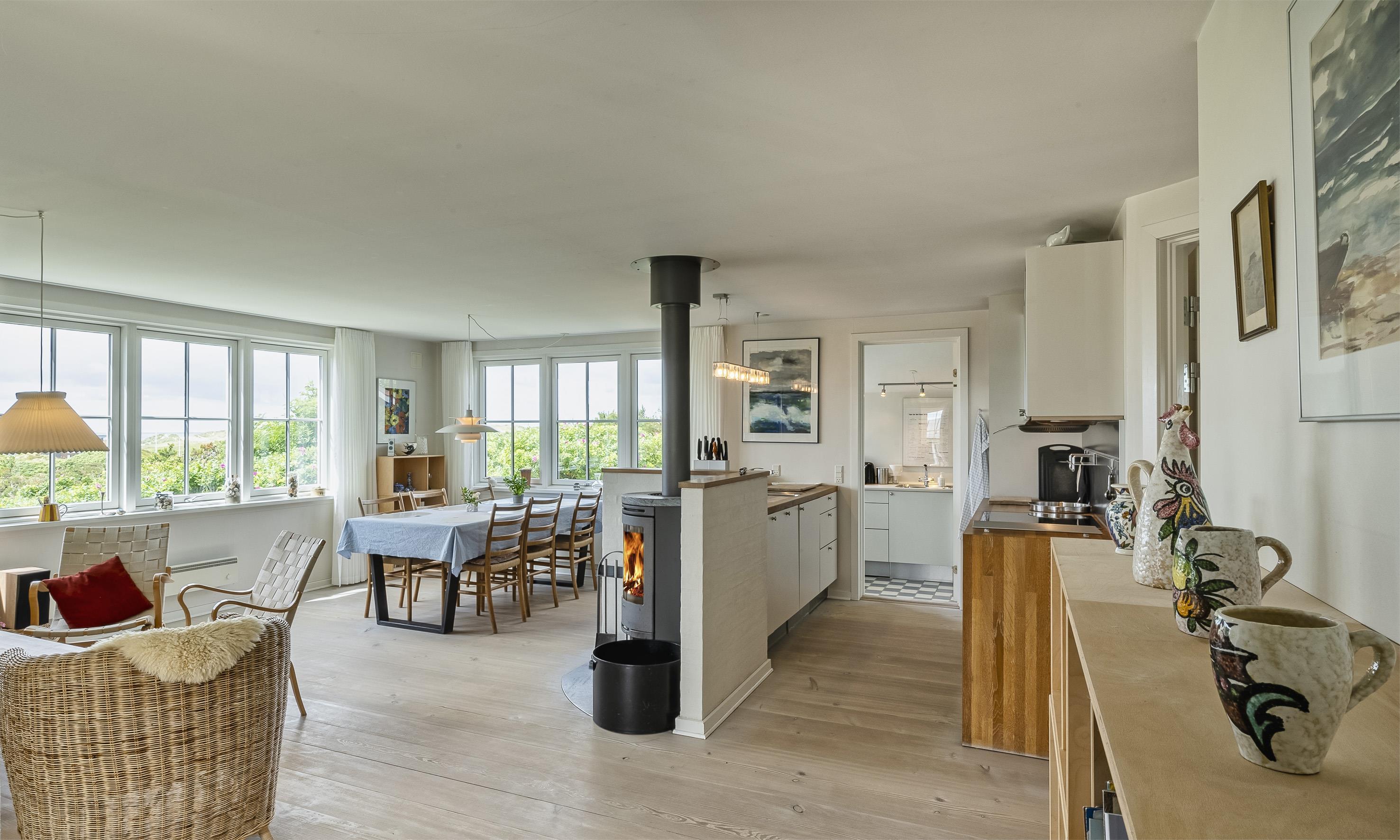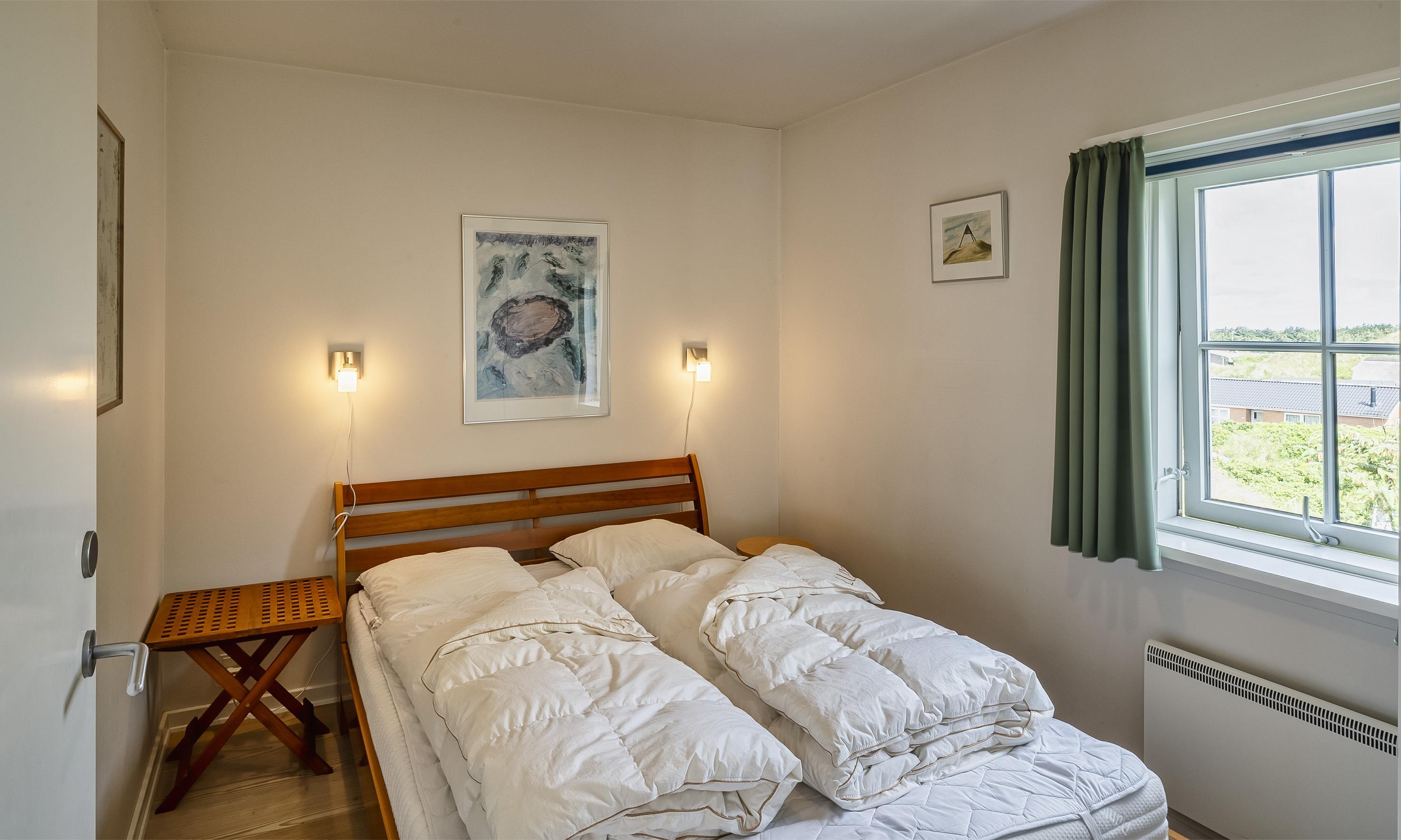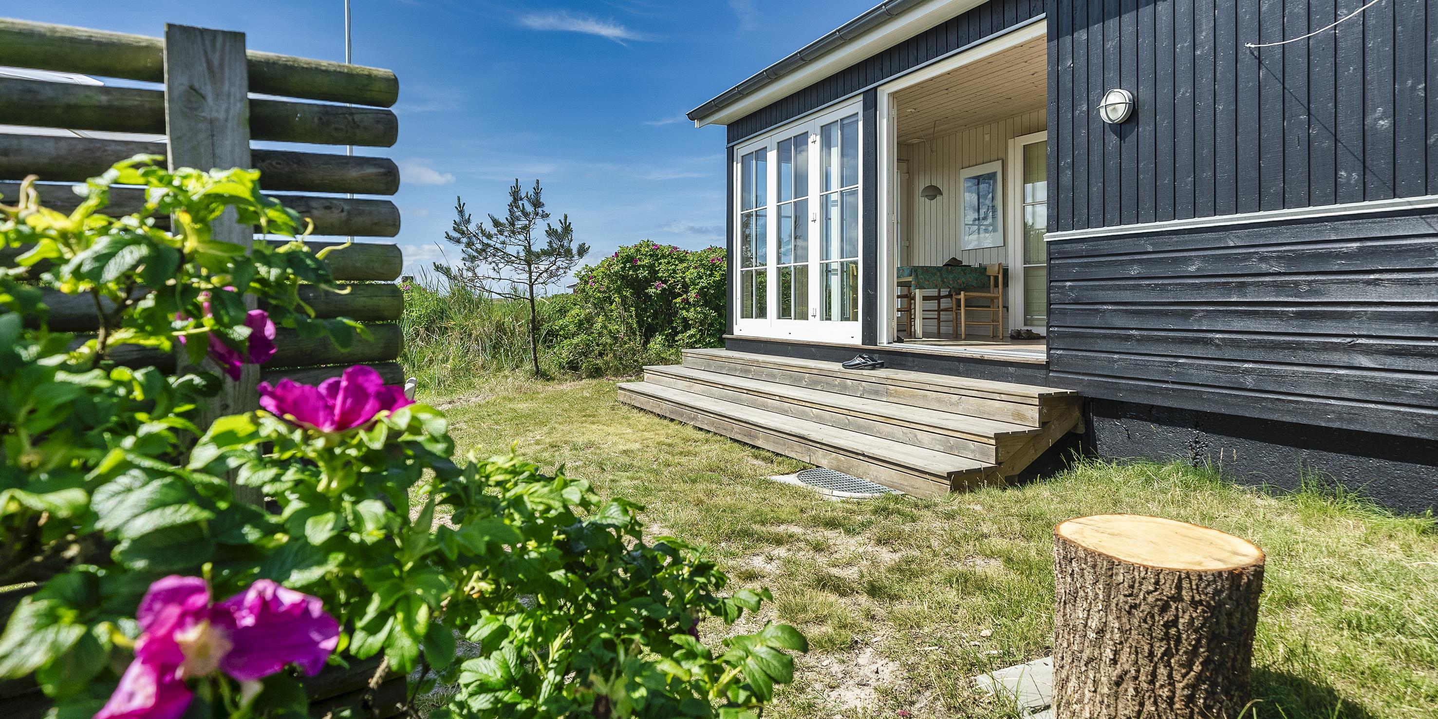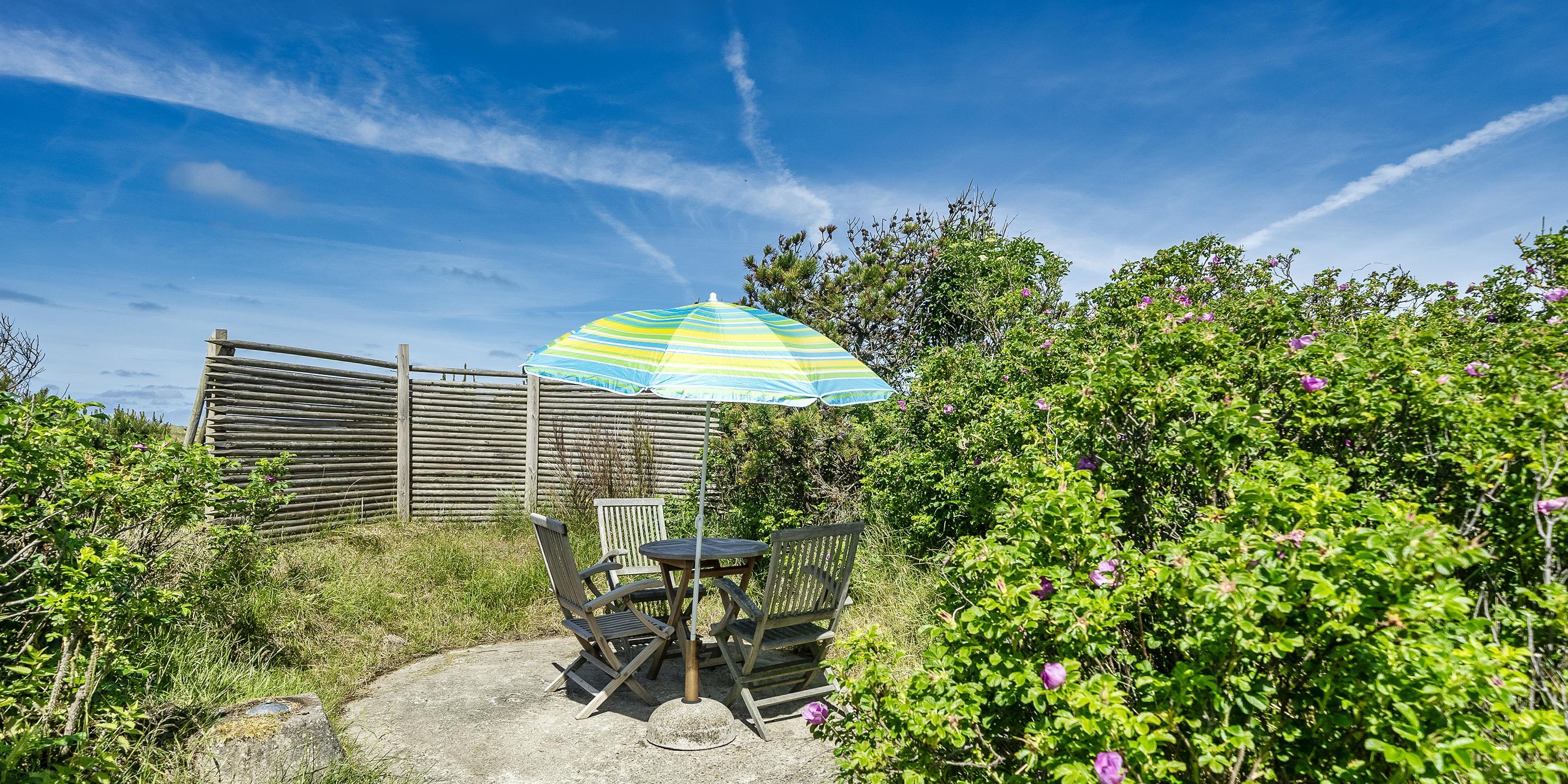 Auf einer Düne liegt dieses kleine dänisch eingerichtete Ferienhaus für 6 Personen und nur 150 Meter vom Strand entfernt. Das Ferienhaus liegt völlig ungestört und hier haben Sie vom Wohnzimmer aus einen wundervollen Meeresblick. Der Wintergarten, der noch mit schönen Holzdielen belegt ist, hat grosse Schiebetüren, wobei eine schöne warme Brise in lauer Sommernacht durch das Haus fluten kann. Die Wohnkücke ist mit dem grosszügige Wohn- und Esszimmer integriert. Vom Wohnbereich aus, kann man das Feuer im Kamin lodern sehen. Dies bringt eine wohlige Wärme ins Ferienhaus. Es befindet sich eine Warmepumpe im Ferienhaus. Mit dieser Warmepumpe haben sie die Möglichkeit die Stromkosten zu senken, denn die Warmepumpe ist energiesparend. Deutsche Fernsehprogramme werden über eine Parabol-Antenne empfangen sowie auch Chrome cash. Da ist ein Grammofon. Das Fernsehgerät hat einen HDMI-Empfang für einen Computer und Drucker. Die offene Wohnküche verfügt über einen Herd mit Cerankochfeld, einem Backofen, einen Geschirrspüler und einem Kühlschrank. Ein kleiner zusätzlicher Gefrierschrank befindet sich im Schuppen. 3 Schlafzimmer: DB + DB + 2B. Hinter dem Essbereich gelangen Sie durch eine Tür zum Hauswirtschaftsraum und dem Ausgang zur Terrasse. Die Waschmaschine befindet sich hier im Hauswirtschaftsraum. Von hier gelangen Sie dann auch in das Badezimmer, mit Dusche, WC, und einem Handwaschbecken. Hinter dem Haus befindet sich dann die Terrasse und eine gemütliche Sitzgruppe zwischen den Hagebutten-Sträuchern. Über einen weiteren Auskuck können Sie das Meer erblicken und auch über einen Teil des Ferienhausgebietes. Desweiteren befindet sich ein Gästehaus auf dem Grundstück das mit einer Sauna mit ca. 17 qm, dem Trockner und als Abstellraum gedacht ist. Zusätzliche befindet sich dort eine aussen gelegene Dusche (nur mit kaltes Wasser). Rauchen ist nicht erlaubt. Internetanschluss (W-Lan) auch verfügbar. Es sind max. 2 Haustiere erlaubt.Es stehen den Gästen 2 Fahrräder am Ferienhaus zur Verfügung, wobei wir keine Haftung übernehmen bezüglich der Benutzung und Brauchbarkeit. Ferienhaus ist 2007 erbaut worden.