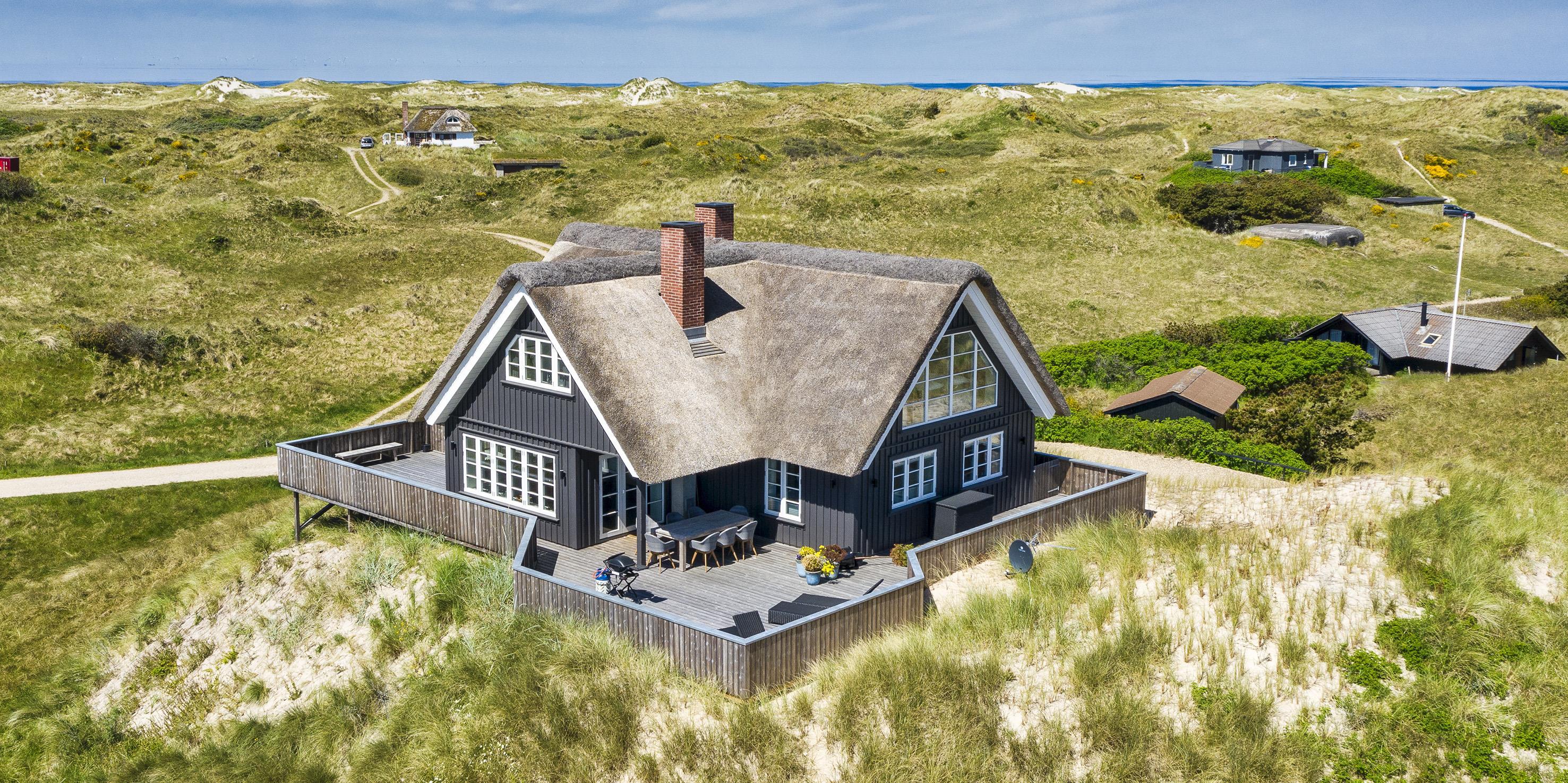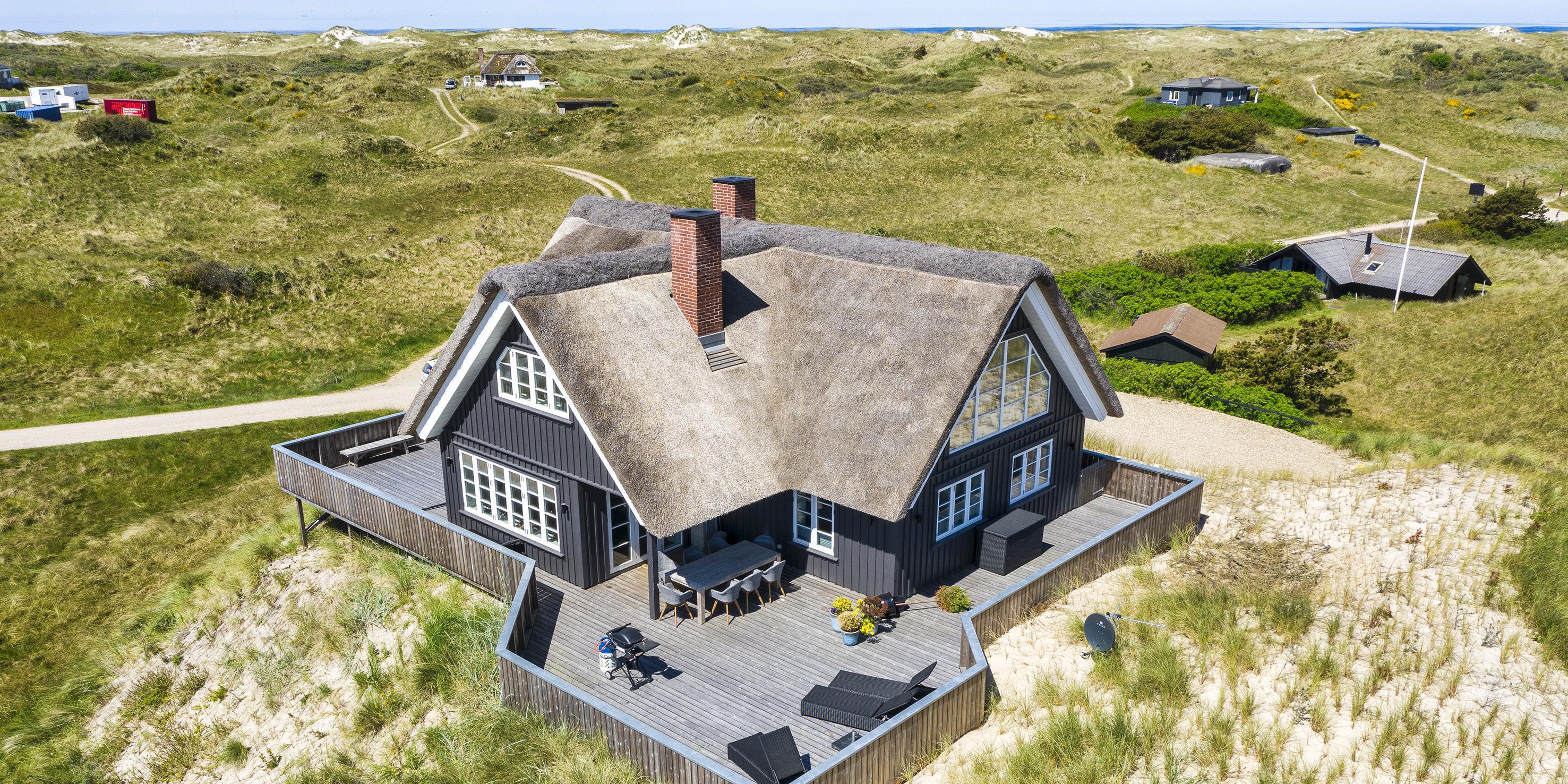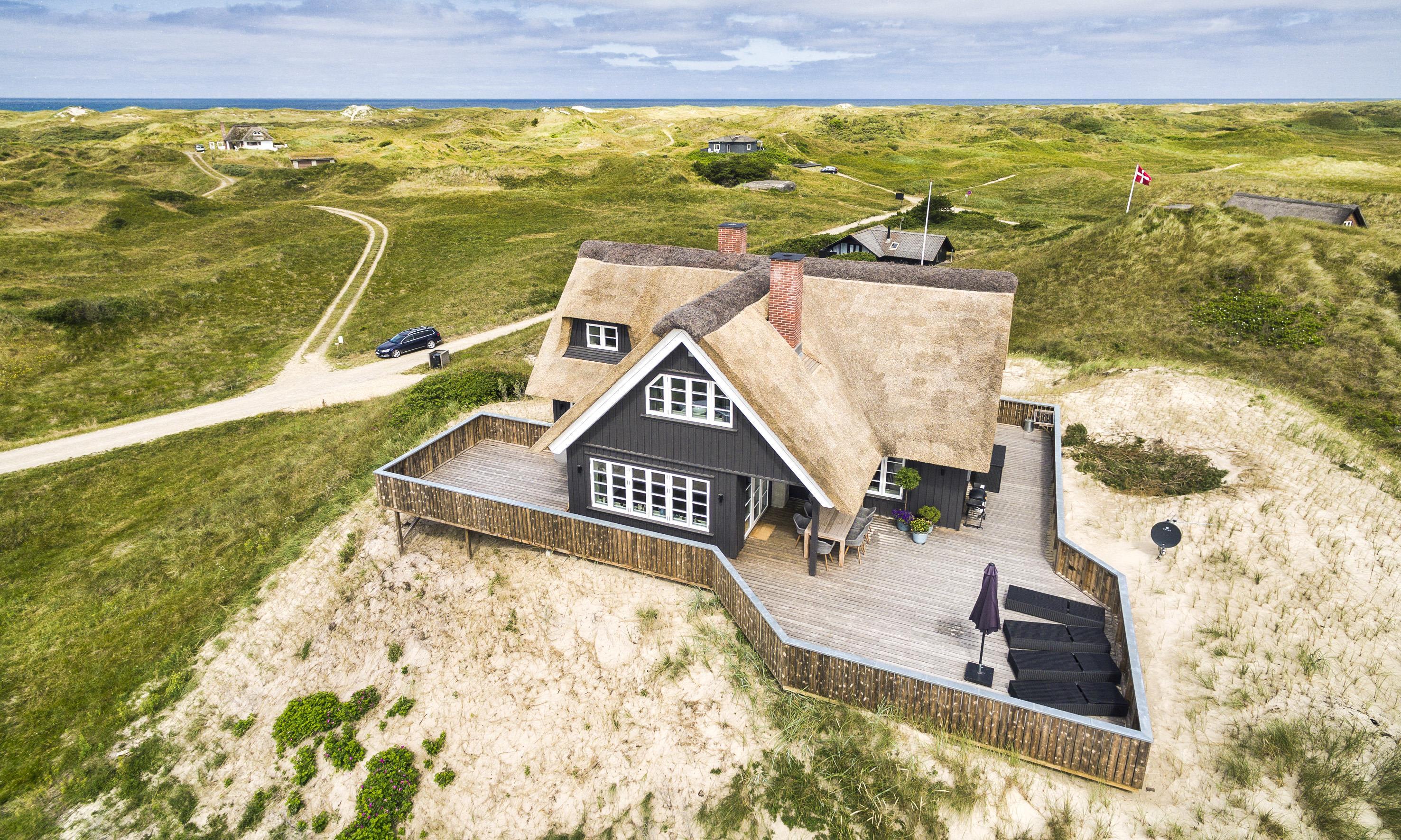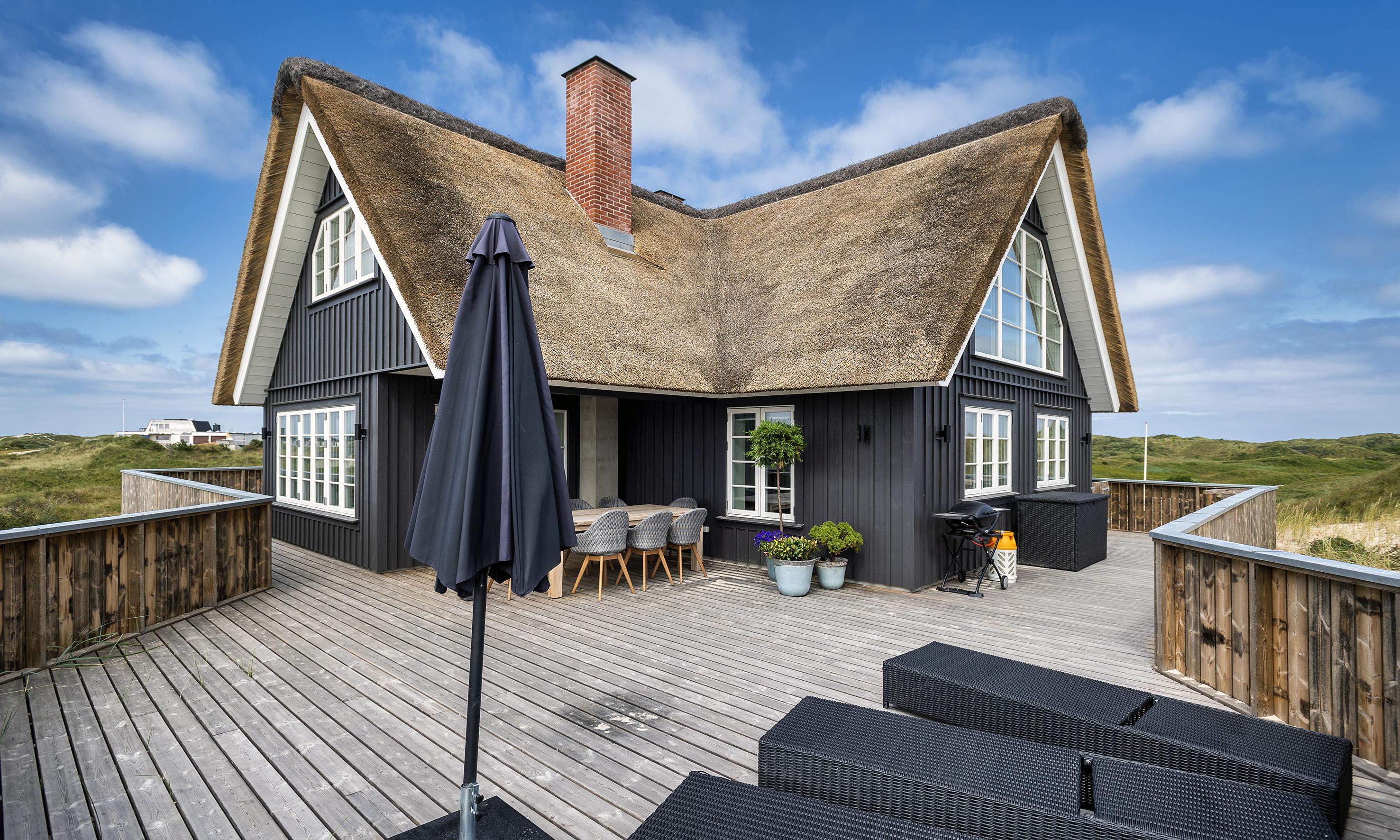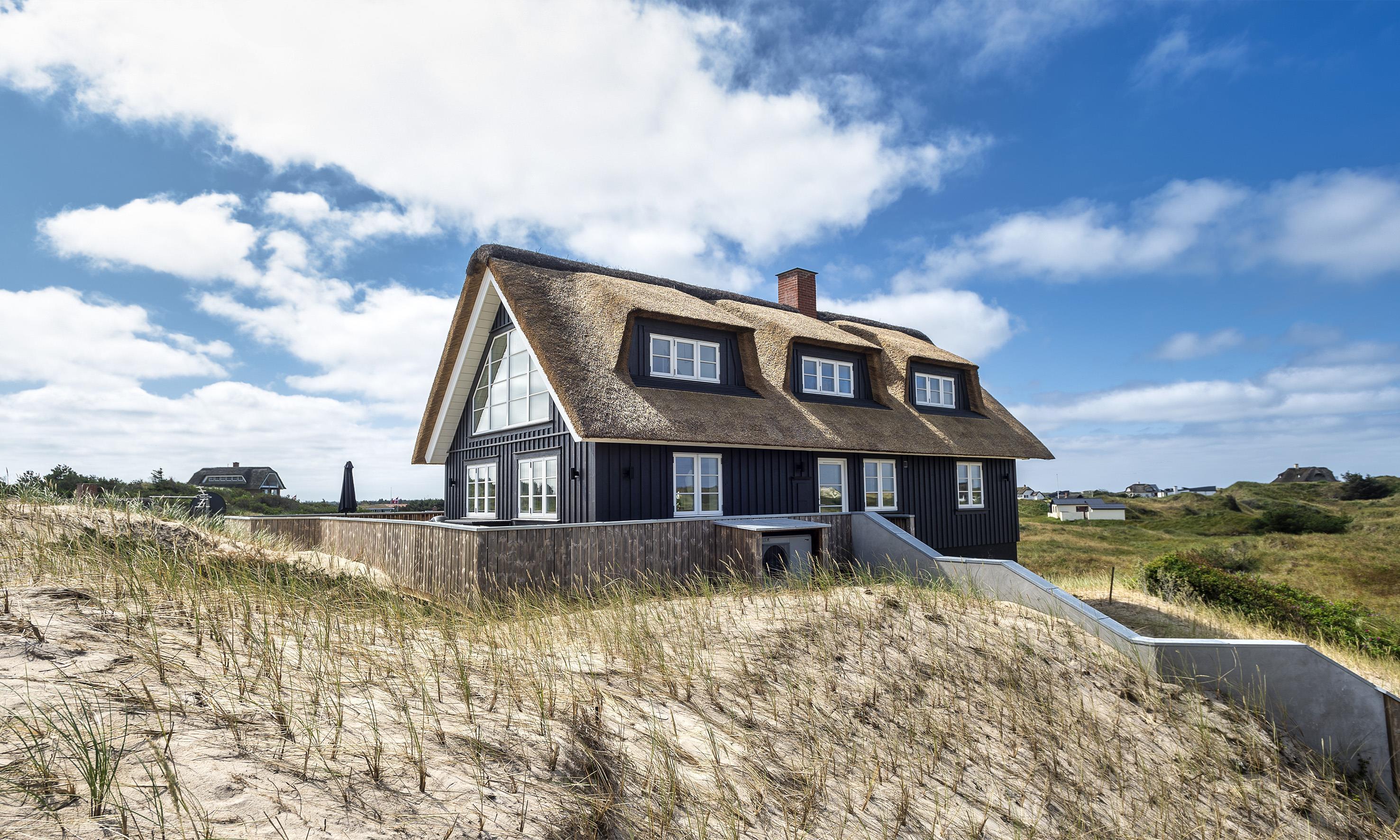 Geschmackvolles, reetgedecktes Ferienhaus über drei Etagen. Es ist für 8 Personen ausgestattet. Das Ferienhaus befindet sich auf einem ca. 3200 qm grossem Dünengrundstück. Über eine lange Treppe gelangen Sie zu diesen Ferienhaus. Der Strand ist ca. 200 vom Haus entfernt. Im Erdgeschoss befinden sich der Eingangsbereich und ein grosszügiger Küchenbereich mit Zugang zum Wintergarten. Hier in dem Wintergarten befindet sich ein Kaminofen, der eine gemütliche Wärme ausstrahlt. Im ganzen Ferienhaus ist eine Fussbodenheizung verlegt. Diese wird mit einer Luft/Warme Anlage betrieben, dadurch ist es im Verbrauch sehr energiesparend. Der Küchenbereich ist mit einem Herd mit Cerankochfeld, einem Backofen in arbeitshöhe, einer Geschirrspülmaschine und einer Kühl- und Gefrierkombination ausgestattet. 4 Schlafzimmer: DB + DB + DB + DB.Desweiteren gibt es auf dieser Ebene ein Badezimmer und drei Schlafzimmer mit je einem Doppelbett (2 mal 90 x 200 Betten). Das Badezimmer verfügt über ein Handwaschbecken, einem WC und einer Dusche. Über eine schöne Holztreppe gelangen Sie dann ins Obergeschoss und befinden sich dann gleich in den schönen Wohnbereich, der Ihnen einen tollen Panoramablick durch die grosse Fensterfront bietet. Sie können hier diesen tollen Ausblick richtig geniessen. Dazu den zweiten Kamin angeheizt, können Sie richtig entspannen. Das ist Erholung pur. Das Fernsehprogramm empfangen Sie über eine Parabolantenne (es gibt allerdings keine dänischen Programme). Desweiteren finden Sie hier im Obergeschoss ein grosses Schlafzimmer mit einem Doppelbett (2 mal 105x200 cm Betten). Ein zweites Badezimmer mit einem Handwaschbecken, einem WC und einer Dusche steht den Gästen auf dieser Etage ebenfalls zur Verfügung. Über diese schöne Holztreppe gelangen Sie dann auch in das Kellergeschoss. Ein grosser Vorraum bietet viel Platz für alles mögliche. Hier befindet sich das grosse Masterbadezimmer. Es ist mit einem Whirlpool, einem Handwaschbecken und einer Dusche ausgestattet. Von diesem Badezimmer geht dann separat die Sauna ab und auch ein weiteres WC mit einem Handwaschbecken. Der Hauswirtschaftsraum befindet sich auch hier im Kellergeschoss. Hier ist die kombinierte Waschmaschine mit Trockner untergebracht. Das Ferienhaus verfügt über einen Internetanschluss (W-Lan). Es sind max. drei Haustiere erlaubt. Der grosszügige Terrassenbereich führt fast rund ums Haus. Zusätzlich befindet sich ein Anschluss am Ferienhaus für El-Fahrzeuge. Das Ferienhaus verfügt über ein Gas Weber Grill. Die Benutzung pro Mal beträgt 30,- Dkr. Bitte beachten Sie: der Grill muss nach jedem Gebrauch wieder gereinigt zurück gestellt werden. Rauchen ist nicht erlaubt. Das Ferienhaus ist 2019 erbaut.