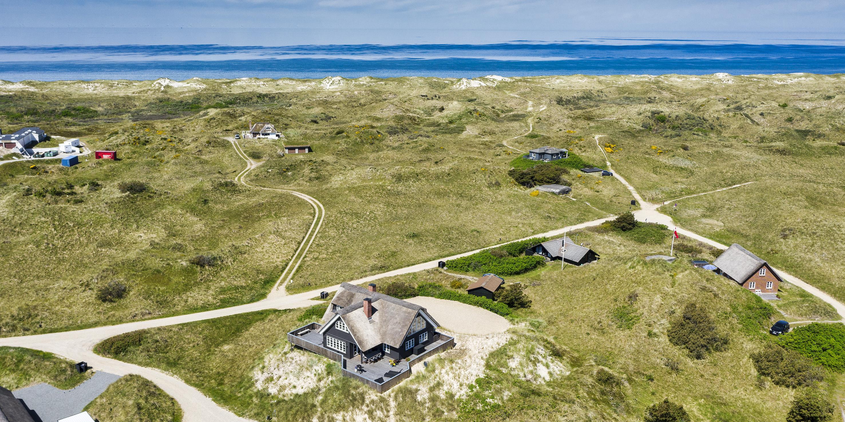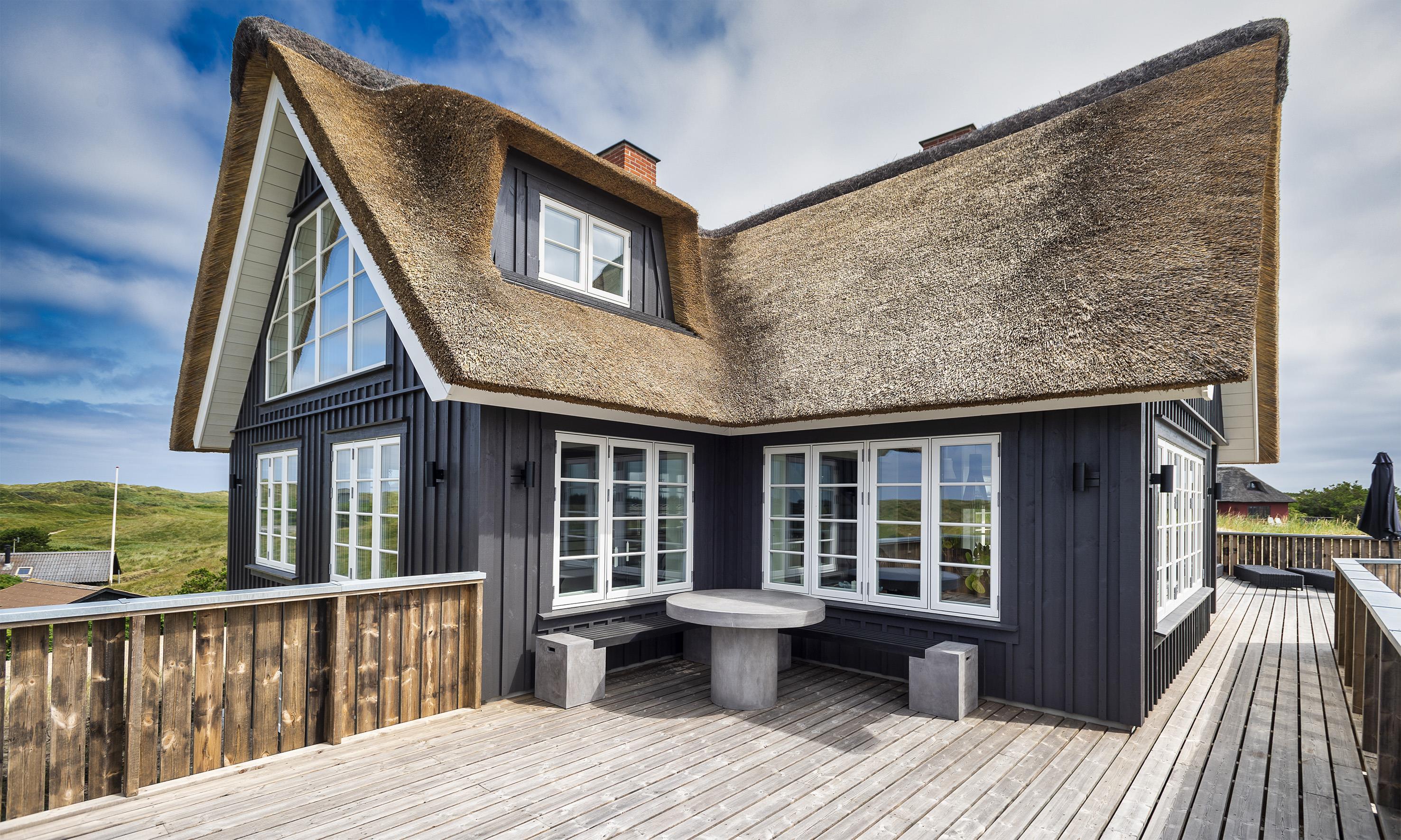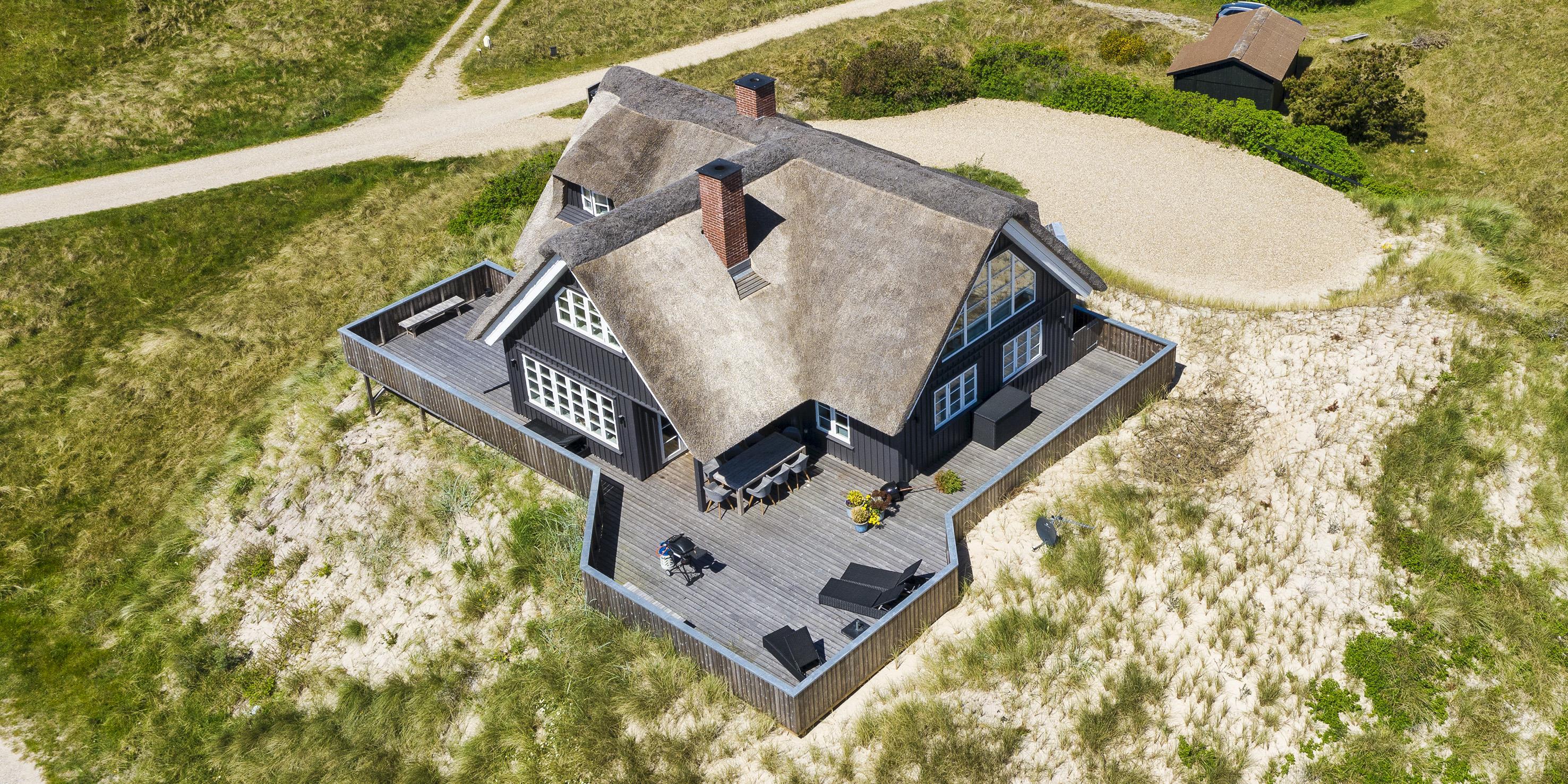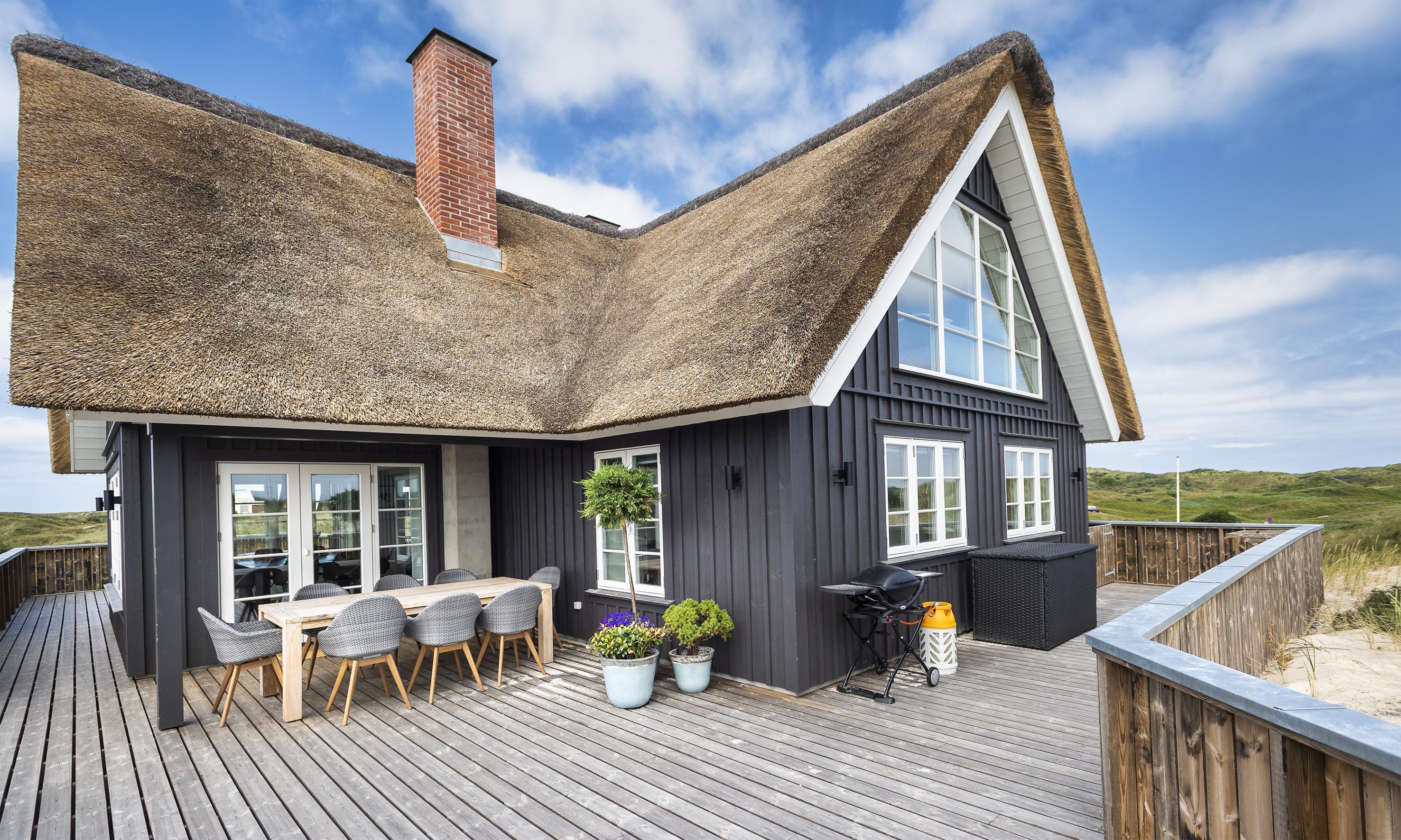 Geschmackvolles, reetgedecktes Ferienhaus über drei Etagen. Es ist für 8 Personen ausgestattet. Das Ferienhaus befindet sich auf einem ca. 3200 qm grossem Dünengrundstück. Über eine lange Treppe gelangen Sie zu diesen Ferienhaus. Der Strand ist ca. 200 vom Haus entfernt. Im Erdgeschoss befinden sich der Eingangsbereich und ein grosszügiger Küchenbereich mit Zugang zum Wintergarten. Hier in dem Wintergarten befindet sich ein Kaminofen, der eine gemütliche Wärme ausstrahlt. Im ganzen Ferienhaus ist eine Fussbodenheizung verlegt. Diese wird mit einer Luft/Warme Anlage betrieben, dadurch ist es im Verbrauch sehr energiesparend. Der Küchenbereich ist mit einem Herd mit Cerankochfeld, einem Backofen in arbeitshöhe, einer Geschirrspülmaschine und einer Kühl- und Gefrierkombination ausgestattet. 4 Schlafzimmer: DB + DB + DB + DB.Desweiteren gibt es auf dieser Ebene ein Badezimmer und drei Schlafzimmer mit je einem Doppelbett (2 mal 90 x 200 Betten). Das Badezimmer verfügt über ein Handwaschbecken, einem WC und einer Dusche. Über eine schöne Holztreppe gelangen Sie dann ins Obergeschoss und befinden sich dann gleich in den schönen Wohnbereich, der Ihnen einen tollen Panoramablick durch die grosse Fensterfront bietet. Sie können hier diesen tollen Ausblick richtig geniessen. Dazu den zweiten Kamin angeheizt, können Sie richtig entspannen. Das ist Erholung pur. Das Fernsehprogramm empfangen Sie über eine Parabolantenne (es gibt allerdings keine dänischen Programme). Desweiteren finden Sie hier im Obergeschoss ein grosses Schlafzimmer mit einem Doppelbett (2 mal 105x200 cm Betten). Ein zweites Badezimmer mit einem Handwaschbecken, einem WC und einer Dusche steht den Gästen auf dieser Etage ebenfalls zur Verfügung. Über diese schöne Holztreppe gelangen Sie dann auch in das Kellergeschoss. Ein grosser Vorraum bietet viel Platz für alles mögliche. Hier befindet sich das grosse Masterbadezimmer. Es ist mit einem Whirlpool, einem Handwaschbecken und einer Dusche ausgestattet. Von diesem Badezimmer geht dann separat die Sauna ab und auch ein weiteres WC mit einem Handwaschbecken. Der Hauswirtschaftsraum befindet sich auch hier im Kellergeschoss. Hier ist die kombinierte Waschmaschine mit Trockner untergebracht. Das Ferienhaus verfügt über einen Internetanschluss (W-Lan). Es sind max. drei Haustiere erlaubt. Der grosszügige Terrassenbereich führt fast rund ums Haus. Zusätzlich befindet sich ein Anschluss am Ferienhaus für El-Fahrzeuge. Das Ferienhaus verfügt über ein Gas Weber Grill. Die Benutzung pro Mal beträgt 30,- Dkr. Bitte beachten Sie: der Grill muss nach jedem Gebrauch wieder gereinigt zurück gestellt werden. Rauchen ist nicht erlaubt. Das Ferienhaus ist 2019 erbaut.