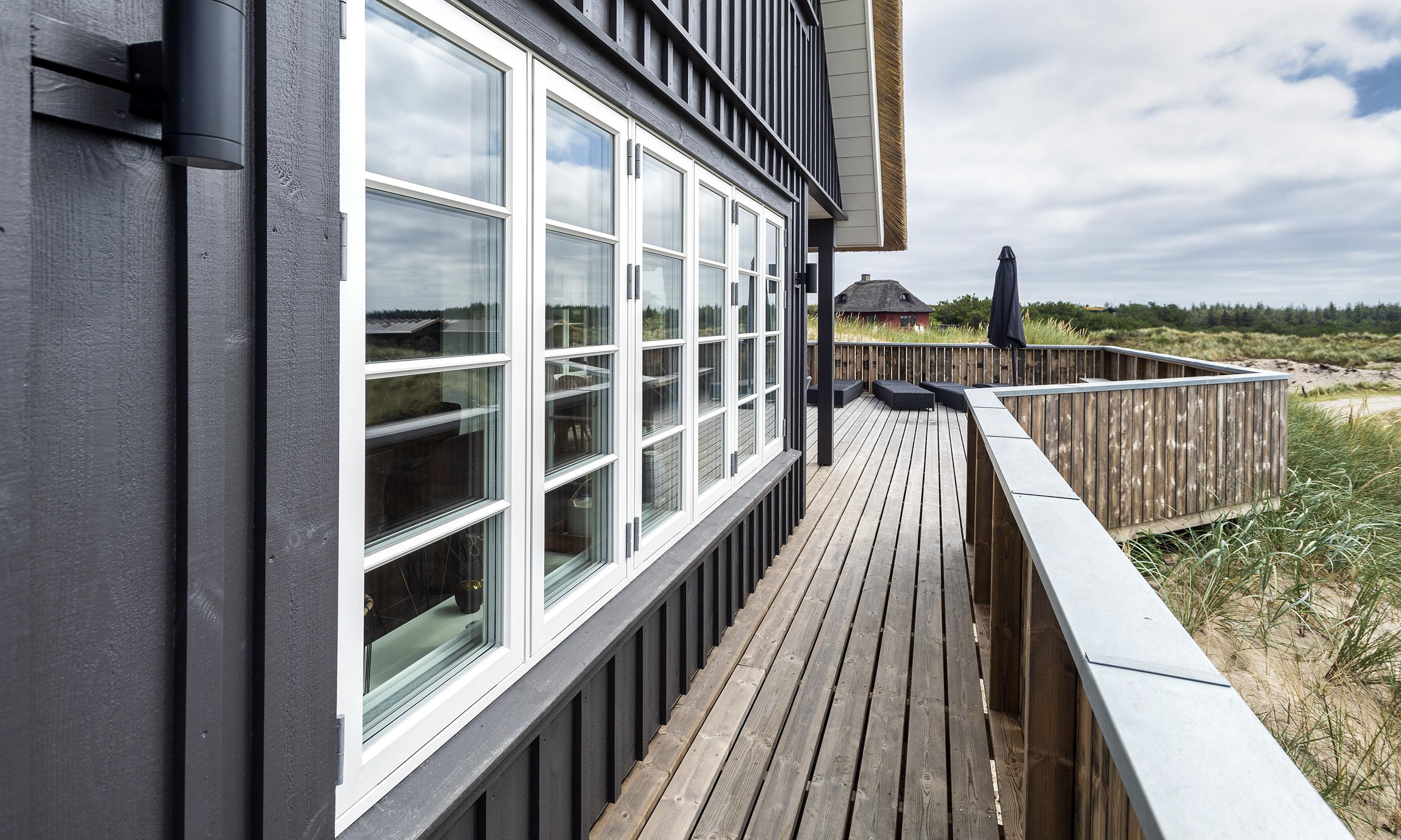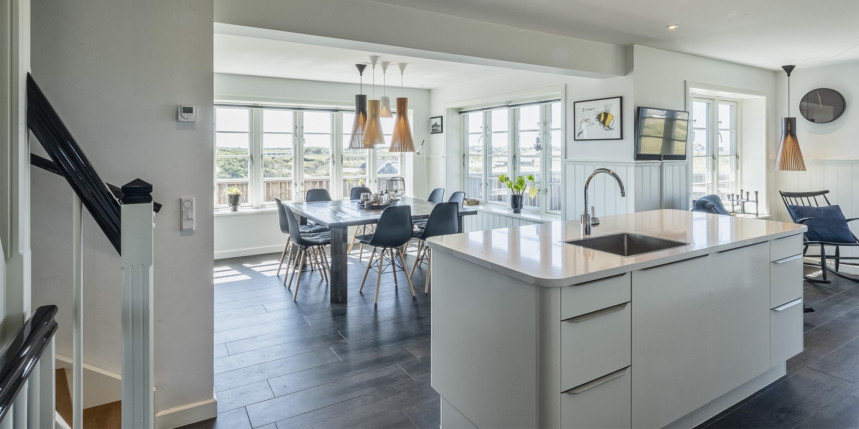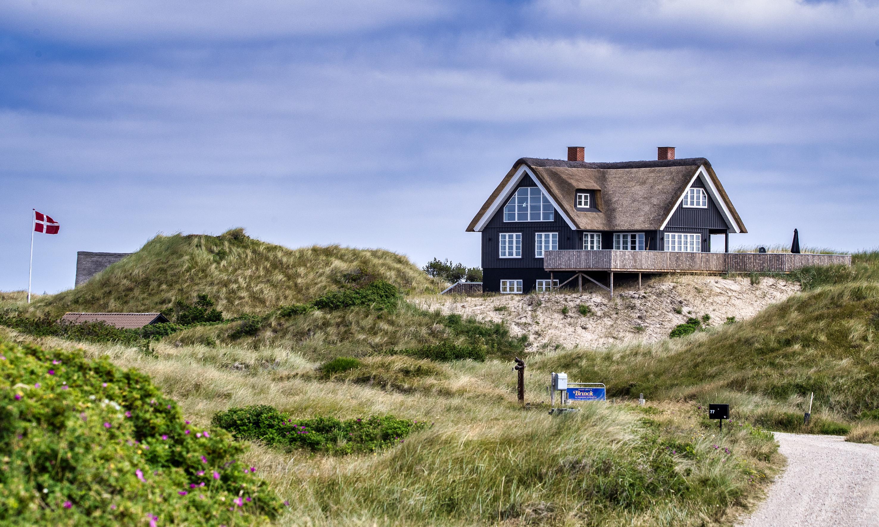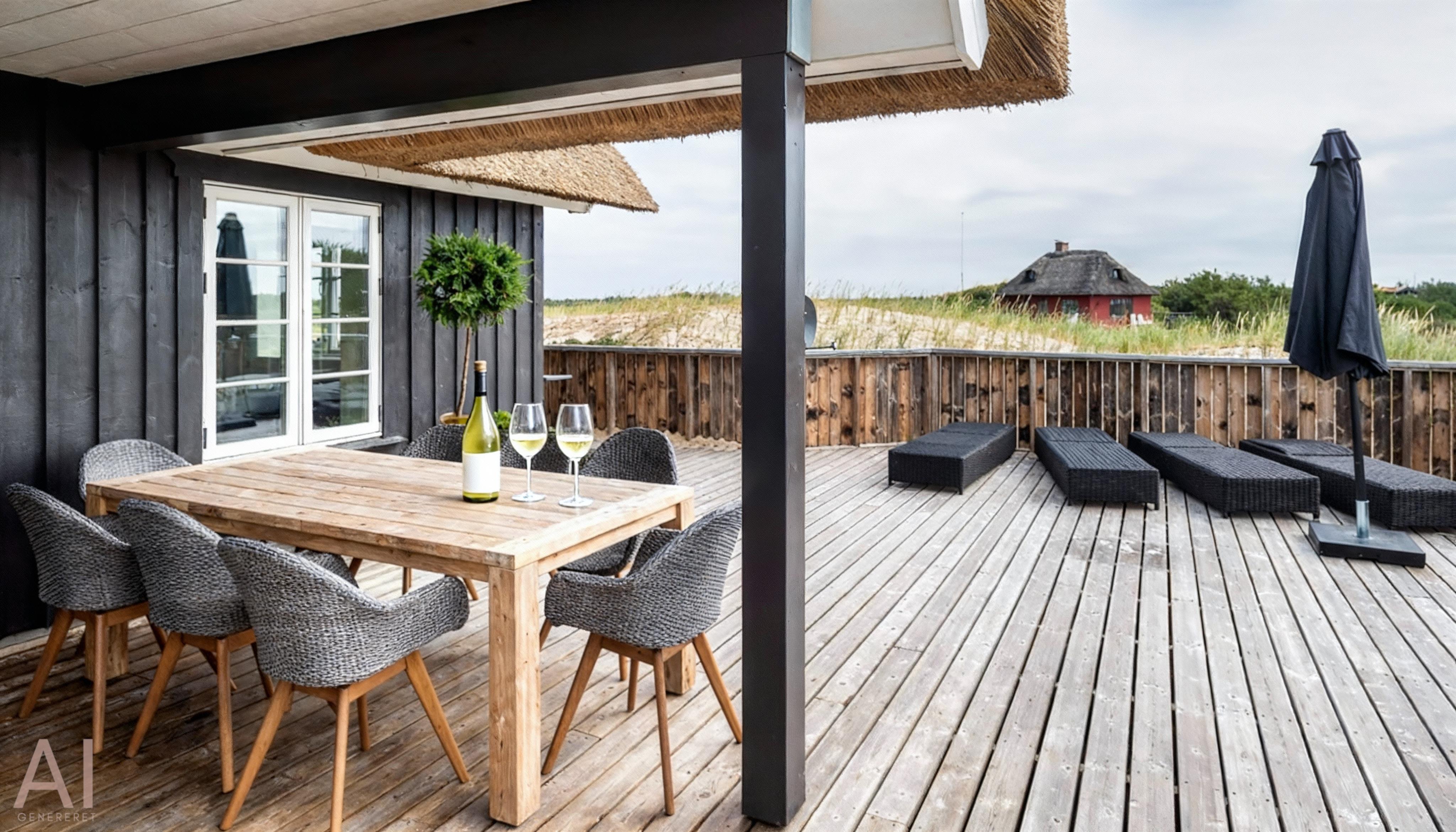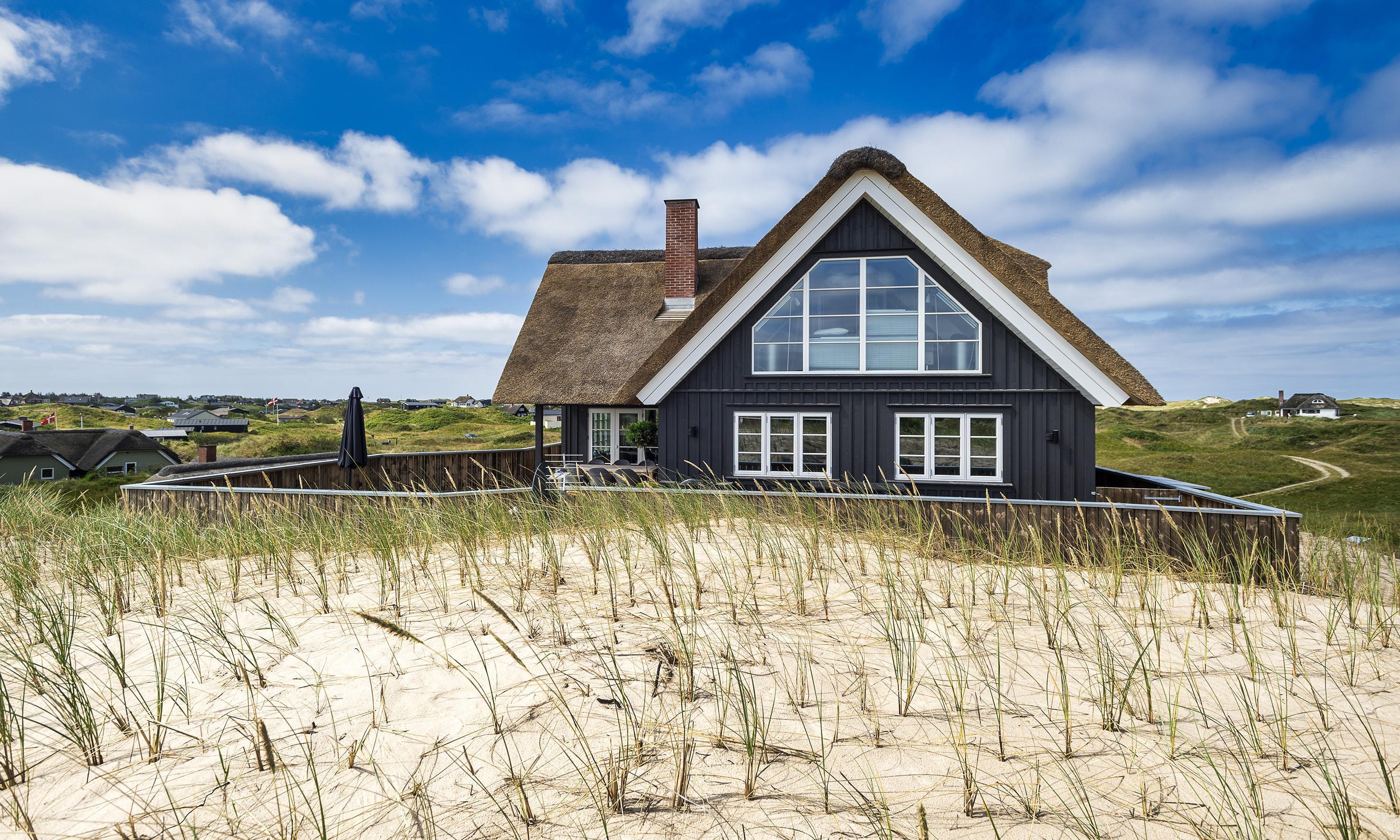 Geschmackvolles, reetgedecktes Ferienhaus über drei Etagen. Es ist für 8 Personen ausgestattet. Das Ferienhaus befindet sich auf einem ca. 3200 qm grossem Dünengrundstück. Über eine lange Treppe gelangen Sie zu diesen Ferienhaus. Der Strand ist ca. 200 vom Haus entfernt. Im Erdgeschoss befinden sich der Eingangsbereich und ein grosszügiger Küchenbereich mit Zugang zum Wintergarten. Hier in dem Wintergarten befindet sich ein Kaminofen, der eine gemütliche Wärme ausstrahlt. Im ganzen Ferienhaus ist eine Fussbodenheizung verlegt. Diese wird mit einer Luft/Warme Anlage betrieben, dadurch ist es im Verbrauch sehr energiesparend. Der Küchenbereich ist mit einem Herd mit Cerankochfeld, einem Backofen in arbeitshöhe, einer Geschirrspülmaschine und einer Kühl- und Gefrierkombination ausgestattet. 4 Schlafzimmer: DB + DB + DB + DB.Desweiteren gibt es auf dieser Ebene ein Badezimmer und drei Schlafzimmer mit je einem Doppelbett (2 mal 90 x 200 Betten). Das Badezimmer verfügt über ein Handwaschbecken, einem WC und einer Dusche. Über eine schöne Holztreppe gelangen Sie dann ins Obergeschoss und befinden sich dann gleich in den schönen Wohnbereich, der Ihnen einen tollen Panoramablick durch die grosse Fensterfront bietet. Sie können hier diesen tollen Ausblick richtig geniessen. Dazu den zweiten Kamin angeheizt, können Sie richtig entspannen. Das ist Erholung pur. Das Fernsehprogramm empfangen Sie über eine Parabolantenne (es gibt allerdings keine dänischen Programme). Desweiteren finden Sie hier im Obergeschoss ein grosses Schlafzimmer mit einem Doppelbett (2 mal 105x200 cm Betten). Ein zweites Badezimmer mit einem Handwaschbecken, einem WC und einer Dusche steht den Gästen auf dieser Etage ebenfalls zur Verfügung. Über diese schöne Holztreppe gelangen Sie dann auch in das Kellergeschoss. Ein grosser Vorraum bietet viel Platz für alles mögliche. Hier befindet sich das grosse Masterbadezimmer. Es ist mit einem Whirlpool, einem Handwaschbecken und einer Dusche ausgestattet. Von diesem Badezimmer geht dann separat die Sauna ab und auch ein weiteres WC mit einem Handwaschbecken. Der Hauswirtschaftsraum befindet sich auch hier im Kellergeschoss. Hier ist die kombinierte Waschmaschine mit Trockner untergebracht. Das Ferienhaus verfügt über einen Internetanschluss (W-Lan). Es sind max. drei Haustiere erlaubt. Der grosszügige Terrassenbereich führt fast rund ums Haus. Zusätzlich befindet sich ein Anschluss am Ferienhaus für El-Fahrzeuge. Das Ferienhaus verfügt über ein Gas Weber Grill. Die Benutzung pro Mal beträgt 30,- Dkr. Bitte beachten Sie: der Grill muss nach jedem Gebrauch wieder gereinigt zurück gestellt werden. Rauchen ist nicht erlaubt. Das Ferienhaus ist 2019 erbaut.
