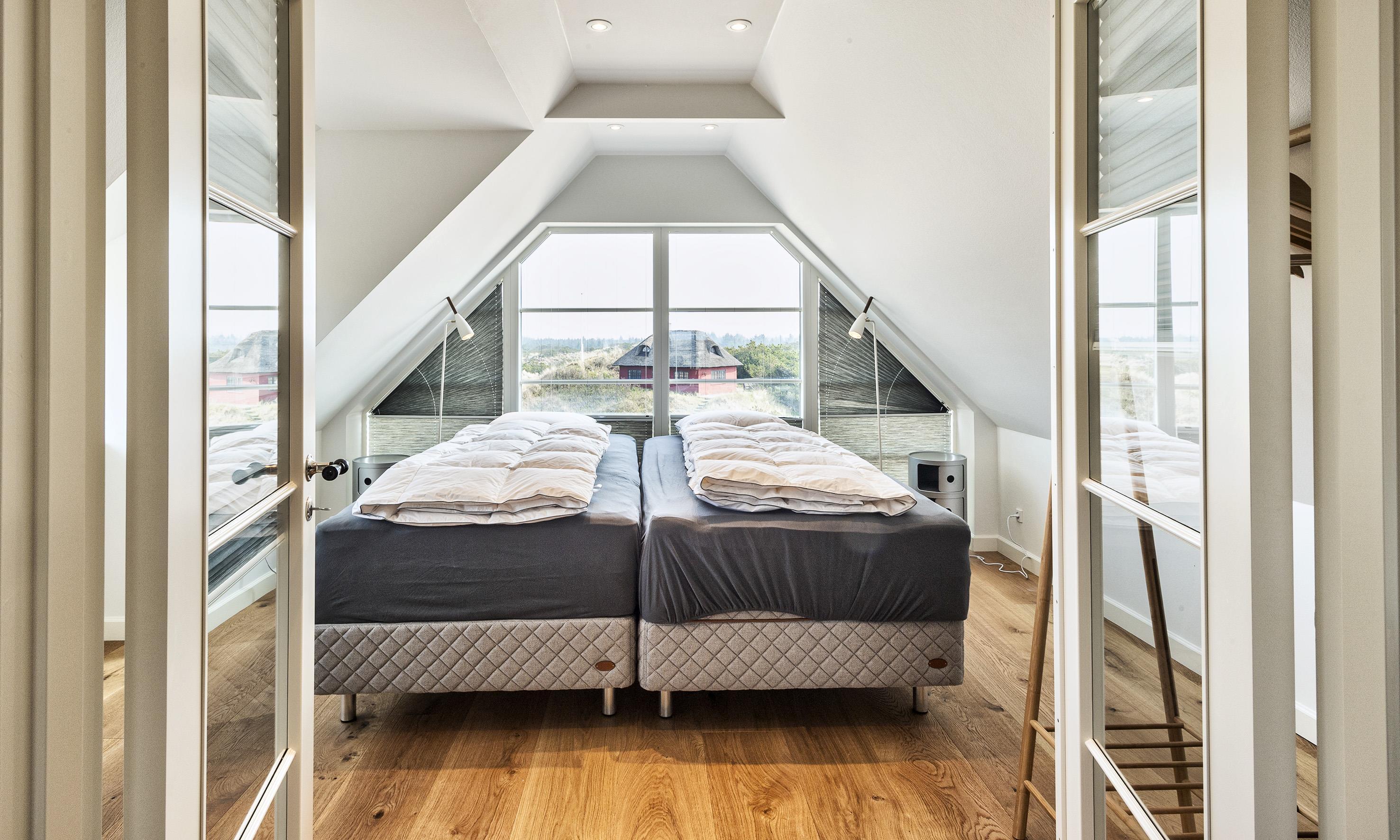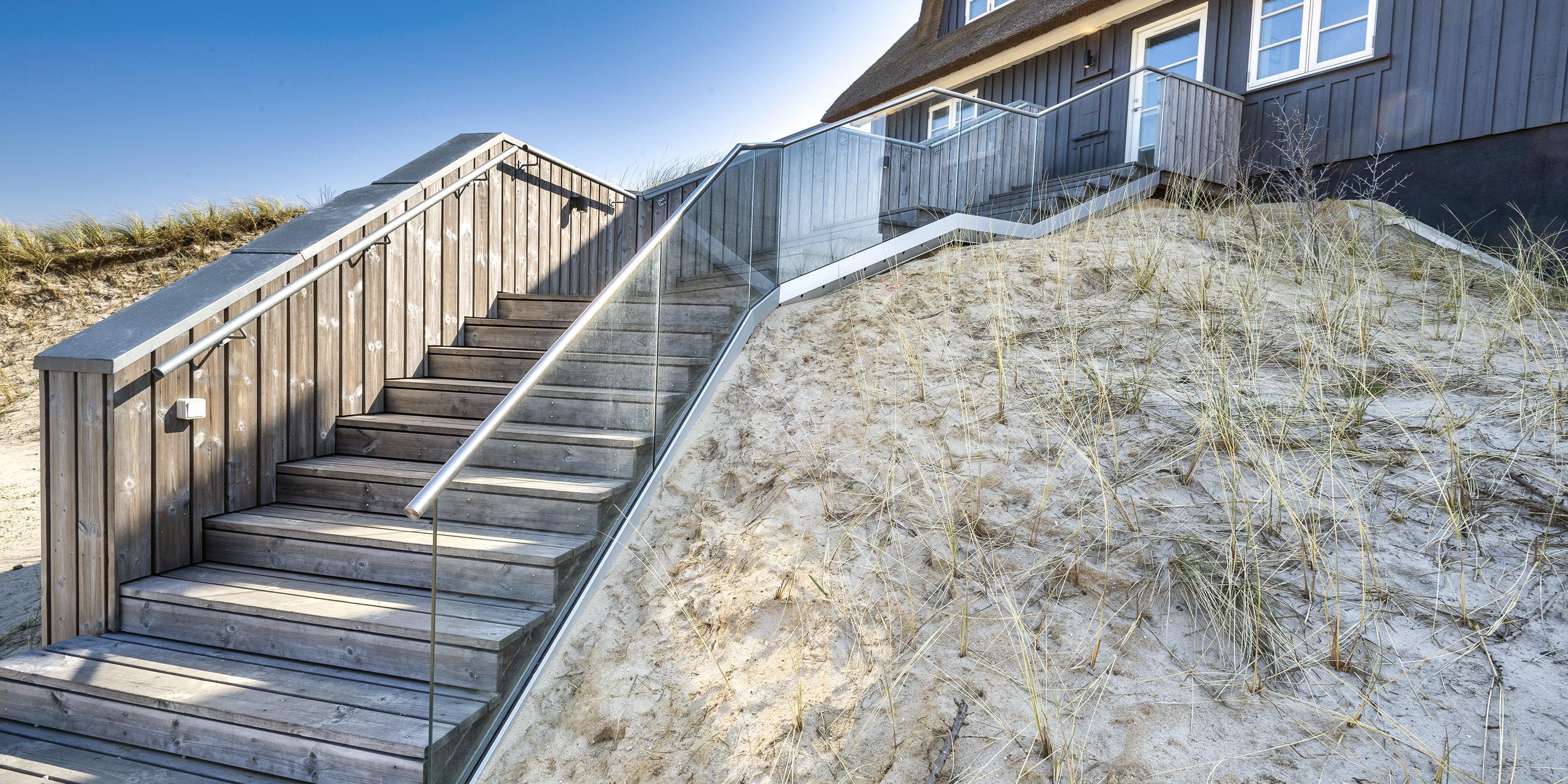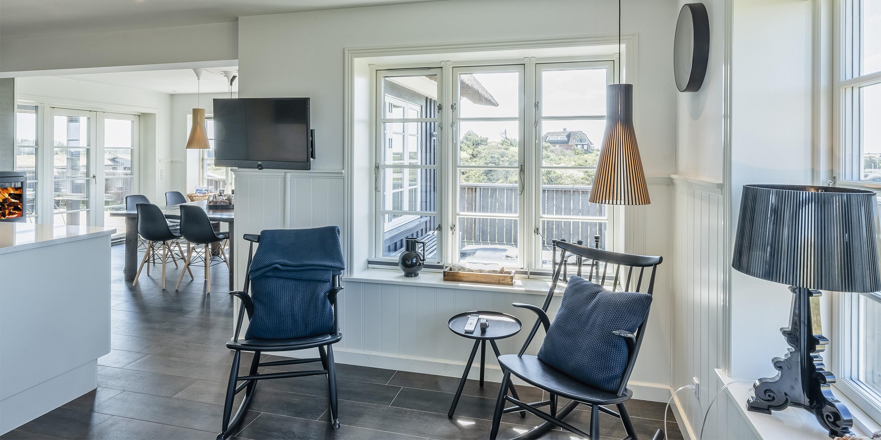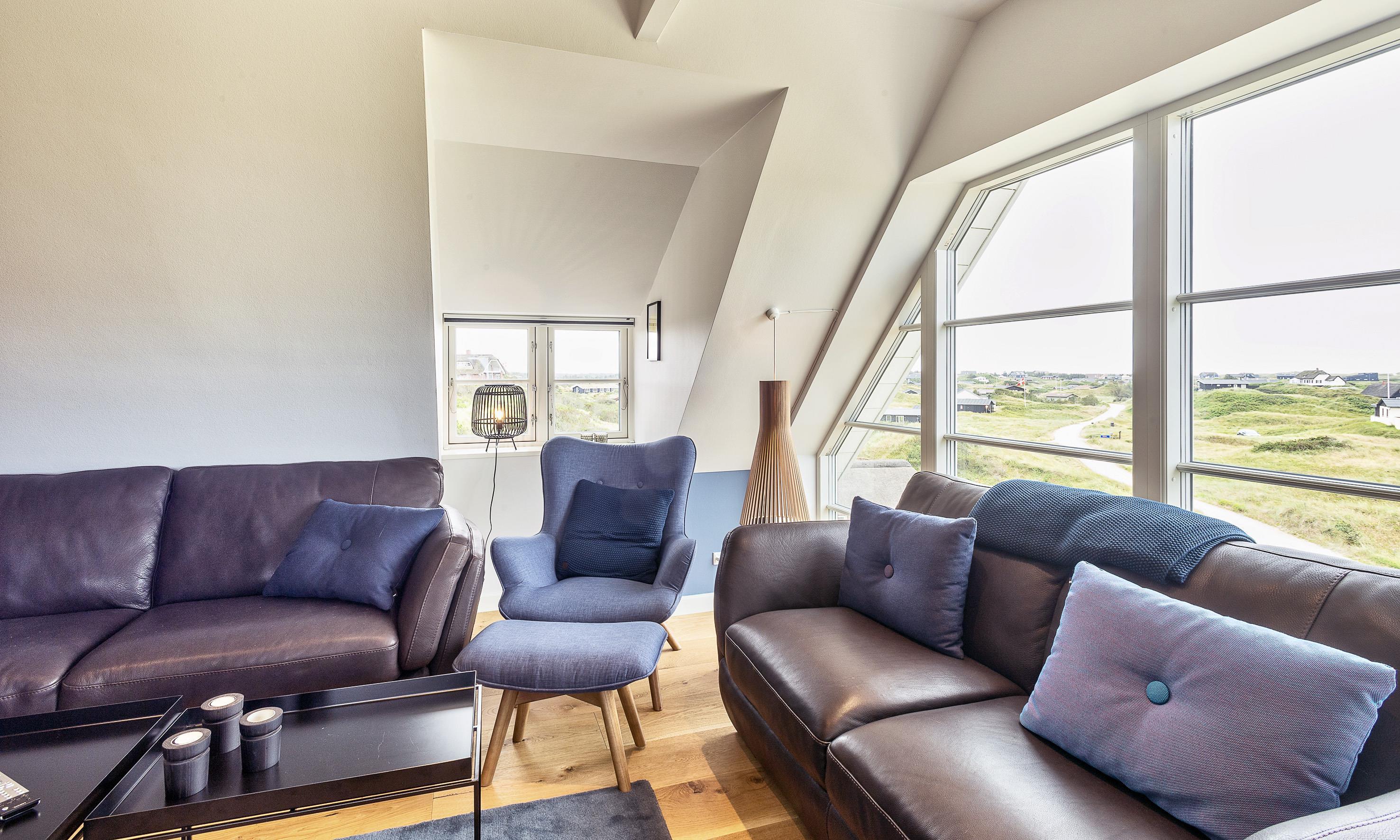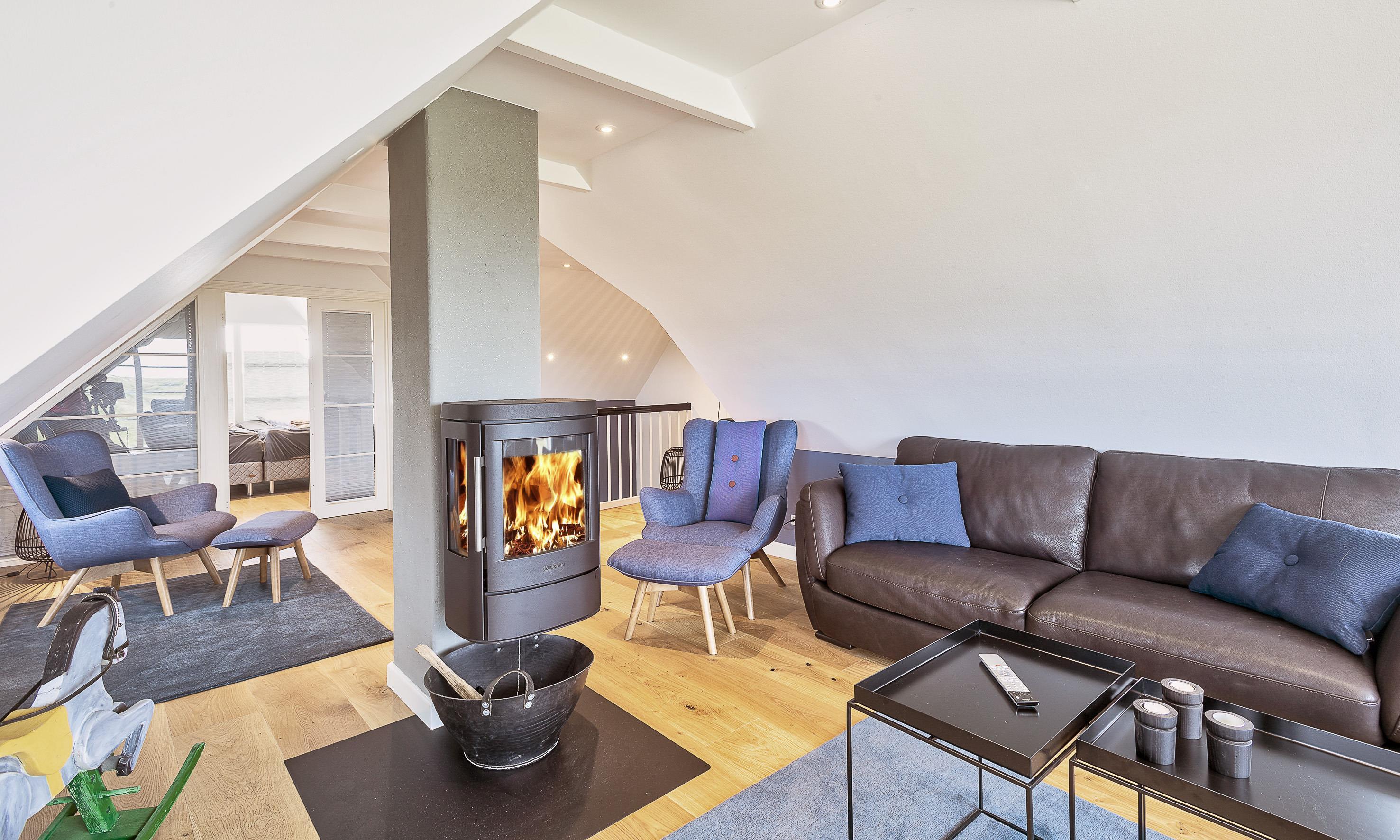 Geschmackvolles, reetgedecktes Ferienhaus über drei Etagen. Es ist für 8 Personen ausgestattet. Das Ferienhaus befindet sich auf einem ca. 3200 qm grossem Dünengrundstück. Über eine lange Treppe gelangen Sie zu diesen Ferienhaus. Der Strand ist ca. 200 vom Haus entfernt. Im Erdgeschoss befinden sich der Eingangsbereich und ein grosszügiger Küchenbereich mit Zugang zum Wintergarten. Hier in dem Wintergarten befindet sich ein Kaminofen, der eine gemütliche Wärme ausstrahlt. Im ganzen Ferienhaus ist eine Fussbodenheizung verlegt. Diese wird mit einer Luft/Warme Anlage betrieben, dadurch ist es im Verbrauch sehr energiesparend. Der Küchenbereich ist mit einem Herd mit Cerankochfeld, einem Backofen in arbeitshöhe, einer Geschirrspülmaschine und einer Kühl- und Gefrierkombination ausgestattet. 4 Schlafzimmer: DB + DB + DB + DB.Desweiteren gibt es auf dieser Ebene ein Badezimmer und drei Schlafzimmer mit je einem Doppelbett (2 mal 90 x 200 Betten). Das Badezimmer verfügt über ein Handwaschbecken, einem WC und einer Dusche. Über eine schöne Holztreppe gelangen Sie dann ins Obergeschoss und befinden sich dann gleich in den schönen Wohnbereich, der Ihnen einen tollen Panoramablick durch die grosse Fensterfront bietet. Sie können hier diesen tollen Ausblick richtig geniessen. Dazu den zweiten Kamin angeheizt, können Sie richtig entspannen. Das ist Erholung pur. Das Fernsehprogramm empfangen Sie über eine Parabolantenne (es gibt allerdings keine dänischen Programme). Desweiteren finden Sie hier im Obergeschoss ein grosses Schlafzimmer mit einem Doppelbett (2 mal 105x200 cm Betten). Ein zweites Badezimmer mit einem Handwaschbecken, einem WC und einer Dusche steht den Gästen auf dieser Etage ebenfalls zur Verfügung. Über diese schöne Holztreppe gelangen Sie dann auch in das Kellergeschoss. Ein grosser Vorraum bietet viel Platz für alles mögliche. Hier befindet sich das grosse Masterbadezimmer. Es ist mit einem Whirlpool, einem Handwaschbecken und einer Dusche ausgestattet. Von diesem Badezimmer geht dann separat die Sauna ab und auch ein weiteres WC mit einem Handwaschbecken. Der Hauswirtschaftsraum befindet sich auch hier im Kellergeschoss. Hier ist die kombinierte Waschmaschine mit Trockner untergebracht. Das Ferienhaus verfügt über einen Internetanschluss (W-Lan). Es sind max. drei Haustiere erlaubt. Der grosszügige Terrassenbereich führt fast rund ums Haus. Zusätzlich befindet sich ein Anschluss am Ferienhaus für El-Fahrzeuge. Das Ferienhaus verfügt über ein Gas Weber Grill. Die Benutzung pro Mal beträgt 30,- Dkr. Bitte beachten Sie: der Grill muss nach jedem Gebrauch wieder gereinigt zurück gestellt werden. Rauchen ist nicht erlaubt. Das Ferienhaus ist 2019 erbaut.