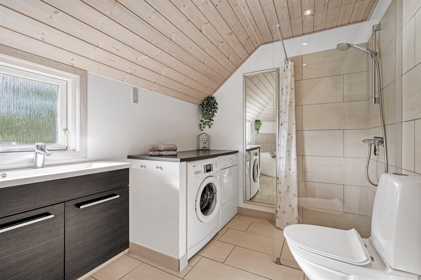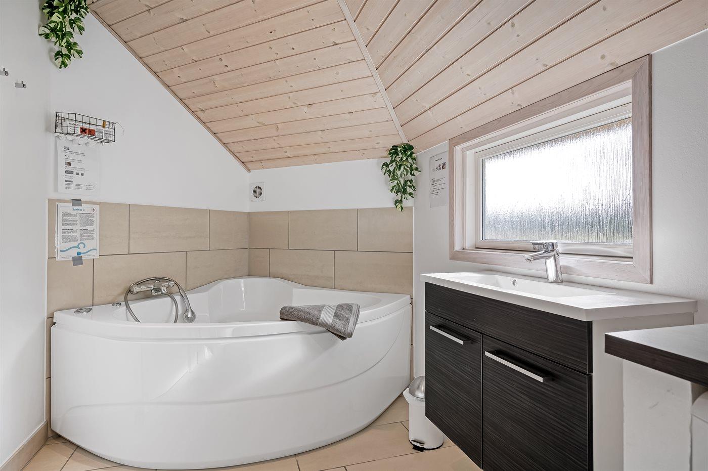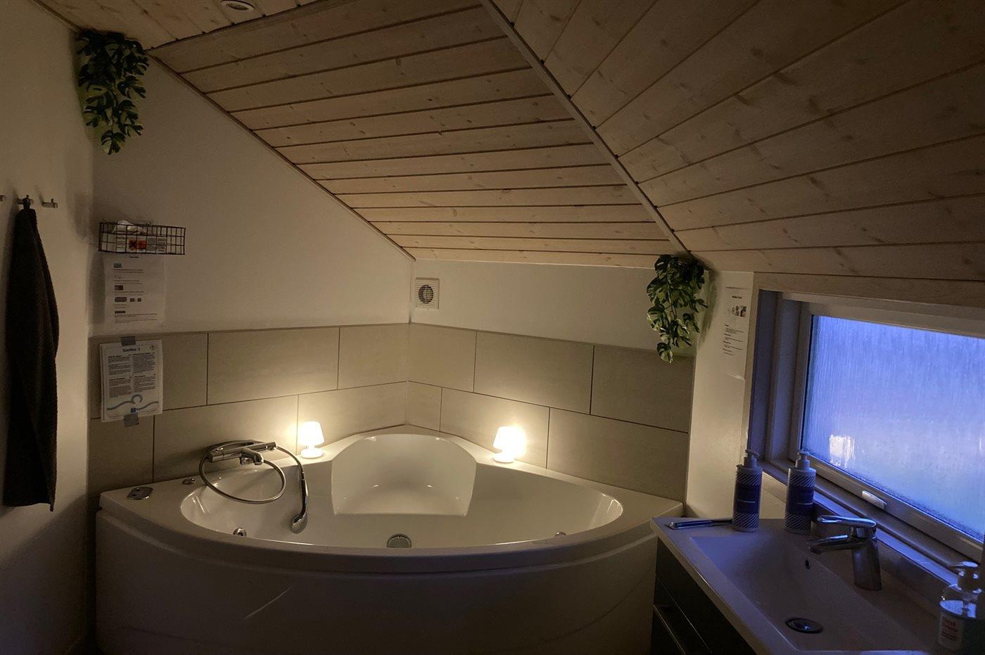 Im großen Badezimmer gibt es einen Whirlpool, in dem du dich nach einem Tag am Strand verwöhnen kannst. Außerdem gibt es hier eine Waschmaschine und einen Wäschetrockner, sodass sich auch praktische Aufgaben im Urlaub problemlos erledigen lassen.