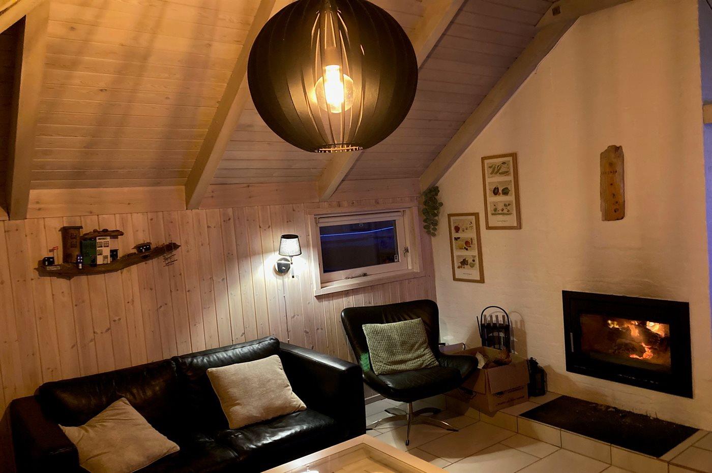 Das Wohnzimmer mit komfortablen Möbeln lädt zum Entspannen ein und der Kaminofen sorgt für wohlige Wärme und eine angenehme Atmosphäre. Hier kann man es sich mit einem Buch gemütlich machen oder Familienspiele tätigen.
