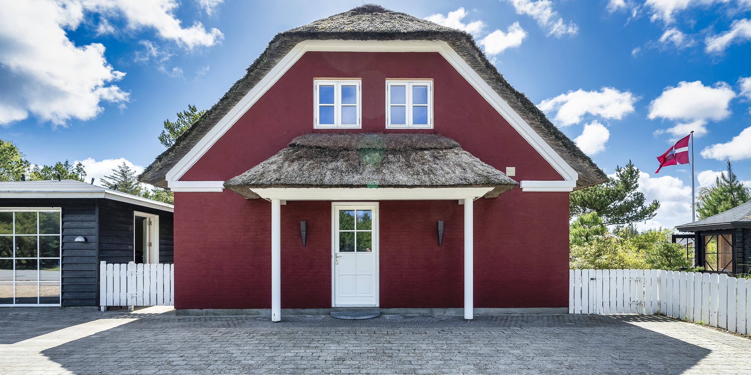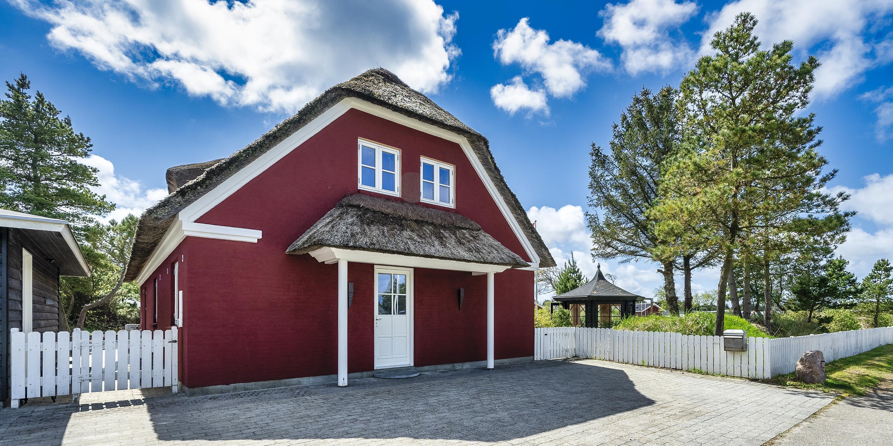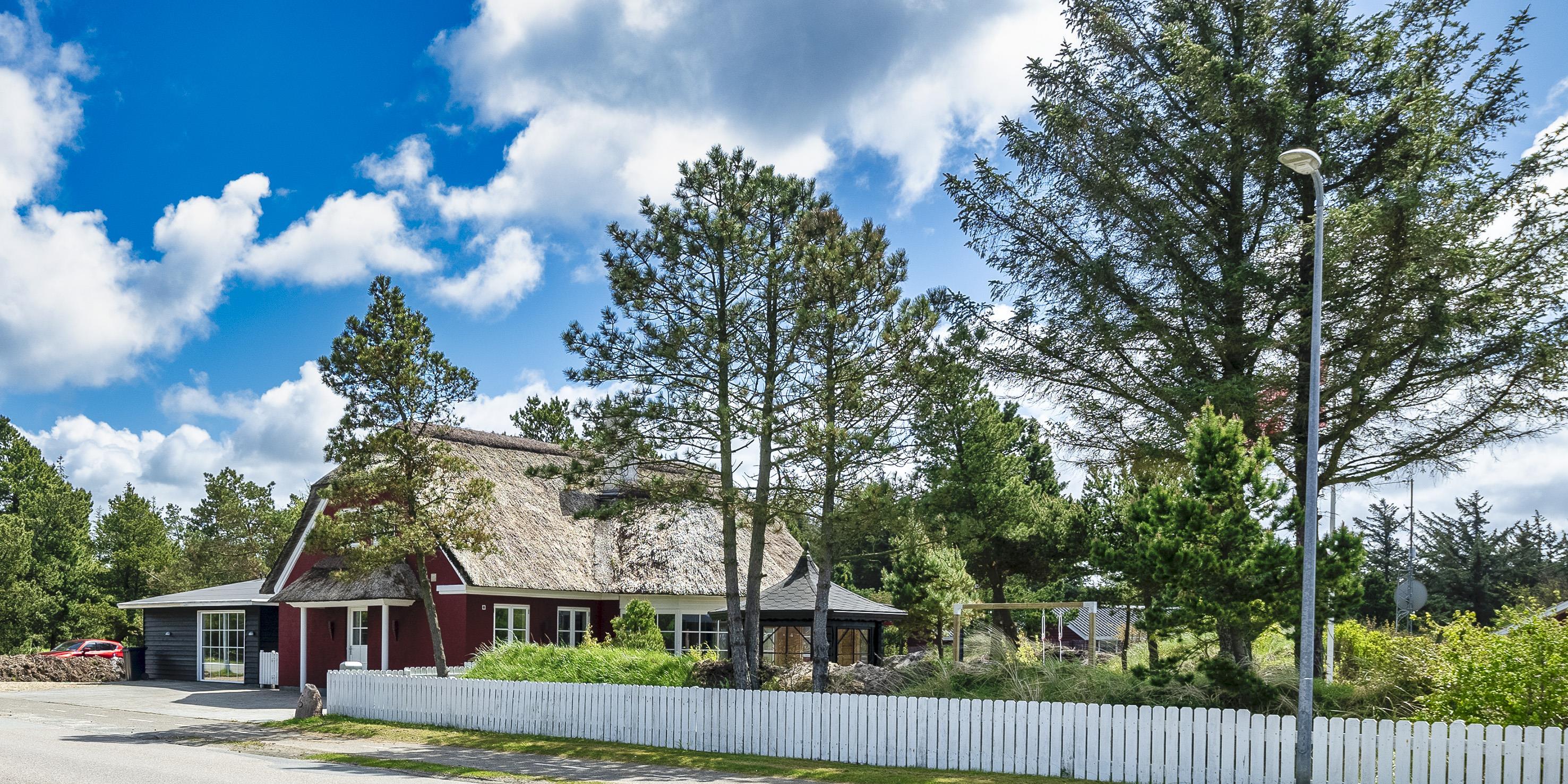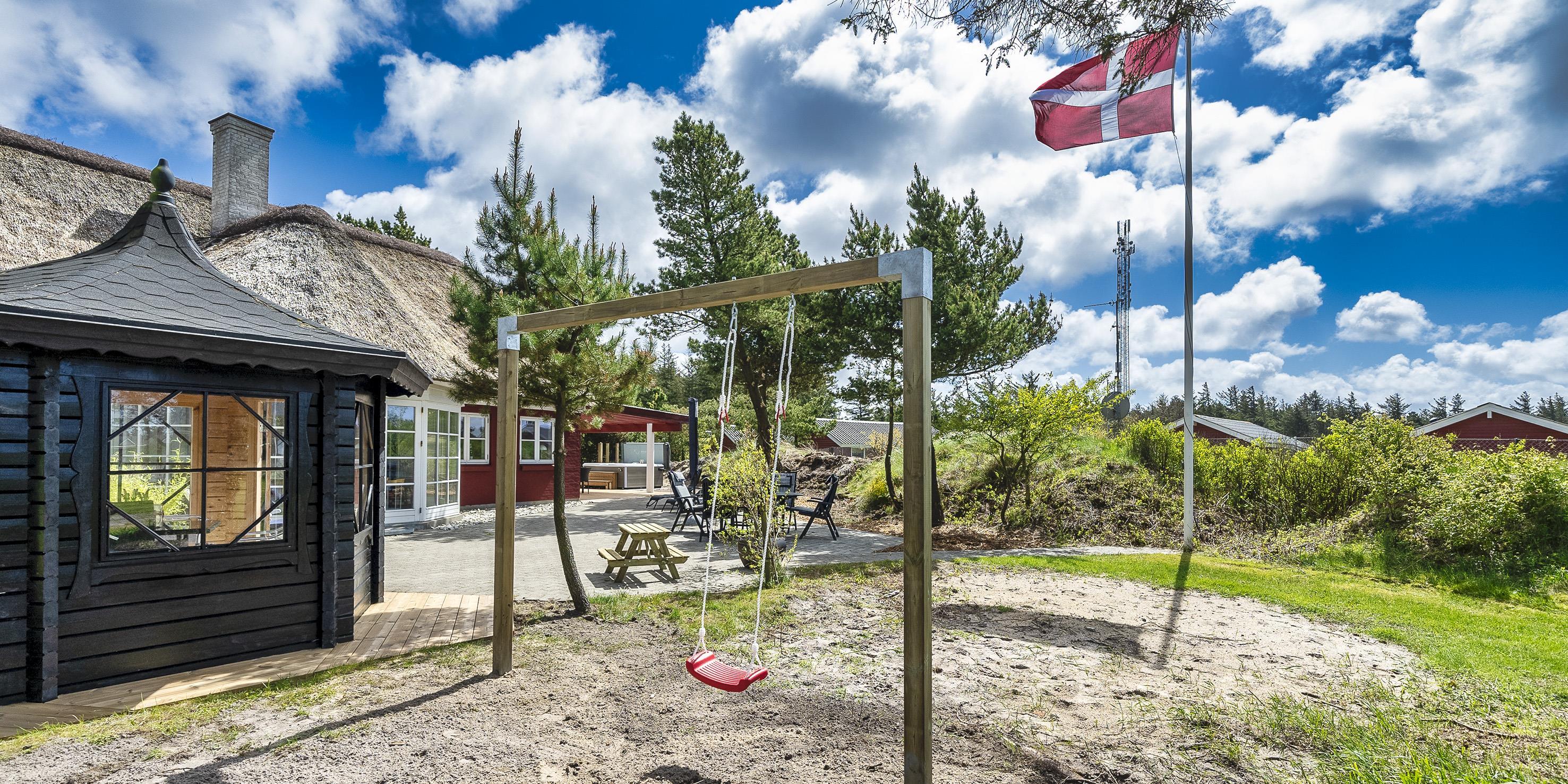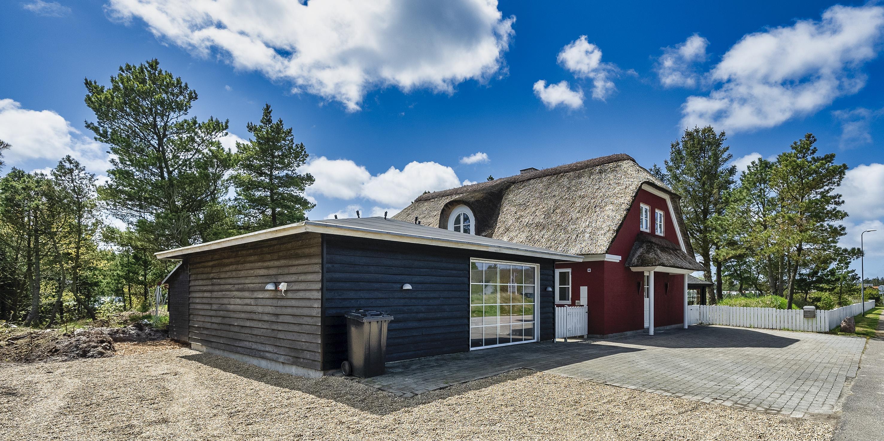 Neu renoviertes großes und aufregendes Aktivitätshaus in Vejers Strand. Das Haus ist ein idyllisches Reetdachsteinhaus mit einer beeindruckenden Wohnfläche von 195 Quadratmetern und einem separaten Aktivitätshaus von ca. 49 m2. Das Haus liegt in der Nähe von Geschäften und Restaurants auf einem großen, geschlossenen Grundstück von ca. 1663 m2. Ein paar Meter von Vejers Nordplantage und etwa 1850 Meter vom Strand entfernt. Das Grundstück ist komplett eingezäunt und durch eine kleine Mauer an der Vorderseite des Hauses vom Straßenbereich getrennt. Das Haus bietet eine schöne Atmosphäre, überall offen und mit einem großen Panoramafenster zum Garten. Das Haus ist ca. 7 Autominuten vom Stadtzentrum von Vejer entfernt, wo es mehrere Restaurants, eine Pizzeria, 2 Lebensmittelgeschäfte und einen Drops gibt, der Eis und Softeis verkauft. Das Sommerhaus bietet Platz für insgesamt 10 Bewohner. Der großzügige Eingangsbereich ist gefliest und bietet viel Platz für eine Garderobe und zusätzliche Ausstellungsfläche. Waschmaschine und Trockner befinden sich im separaten Hauswirtschaftsraum. Auch hier gibt es im Eingangsbereich eine Holztreppe, die in das Obergeschoss führt. Der Flur im Obergeschoss verfügt über ein Geländer, sodass Sie in den Essbereich hinunterblicken können. Es gibt 5 Schlafzimmer: DB + DB + DB + 2B + 2B. Auf dieser Etage befindet sich auch ein Badezimmer. Das Badezimmer ist mit einem Waschbecken, einer Toilette und einer Dusche ausgestattet. Das Regal besteht aus Holz, da das Waschbecken in die Holzplatte eingefasst ist und im Badezimmer auch eine Fußbodenheizung vorhanden ist. Im Erdgeschoss befinden sich direkt hinter dem Eingangsbereich die Küchenabteilung und der Essbereich. Beide sind im Bodenbereich gefliest und mit Fußbodenheizung ausgestattet. Der Essbereich ist großzügig ausgestattet mit einem schönen runden Esstisch, an dem alle Bewohner ihren Platz finden. Großes Panoramafenster mit Blick auf den Garten und Kamin vom Esstisch aus. Der an der Wand hängende Kamin sorgt für wohlige Wärme und strahlt pure Wärme aus. Dank der hohen Decke herrscht im Ferienhaus eine gute Atmosphäre. Die Küche ist modern und mit allem ausgestattet, was das Herz begehrt. Es verfügt über einen Herd mit Cerankochfeld, einen Backofen, einen Geschirrspüler, eine Mikrowelle und einen Kühlschrank. Der Bodenbereich im Flur und im Badezimmer ist mit Fußbodenheizung ausgestattet. Vom Esszimmer aus gelangt man durch eine Doppelglastür in das Wohnzimmer. Über dieser Tür befindet sich auch die Wärmepumpe. Mit dieser Wärmepumpe können Sie die Stromkosten senken, da sie energiesparend ist. Das Wohnzimmer ist mit einem Parkettboden ausgestattet und verfügt über eine gemütliche Sitzecke und einen Fernseher. Das TV-Programm empfangen Sie über Stofa, es stehen also nur 5-8 deutsche Sender zur Verfügung, Smart TV ist ebenfalls vorhanden. Vom Wohn- und Essbereich gibt es Zugang zur großen überdachten Holzterrasse. Im Erdgeschoss gibt es ein weiteres schönes Badezimmer mit Waschbecken, Toilette und Dusche. Hier finden Sie auch eine Sauna und einen Eckwhirlpool.