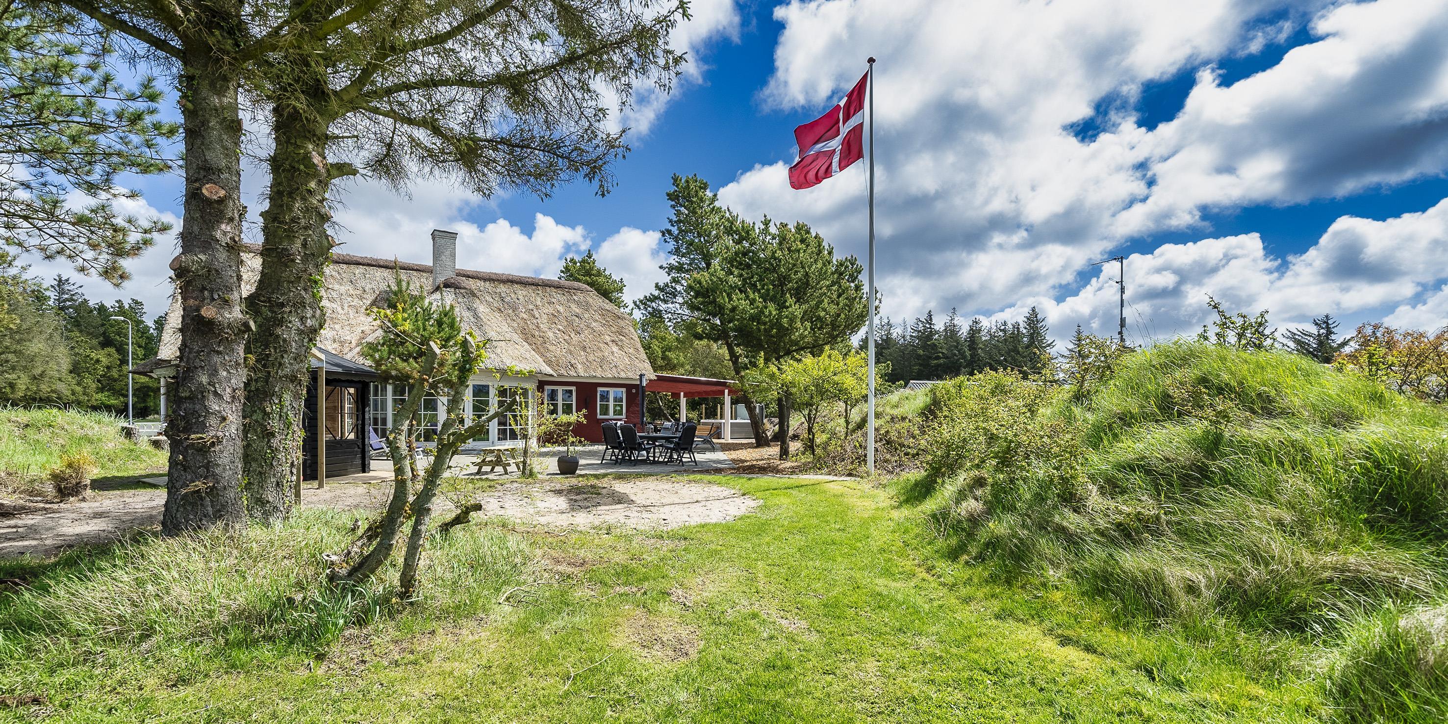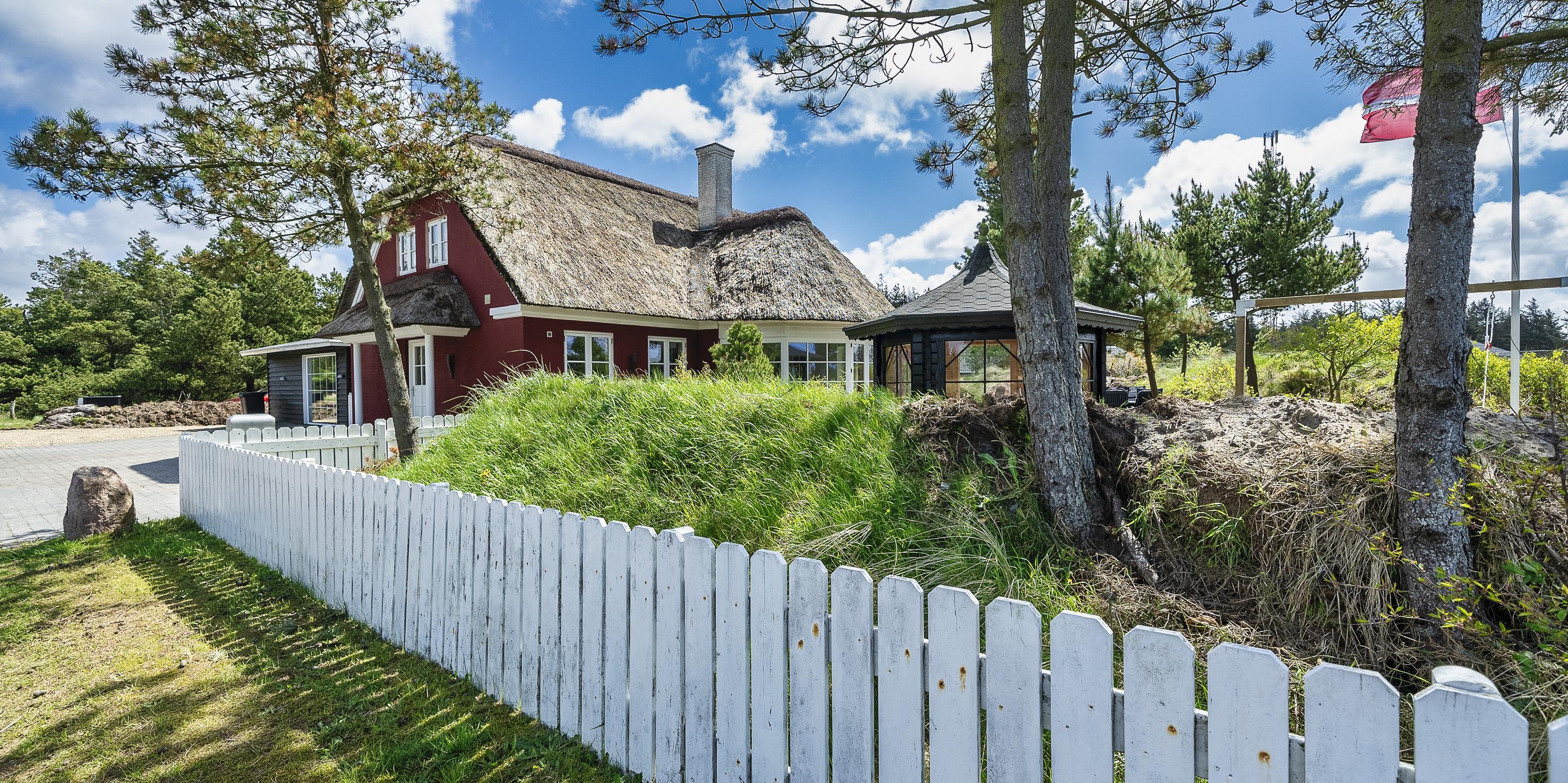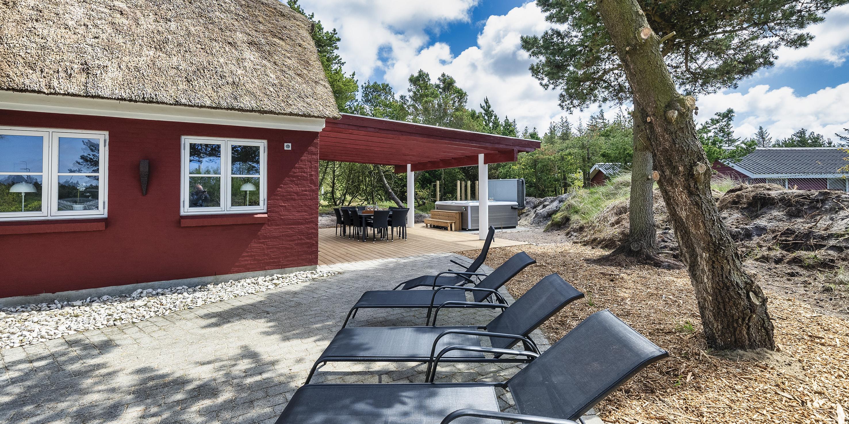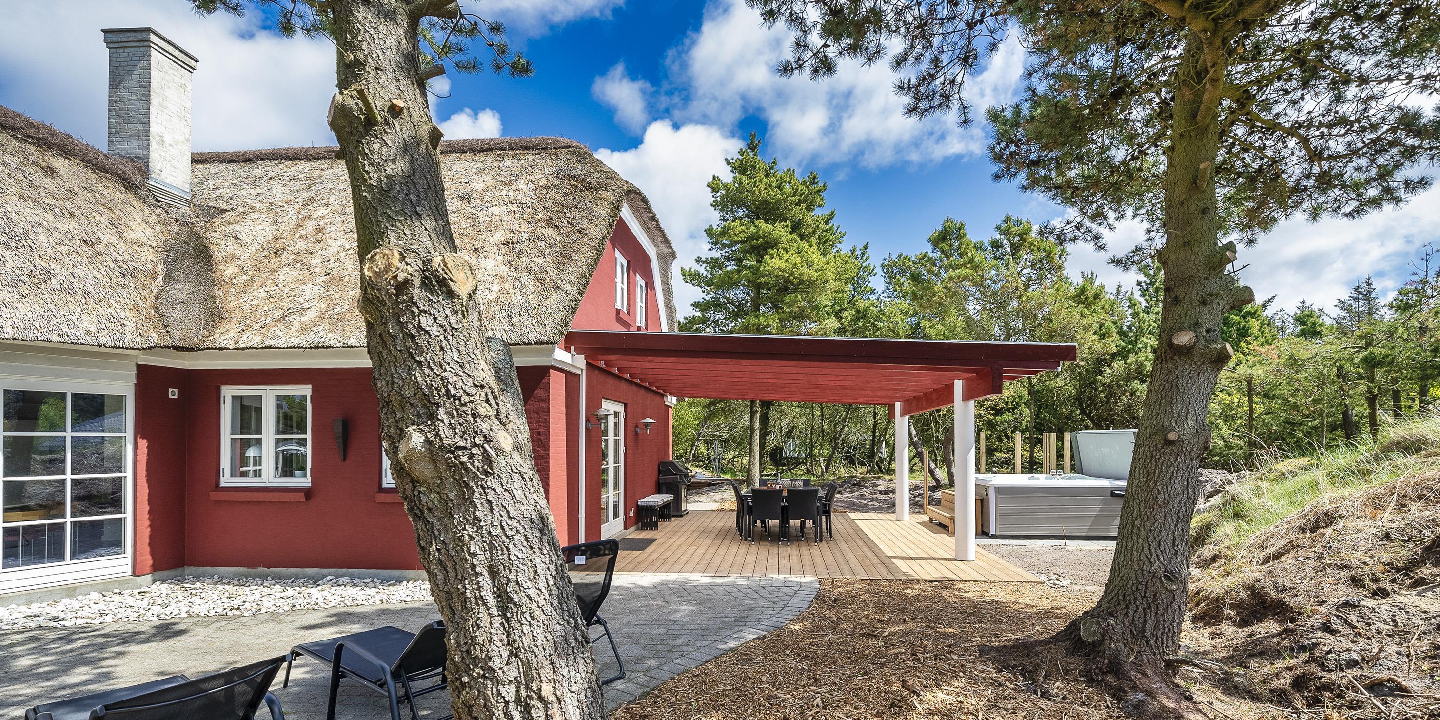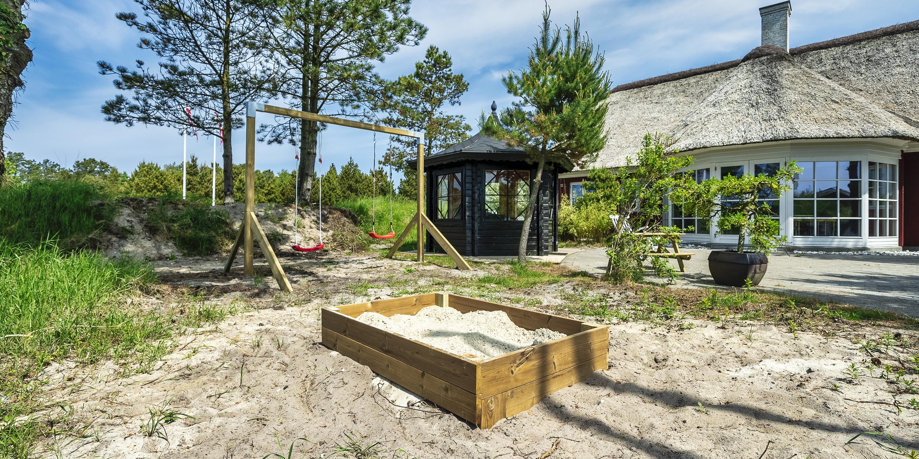 Neu renoviertes großes und aufregendes Aktivitätshaus in Vejers Strand. Das Haus ist ein idyllisches Reetdachsteinhaus mit einer beeindruckenden Wohnfläche von 195 Quadratmetern und einem separaten Aktivitätshaus von ca. 49 m2. Das Haus liegt in der Nähe von Geschäften und Restaurants auf einem großen, geschlossenen Grundstück von ca. 1663 m2. Ein paar Meter von Vejers Nordplantage und etwa 1850 Meter vom Strand entfernt. Das Grundstück ist komplett eingezäunt und durch eine kleine Mauer an der Vorderseite des Hauses vom Straßenbereich getrennt. Das Haus bietet eine schöne Atmosphäre, überall offen und mit einem großen Panoramafenster zum Garten. Das Haus ist ca. 7 Autominuten vom Stadtzentrum von Vejer entfernt, wo es mehrere Restaurants, eine Pizzeria, 2 Lebensmittelgeschäfte und einen Drops gibt, der Eis und Softeis verkauft. Das Sommerhaus bietet Platz für insgesamt 10 Bewohner. Der großzügige Eingangsbereich ist gefliest und bietet viel Platz für eine Garderobe und zusätzliche Ausstellungsfläche. Waschmaschine und Trockner befinden sich im separaten Hauswirtschaftsraum. Auch hier gibt es im Eingangsbereich eine Holztreppe, die in das Obergeschoss führt. Der Flur im Obergeschoss verfügt über ein Geländer, sodass Sie in den Essbereich hinunterblicken können. Es gibt 5 Schlafzimmer: DB + DB + DB + 2B + 2B. Auf dieser Etage befindet sich auch ein Badezimmer. Das Badezimmer ist mit einem Waschbecken, einer Toilette und einer Dusche ausgestattet. Das Regal besteht aus Holz, da das Waschbecken in die Holzplatte eingefasst ist und im Badezimmer auch eine Fußbodenheizung vorhanden ist. Im Erdgeschoss befinden sich direkt hinter dem Eingangsbereich die Küchenabteilung und der Essbereich. Beide sind im Bodenbereich gefliest und mit Fußbodenheizung ausgestattet. Der Essbereich ist großzügig ausgestattet mit einem schönen runden Esstisch, an dem alle Bewohner ihren Platz finden. Großes Panoramafenster mit Blick auf den Garten und Kamin vom Esstisch aus. Der an der Wand hängende Kamin sorgt für wohlige Wärme und strahlt pure Wärme aus. Dank der hohen Decke herrscht im Ferienhaus eine gute Atmosphäre. Die Küche ist modern und mit allem ausgestattet, was das Herz begehrt. Es verfügt über einen Herd mit Cerankochfeld, einen Backofen, einen Geschirrspüler, eine Mikrowelle und einen Kühlschrank. Der Bodenbereich im Flur und im Badezimmer ist mit Fußbodenheizung ausgestattet. Vom Esszimmer aus gelangt man durch eine Doppelglastür in das Wohnzimmer. Über dieser Tür befindet sich auch die Wärmepumpe. Mit dieser Wärmepumpe können Sie die Stromkosten senken, da sie energiesparend ist. Das Wohnzimmer ist mit einem Parkettboden ausgestattet und verfügt über eine gemütliche Sitzecke und einen Fernseher. Das TV-Programm empfangen Sie über Stofa, es stehen also nur 5-8 deutsche Sender zur Verfügung, Smart TV ist ebenfalls vorhanden. Vom Wohn- und Essbereich gibt es Zugang zur großen überdachten Holzterrasse. Im Erdgeschoss gibt es ein weiteres schönes Badezimmer mit Waschbecken, Toilette und Dusche. Hier finden Sie auch eine Sauna und einen Eckwhirlpool.
