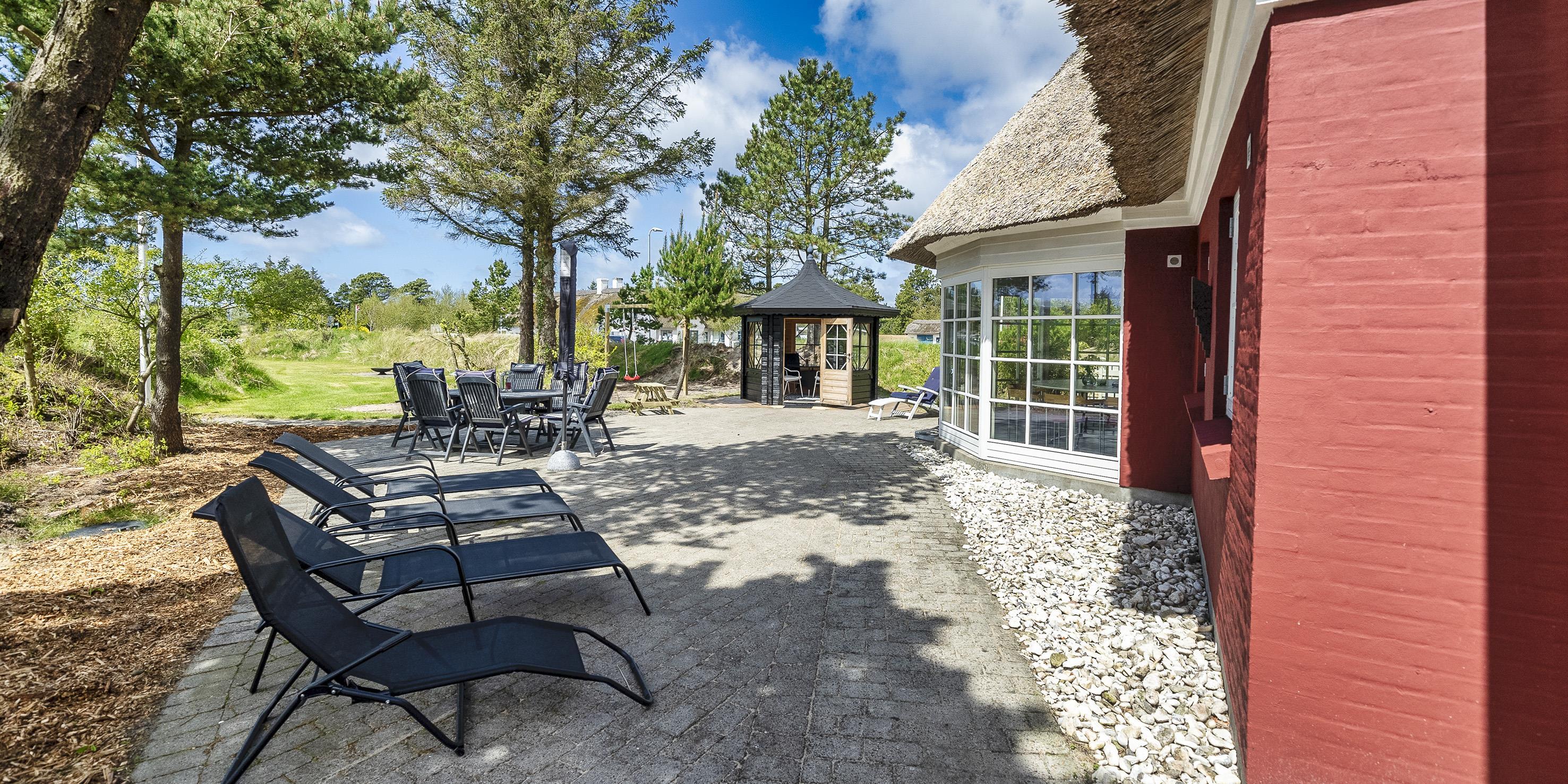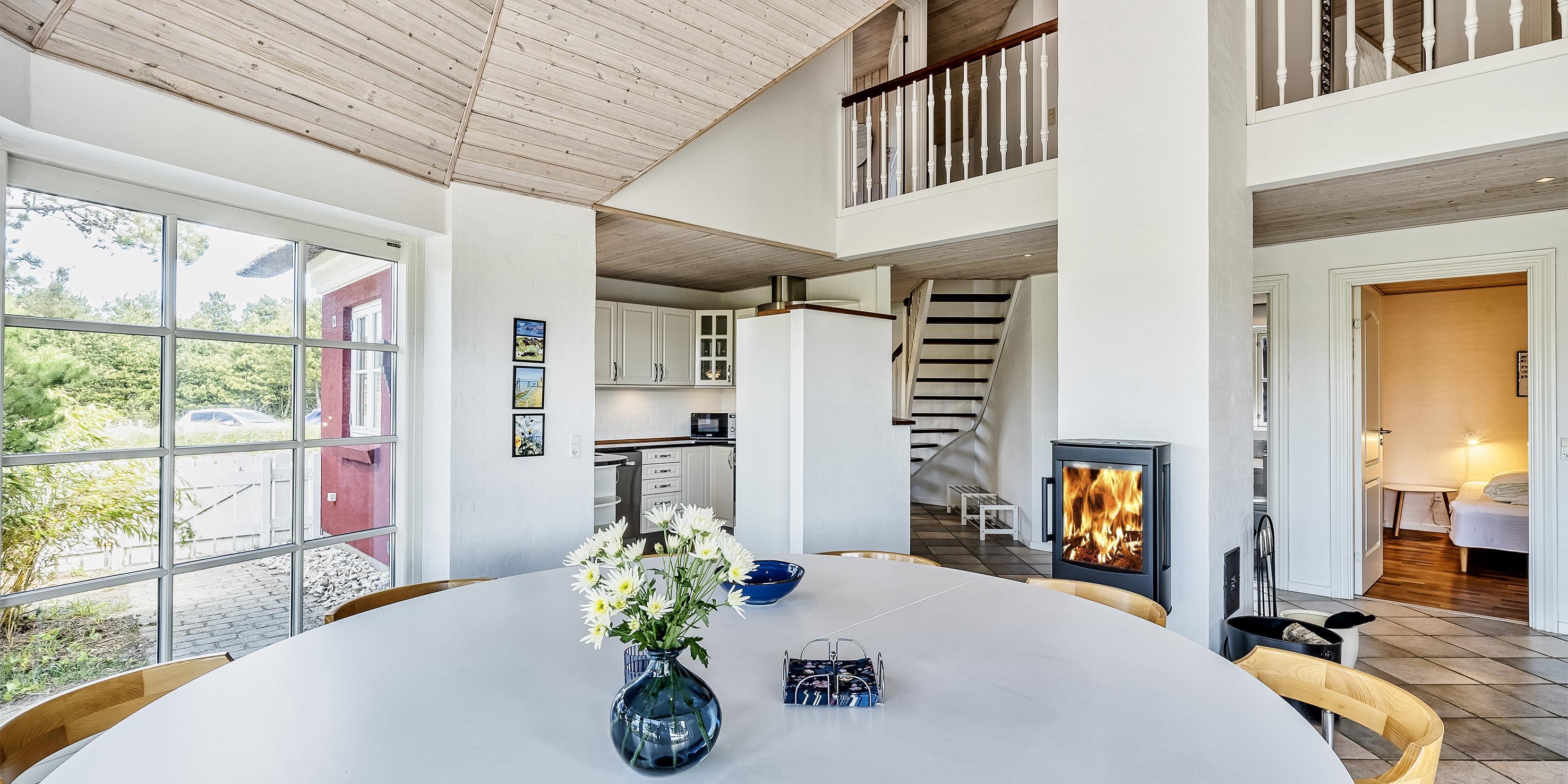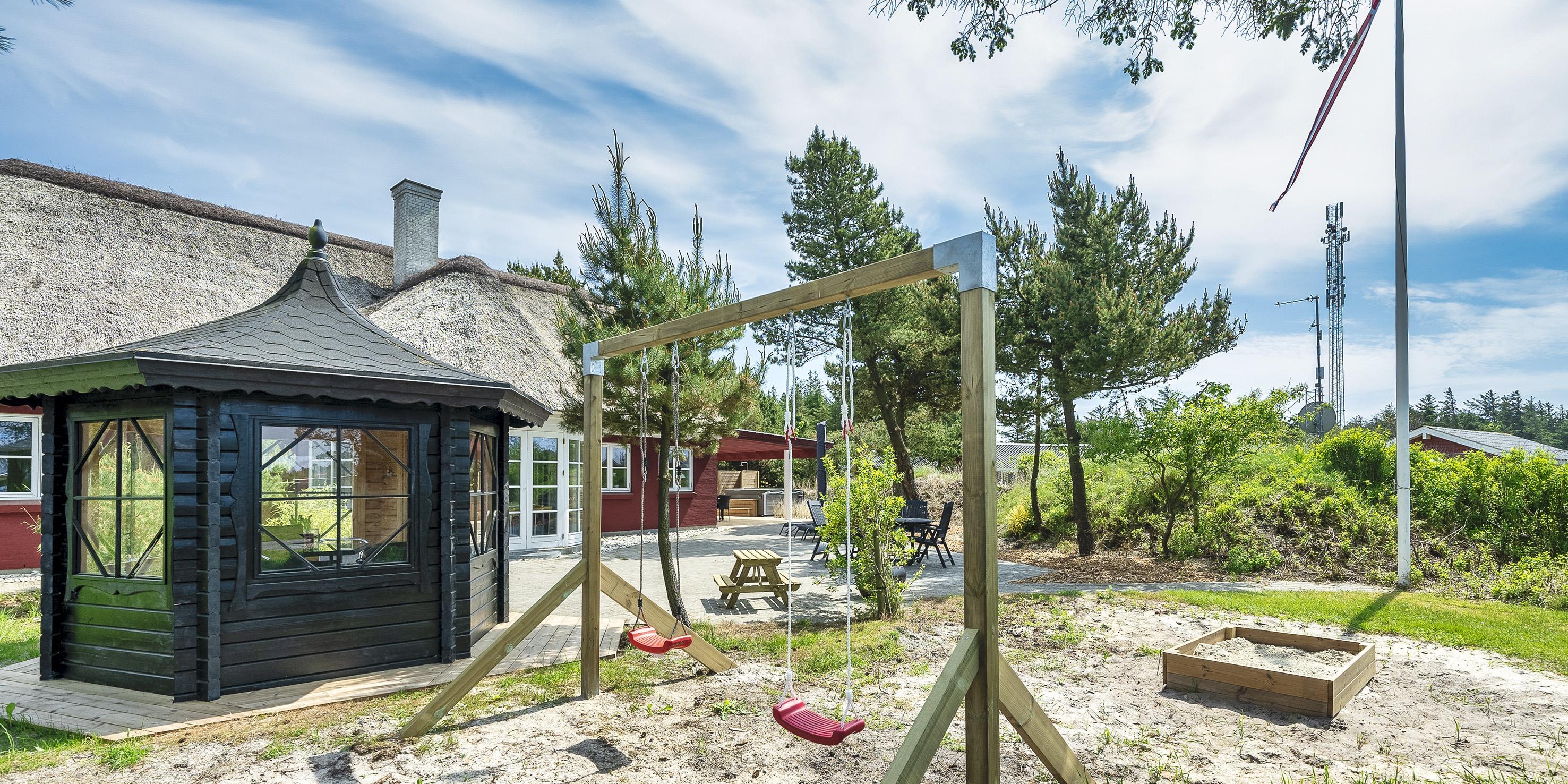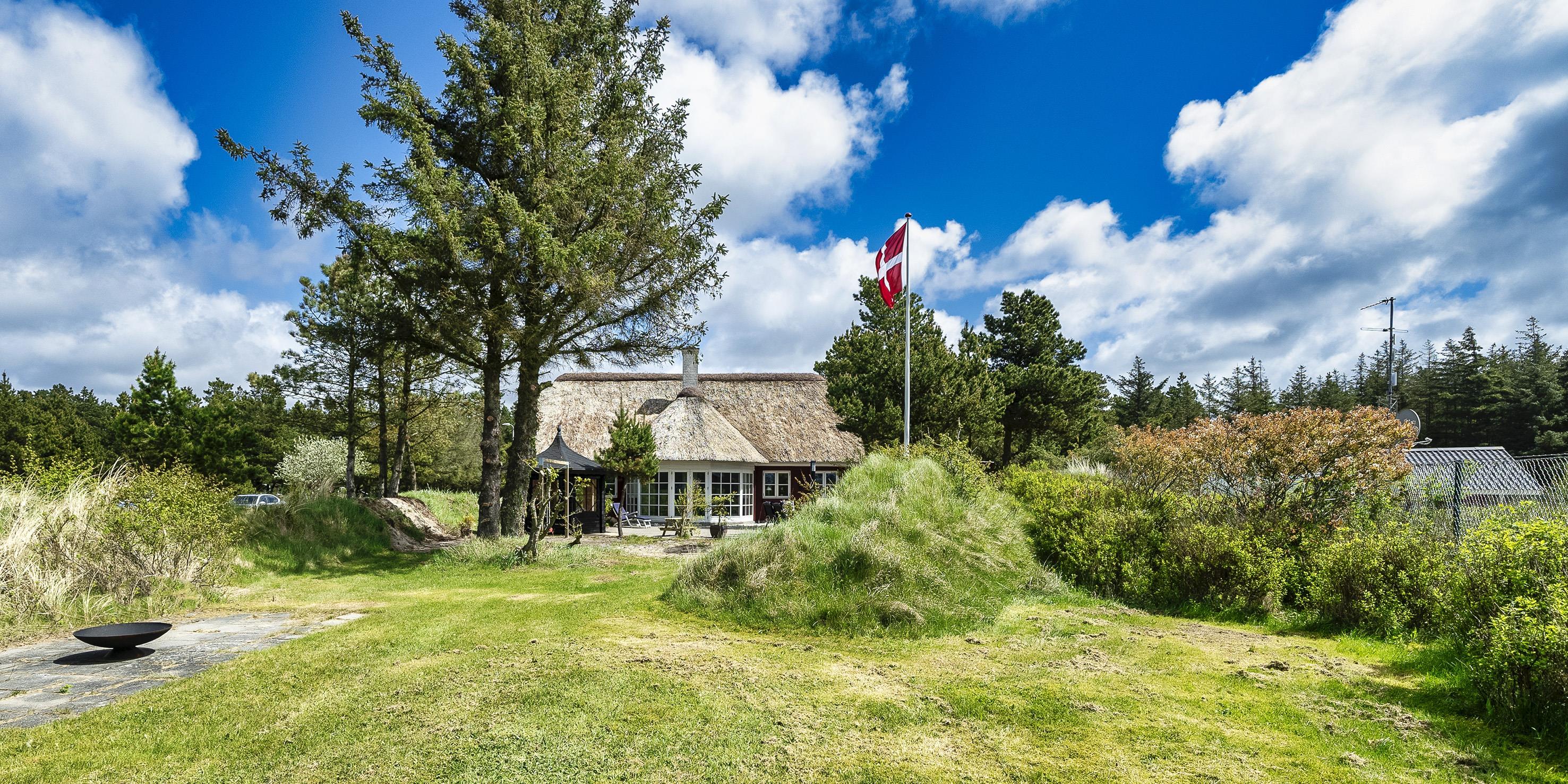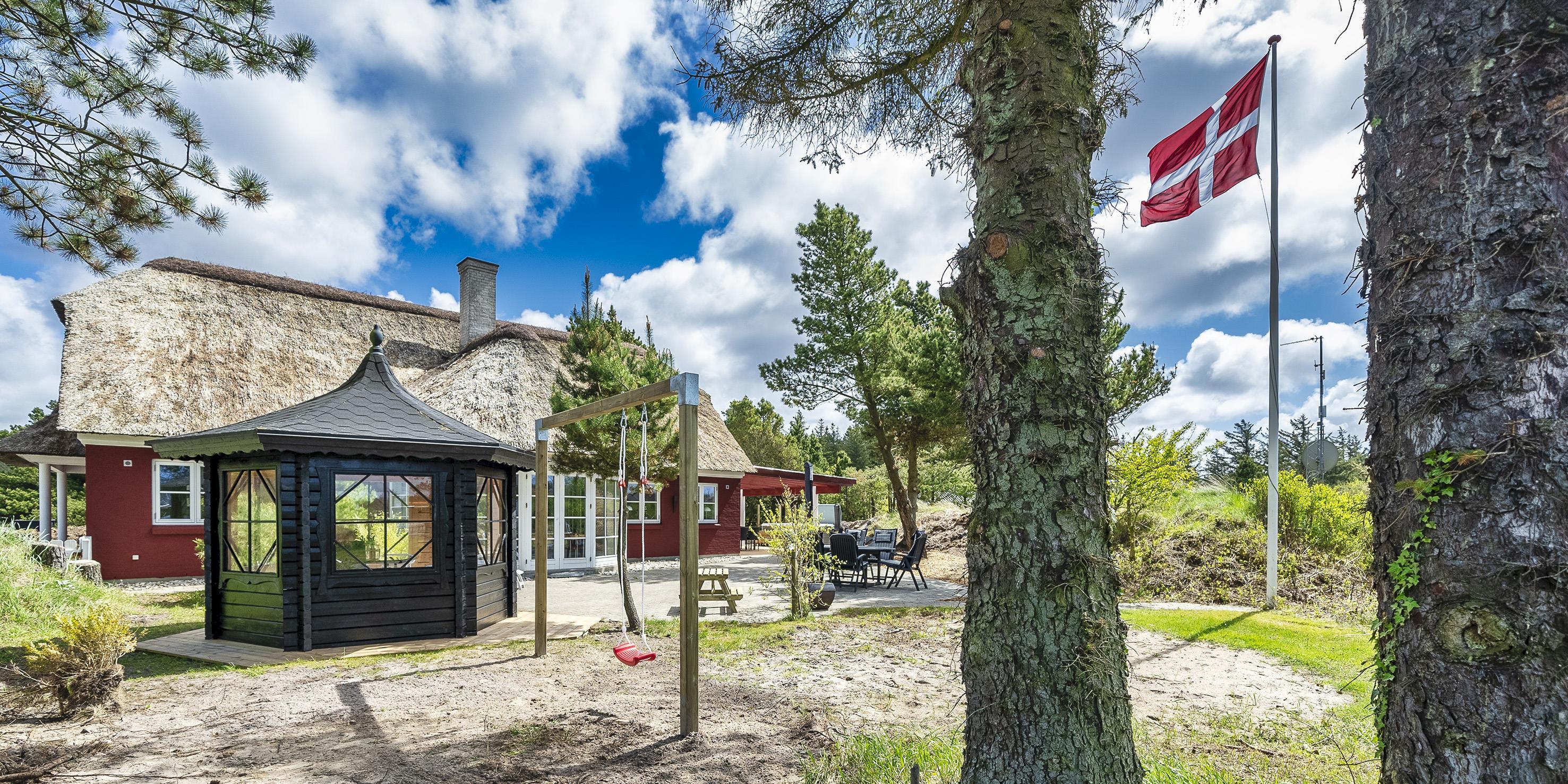 Neu renoviertes großes und aufregendes Aktivitätshaus in Vejers Strand. Das Haus ist ein idyllisches Reetdachsteinhaus mit einer beeindruckenden Wohnfläche von 195 Quadratmetern und einem separaten Aktivitätshaus von ca. 49 m2. Das Haus liegt in der Nähe von Geschäften und Restaurants auf einem großen, geschlossenen Grundstück von ca. 1663 m2. Ein paar Meter von Vejers Nordplantage und etwa 1850 Meter vom Strand entfernt. Das Grundstück ist komplett eingezäunt und durch eine kleine Mauer an der Vorderseite des Hauses vom Straßenbereich getrennt. Das Haus bietet eine schöne Atmosphäre, überall offen und mit einem großen Panoramafenster zum Garten. Das Haus ist ca. 7 Autominuten vom Stadtzentrum von Vejer entfernt, wo es mehrere Restaurants, eine Pizzeria, 2 Lebensmittelgeschäfte und einen Drops gibt, der Eis und Softeis verkauft. Das Sommerhaus bietet Platz für insgesamt 10 Bewohner. Der großzügige Eingangsbereich ist gefliest und bietet viel Platz für eine Garderobe und zusätzliche Ausstellungsfläche. Waschmaschine und Trockner befinden sich im separaten Hauswirtschaftsraum. Auch hier gibt es im Eingangsbereich eine Holztreppe, die in das Obergeschoss führt. Der Flur im Obergeschoss verfügt über ein Geländer, sodass Sie in den Essbereich hinunterblicken können. Es gibt 5 Schlafzimmer: DB + DB + DB + 2B + 2B. Auf dieser Etage befindet sich auch ein Badezimmer. Das Badezimmer ist mit einem Waschbecken, einer Toilette und einer Dusche ausgestattet. Das Regal besteht aus Holz, da das Waschbecken in die Holzplatte eingefasst ist und im Badezimmer auch eine Fußbodenheizung vorhanden ist. Im Erdgeschoss befinden sich direkt hinter dem Eingangsbereich die Küchenabteilung und der Essbereich. Beide sind im Bodenbereich gefliest und mit Fußbodenheizung ausgestattet. Der Essbereich ist großzügig ausgestattet mit einem schönen runden Esstisch, an dem alle Bewohner ihren Platz finden. Großes Panoramafenster mit Blick auf den Garten und Kamin vom Esstisch aus. Der an der Wand hängende Kamin sorgt für wohlige Wärme und strahlt pure Wärme aus. Dank der hohen Decke herrscht im Ferienhaus eine gute Atmosphäre. Die Küche ist modern und mit allem ausgestattet, was das Herz begehrt. Es verfügt über einen Herd mit Cerankochfeld, einen Backofen, einen Geschirrspüler, eine Mikrowelle und einen Kühlschrank. Der Bodenbereich im Flur und im Badezimmer ist mit Fußbodenheizung ausgestattet. Vom Esszimmer aus gelangt man durch eine Doppelglastür in das Wohnzimmer. Über dieser Tür befindet sich auch die Wärmepumpe. Mit dieser Wärmepumpe können Sie die Stromkosten senken, da sie energiesparend ist. Das Wohnzimmer ist mit einem Parkettboden ausgestattet und verfügt über eine gemütliche Sitzecke und einen Fernseher. Das TV-Programm empfangen Sie über Stofa, es stehen also nur 5-8 deutsche Sender zur Verfügung, Smart TV ist ebenfalls vorhanden. Vom Wohn- und Essbereich gibt es Zugang zur großen überdachten Holzterrasse. Im Erdgeschoss gibt es ein weiteres schönes Badezimmer mit Waschbecken, Toilette und Dusche. Hier finden Sie auch eine Sauna und einen Eckwhirlpool.