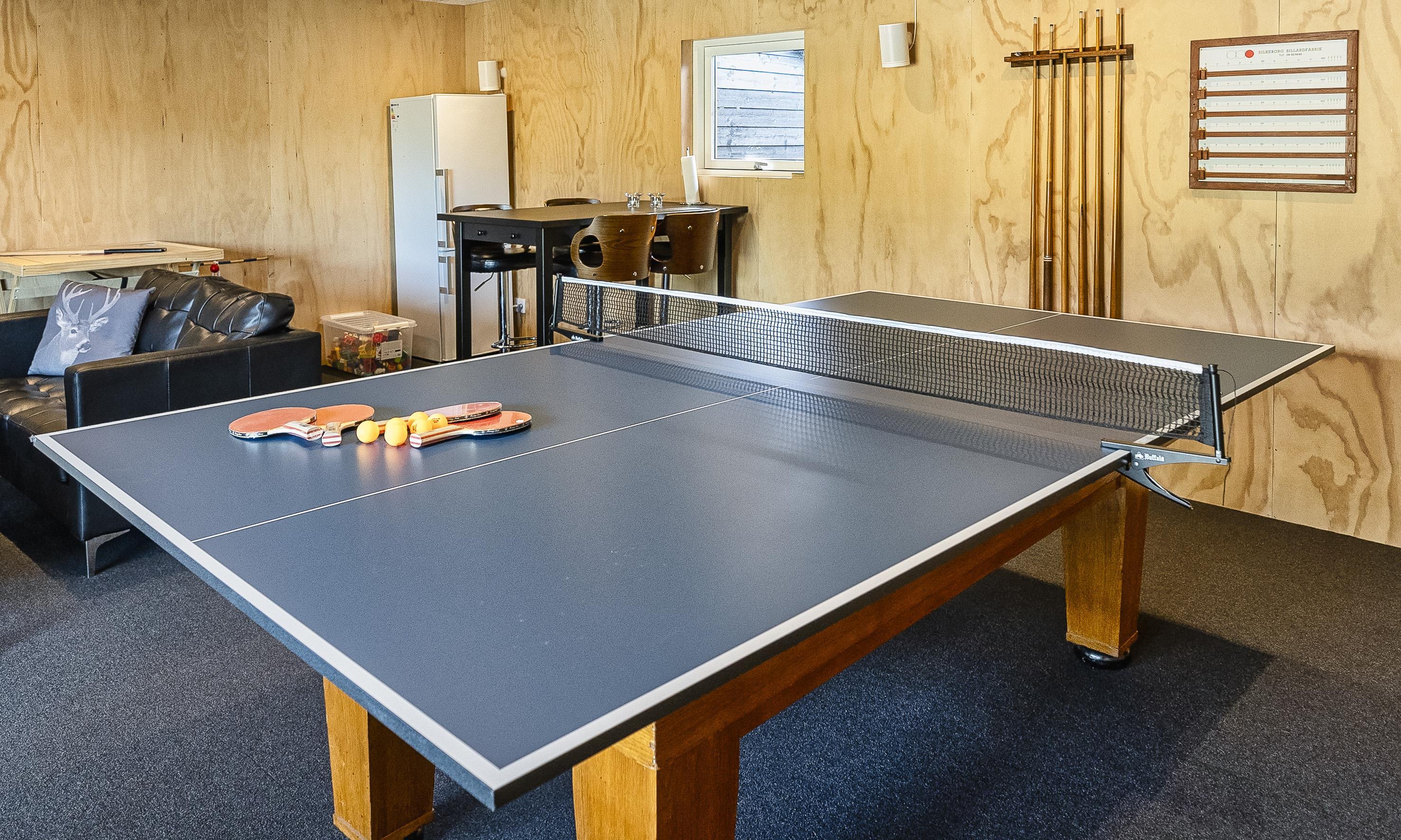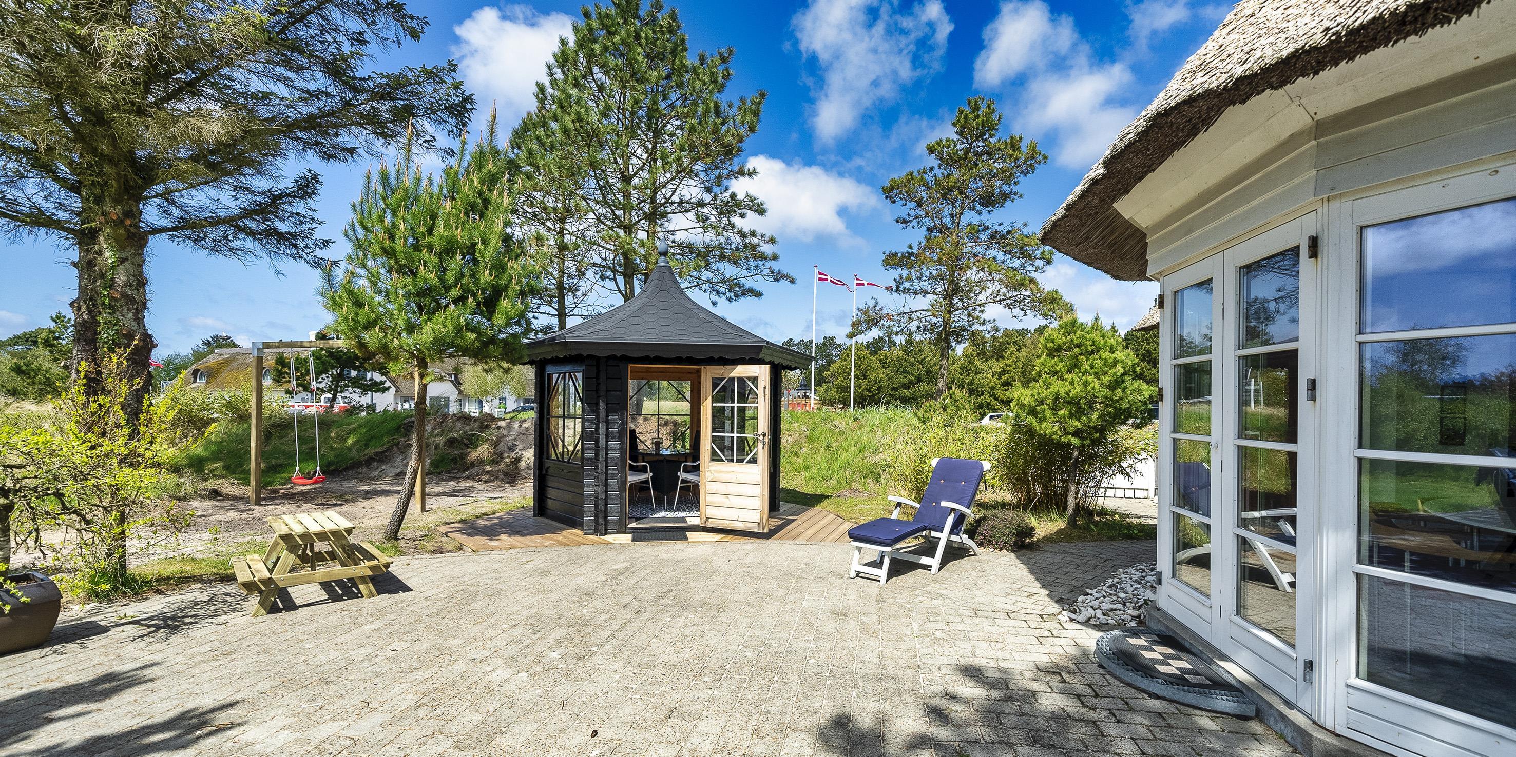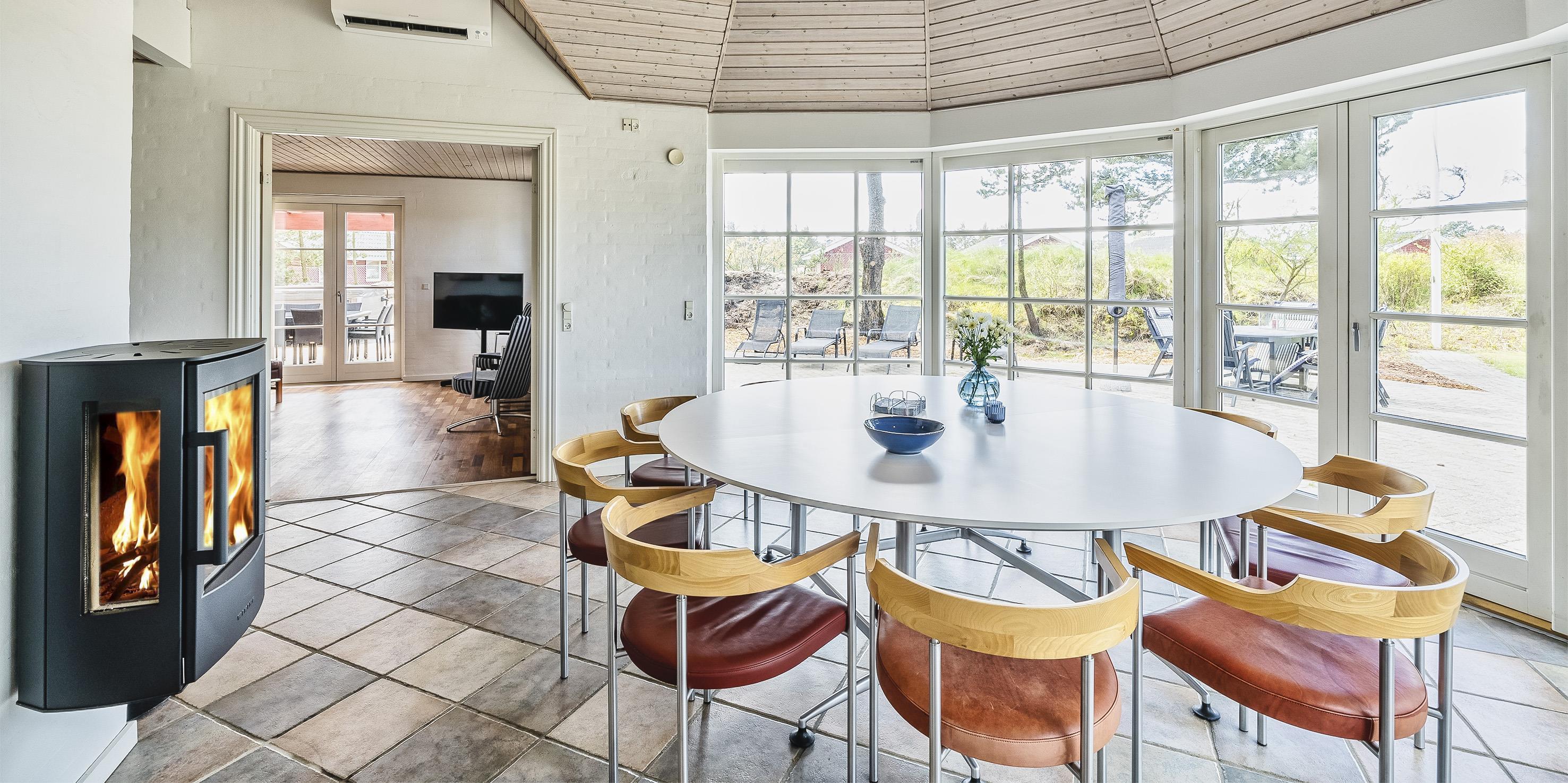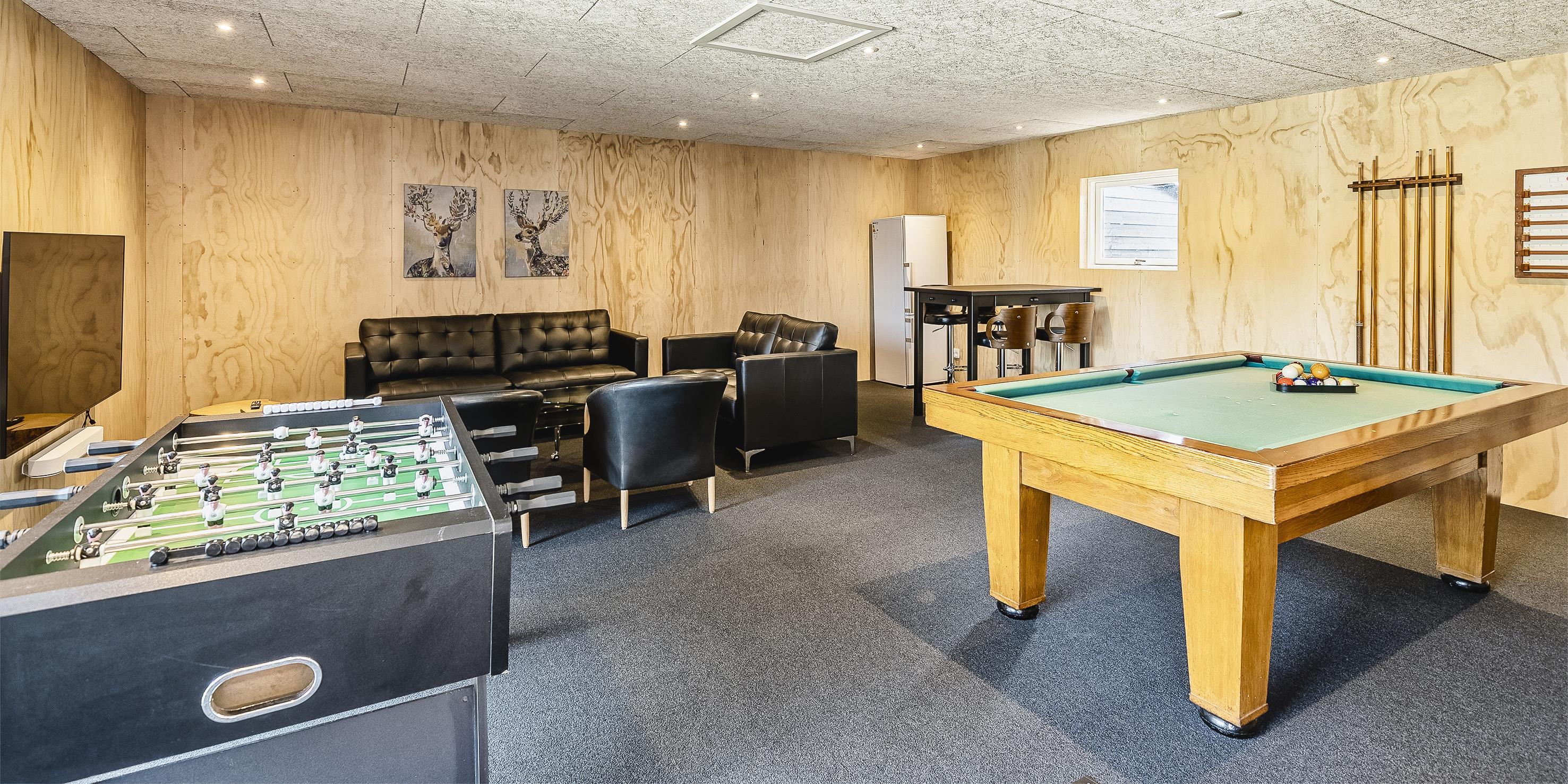 Neu renoviertes großes und aufregendes Aktivitätshaus in Vejers Strand. Das Haus ist ein idyllisches Reetdachsteinhaus mit einer beeindruckenden Wohnfläche von 195 Quadratmetern und einem separaten Aktivitätshaus von ca. 49 m2. Das Haus liegt in der Nähe von Geschäften und Restaurants auf einem großen, geschlossenen Grundstück von ca. 1663 m2. Ein paar Meter von Vejers Nordplantage und etwa 1850 Meter vom Strand entfernt. Das Grundstück ist komplett eingezäunt und durch eine kleine Mauer an der Vorderseite des Hauses vom Straßenbereich getrennt. Das Haus bietet eine schöne Atmosphäre, überall offen und mit einem großen Panoramafenster zum Garten. Das Haus ist ca. 7 Autominuten vom Stadtzentrum von Vejer entfernt, wo es mehrere Restaurants, eine Pizzeria, 2 Lebensmittelgeschäfte und einen Drops gibt, der Eis und Softeis verkauft. Das Sommerhaus bietet Platz für insgesamt 10 Bewohner. Der großzügige Eingangsbereich ist gefliest und bietet viel Platz für eine Garderobe und zusätzliche Ausstellungsfläche. Waschmaschine und Trockner befinden sich im separaten Hauswirtschaftsraum. Auch hier gibt es im Eingangsbereich eine Holztreppe, die in das Obergeschoss führt. Der Flur im Obergeschoss verfügt über ein Geländer, sodass Sie in den Essbereich hinunterblicken können. Es gibt 5 Schlafzimmer: DB + DB + DB + 2B + 2B. Auf dieser Etage befindet sich auch ein Badezimmer. Das Badezimmer ist mit einem Waschbecken, einer Toilette und einer Dusche ausgestattet. Das Regal besteht aus Holz, da das Waschbecken in die Holzplatte eingefasst ist und im Badezimmer auch eine Fußbodenheizung vorhanden ist. Im Erdgeschoss befinden sich direkt hinter dem Eingangsbereich die Küchenabteilung und der Essbereich. Beide sind im Bodenbereich gefliest und mit Fußbodenheizung ausgestattet. Der Essbereich ist großzügig ausgestattet mit einem schönen runden Esstisch, an dem alle Bewohner ihren Platz finden. Großes Panoramafenster mit Blick auf den Garten und Kamin vom Esstisch aus. Der an der Wand hängende Kamin sorgt für wohlige Wärme und strahlt pure Wärme aus. Dank der hohen Decke herrscht im Ferienhaus eine gute Atmosphäre. Die Küche ist modern und mit allem ausgestattet, was das Herz begehrt. Es verfügt über einen Herd mit Cerankochfeld, einen Backofen, einen Geschirrspüler, eine Mikrowelle und einen Kühlschrank. Der Bodenbereich im Flur und im Badezimmer ist mit Fußbodenheizung ausgestattet. Vom Esszimmer aus gelangt man durch eine Doppelglastür in das Wohnzimmer. Über dieser Tür befindet sich auch die Wärmepumpe. Mit dieser Wärmepumpe können Sie die Stromkosten senken, da sie energiesparend ist. Das Wohnzimmer ist mit einem Parkettboden ausgestattet und verfügt über eine gemütliche Sitzecke und einen Fernseher. Das TV-Programm empfangen Sie über Stofa, es stehen also nur 5-8 deutsche Sender zur Verfügung, Smart TV ist ebenfalls vorhanden. Vom Wohn- und Essbereich gibt es Zugang zur großen überdachten Holzterrasse. Im Erdgeschoss gibt es ein weiteres schönes Badezimmer mit Waschbecken, Toilette und Dusche. Hier finden Sie auch eine Sauna und einen Eckwhirlpool.