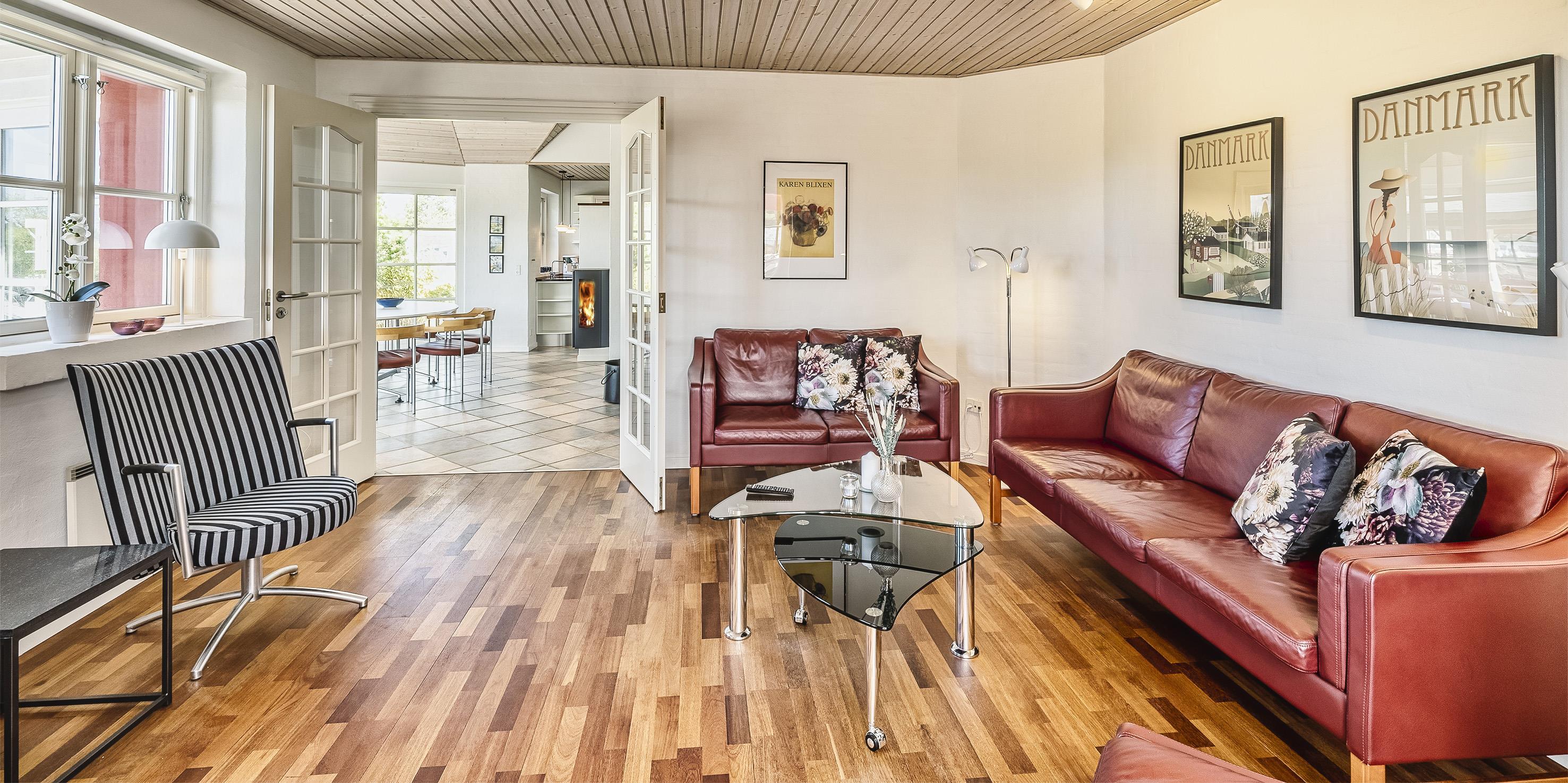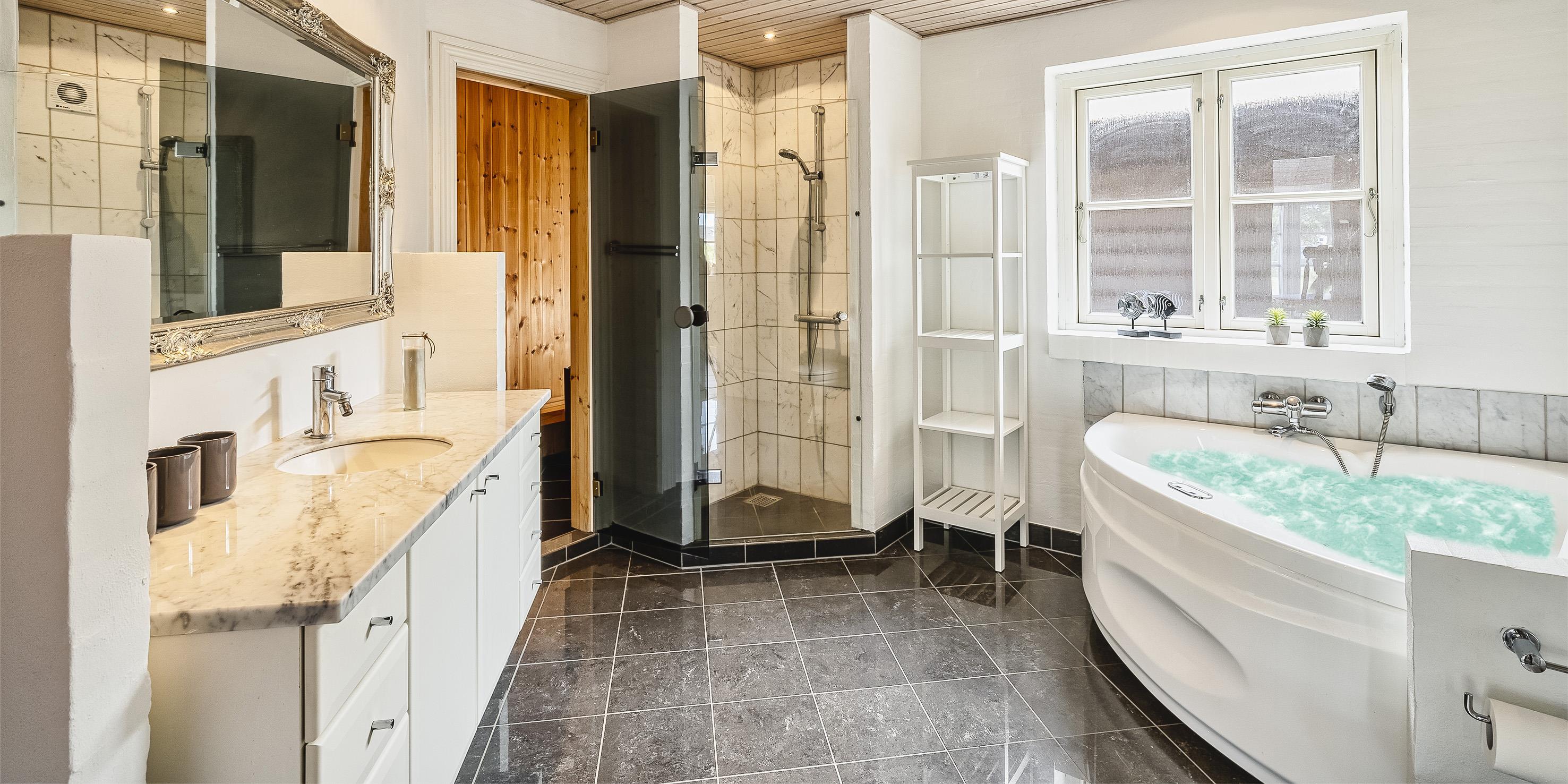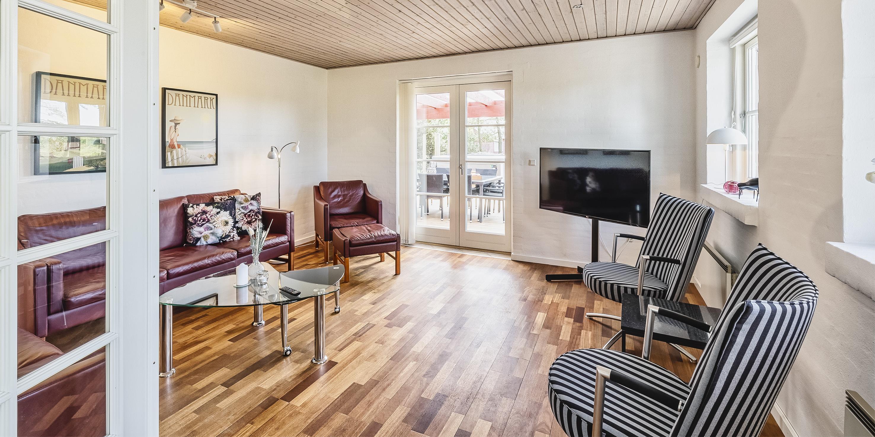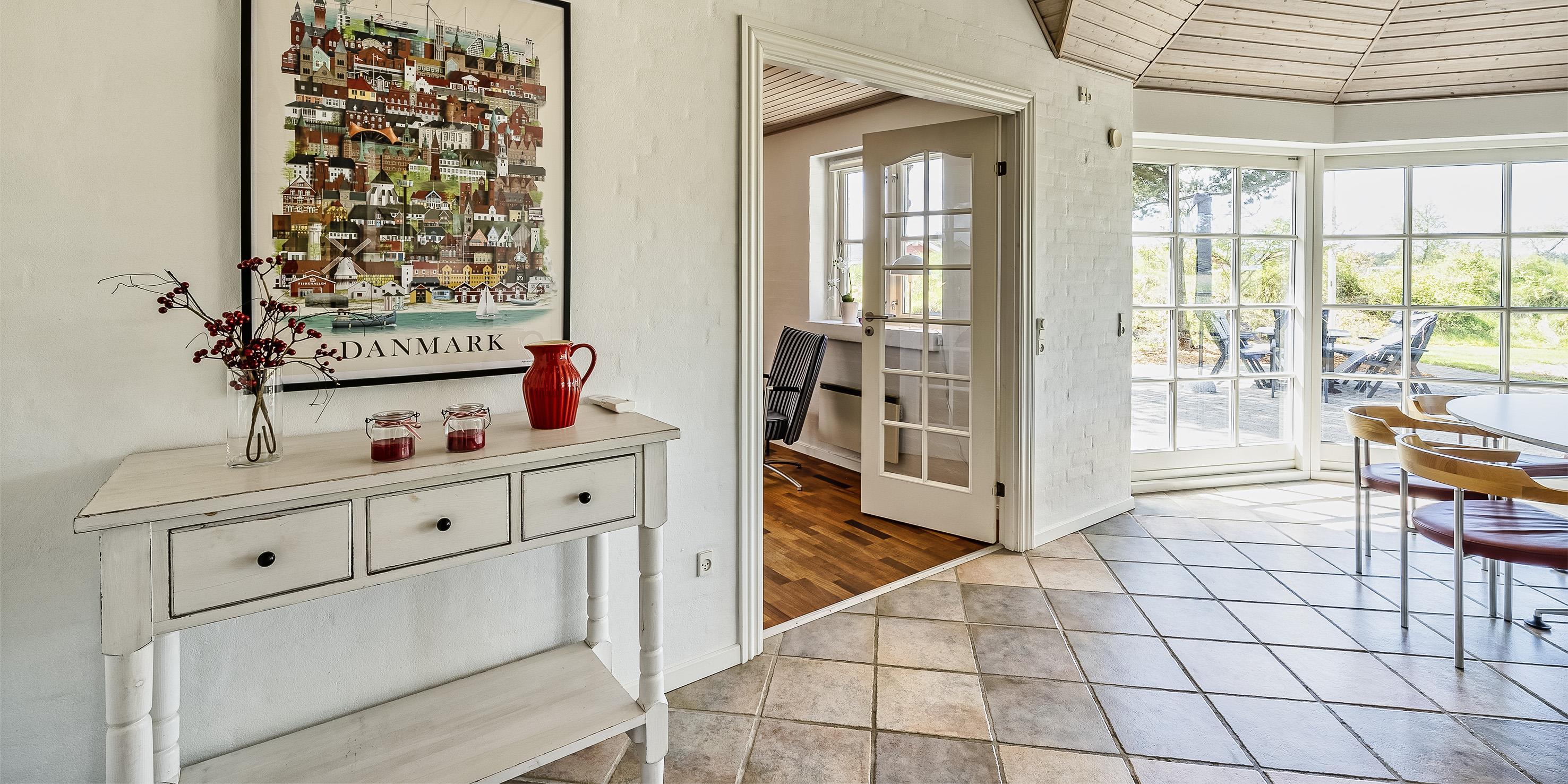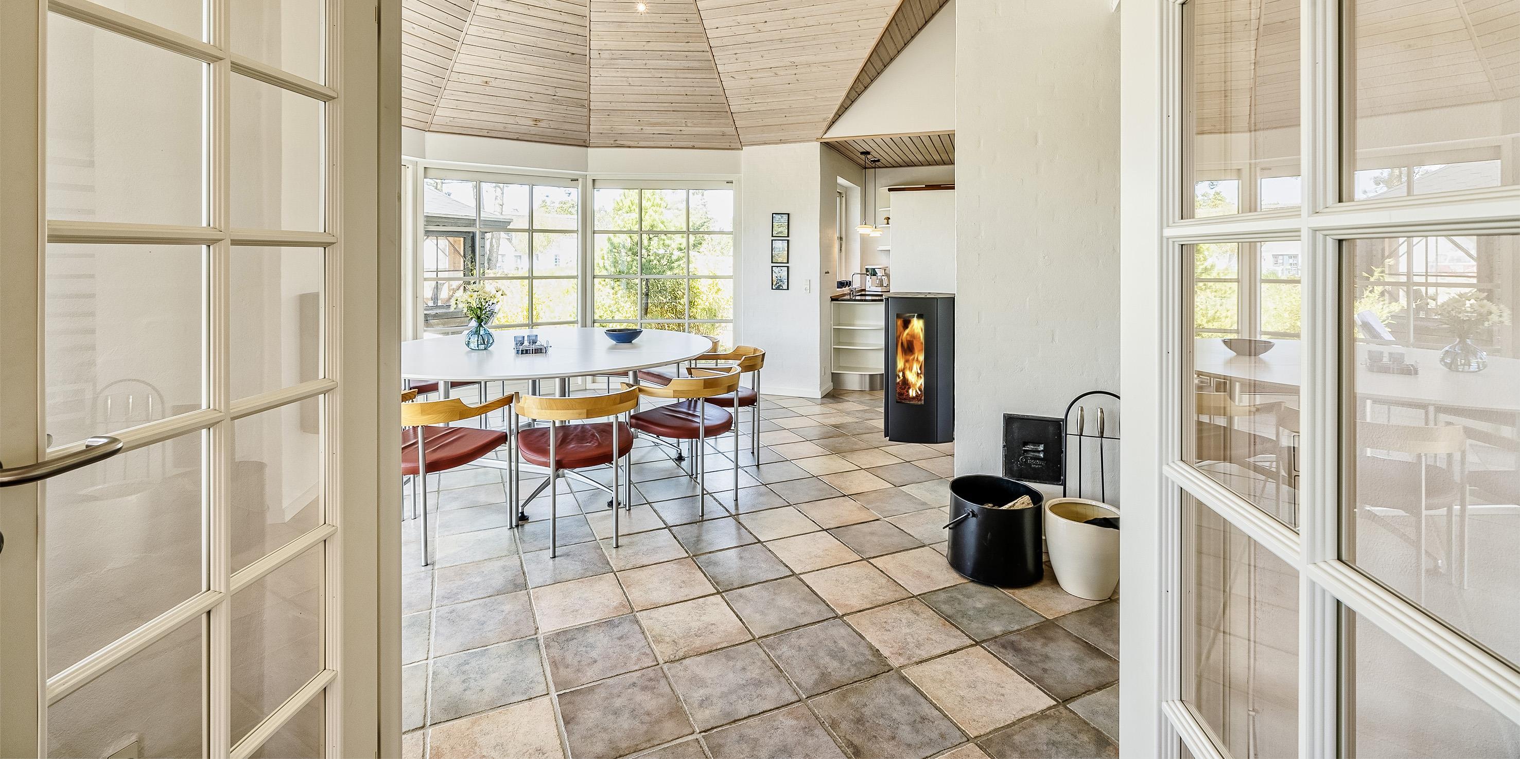 Neu renoviertes großes und aufregendes Aktivitätshaus in Vejers Strand. Das Haus ist ein idyllisches Reetdachsteinhaus mit einer beeindruckenden Wohnfläche von 195 Quadratmetern und einem separaten Aktivitätshaus von ca. 49 m2. Das Haus liegt in der Nähe von Geschäften und Restaurants auf einem großen, geschlossenen Grundstück von ca. 1663 m2. Ein paar Meter von Vejers Nordplantage und etwa 1850 Meter vom Strand entfernt. Das Grundstück ist komplett eingezäunt und durch eine kleine Mauer an der Vorderseite des Hauses vom Straßenbereich getrennt. Das Haus bietet eine schöne Atmosphäre, überall offen und mit einem großen Panoramafenster zum Garten. Das Haus ist ca. 7 Autominuten vom Stadtzentrum von Vejer entfernt, wo es mehrere Restaurants, eine Pizzeria, 2 Lebensmittelgeschäfte und einen Drops gibt, der Eis und Softeis verkauft. Das Sommerhaus bietet Platz für insgesamt 10 Bewohner. Der großzügige Eingangsbereich ist gefliest und bietet viel Platz für eine Garderobe und zusätzliche Ausstellungsfläche. Waschmaschine und Trockner befinden sich im separaten Hauswirtschaftsraum. Auch hier gibt es im Eingangsbereich eine Holztreppe, die in das Obergeschoss führt. Der Flur im Obergeschoss verfügt über ein Geländer, sodass Sie in den Essbereich hinunterblicken können. Es gibt 5 Schlafzimmer: DB + DB + DB + 2B + 2B. Auf dieser Etage befindet sich auch ein Badezimmer. Das Badezimmer ist mit einem Waschbecken, einer Toilette und einer Dusche ausgestattet. Das Regal besteht aus Holz, da das Waschbecken in die Holzplatte eingefasst ist und im Badezimmer auch eine Fußbodenheizung vorhanden ist. Im Erdgeschoss befinden sich direkt hinter dem Eingangsbereich die Küchenabteilung und der Essbereich. Beide sind im Bodenbereich gefliest und mit Fußbodenheizung ausgestattet. Der Essbereich ist großzügig ausgestattet mit einem schönen runden Esstisch, an dem alle Bewohner ihren Platz finden. Großes Panoramafenster mit Blick auf den Garten und Kamin vom Esstisch aus. Der an der Wand hängende Kamin sorgt für wohlige Wärme und strahlt pure Wärme aus. Dank der hohen Decke herrscht im Ferienhaus eine gute Atmosphäre. Die Küche ist modern und mit allem ausgestattet, was das Herz begehrt. Es verfügt über einen Herd mit Cerankochfeld, einen Backofen, einen Geschirrspüler, eine Mikrowelle und einen Kühlschrank. Der Bodenbereich im Flur und im Badezimmer ist mit Fußbodenheizung ausgestattet. Vom Esszimmer aus gelangt man durch eine Doppelglastür in das Wohnzimmer. Über dieser Tür befindet sich auch die Wärmepumpe. Mit dieser Wärmepumpe können Sie die Stromkosten senken, da sie energiesparend ist. Das Wohnzimmer ist mit einem Parkettboden ausgestattet und verfügt über eine gemütliche Sitzecke und einen Fernseher. Das TV-Programm empfangen Sie über Stofa, es stehen also nur 5-8 deutsche Sender zur Verfügung, Smart TV ist ebenfalls vorhanden. Vom Wohn- und Essbereich gibt es Zugang zur großen überdachten Holzterrasse. Im Erdgeschoss gibt es ein weiteres schönes Badezimmer mit Waschbecken, Toilette und Dusche. Hier finden Sie auch eine Sauna und einen Eckwhirlpool.