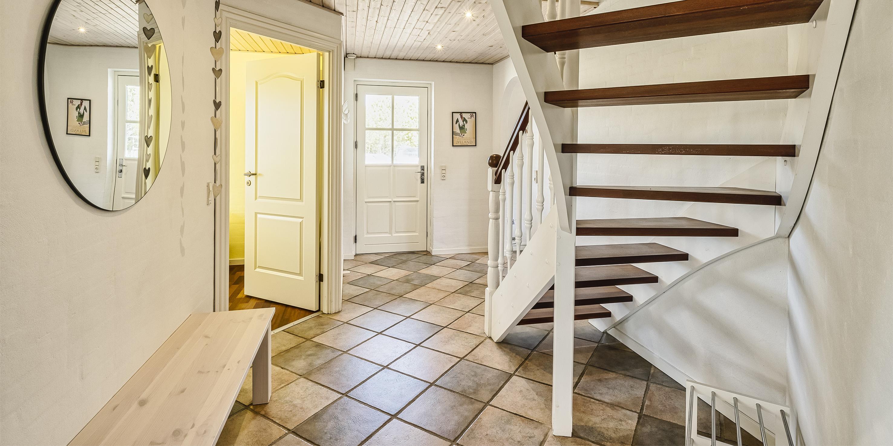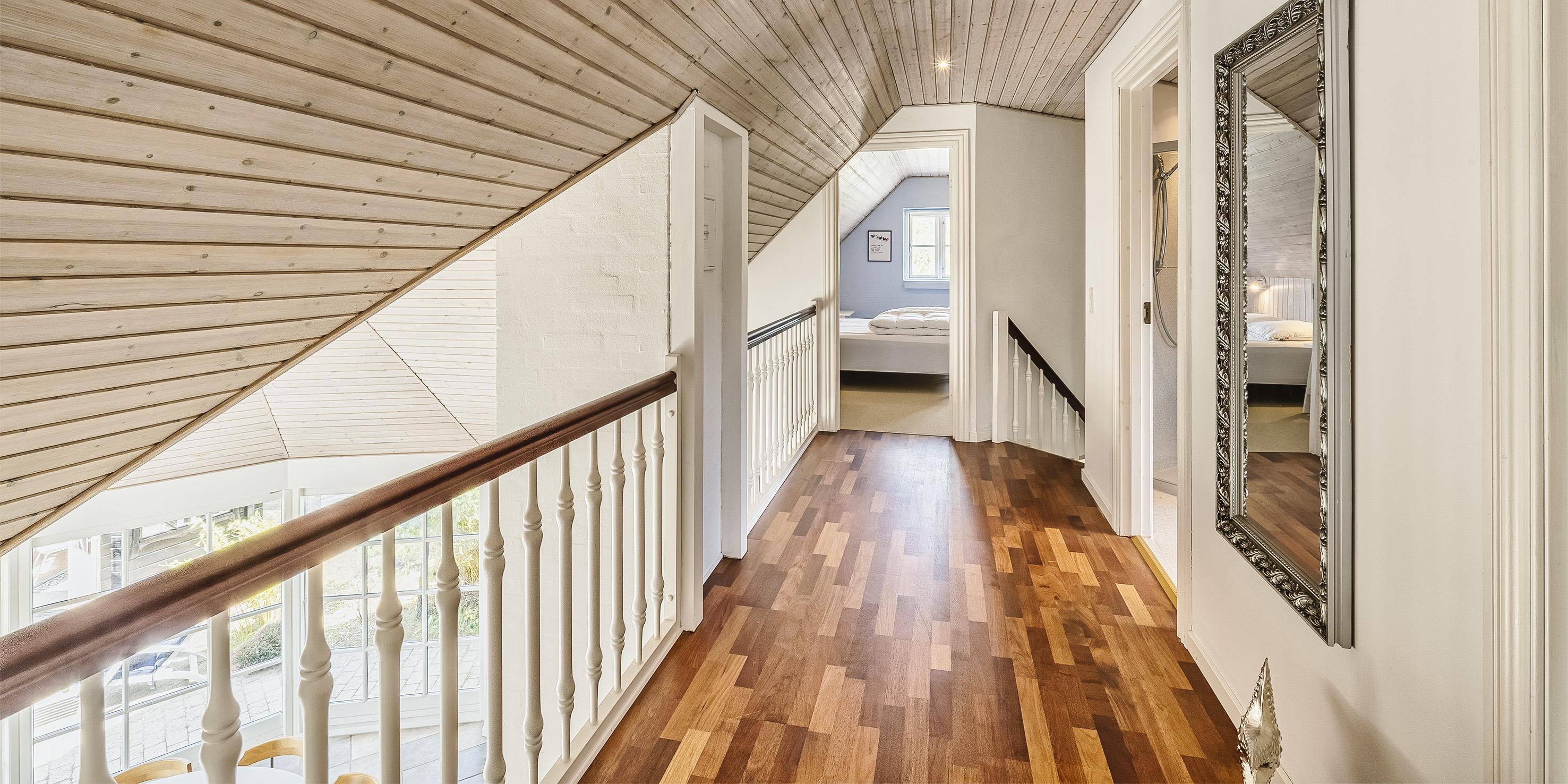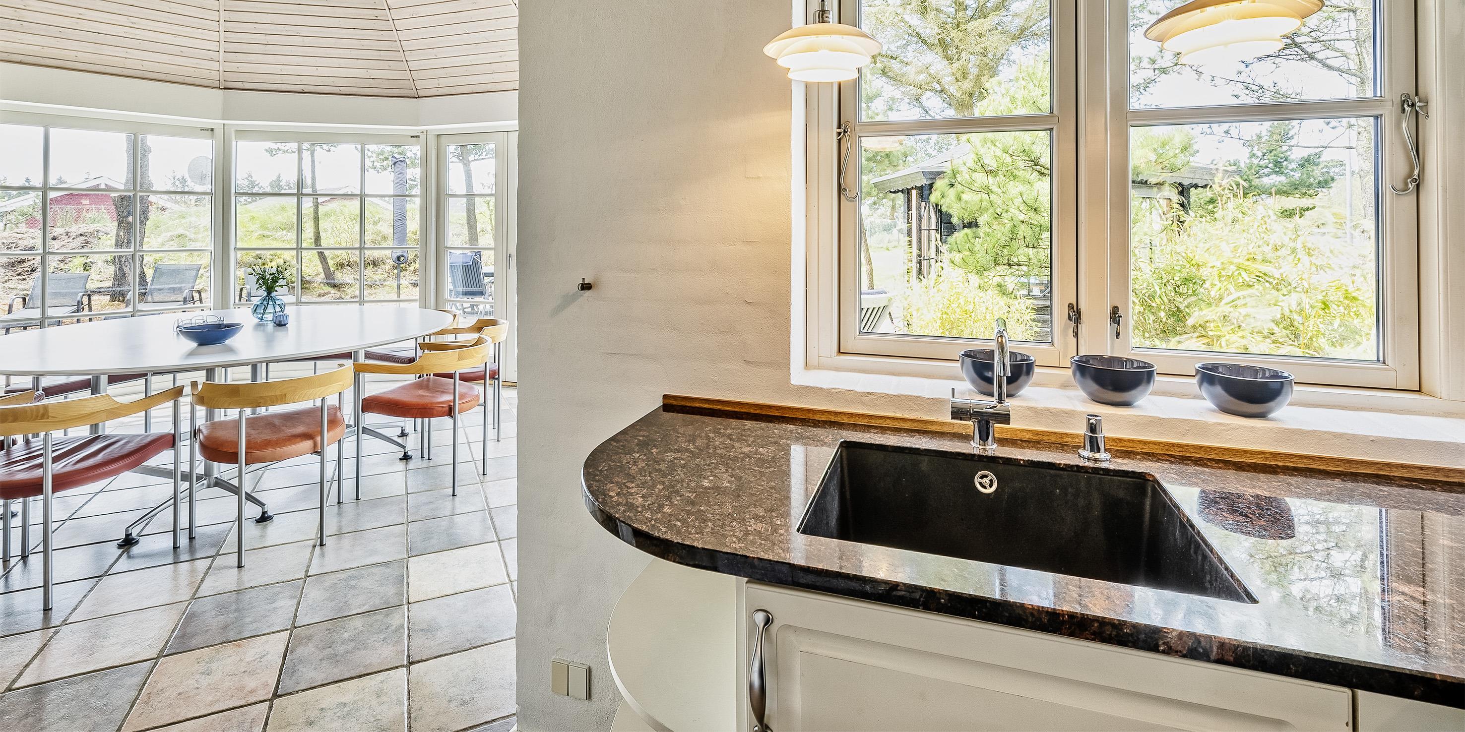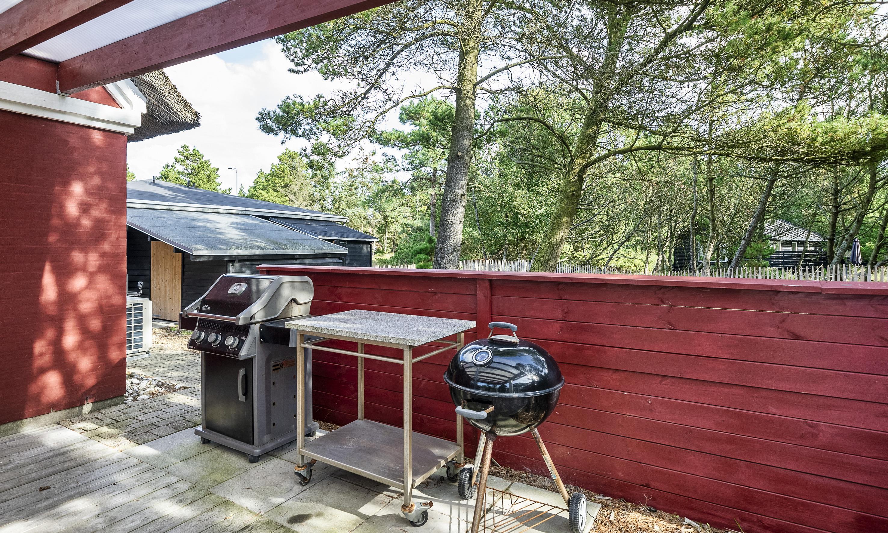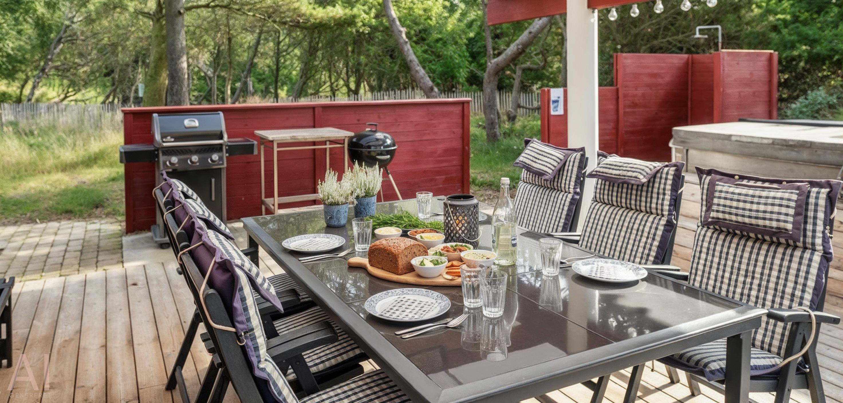 Neu renoviertes großes und aufregendes Aktivitätshaus in Vejers Strand. Das Haus ist ein idyllisches Reetdachsteinhaus mit einer beeindruckenden Wohnfläche von 195 Quadratmetern und einem separaten Aktivitätshaus von ca. 49 m2. Das Haus liegt in der Nähe von Geschäften und Restaurants auf einem großen, geschlossenen Grundstück von ca. 1663 m2. Ein paar Meter von Vejers Nordplantage und etwa 1850 Meter vom Strand entfernt. Das Grundstück ist komplett eingezäunt und durch eine kleine Mauer an der Vorderseite des Hauses vom Straßenbereich getrennt. Das Haus bietet eine schöne Atmosphäre, überall offen und mit einem großen Panoramafenster zum Garten. Das Haus ist ca. 7 Autominuten vom Stadtzentrum von Vejer entfernt, wo es mehrere Restaurants, eine Pizzeria, 2 Lebensmittelgeschäfte und einen Drops gibt, der Eis und Softeis verkauft. Das Sommerhaus bietet Platz für insgesamt 10 Bewohner. Der großzügige Eingangsbereich ist gefliest und bietet viel Platz für eine Garderobe und zusätzliche Ausstellungsfläche. Waschmaschine und Trockner befinden sich im separaten Hauswirtschaftsraum. Auch hier gibt es im Eingangsbereich eine Holztreppe, die in das Obergeschoss führt. Der Flur im Obergeschoss verfügt über ein Geländer, sodass Sie in den Essbereich hinunterblicken können. Es gibt 5 Schlafzimmer: DB + DB + DB + 2B + 2B. Auf dieser Etage befindet sich auch ein Badezimmer. Das Badezimmer ist mit einem Waschbecken, einer Toilette und einer Dusche ausgestattet. Das Regal besteht aus Holz, da das Waschbecken in die Holzplatte eingefasst ist und im Badezimmer auch eine Fußbodenheizung vorhanden ist. Im Erdgeschoss befinden sich direkt hinter dem Eingangsbereich die Küchenabteilung und der Essbereich. Beide sind im Bodenbereich gefliest und mit Fußbodenheizung ausgestattet. Der Essbereich ist großzügig ausgestattet mit einem schönen runden Esstisch, an dem alle Bewohner ihren Platz finden. Großes Panoramafenster mit Blick auf den Garten und Kamin vom Esstisch aus. Der an der Wand hängende Kamin sorgt für wohlige Wärme und strahlt pure Wärme aus. Dank der hohen Decke herrscht im Ferienhaus eine gute Atmosphäre. Die Küche ist modern und mit allem ausgestattet, was das Herz begehrt. Es verfügt über einen Herd mit Cerankochfeld, einen Backofen, einen Geschirrspüler, eine Mikrowelle und einen Kühlschrank. Der Bodenbereich im Flur und im Badezimmer ist mit Fußbodenheizung ausgestattet. Vom Esszimmer aus gelangt man durch eine Doppelglastür in das Wohnzimmer. Über dieser Tür befindet sich auch die Wärmepumpe. Mit dieser Wärmepumpe können Sie die Stromkosten senken, da sie energiesparend ist. Das Wohnzimmer ist mit einem Parkettboden ausgestattet und verfügt über eine gemütliche Sitzecke und einen Fernseher. Das TV-Programm empfangen Sie über Stofa, es stehen also nur 5-8 deutsche Sender zur Verfügung, Smart TV ist ebenfalls vorhanden. Vom Wohn- und Essbereich gibt es Zugang zur großen überdachten Holzterrasse. Im Erdgeschoss gibt es ein weiteres schönes Badezimmer mit Waschbecken, Toilette und Dusche. Hier finden Sie auch eine Sauna und einen Eckwhirlpool.