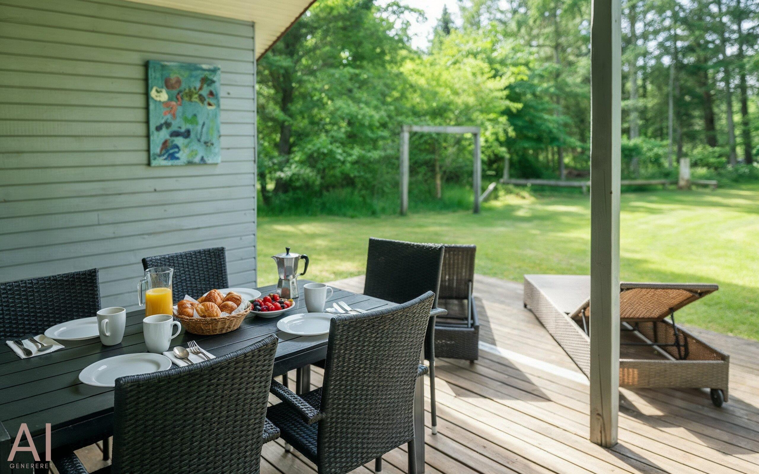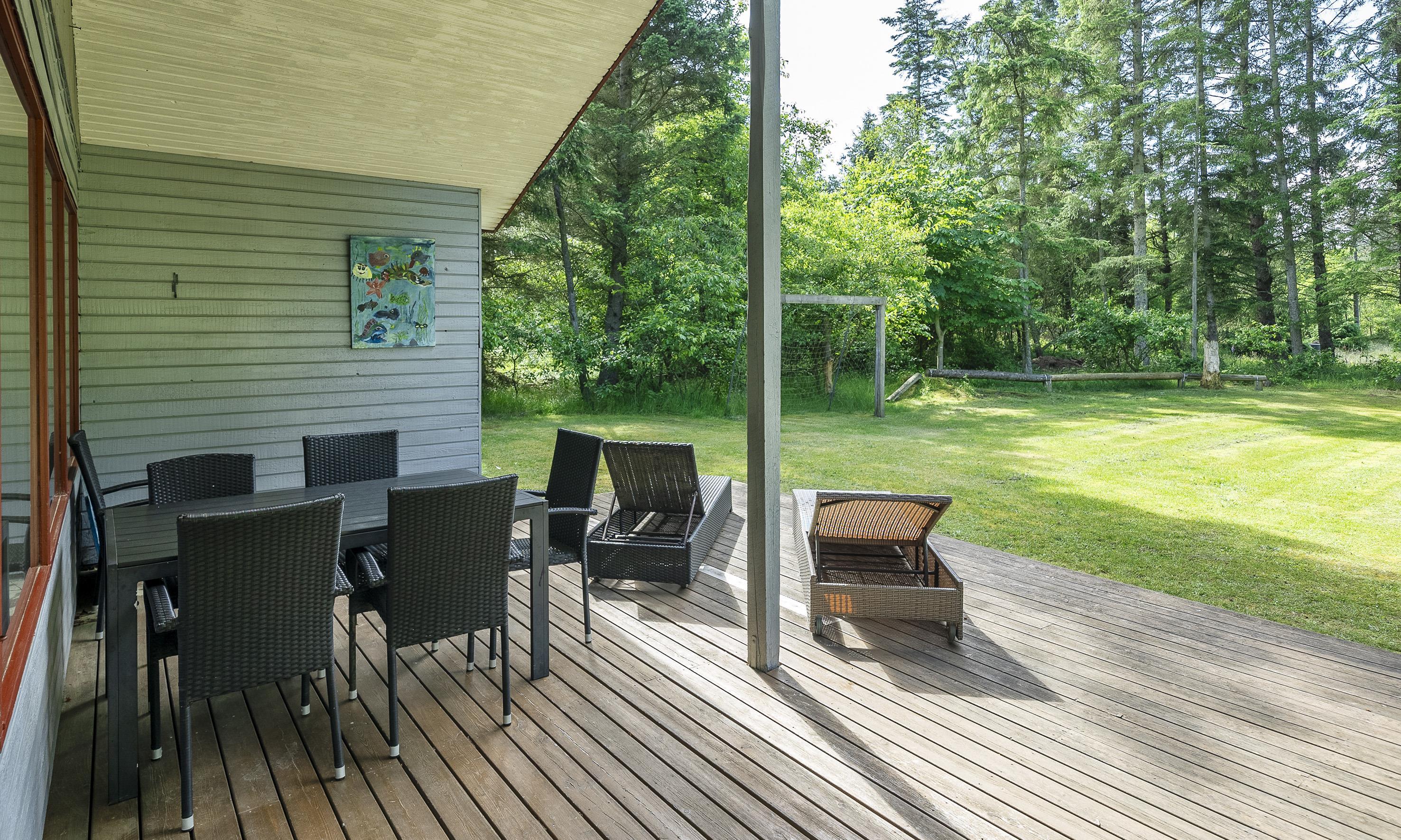 Vom Wohnzimmer aus haben Sie Zugang zu einer schönen überdachten Terrasse, auf der Sie unabhängig vom Wetter Ihren Morgenkaffee oder ein gutes Abendessen im Freien genießen können. Die Terrasse bietet mehrere gemütliche Ecken, in denen Sie entspannen und den Blick auf den großen, ungestörten Garten genießen können.