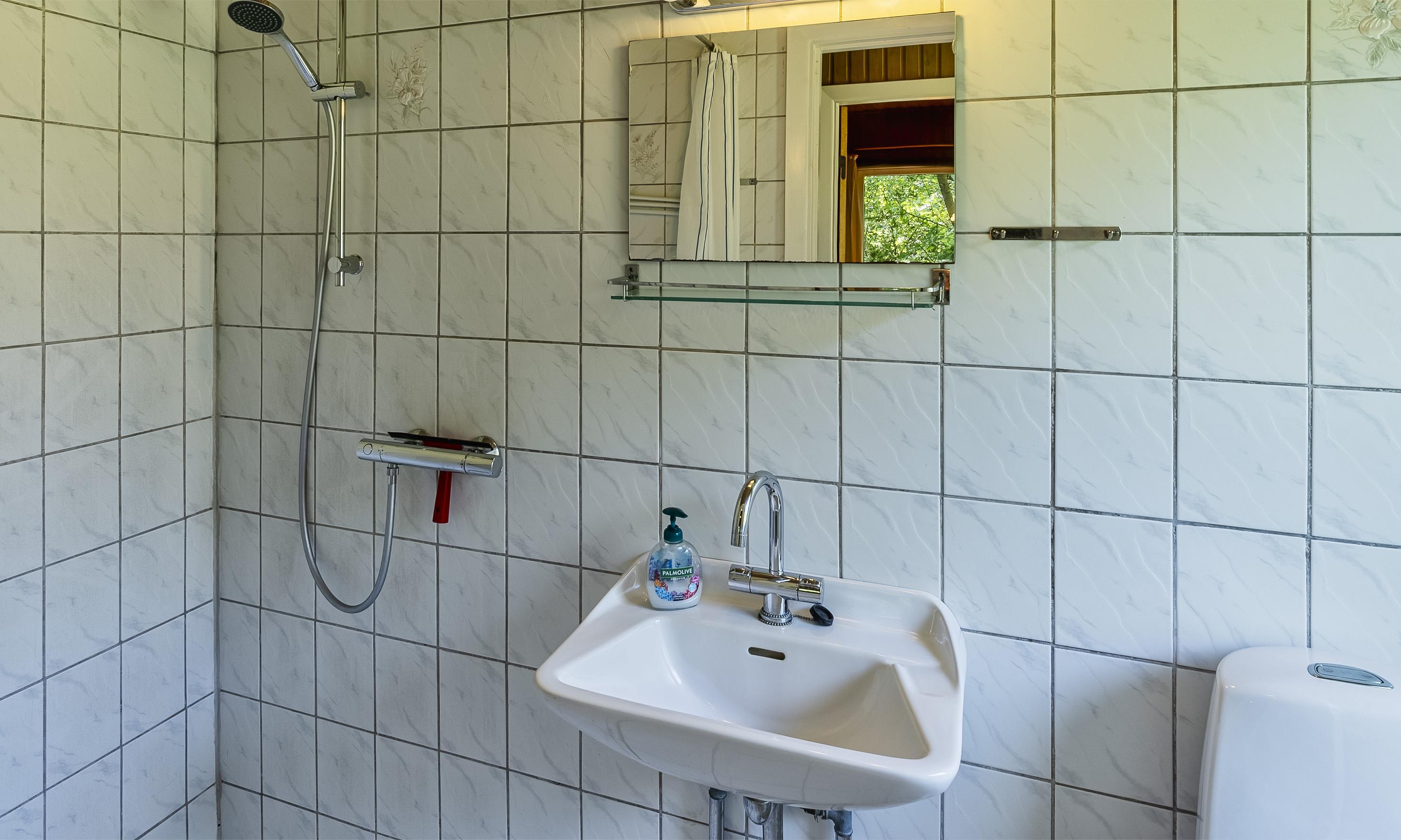 Badezimmer mit Toilette, Dusche und Waschbecken