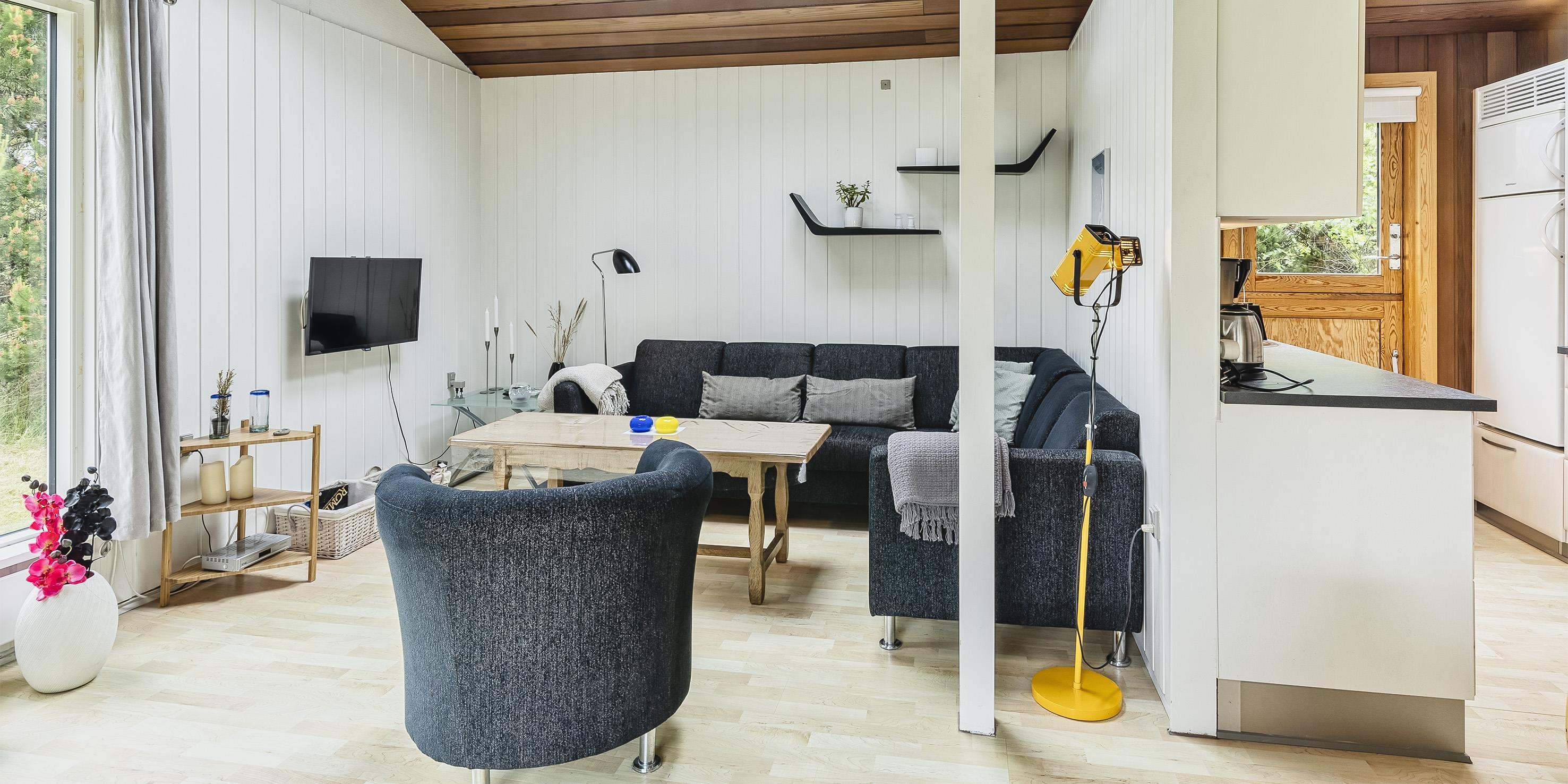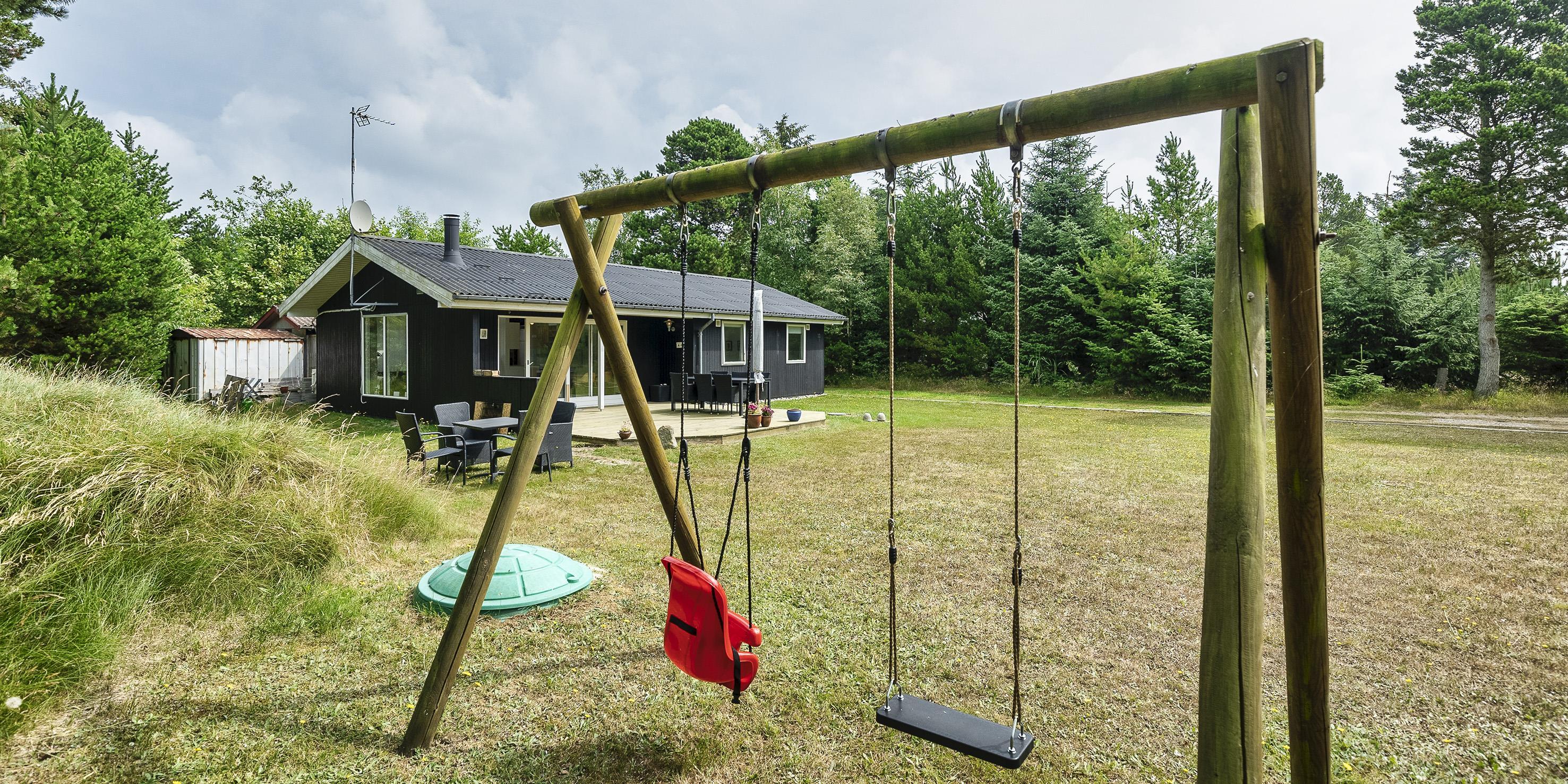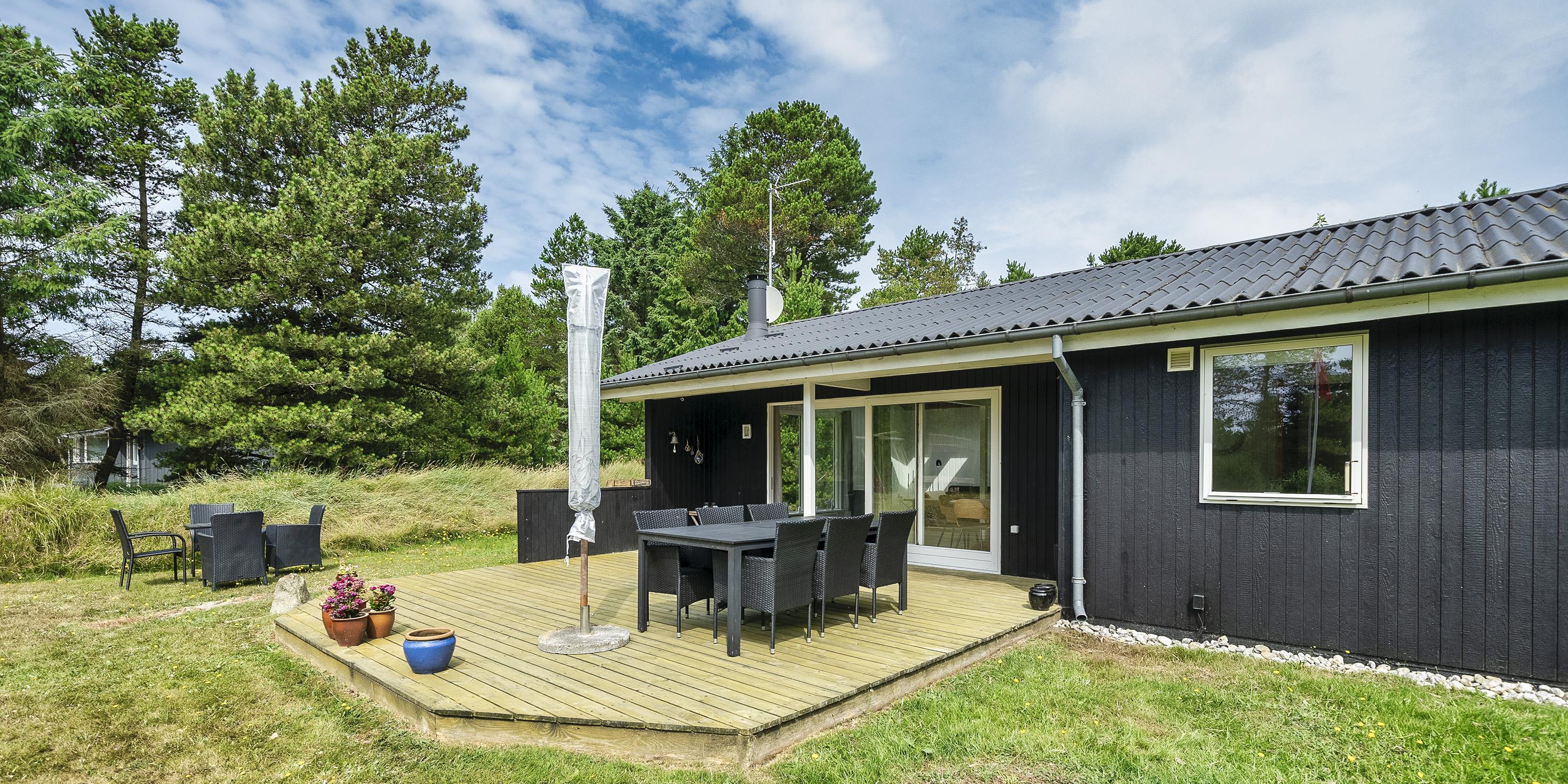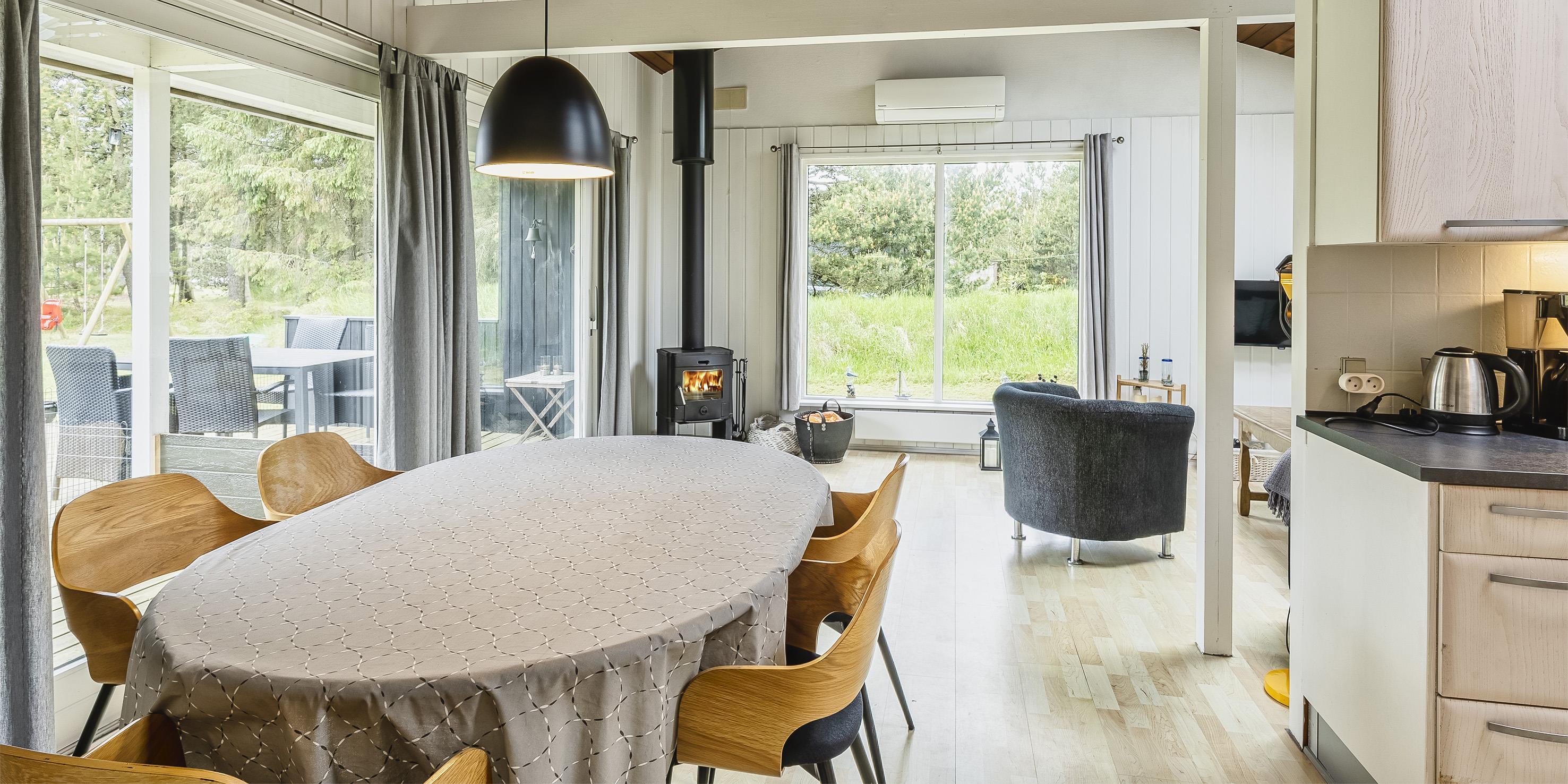 Nett eingerichtetes Ferienhaus auf einem großen grosszügigen Rasengrundstück gelegen. Das Ferienhaus ist für 6 Personen ausgestattet. Der Strand ist ca. 1,8 Km vom Ferienhaus entfernt. Der Wohn-, Ess- und Küchenbereich ist an den Wänden getäfelt und der Fußboden ist mit einem Laminat versehen. Auf der gemütlichen Rundsitzecke haben Sie einen direkten Blick auf den Kamin. Es befindet sich eine Warmepumpe im Ferienhaus. Mit dieser Warmepumpe haben sie die Möglichkeit die Stromkosten zu senken, denn die Warmepumpe ist energiesparend. Das deutsche Fernsehprogramm empfangen Sie über eine Parabolantenne. Im Wohnbereich ist auch ein offener Balken zu sehen. Desweiteren sind im Wohnbereich zwei Oberlichter und in der Küche ist ein Oberlicht im Dach eingebaut. Dadurch scheint viel Licht in diese Bereiche. Gegenüber dem Küchenbereich ist die Essgruppe platziert. In der Küche befindet sich ein Herd mit Cerankochfeld, ein Backofen, eine Geschirrspülmaschine, eine Mikrowelle und eine Kühl- und Gefrierkombination. Das neu renovierte Badezimmer ist mit einem WC, einem Handwaschbecken und einer Dusche ausgestattet. Die Waschmaschine ist hier im Badezimmer untergebracht. Insgesamt stehen den Bewohnern des Hauses drei Schlafzimmer zur Verfügung: DB + 2B + 2B. Alle Schlafzimmer sind mit je zwei Einzelbetten ausgestattet. Eine Terrasse am Ferienhaus gibt Ihnen die Möglichkeit Ihren Kaffee im Trockenen zu geniessen, da ein Teil der Terrasse überdacht ist. Das Ferienhaus verfügt über einen Internetanschluss (W-Lan). Auf dem Grundstück befindet sich ein Schaukelstativ und eine Sandkiste für die Kleinen Gäste sowie ein Schelter (Übernachtungshütte) für "hygge" oder Übernachtung. Es sind max. 1 Haustiere erlaubt. Rauchen ist nicht erlaubt. Das Ferienhaus ist in 1979 erbaut worden.