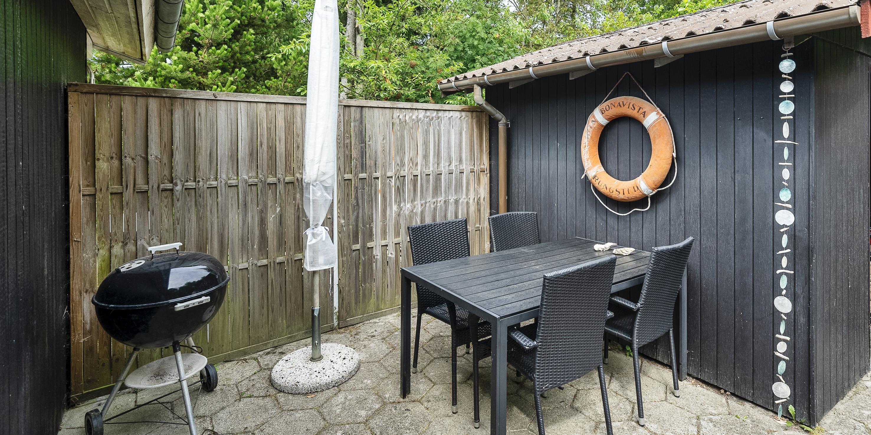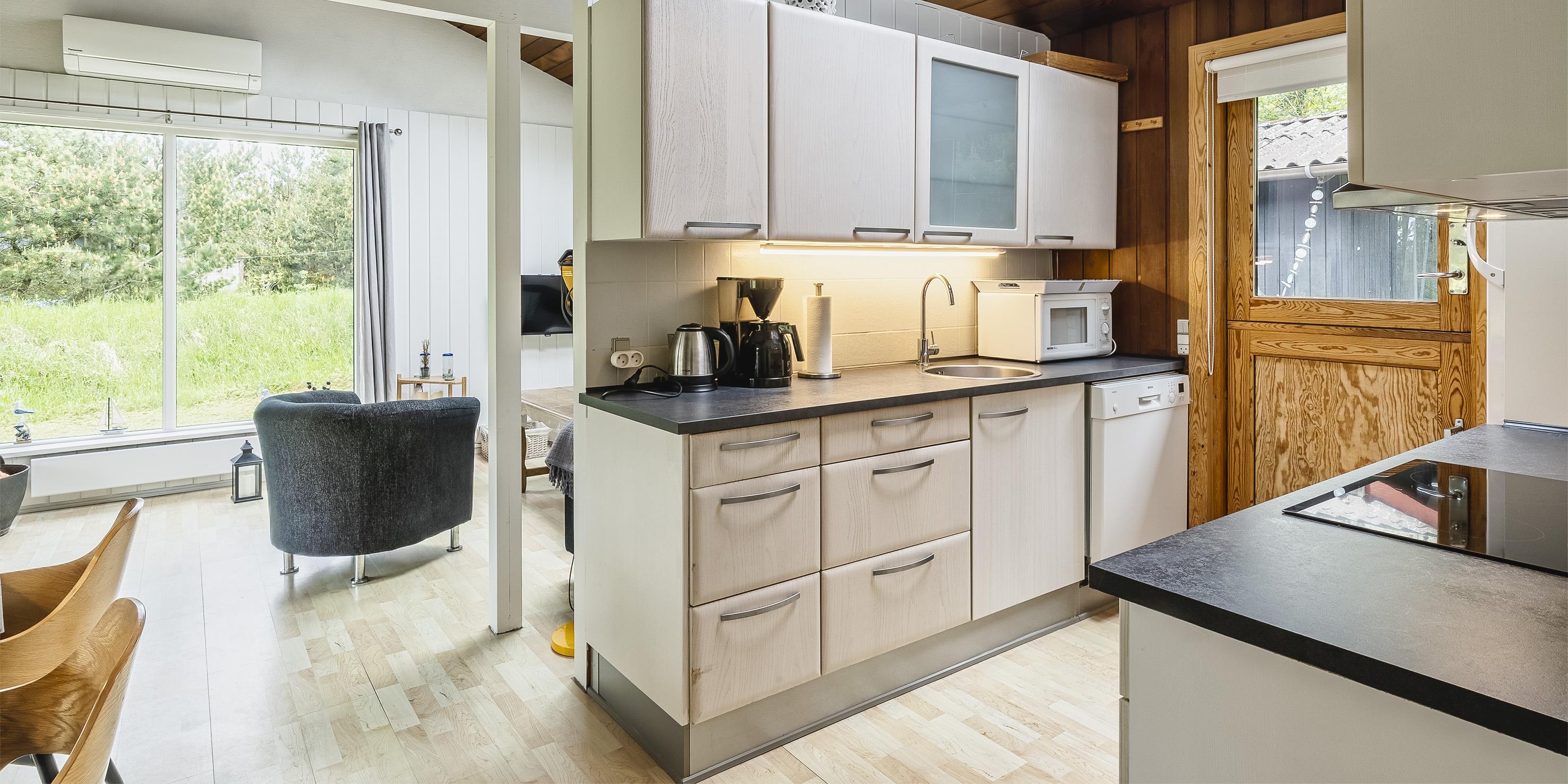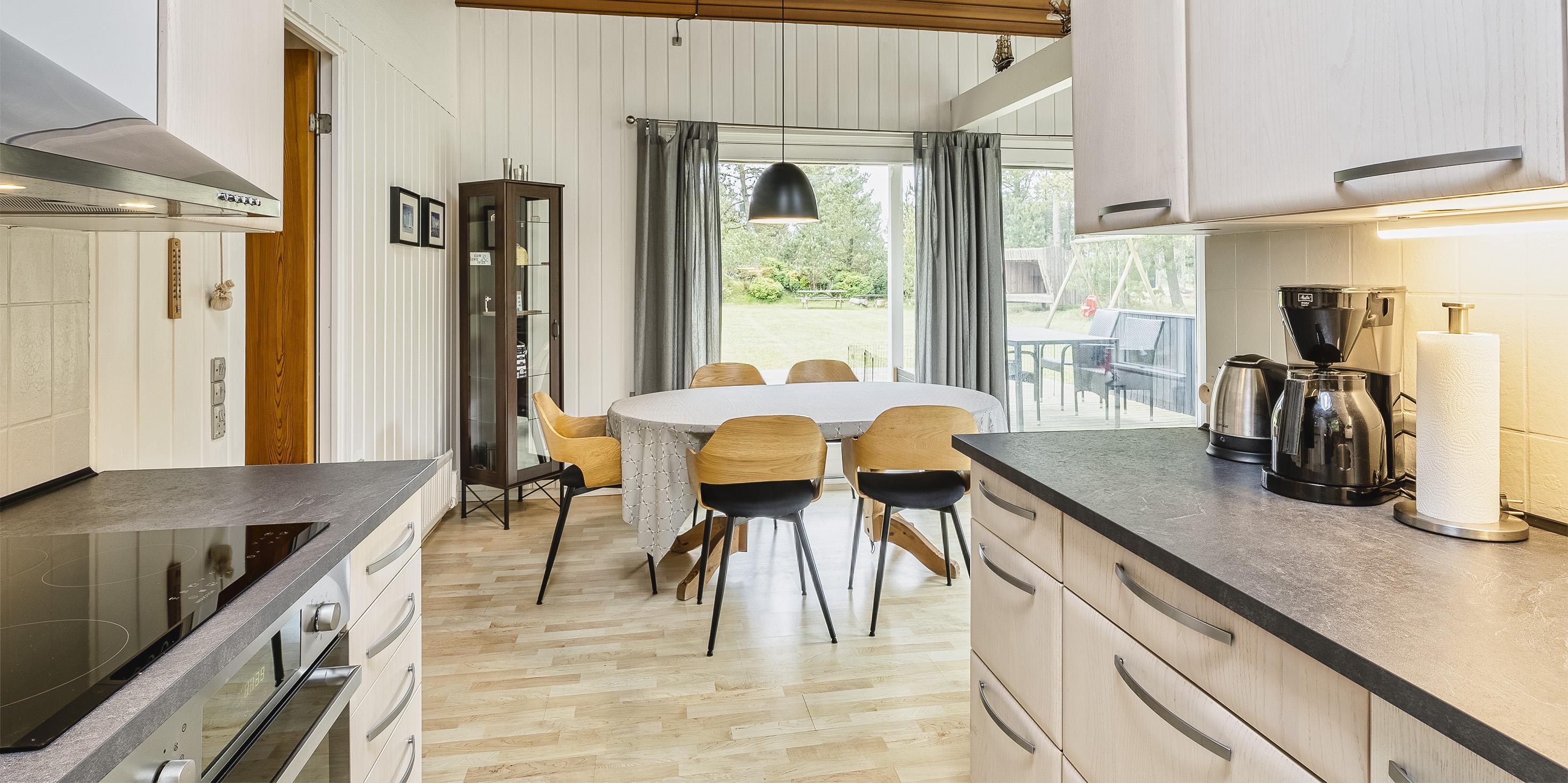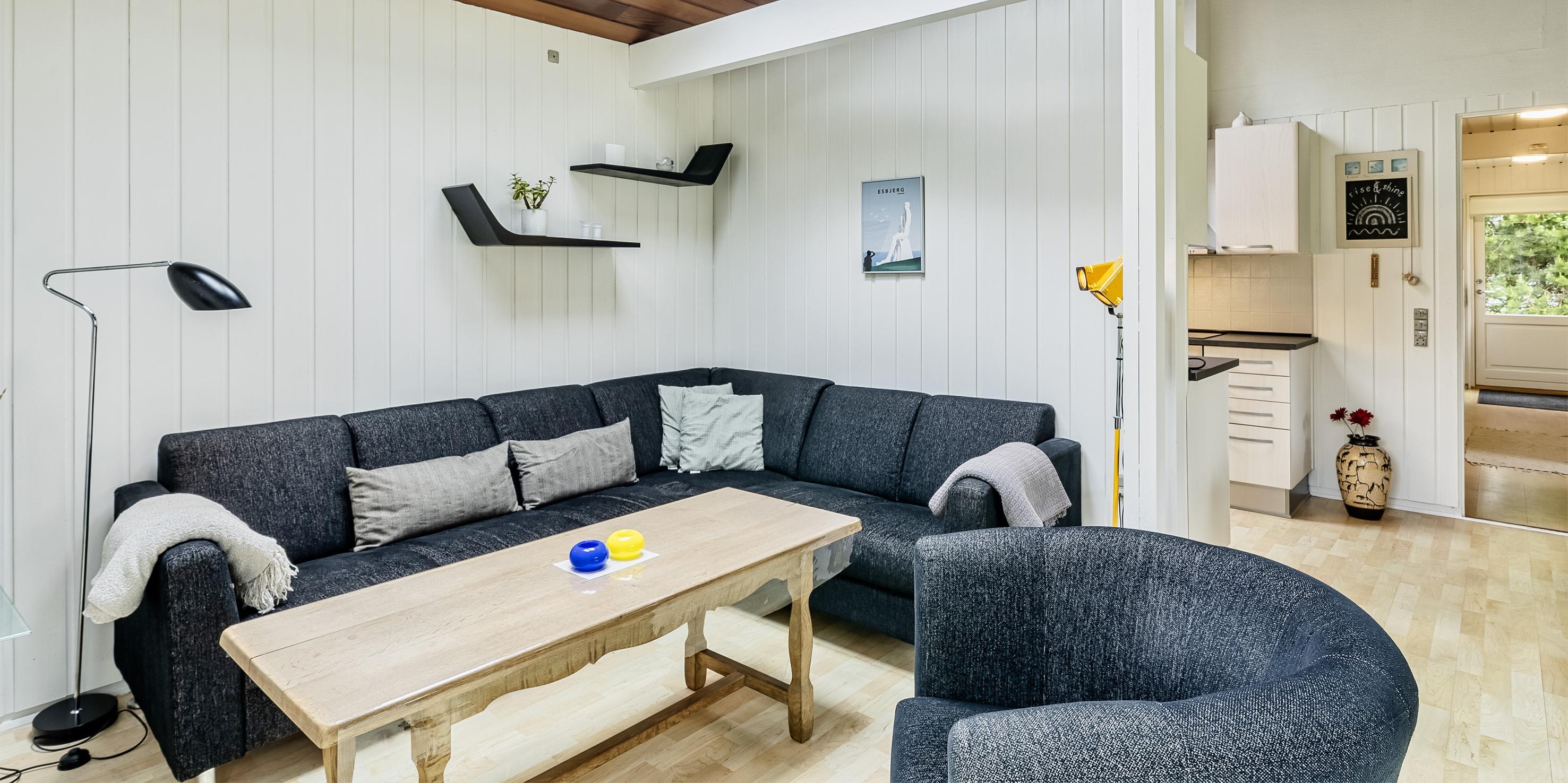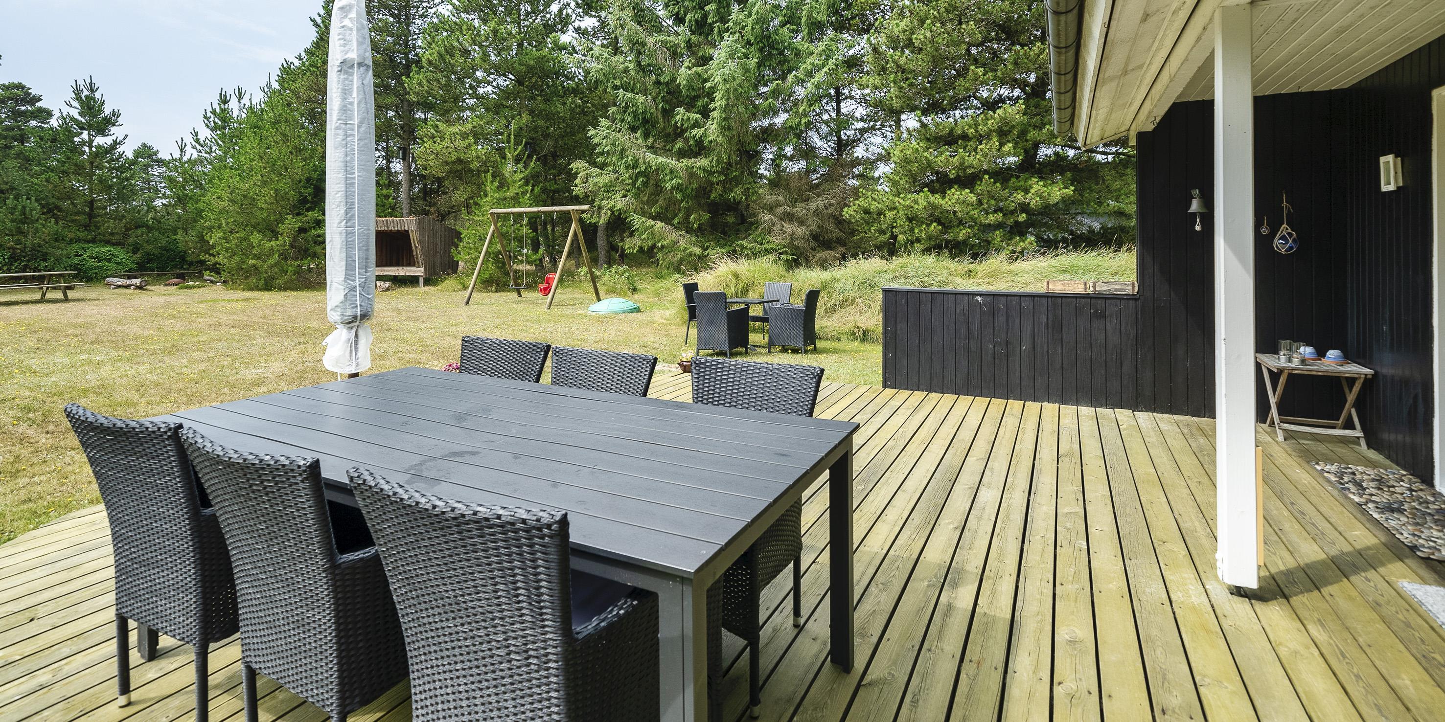 Nett eingerichtetes Ferienhaus auf einem großen grosszügigen Rasengrundstück gelegen. Das Ferienhaus ist für 6 Personen ausgestattet. Der Strand ist ca. 1,8 Km vom Ferienhaus entfernt. Der Wohn-, Ess- und Küchenbereich ist an den Wänden getäfelt und der Fußboden ist mit einem Laminat versehen. Auf der gemütlichen Rundsitzecke haben Sie einen direkten Blick auf den Kamin. Es befindet sich eine Warmepumpe im Ferienhaus. Mit dieser Warmepumpe haben sie die Möglichkeit die Stromkosten zu senken, denn die Warmepumpe ist energiesparend. Das deutsche Fernsehprogramm empfangen Sie über eine Parabolantenne. Im Wohnbereich ist auch ein offener Balken zu sehen. Desweiteren sind im Wohnbereich zwei Oberlichter und in der Küche ist ein Oberlicht im Dach eingebaut. Dadurch scheint viel Licht in diese Bereiche. Gegenüber dem Küchenbereich ist die Essgruppe platziert. In der Küche befindet sich ein Herd mit Cerankochfeld, ein Backofen, eine Geschirrspülmaschine, eine Mikrowelle und eine Kühl- und Gefrierkombination. Das neu renovierte Badezimmer ist mit einem WC, einem Handwaschbecken und einer Dusche ausgestattet. Die Waschmaschine ist hier im Badezimmer untergebracht. Insgesamt stehen den Bewohnern des Hauses drei Schlafzimmer zur Verfügung: DB + 2B + 2B. Alle Schlafzimmer sind mit je zwei Einzelbetten ausgestattet. Eine Terrasse am Ferienhaus gibt Ihnen die Möglichkeit Ihren Kaffee im Trockenen zu geniessen, da ein Teil der Terrasse überdacht ist. Das Ferienhaus verfügt über einen Internetanschluss (W-Lan). Auf dem Grundstück befindet sich ein Schaukelstativ und eine Sandkiste für die Kleinen Gäste sowie ein Schelter (Übernachtungshütte) für "hygge" oder Übernachtung. Es sind max. 1 Haustiere erlaubt. Rauchen ist nicht erlaubt. Das Ferienhaus ist in 1979 erbaut worden.