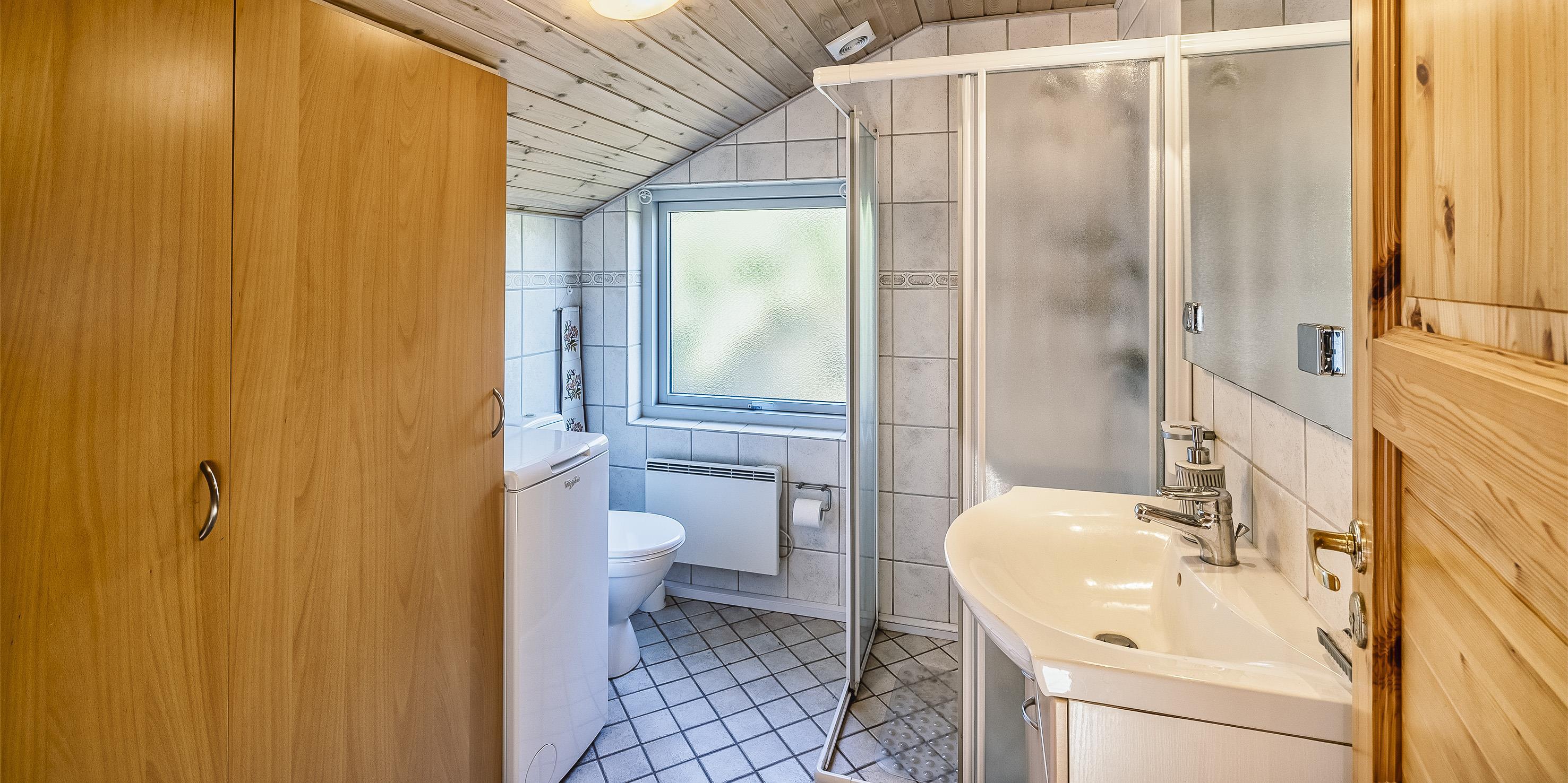 Badezimmer mit Toilette, Dusche und Waschbecken