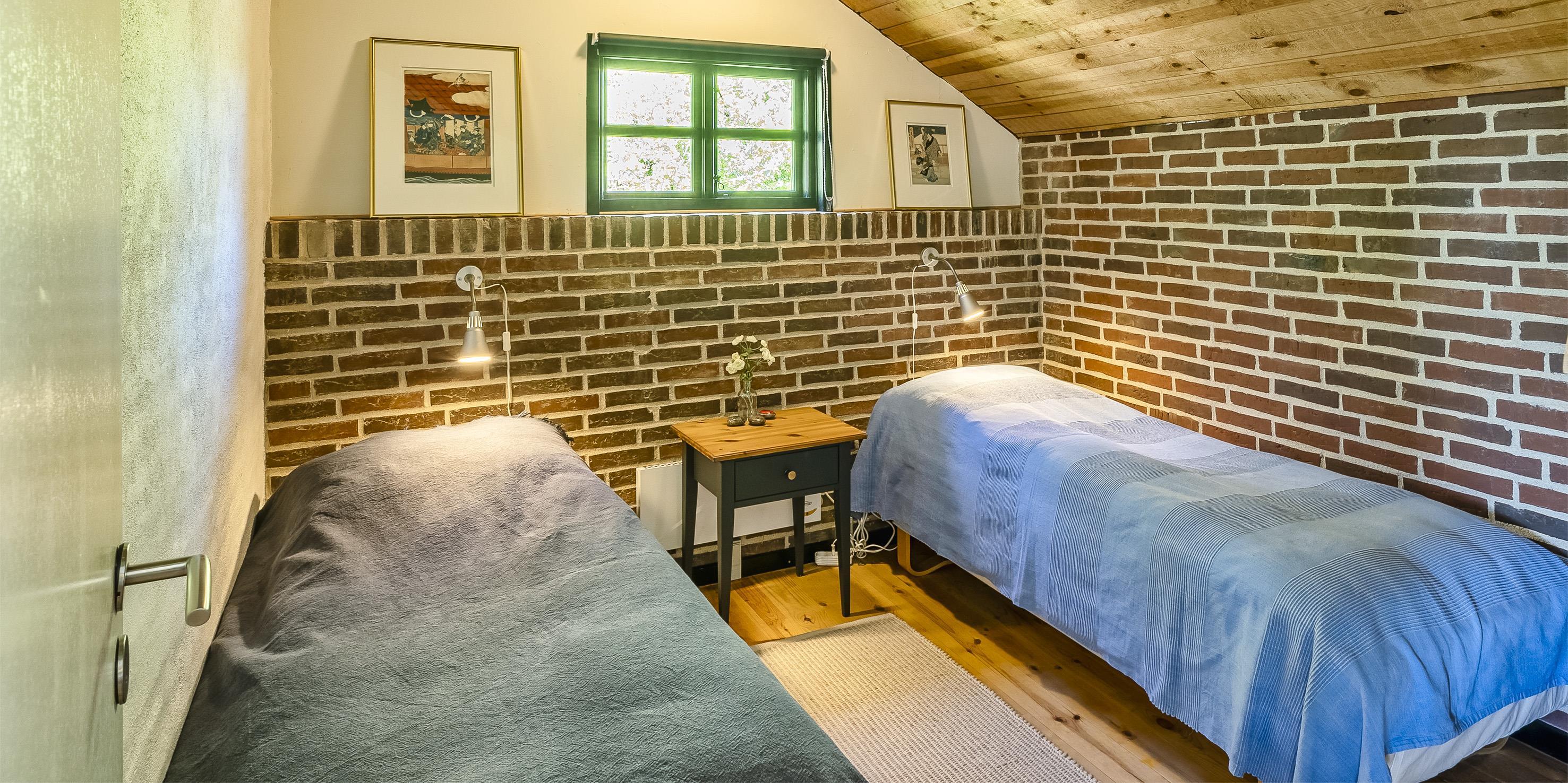 Das Haus bietet insgesamt 3 Schlafzimmer: 1 Doppelbett (DB), 2 Einzelbetten (EB) und ein kleines Doppelbett (EB, 120 cm breit).