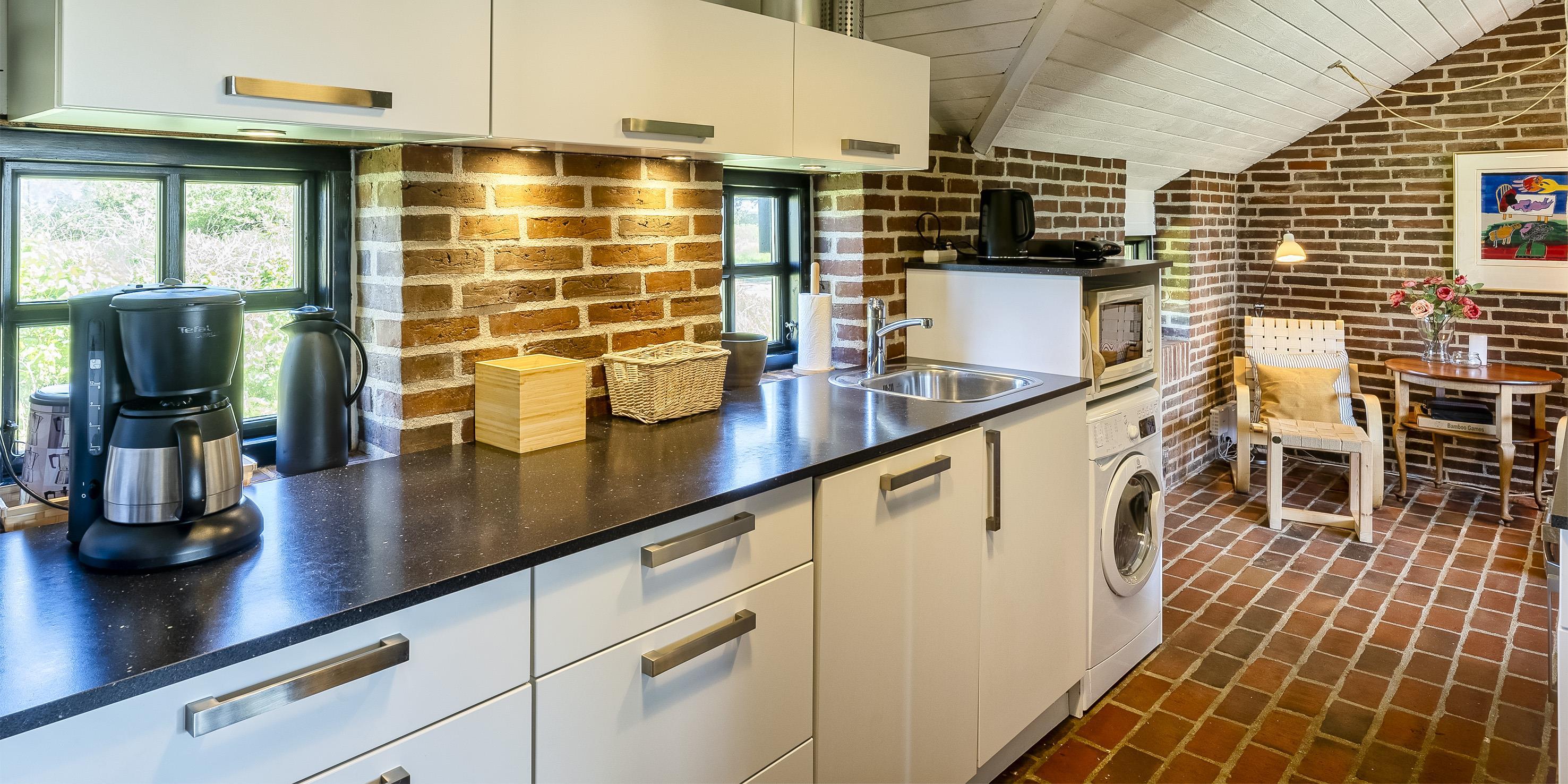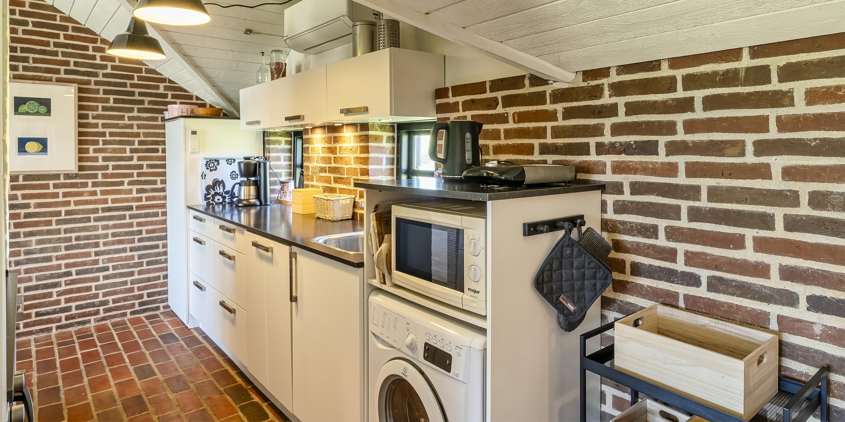 Die Küche ist funktional und gut ausgestattet – u.a. mit Geschirrspüler, Mikrowelle, Umluftofen, Dunstabzugshaube sowie einem großen Kühl-/Gefrierschrank. Eine Kombination aus Waschmaschine und Trockner ist ebenfalls vorhanden.