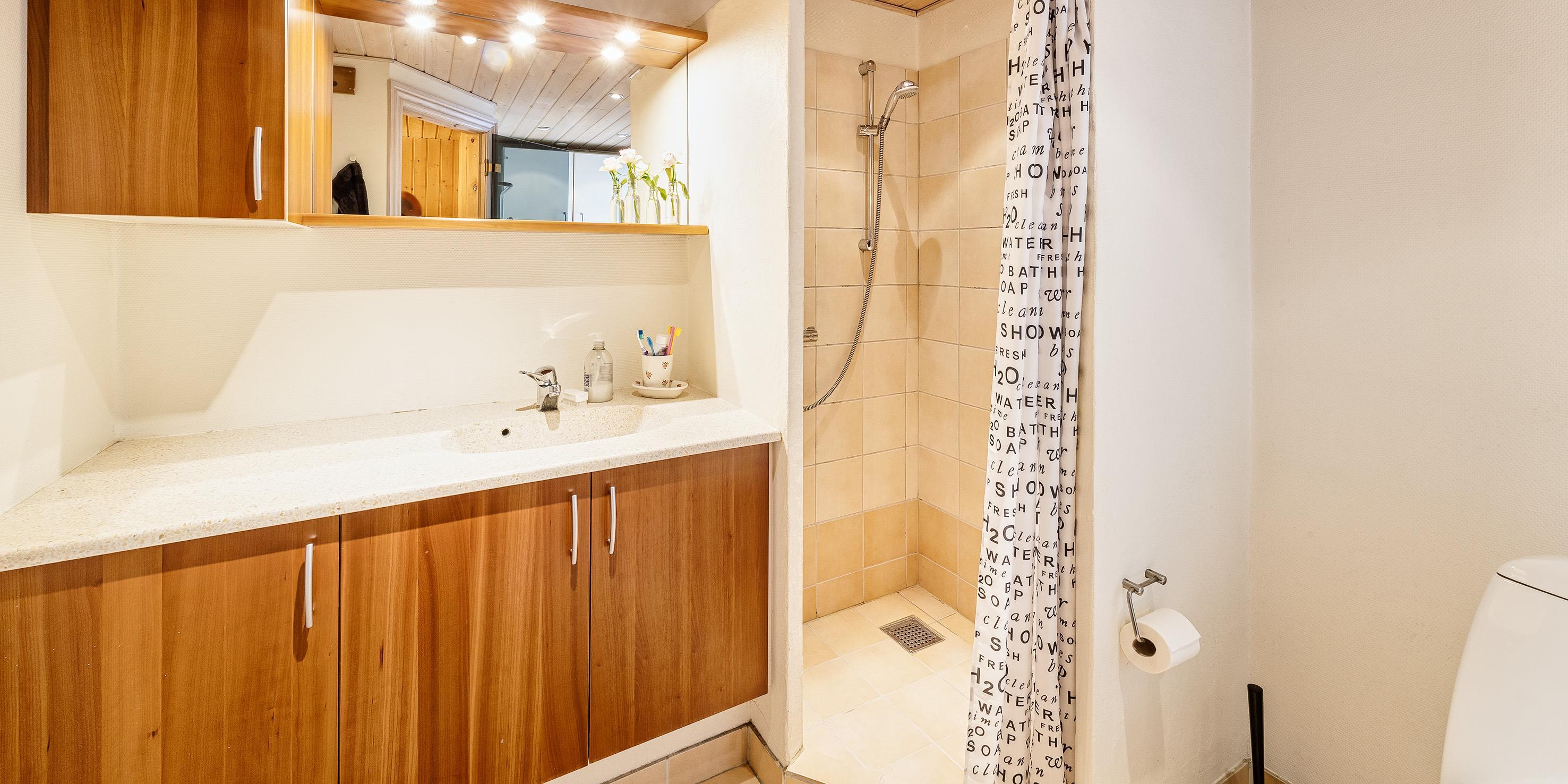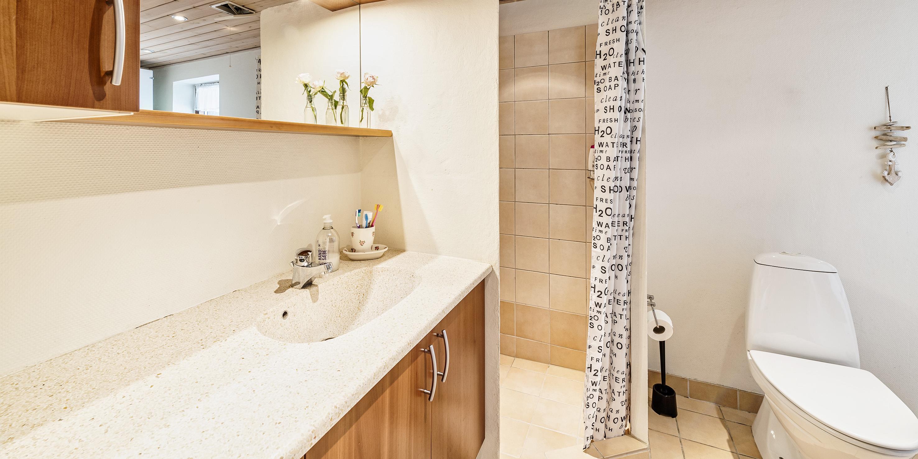 Badezimmer mit Toilette, Dusche und Waschbecken