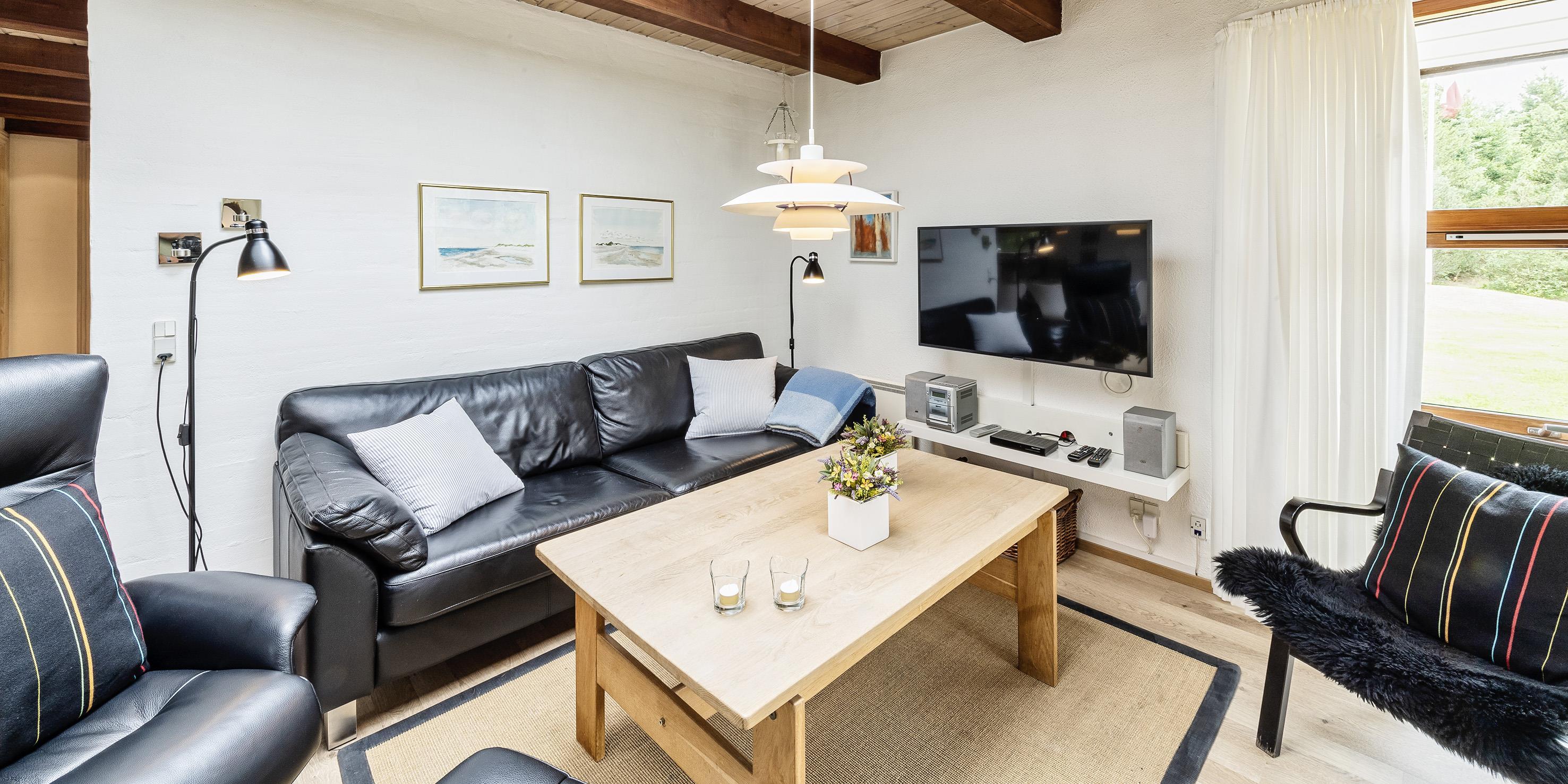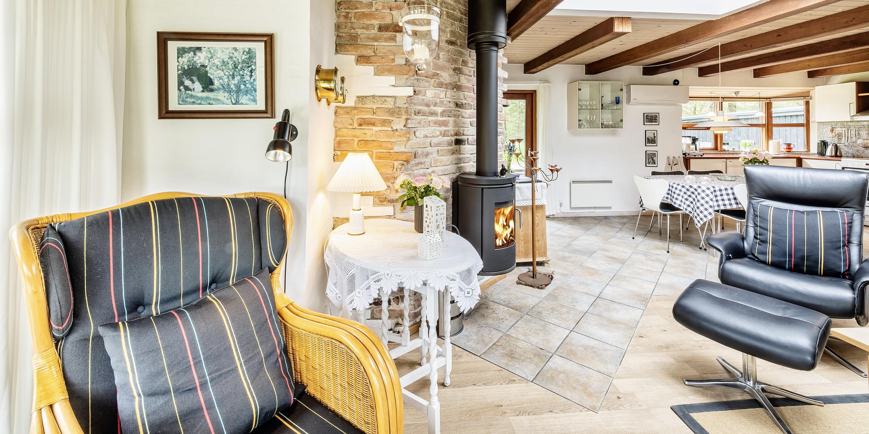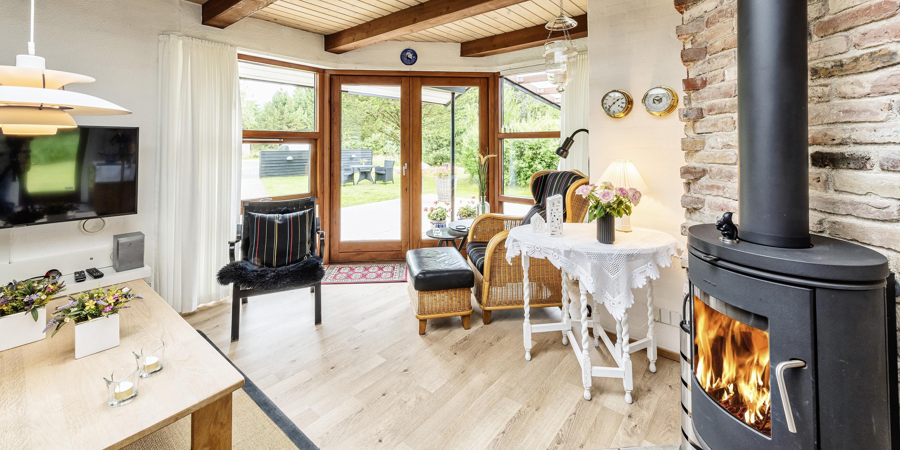 Das Ferienhaus kann über einen Kaminofen, einer Wärmepumpe oder elektrische Heizkörper beheizt werden. Es gibt eine offene Wohnküche in Verbindung mit dem Wohnzimmer, durch Oberlichter im Dach strahlt viel Licht in diesem Bereich. Vom Wohnzimmer gibt es einen direkten Zugang zu einer überdachten Terrasse und zusätzlich einen Ausgang zur Terrasse auf der Nordseite des Hauses. Im Wohnzimmer gibt es einen Kaminofen, Smart-TV mit Google Chrome Cast und einer Satellitenschüssel. Die Wohnküche enthält ein Induktionskochfeld, einen Backofen, einer Kühl-/Gefrierkombination, einen Geschirrspüler und eine Mikrowelle. Es stehen insgesamt drei Schlafzimmer zur Verfügung: DB + DB + 2B. Davon zwei mit je einem Doppelbett und eines mit zwei Einzelbetten. Alle Schlafzimmer haben Kleiderschränke und Verdunklungsvorhänge.Schönes großes Badezimmer mit Dusche, Handwaschbeken und WC und direktem Zugang zur Sauna. Das Badezimmer verfügt über eine Fußbodenheizung und einer Handtuchhalterheizung. Die Waschmaschine und der Trockner sind ebenfalls hier untergebracht.
