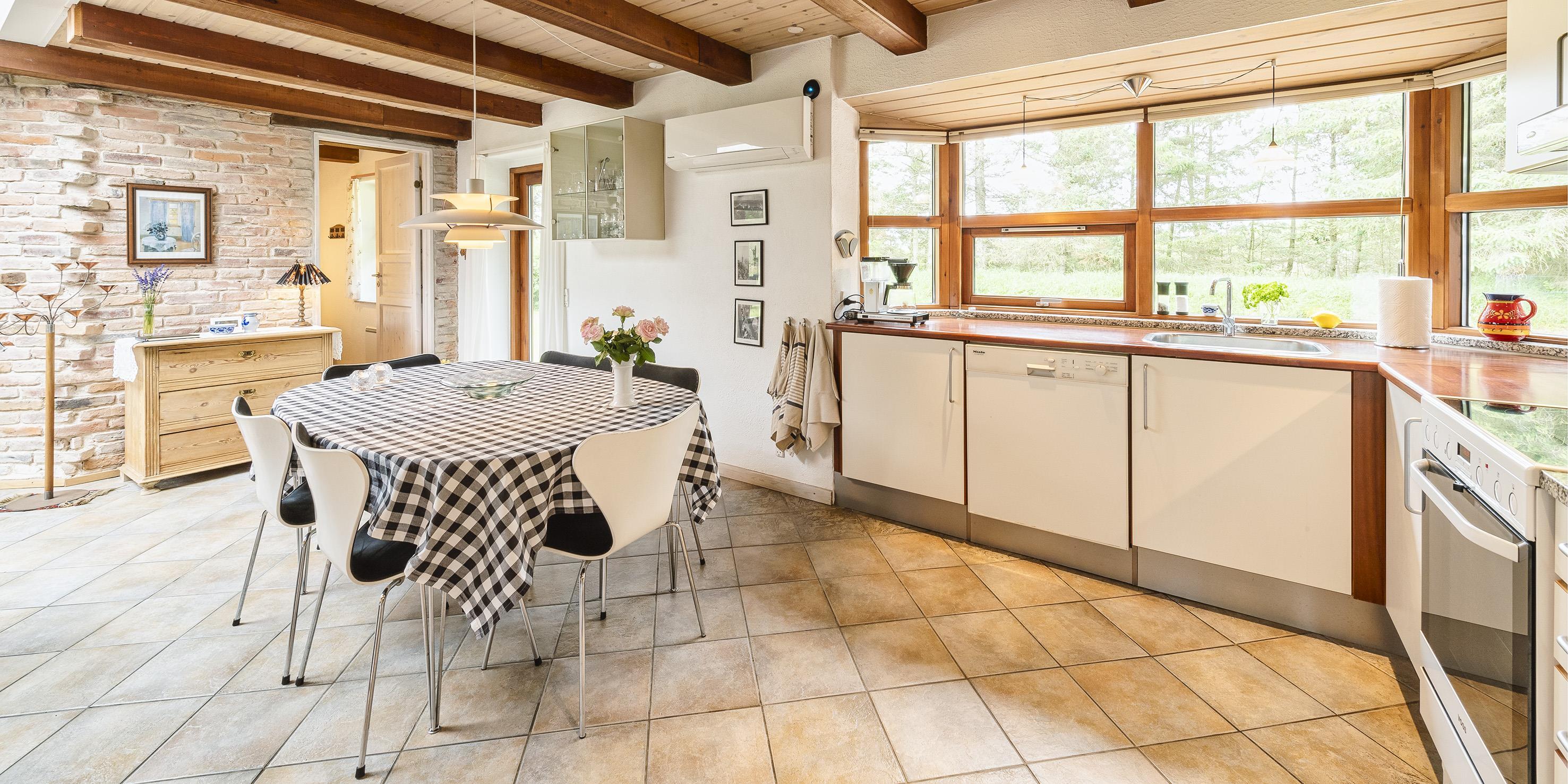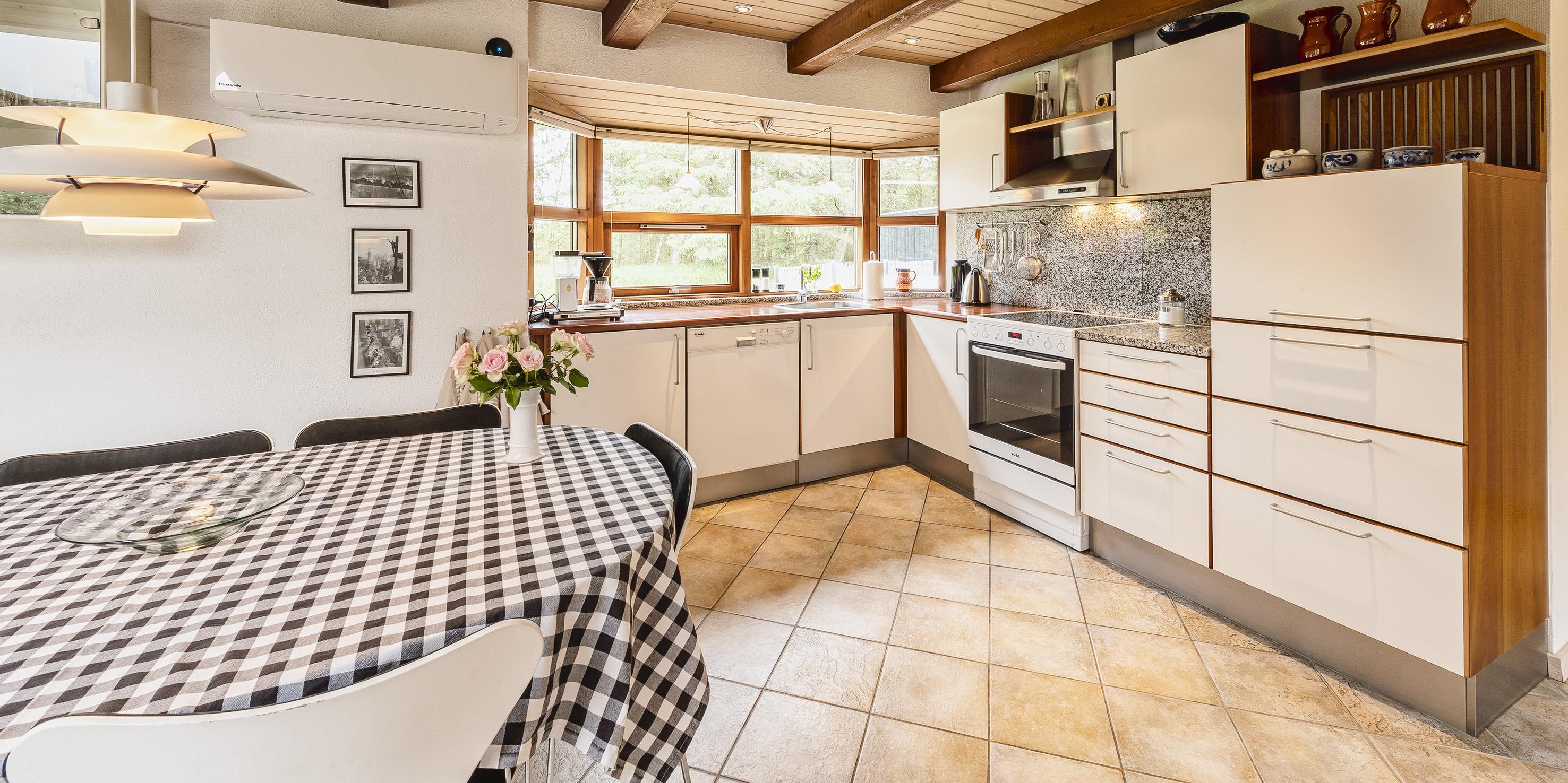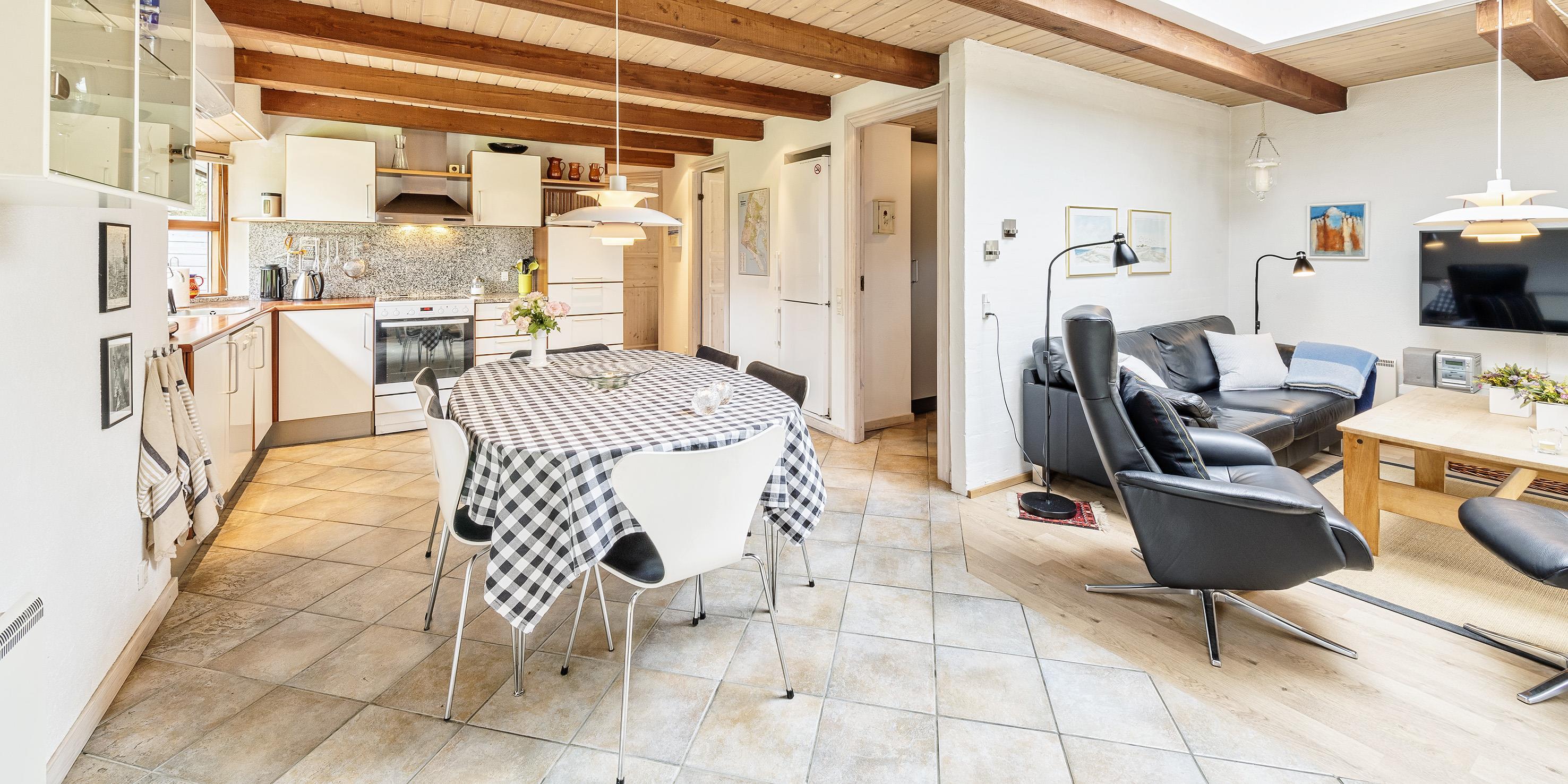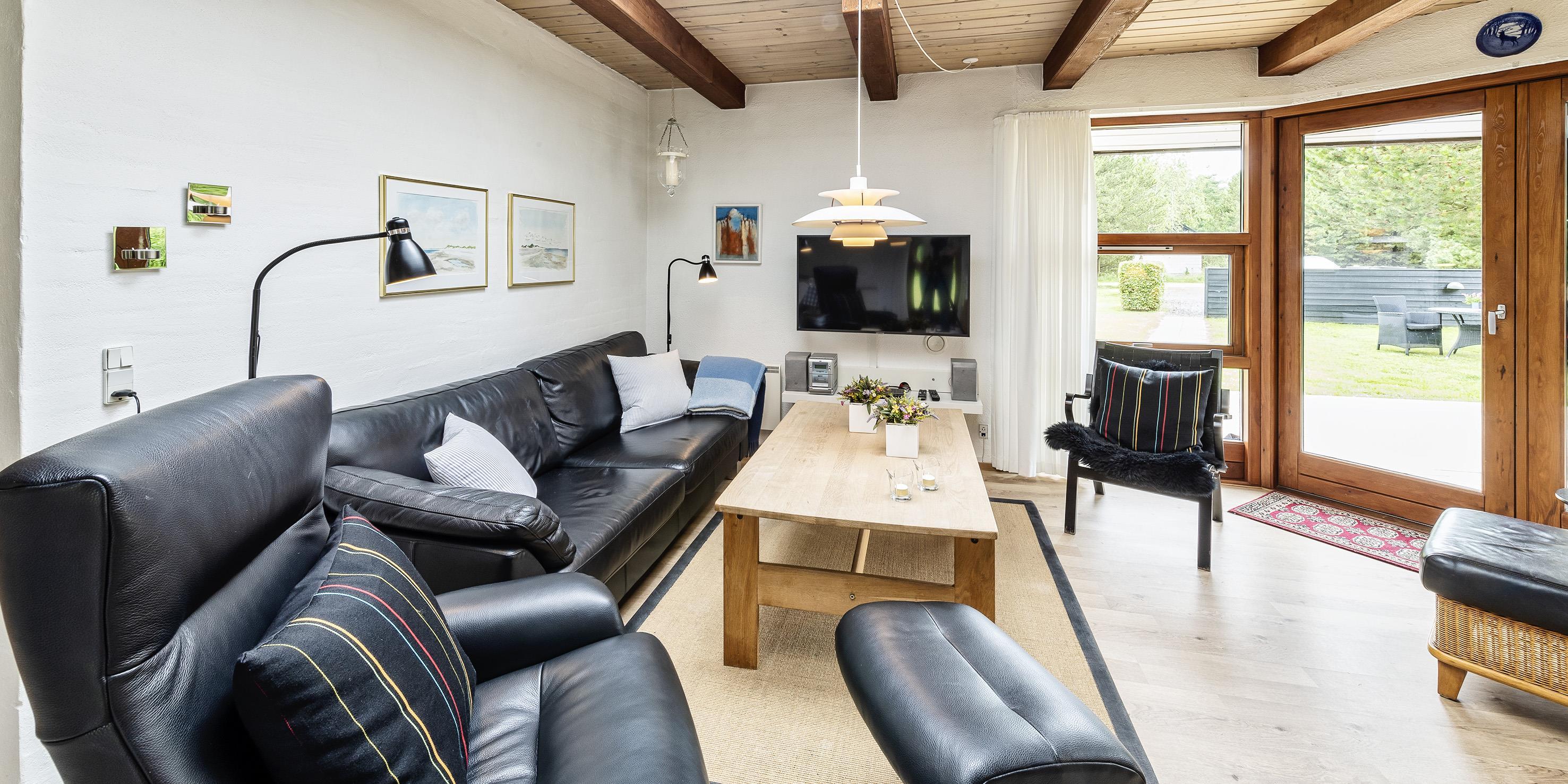 Das Ferienhaus kann über einen Kaminofen, einer Wärmepumpe oder elektrische Heizkörper beheizt werden. Es gibt eine offene Wohnküche in Verbindung mit dem Wohnzimmer, durch Oberlichter im Dach strahlt viel Licht in diesem Bereich. Vom Wohnzimmer gibt es einen direkten Zugang zu einer überdachten Terrasse und zusätzlich einen Ausgang zur Terrasse auf der Nordseite des Hauses. Im Wohnzimmer gibt es einen Kaminofen, Smart-TV mit Google Chrome Cast und einer Satellitenschüssel. Die Wohnküche enthält ein Induktionskochfeld, einen Backofen, einer Kühl-/Gefrierkombination, einen Geschirrspüler und eine Mikrowelle. Es stehen insgesamt drei Schlafzimmer zur Verfügung: DB + DB + 2B. Davon zwei mit je einem Doppelbett und eines mit zwei Einzelbetten. Alle Schlafzimmer haben Kleiderschränke und Verdunklungsvorhänge.Schönes großes Badezimmer mit Dusche, Handwaschbeken und WC und direktem Zugang zur Sauna. Das Badezimmer verfügt über eine Fußbodenheizung und einer Handtuchhalterheizung. Die Waschmaschine und der Trockner sind ebenfalls hier untergebracht.