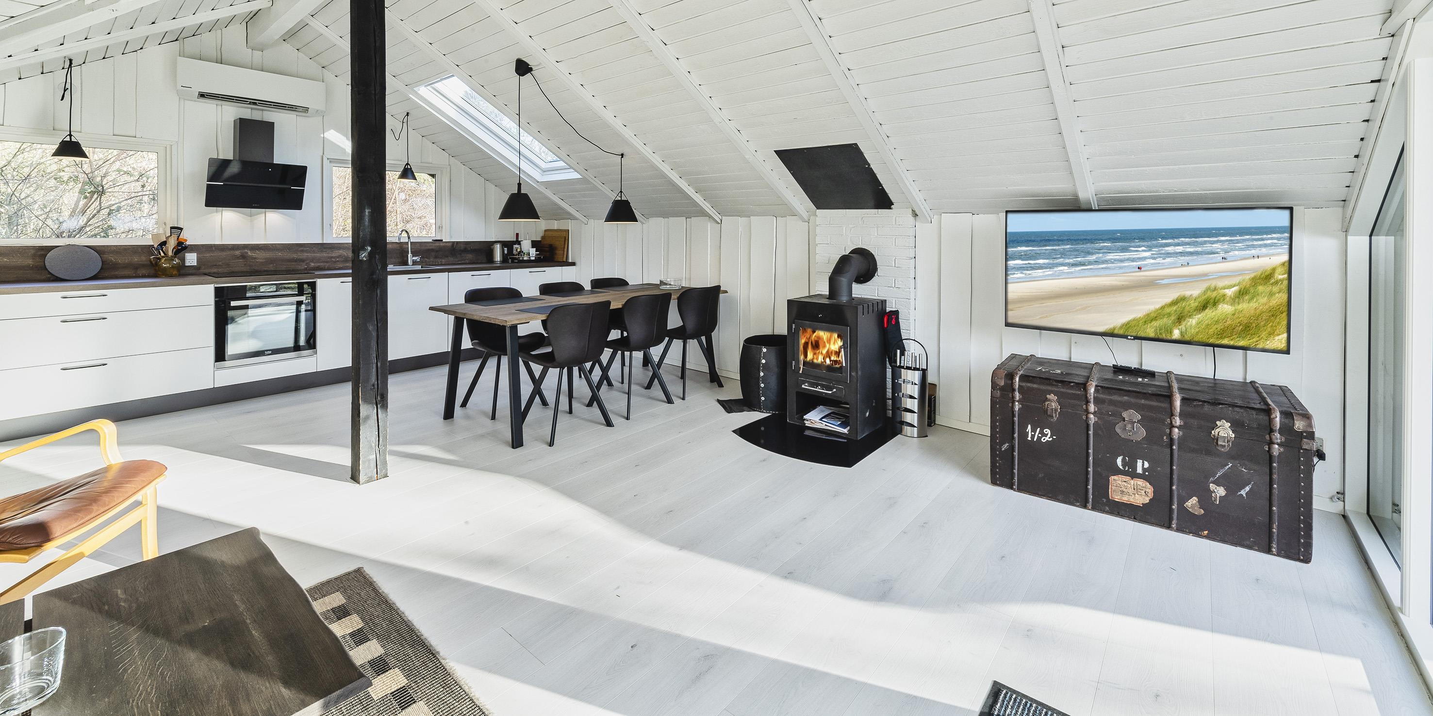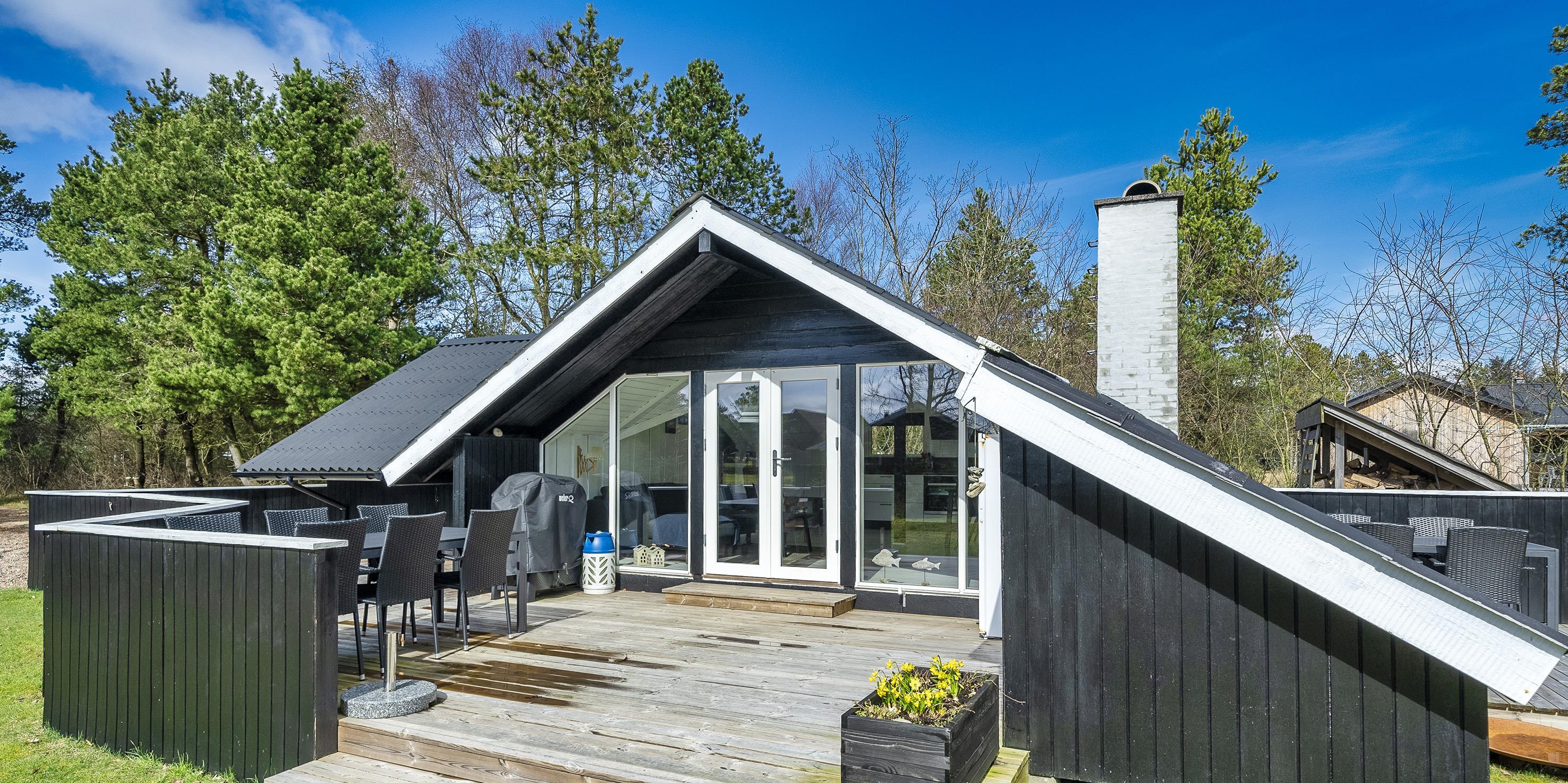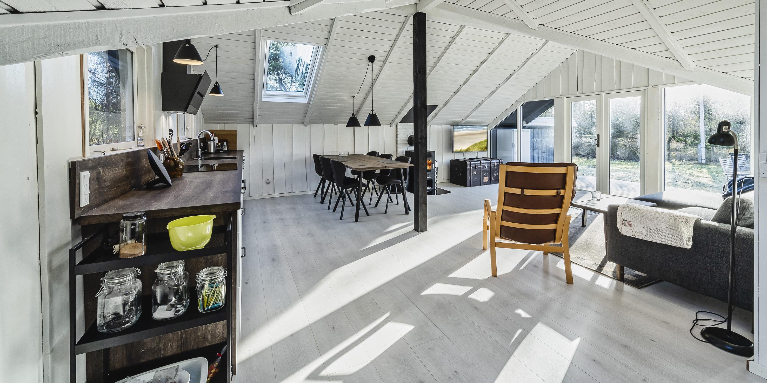 Schönes neu renoviertes Ferienhaus, das für vier Personen ausgestattet ist. Das Grundstück ist von Bäumen und Büschen umgeben und daher ist es fast nicht einsehbar. In der Nähe befindet sich ein Waldgebiet, wo man schöne und lange Spaziergänge machen kann. Der Strand ist ca 1,5 Km entfernt. Der Wohnbereich ist mit dem Küchenbereich offengehalten. Ein schöner und heller Essbereich mit Oberlichtern und einer gemütlichen Sofaecke in der Wohnecke befindet sich am Ende des Einganges. Ein TV-Gerät wo Sie mit Yousee-Streaming-TV-Kanälen die Fernsehprogramme (ca. 5 – 8 deutsche Kanäle) empfangen können. Ein im Wohn- und Essbereich aufgestellter Kamin bietet Ihnen eine angenehme Wärme und Gemütlichkeit. Er strahlt die Wärme in den Wohn- und Essbereich. Das gesamte Ferienhaus ist im Bodenbereich mit einem neuen Parkettboden ausgestattet, außer im Badezimmer befinden sich Bodenfliesen. Helle Decken und Wände geben dem kleinen und gemütlichen Ferienhaus eine besondere Atmosphäre. Eine zusätzliche Wärmepumpe sorgt für ein schnelles Aufheizen des Hauses. Mit dieser Wärmepumpe haben Sie die Möglichkeit die Stromkosten zu senken, da sie energiesparend ist. Der offene Küchenbereich ist mit einer neuen Einbauküche ausgestattet. Die Einbauküche verfügt über einen Herd mit Induktionskochfeld, einen Backofen, eine Dunstabzugshaube (mit Aktivkohlefilter), einer Mikrowelle, einer Geschirrspülmaschine und einem Kühlschrank mit einem kleinen Gefrierfach. Das kleine Badezimmer verfügt über ein WC, ein Handwaschbecken und einer Dusche. Des Weiteren befindet sich hier im Badezimmer eine Waschmaschine (Toplader). Es stehen den Gästen zwei Schlafzimmer zur Verfügung: DB + 2B. Allerdings befinden sich in den Schlafzimmern keine Kleiderschränke. Das Ferienhaus verfügt über einen Internetschluss (W-Lan 200/200). Am Ende des Wohn- und Essbereiches befindet sich eine große Fensterfront mit einer Terrassentür. Von hier gelangen Sie dann auf die teilweise geschlossene Holzterrasse, wobei ein kleiner Teil dieser Terrasse direkt am Haus überdacht ist. Das Rauchen im Ferienhaus ist nicht gestattet. Es sind max. zwei Haustiere erlaubt. Das Ferienhaus wurde in 1972 erbaut. In 2020 wurde es renoviert. Es gibt einen Anschluss für El-Fahrzeuge am Ferienhaus.