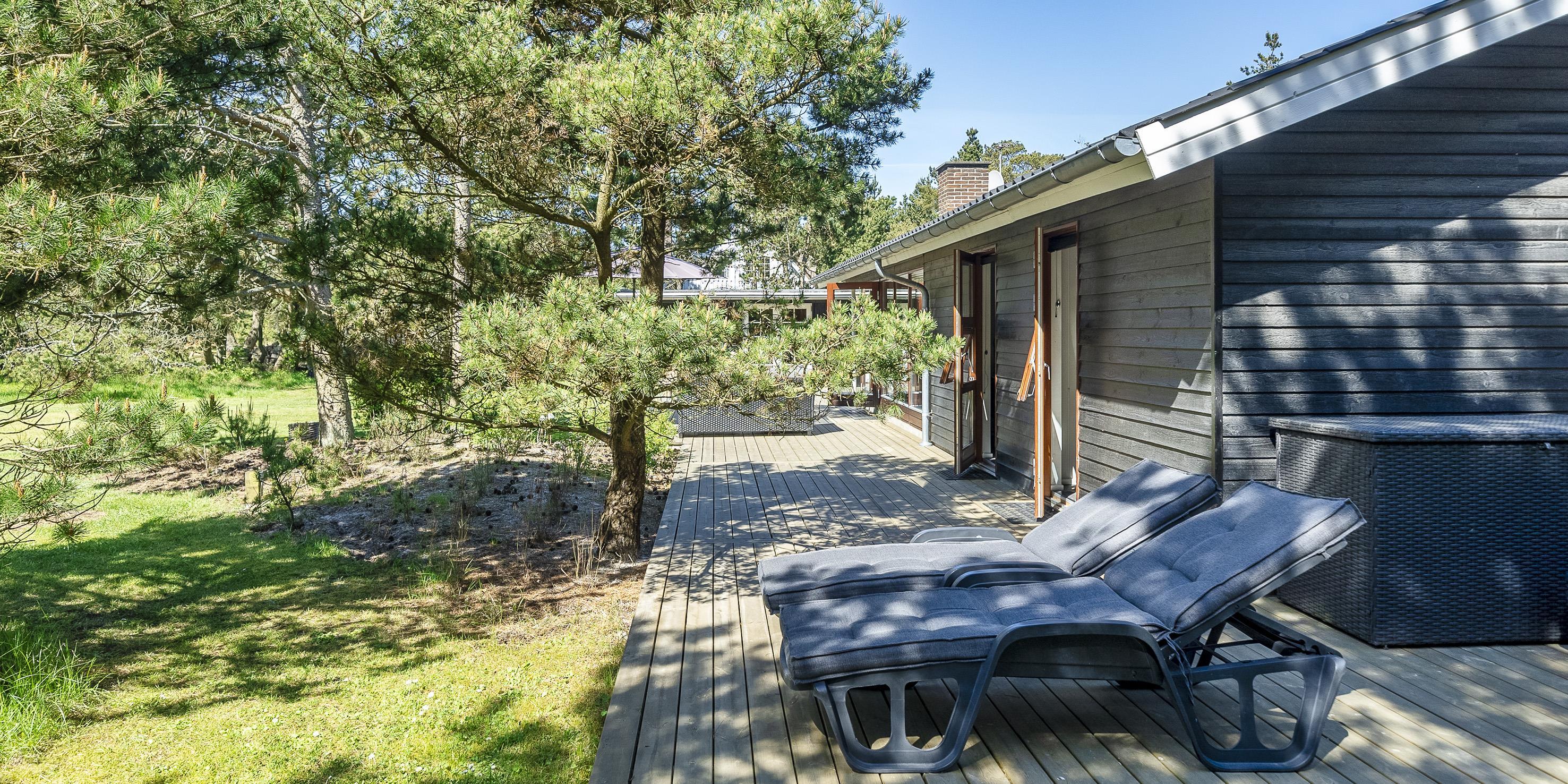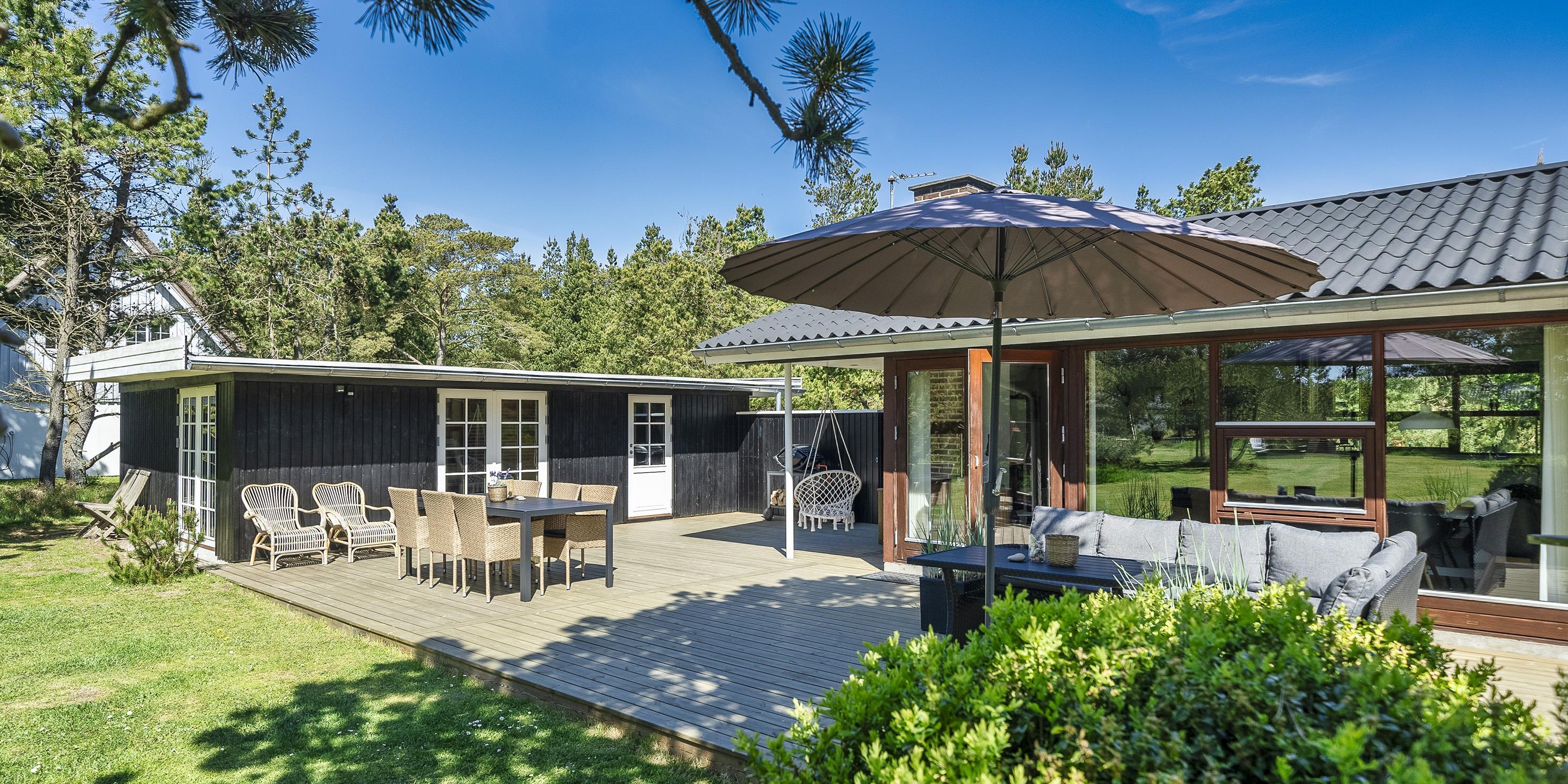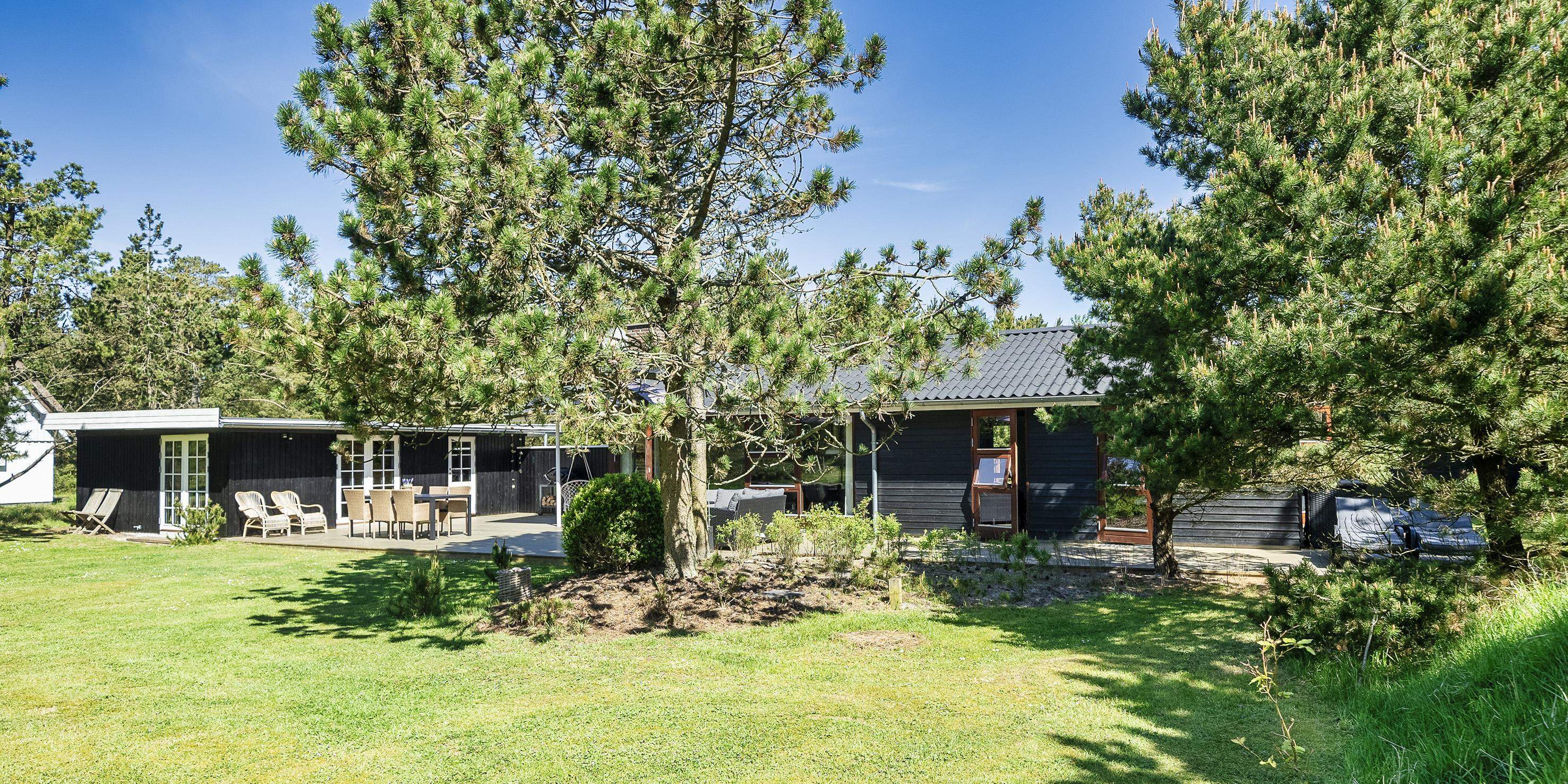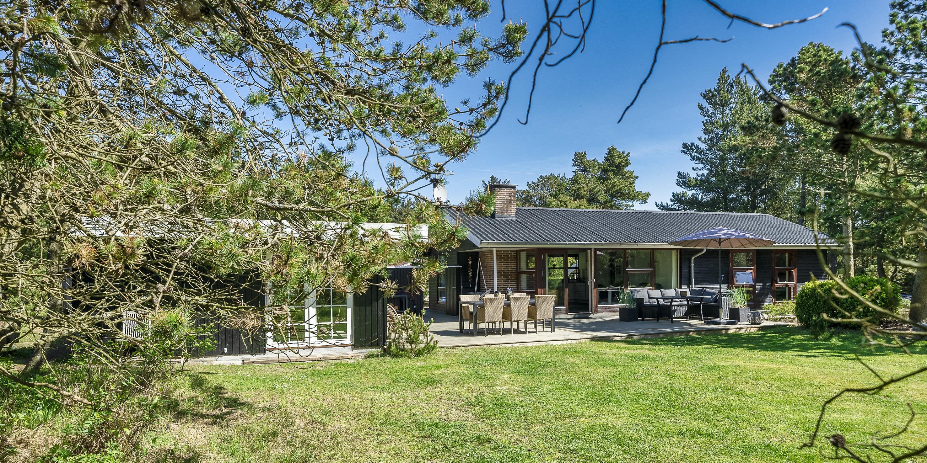 Geschmackvoll eingerichtetes Ferienhaus auf einem großen uneinsehbaren Rasengrundstück gelegen, umgeben von Bäumen und Büschen. Das Ferienhaus ist ausgestattet für 6 Personen. Der Strand ist ca. 1,5 Km vom Ferienhaus entfernt. Der Wohn- und Küchenbereich ist offen gehalten. Dieser gesamte Bereich ist mit einer hübschen Bodenfliese ausgelegt. Im Wohnbereich befindet sich ein eingemauerter Kamin. Es befindet sich eine Warmepumpe im Ferienhaus. Mit dieser Warmepumpe haben sie die Möglichkeit die Stromkosten zu senken, denn die Warmepumpe ist energiesparend. Das deutsche Fernsehprogramm empfangen Sie über eine Parabolantenne. Die Küche ist mit einem Herd mit Cerankochfeld, einem Backofen, einer Geschirrspülmaschine, einer Mikrowelle und einer Kühl- und Gefrierkombination ausgestattet. Das hübsche Badezimmer ist mit der gleichen Bodenfliese ausgestattet. Es verfügt über ein WC, ein Handwaschbecken, eine Dusche und eine Sauna. Die Waschmaschine und der Trockner sind mit im Badezimmer untergebracht. Insgesamt stehen den Gästen drei Schlafzimmer zur Verfügung: DB + DB + DB. Alle Schlafzimmer haben einen Ausgang zu der Terrasse und sind mit Verdunklungsrollos ausgestattet. Das Ferienhaus verfügt über einen Internetanschluss (W-Lan). Auf dem Grundstück befindet sich eine kleine Spieloase für die kleinen Gäste des Hauses. Es ist ausgestattet mit einer Schaukel, einer Sandkiste und einem Spielhaus. Es sind keine Haustiere erlaubt. Das Rauchen im Ferienhaus ist nicht erlaubt. Das Ferienhaus ist 1975 erbaut worden und in 2007 renoviert. Der Eigentümer stellt Gas und Gasgrill zur Verfügung.