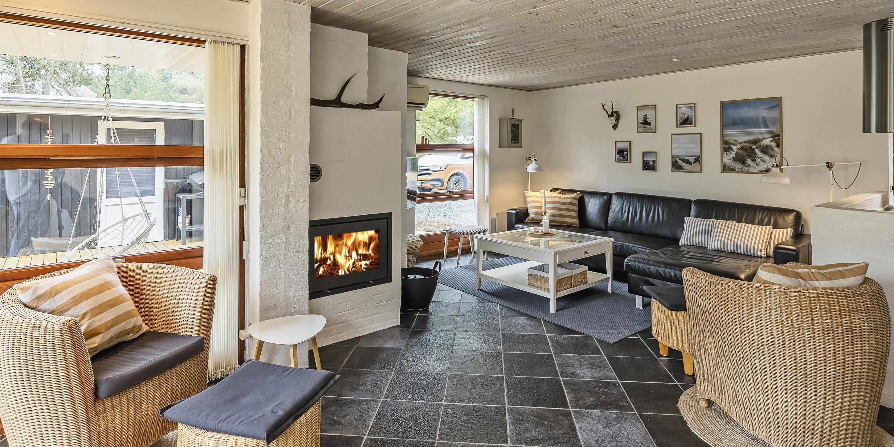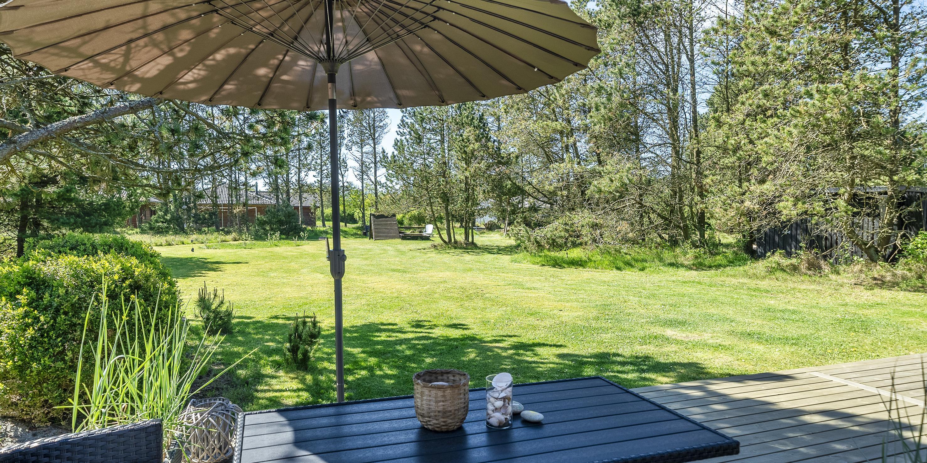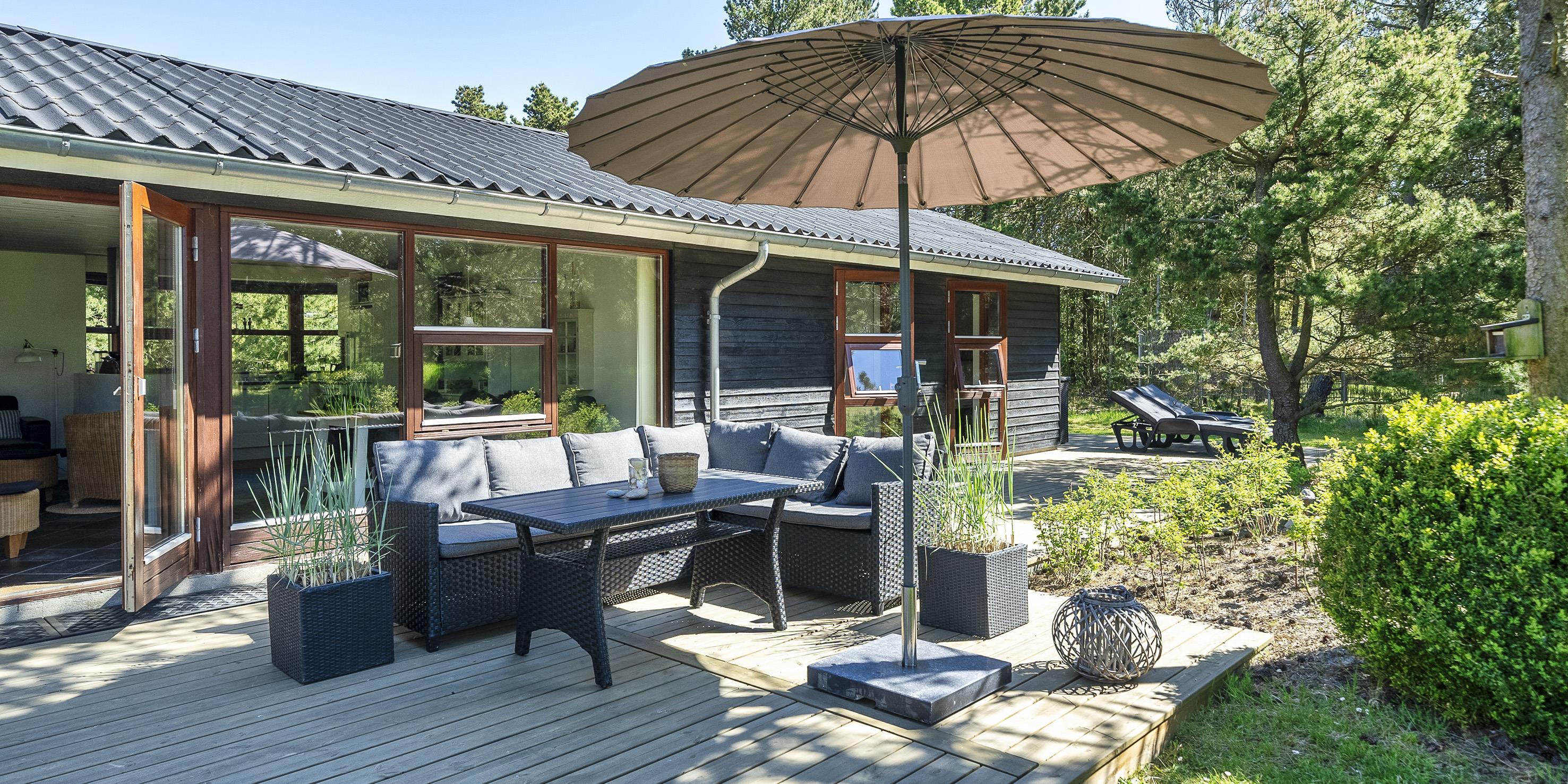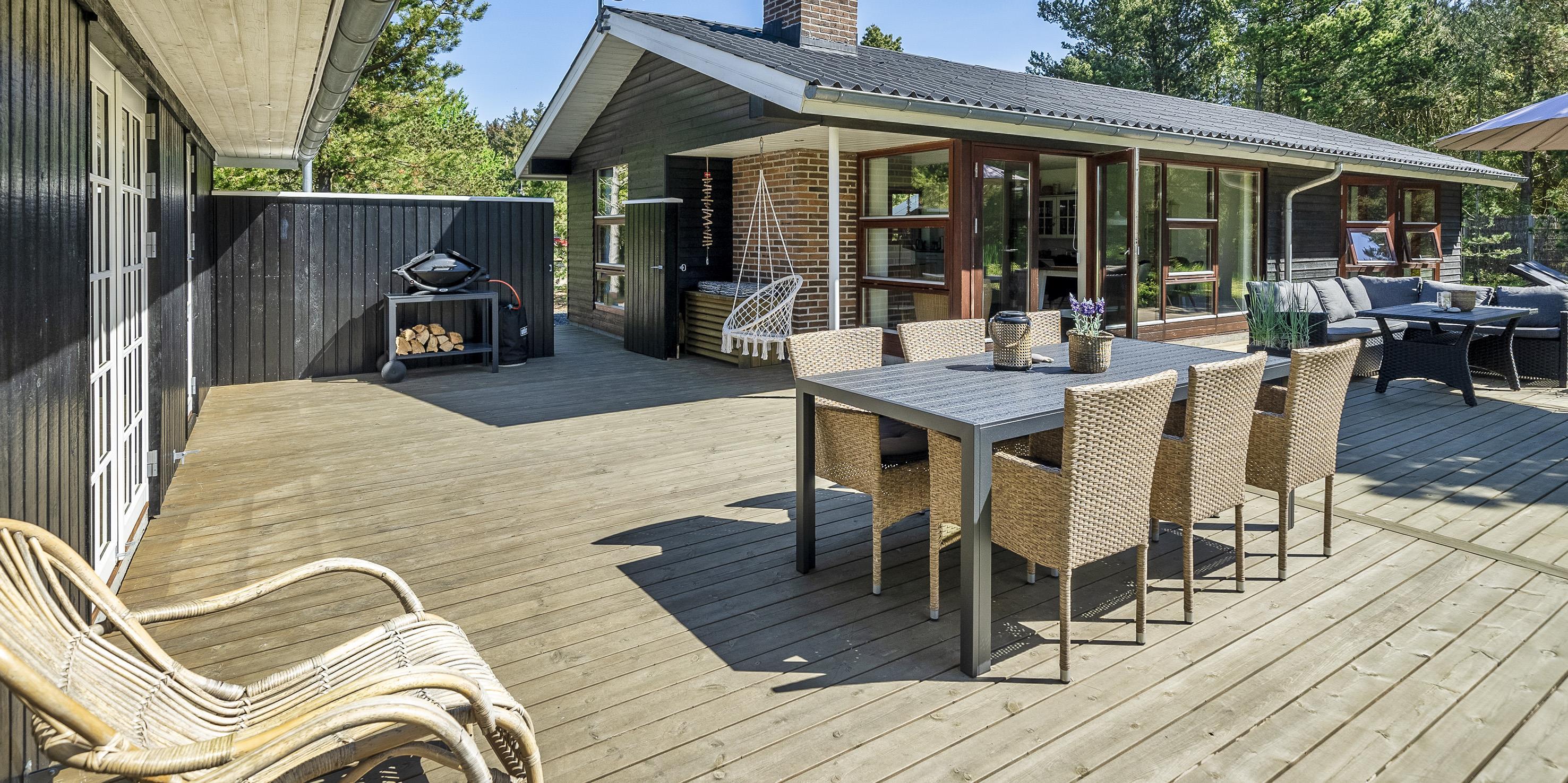 Geschmackvoll eingerichtetes Ferienhaus auf einem großen uneinsehbaren Rasengrundstück gelegen, umgeben von Bäumen und Büschen. Das Ferienhaus ist ausgestattet für 6 Personen. Der Strand ist ca. 1,5 Km vom Ferienhaus entfernt. Der Wohn- und Küchenbereich ist offen gehalten. Dieser gesamte Bereich ist mit einer hübschen Bodenfliese ausgelegt. Im Wohnbereich befindet sich ein eingemauerter Kamin. Es befindet sich eine Warmepumpe im Ferienhaus. Mit dieser Warmepumpe haben sie die Möglichkeit die Stromkosten zu senken, denn die Warmepumpe ist energiesparend. Das deutsche Fernsehprogramm empfangen Sie über eine Parabolantenne. Die Küche ist mit einem Herd mit Cerankochfeld, einem Backofen, einer Geschirrspülmaschine, einer Mikrowelle und einer Kühl- und Gefrierkombination ausgestattet. Das hübsche Badezimmer ist mit der gleichen Bodenfliese ausgestattet. Es verfügt über ein WC, ein Handwaschbecken, eine Dusche und eine Sauna. Die Waschmaschine und der Trockner sind mit im Badezimmer untergebracht. Insgesamt stehen den Gästen drei Schlafzimmer zur Verfügung: DB + DB + DB. Alle Schlafzimmer haben einen Ausgang zu der Terrasse und sind mit Verdunklungsrollos ausgestattet. Das Ferienhaus verfügt über einen Internetanschluss (W-Lan). Auf dem Grundstück befindet sich eine kleine Spieloase für die kleinen Gäste des Hauses. Es ist ausgestattet mit einer Schaukel, einer Sandkiste und einem Spielhaus. Es sind keine Haustiere erlaubt. Das Rauchen im Ferienhaus ist nicht erlaubt. Das Ferienhaus ist 1975 erbaut worden und in 2007 renoviert. Der Eigentümer stellt Gas und Gasgrill zur Verfügung.