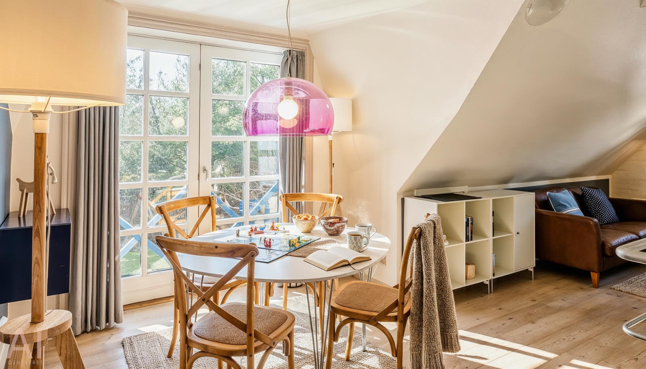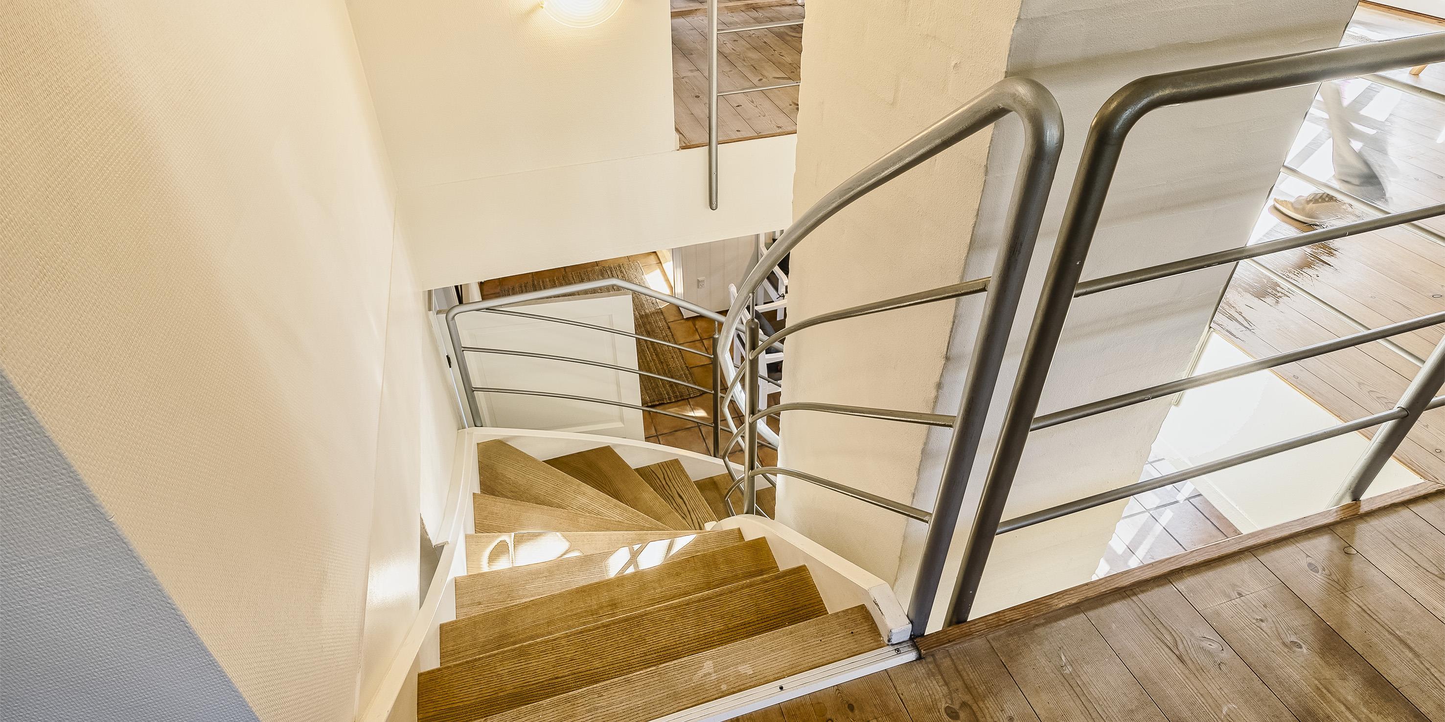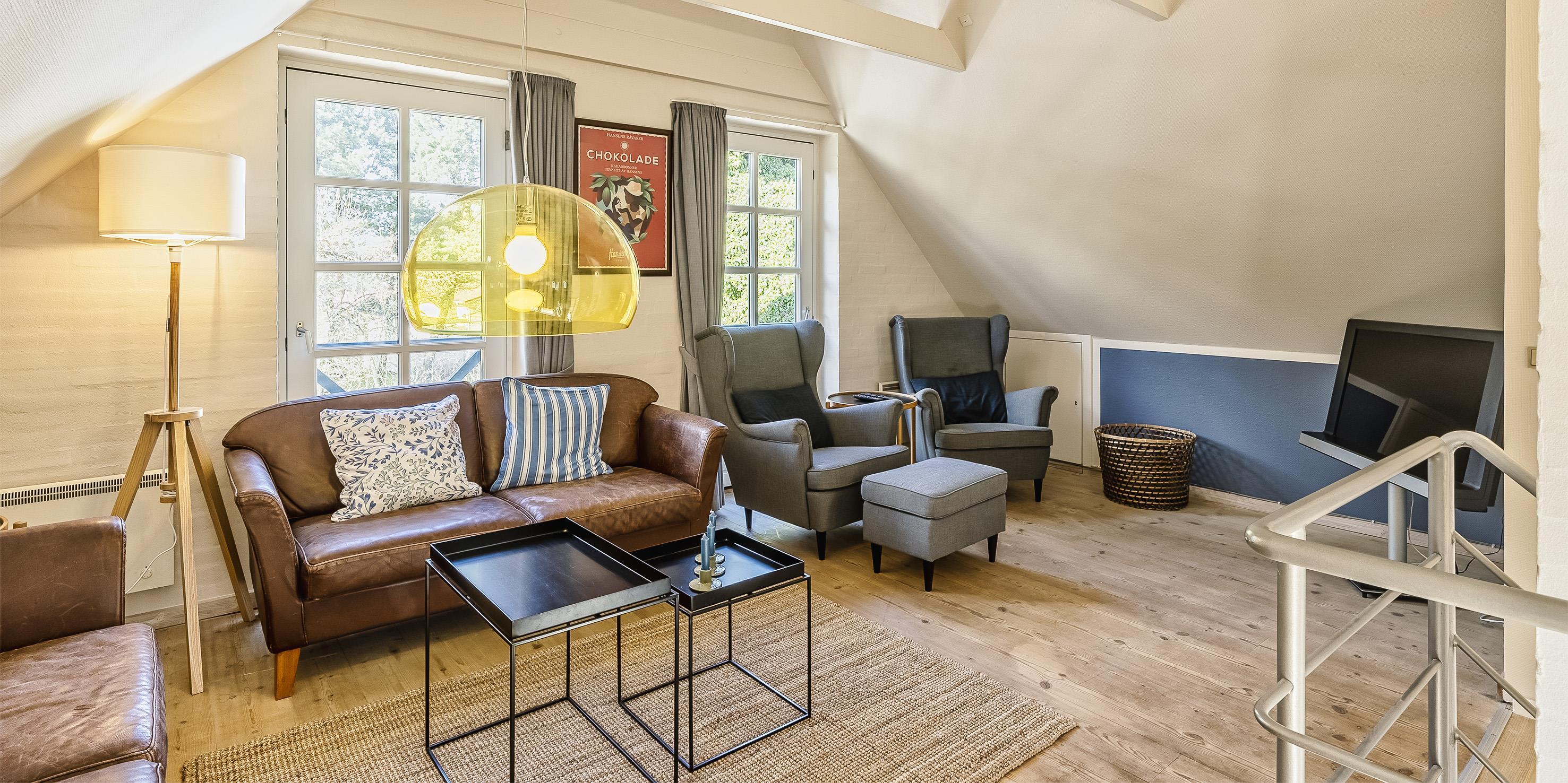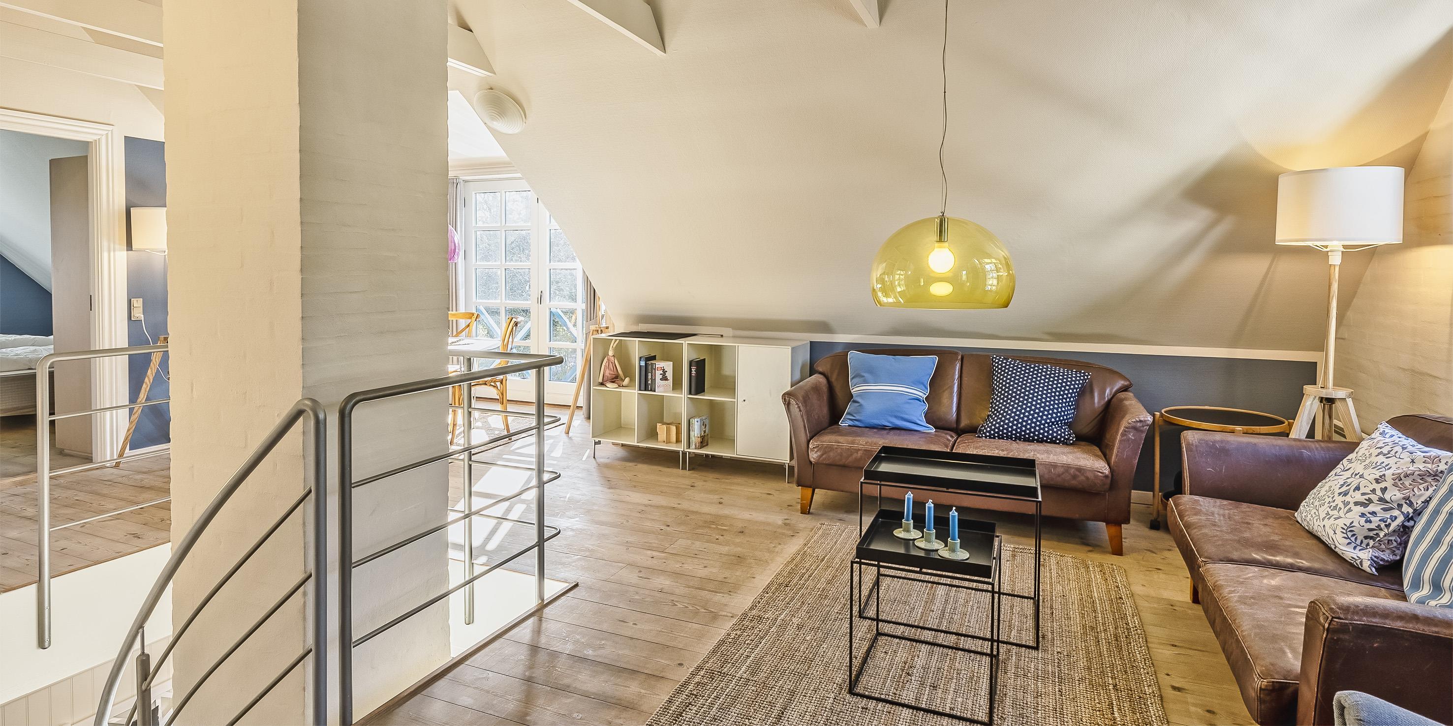 Über eine grosse breite Holztreppe gelangen Sie ins obere Geschoss und gleich in den mit Holzfussboden belegten Wohnbereich. Hier bietet das gemütliche Sofa Spannung pur. Das zweite Badezimmer verfügt über eine Duschkabine, ein WC und ein Handwaschbecken mit grosser Ablagefläche.