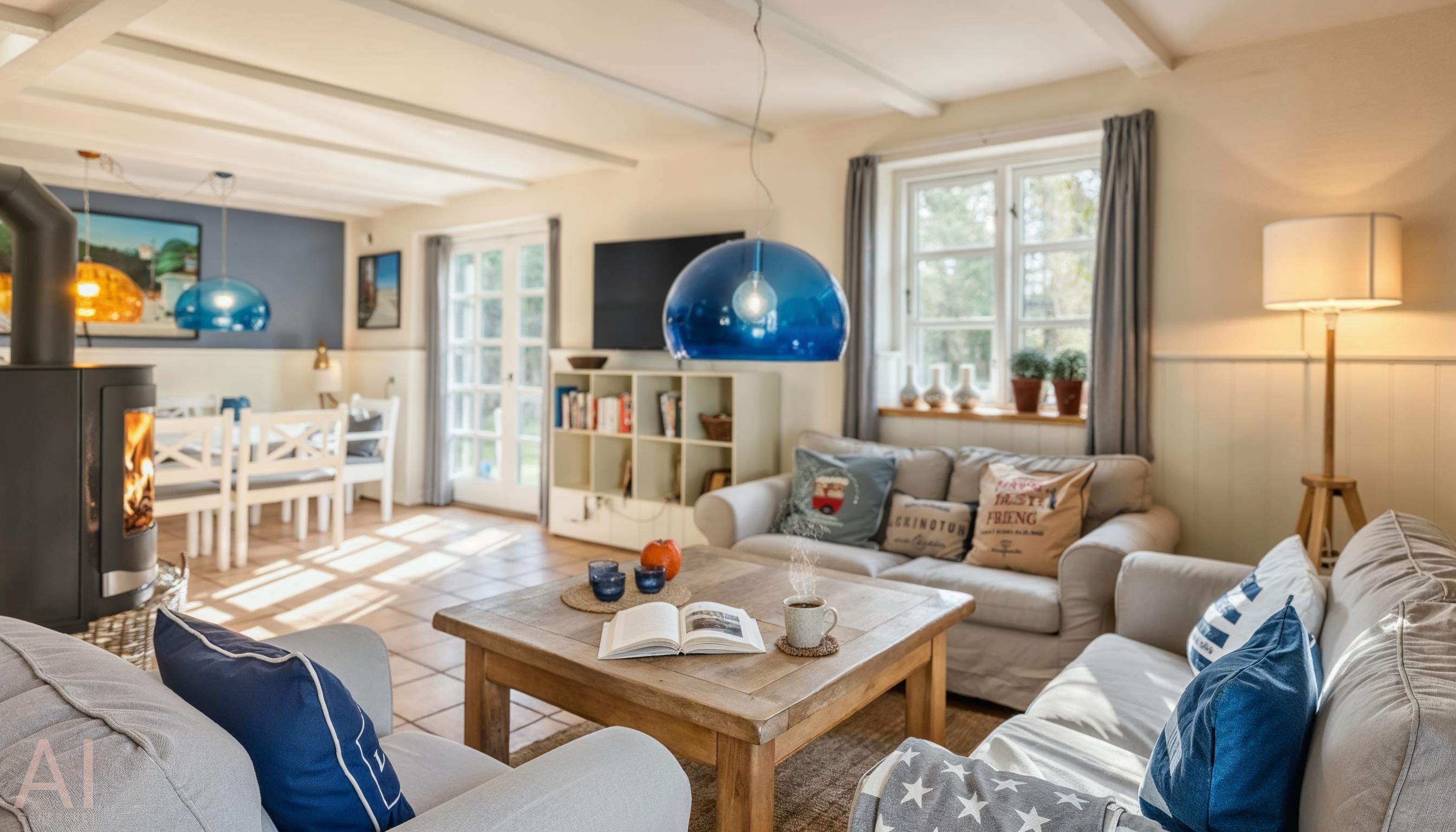 Der im Wohnzimmer hängende Kamin sogt hier für gemütliche und angenehme Wärme. Vom Wohnbereich gelangt man in die offene Wohnküche, die mit einem Herd mit Cerankochfeld und Backofen, einer Geschirrspülmaschine und einer Kühl- und Gefrierkombination ausgestattet ist. Deutsches Fernsehprogramm ist über eine Parabol-Antenne zu empfangen. Das grosse Badezimmer verfügt über eine Dusche, ein WC und einem Handwaschbecken, das genügend Ablagefläche für Ihre Badutensilien bietet. Eine Sauna ist hier auch integriert. Die Waschmaschine und der Trockner befinden sich ebenfalls hier im Bad.