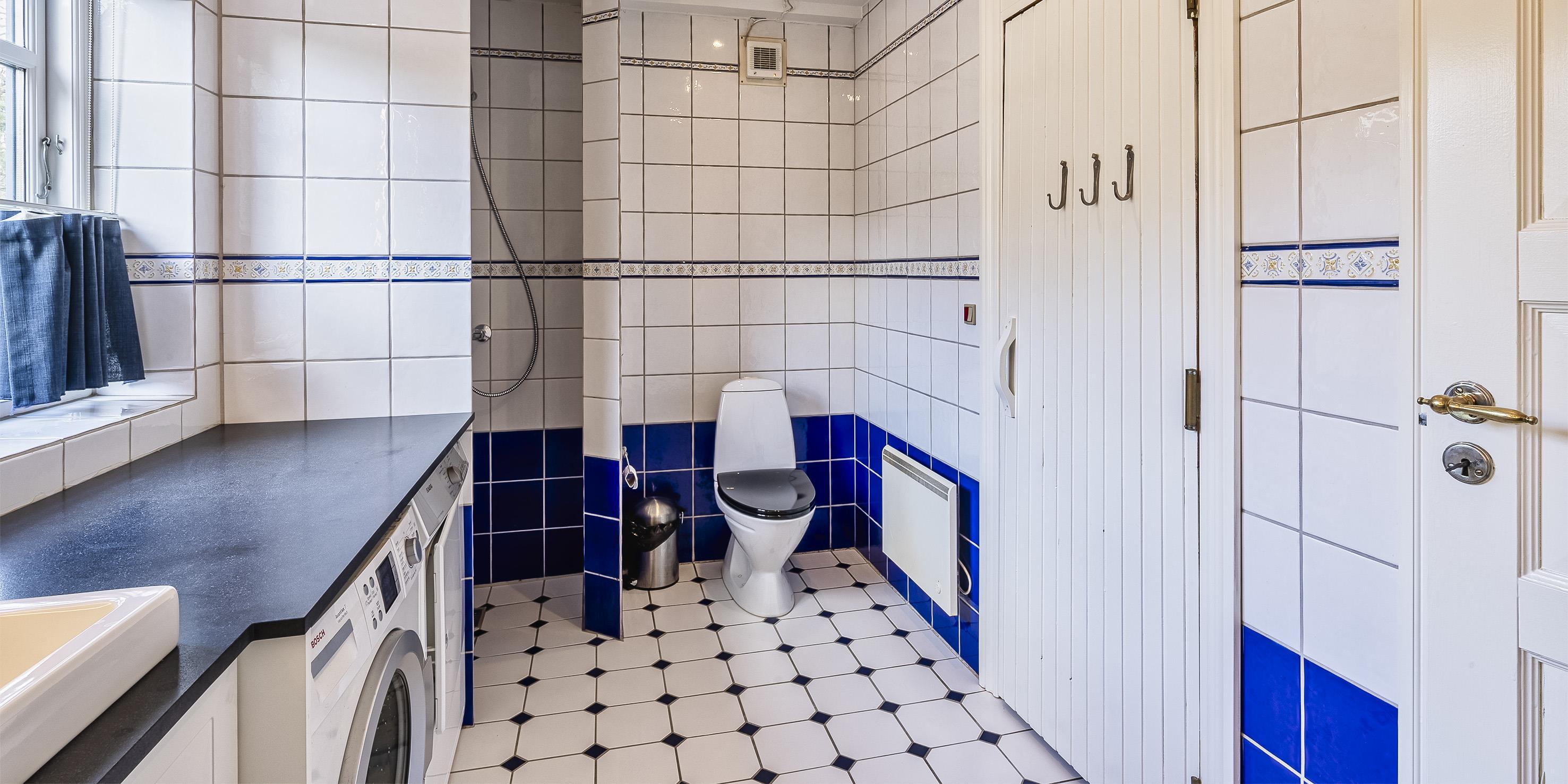 Badezimmer mit Toilette, Dusche und Waschbecken