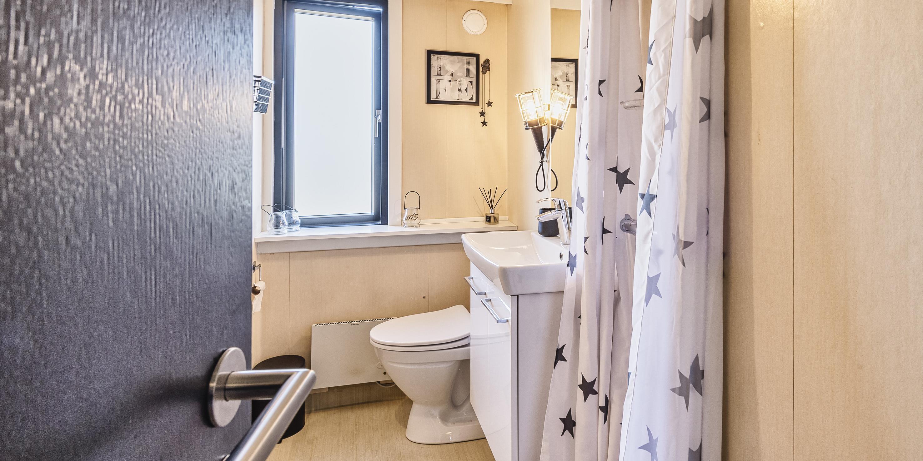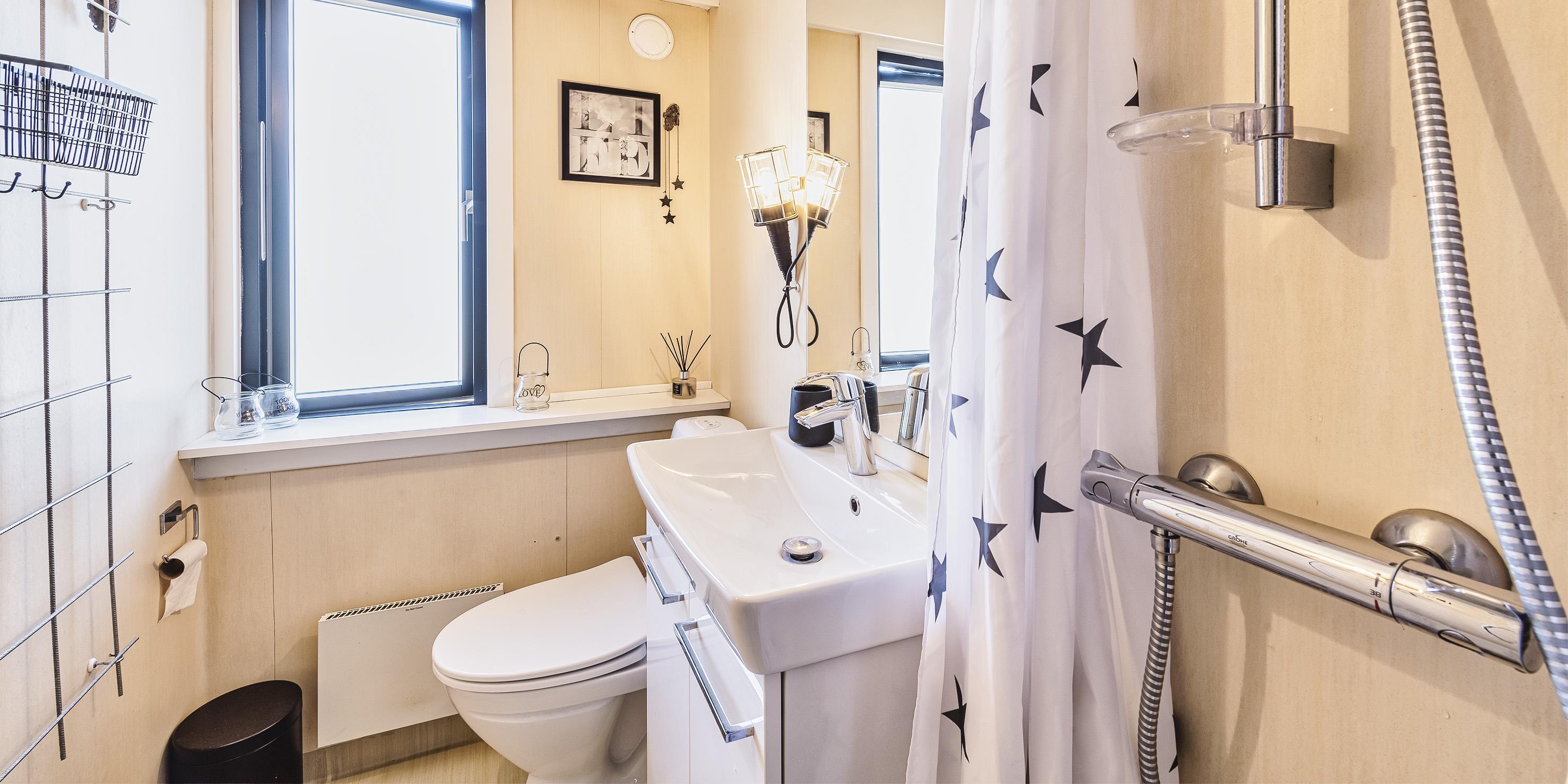 Badezimmer mit Toilette, Dusche und Waschbecken