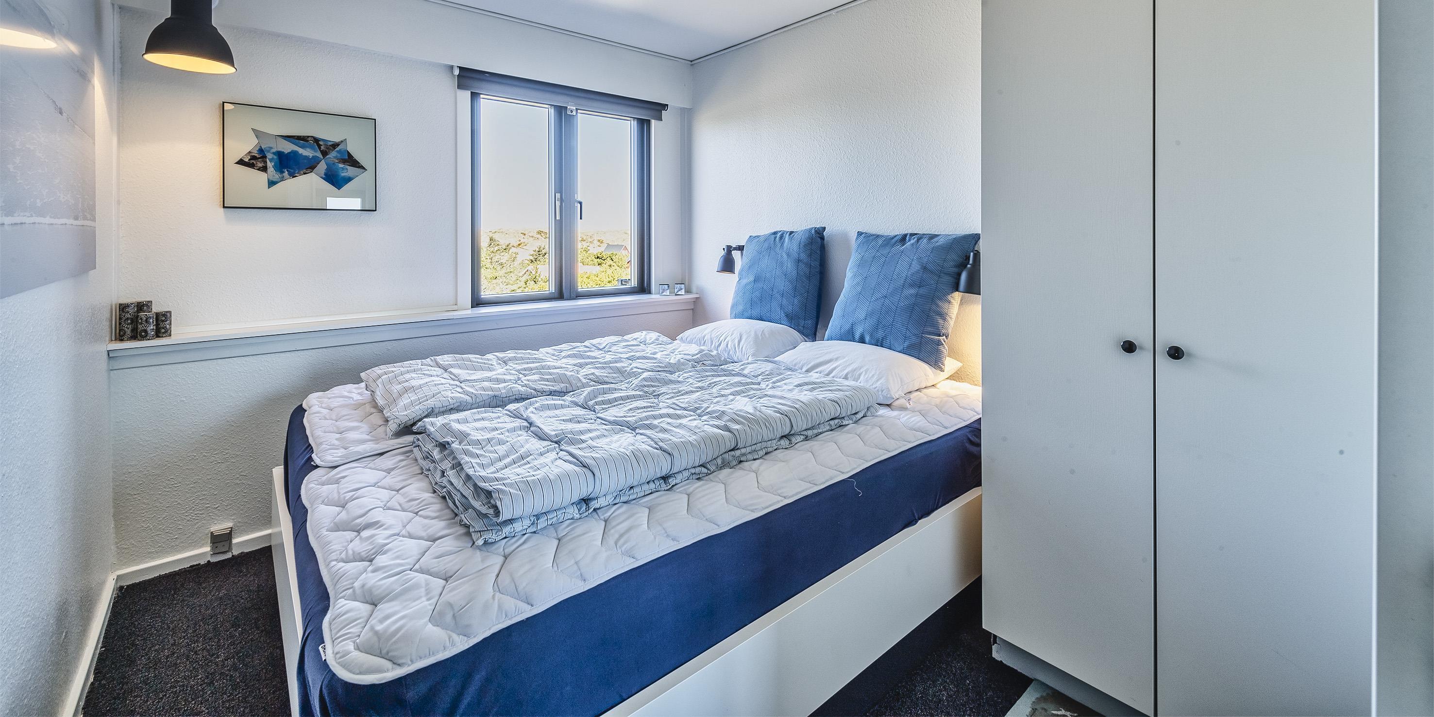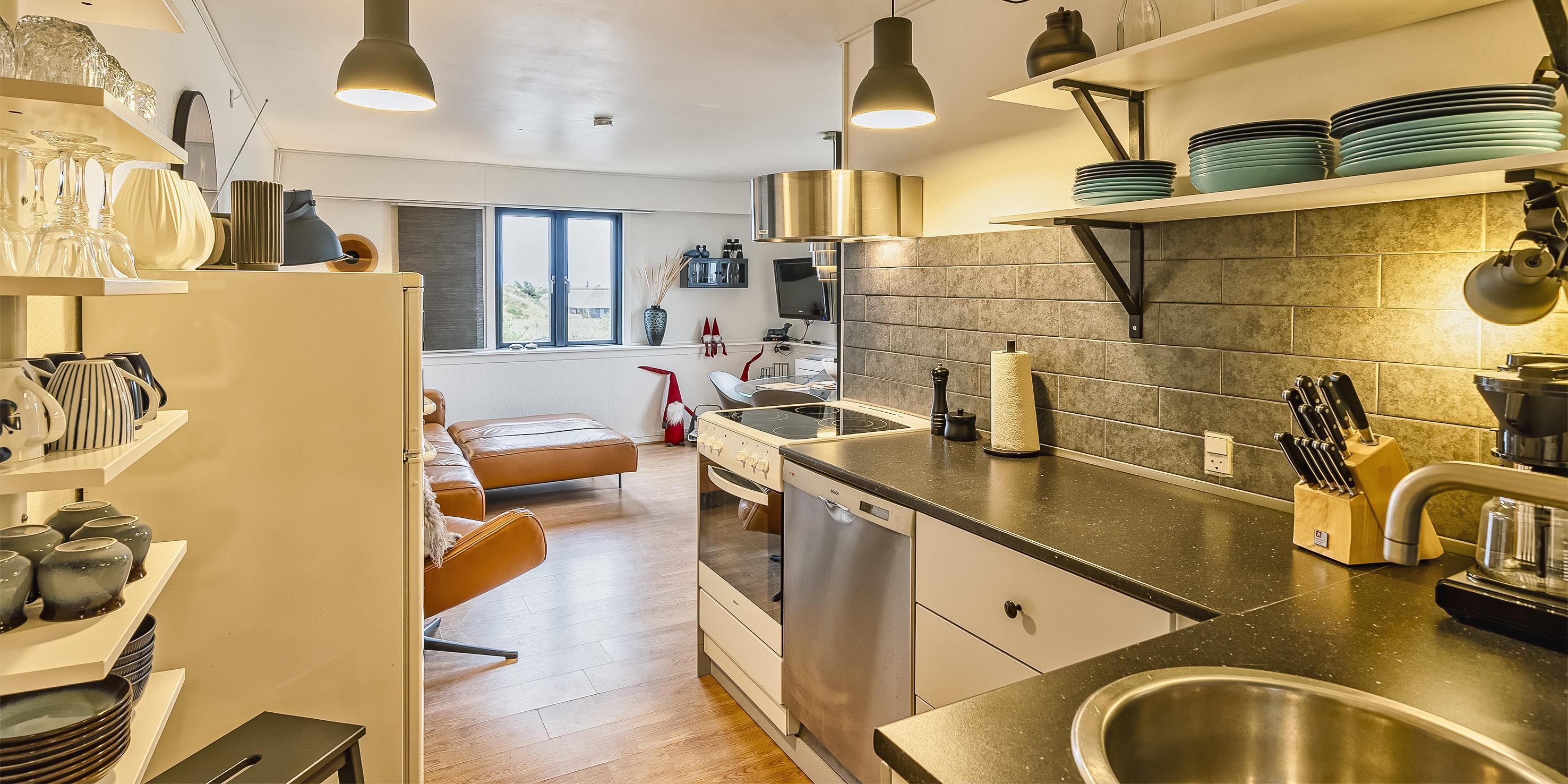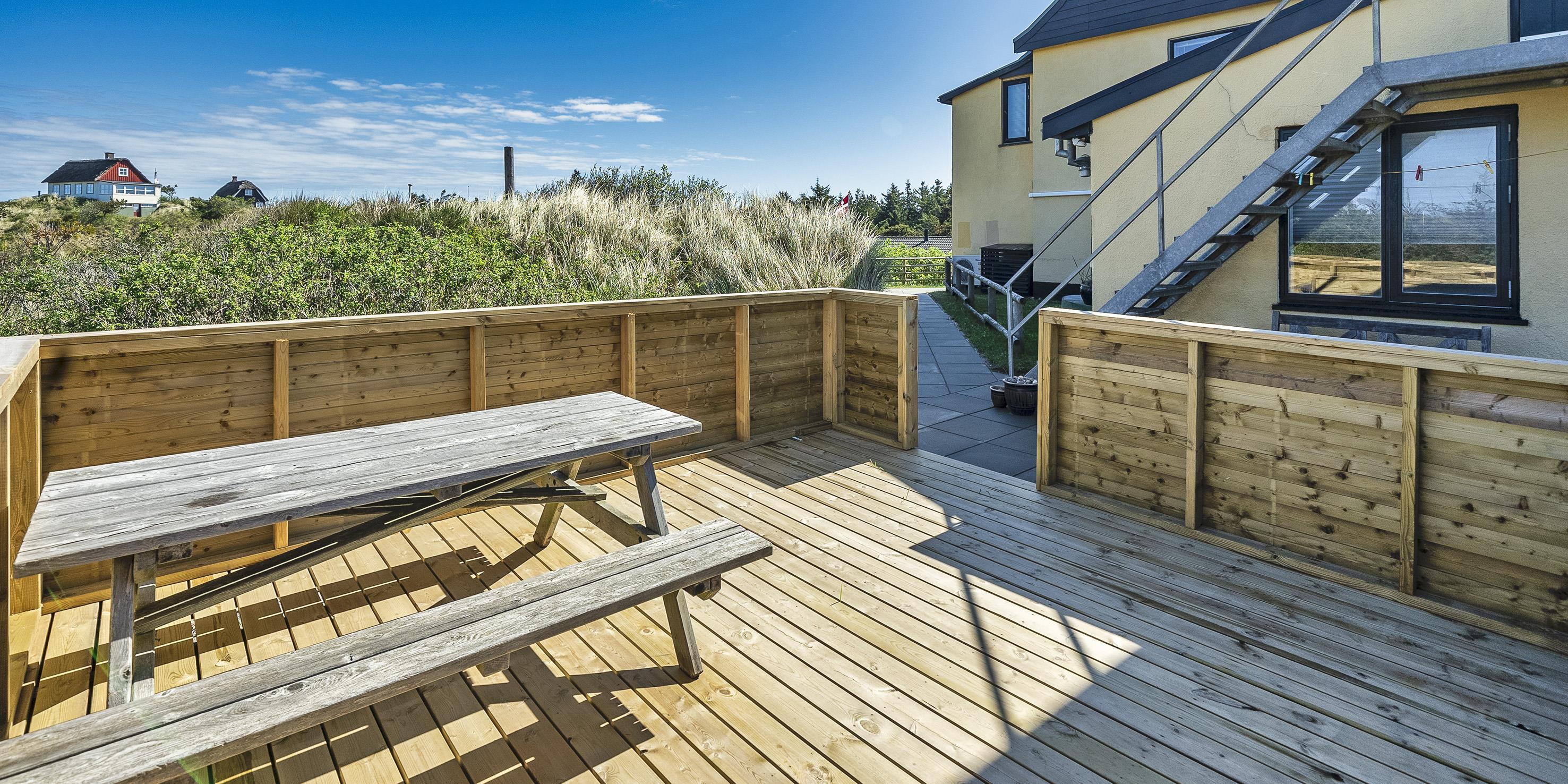 Diese kleine gemütliche Ferienwohnung befindet sich in der 1. Etage eines Mehrfamilienhauses in Südwestlage und ist für 4 Personen ausgestattet. Der Strand ist nur 200 Meter entfernt und in ein paar Minuten fussläufig zu erreichen. Auf der Rückseite des Hauses befindet sich eine Metalltreppe, die dann zur Wohnung führt. Der Wohn- und Essbereich ist offen gehalten und mit dem kleinen Küchenbereich verbunden. Das deutsche Fernsehprogramm empfangen Sie über eine Parabolantenne. Es befindet sich eine Warmepumpe im Ferienhaus. Mit dieser Warmepumpe haben sie die Möglichkeit die Stromkosten zu senken, denn die Warmepumpe ist energiesparend. Ein toller Ausblick über die Dünnlandschaft ist gewährleistet. Die Küche ist einfach gehalten und sie verfügt über einen Herd mit Cerankochfeld, einem Backofen und einer Kühl- und Gefrierkombination. Des weiteren befindet sich eine Geschirrspülmaschine in der Küche. Dieser gesamte Bereich, sprich Wohn- und Essbereich, sowie der Küchenbereich, ist mit einem hellen Laminatboden verlegt worden. Das Duschbad verfügt über ein WC, ein Handwaschbecken und eine Dusche. Es stehen den Gästen zwei Schlafzimmer zur Verfügung: DB + DB. In den Schlafzimmern ist ein neuer Teppichboden verlegt. Im Eingangsbereich haben Sie Platz für Ihre Garderobe und Schuhe. Auch hier ist der Fußboden mit Laminat versehen. Es sind max. zwei Hunde erlaubt. Katzen sind nicht erlaubt. Rauchen ist nicht erlaubt. Die Wohnung verfügt über einen Internet-Anschluss (W-Lan). Das Mehrfamilienhaus ist 1937 erbaut worden. Mehrere Gemeinschaftsterrassen für einen schönen Grillabend oder zur Kaffeezeit stehen Ihnen am Haus zur Verfügung. Ein Grill steht der Gemeinschaft auch zur Verfügung. Diese Wohnung wurde in 2019 renoviert. Gratis Eintritt Oksbøl Badeland in 2026.