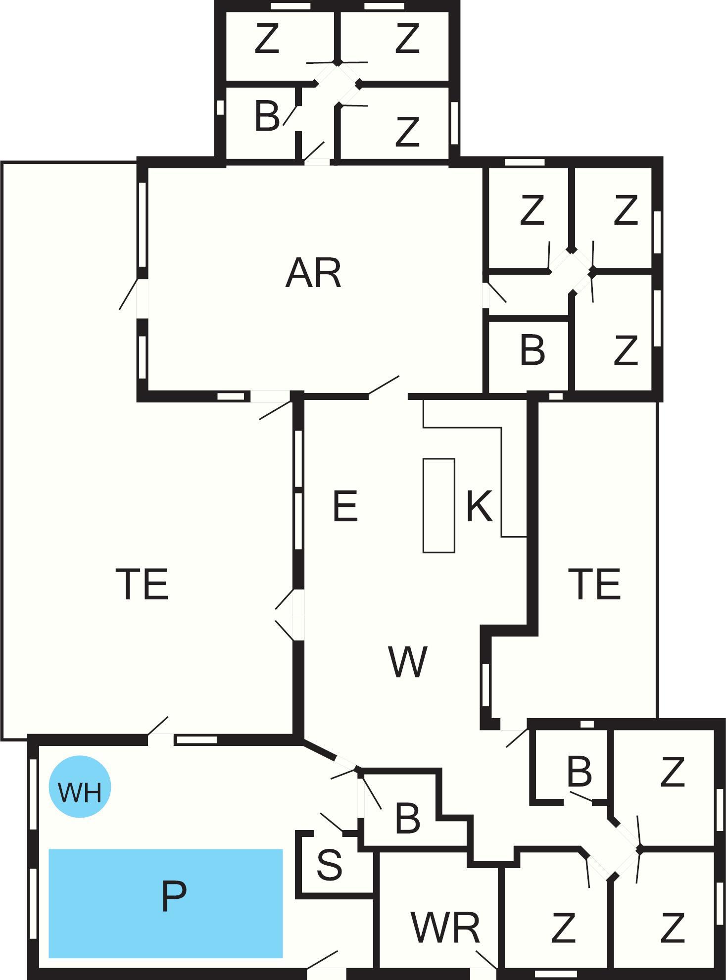 Ferienhaus für 24 Personen in Vejlby Klit mit großem Poolbereich mit Schwimmtrainer, Wasserrutsche, Sauna, Dusche und Whirlpool bietet Platz für 4–6 Personen.