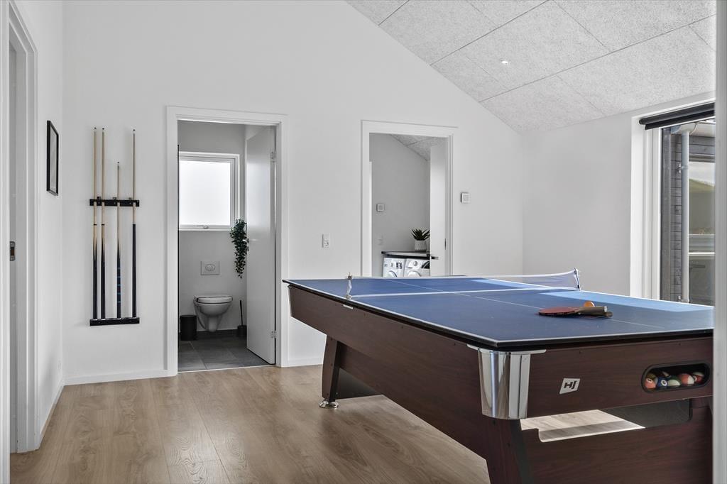 Beim Betreten dieses geräumigen Ferienhauses werdet ihr von einem stilvollen Interieur und modernen Annehmlichkeiten empfangen. Die offene Küche und das Esszimmer bilden den Mittelpunkt für gemeinsames Kochen und gemütliche Mahlzeiten, während das Wohnzimmer zur Entspannung mit einem guten Buch oder vor dem Fernseher einlädt. Der Aktivitätsraum ist ein Highlight für Jung und Alt, wo ihr euch bei Tischtennis oder Billard messen könnt. Nach einem erlebnisreichen Tag könnt ihr euch im hauseigenen Whirlpool, der sich in einem der beiden Badezimmer befindet, entspannen.