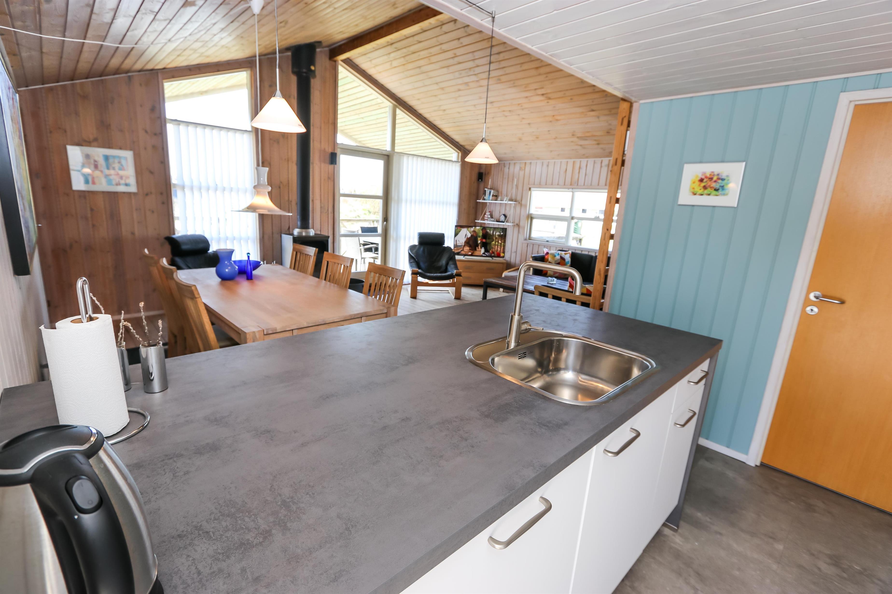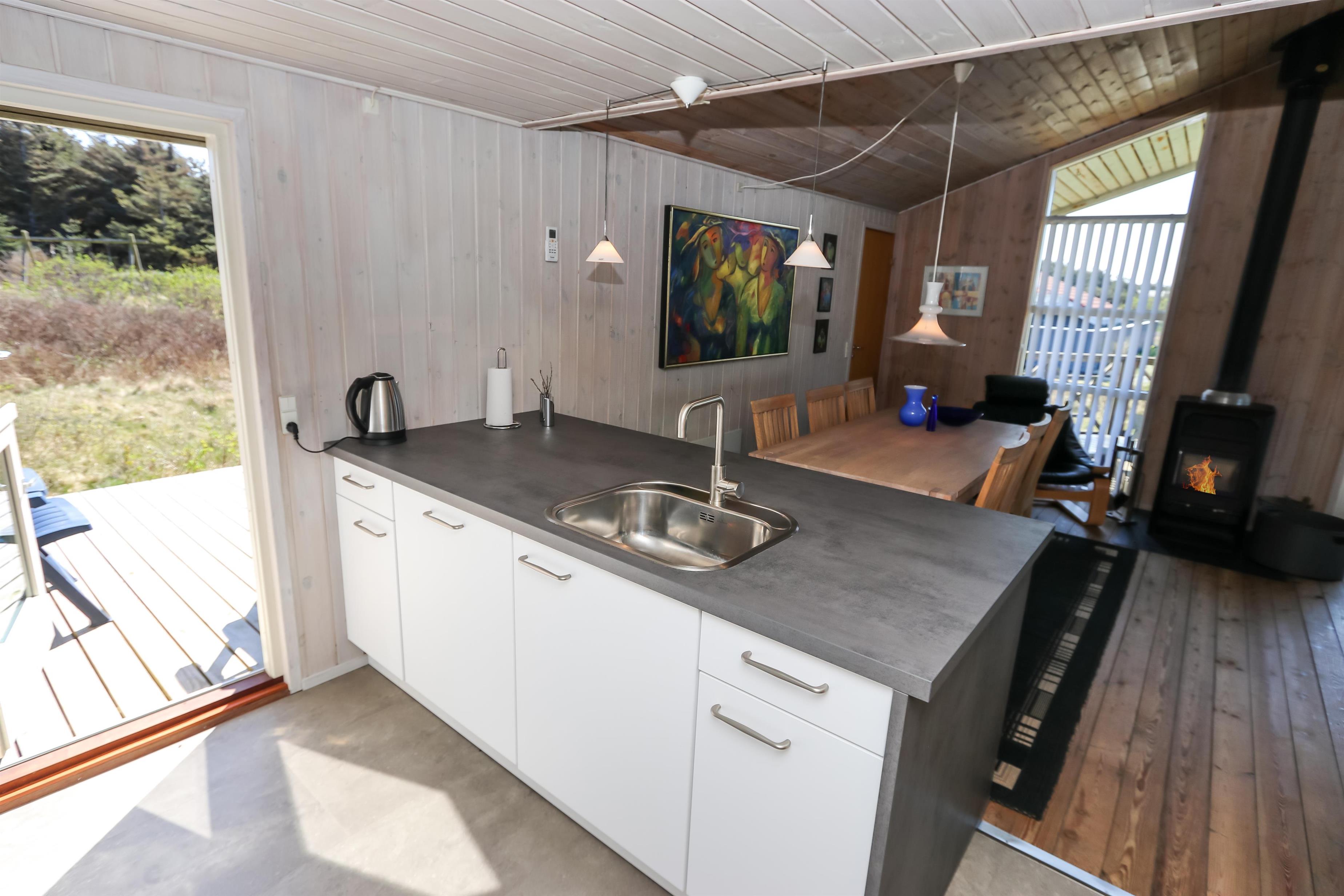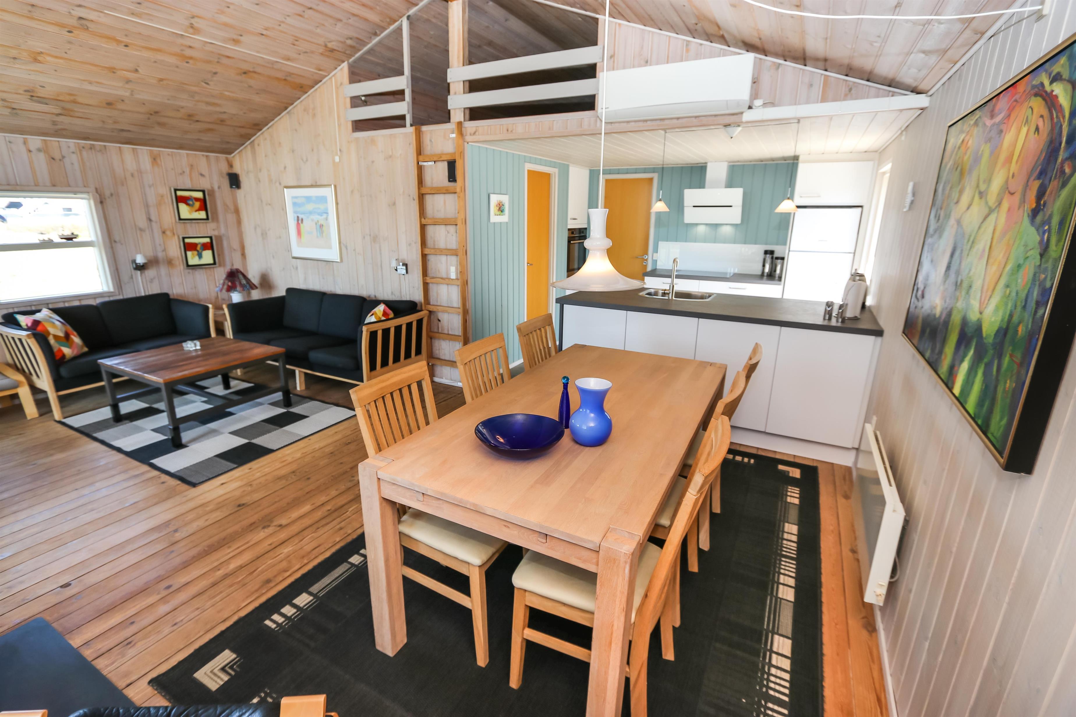Der Wohnraum ist mit der Küche kombiniert und hat einen Kaminofen und eine Wärmepumpe, die beide für eine schöne Wärme und eine günstigere Nebenkostenrechnung sorgen. Außerdem gibt es DVD-Player, Stereoanlage mit CD-Player und F-TV mit dänischen und deutschen Programmen (über Parabolantenne). Hier gibt es freies WLAN. Es gibt 2 Badezimmer, beide mit Dusche, Toilette und Waschbecken. Eines von den Badezimmern hat Fußbodenheizung, Whirlpool und direkten Zugang zur Sauna. Es gibt 3 Schlafräume im Haus: 1DB + 2B + 2B und 2 Schlafmöglichkeiten auf dem offenen Schlafboden. Das Haus ist für max. 7 Personen. Die Küche ist gut ausgestattet mit Ceranfeld-Kochherd, Kühl-/Gefrierschrank, Geschirrspüler und Mikrowelle. Außerdem gibt es eine Waschmaschine, Trockner und Kinderstuhl im Haus. Ein sehr schönes Haus nur 700 m vom Supermarkt, das in der Saison geöffnet hat und nur 250 von der Nordsee entfernt. Max. 1 Haustier ist erlaubt. Nichtraucher-Haus.