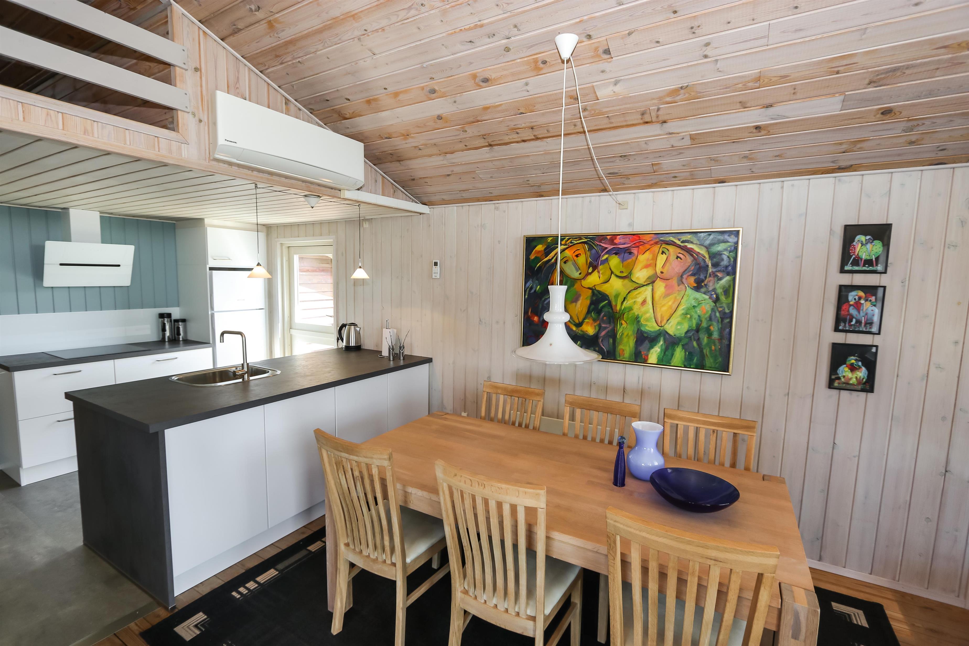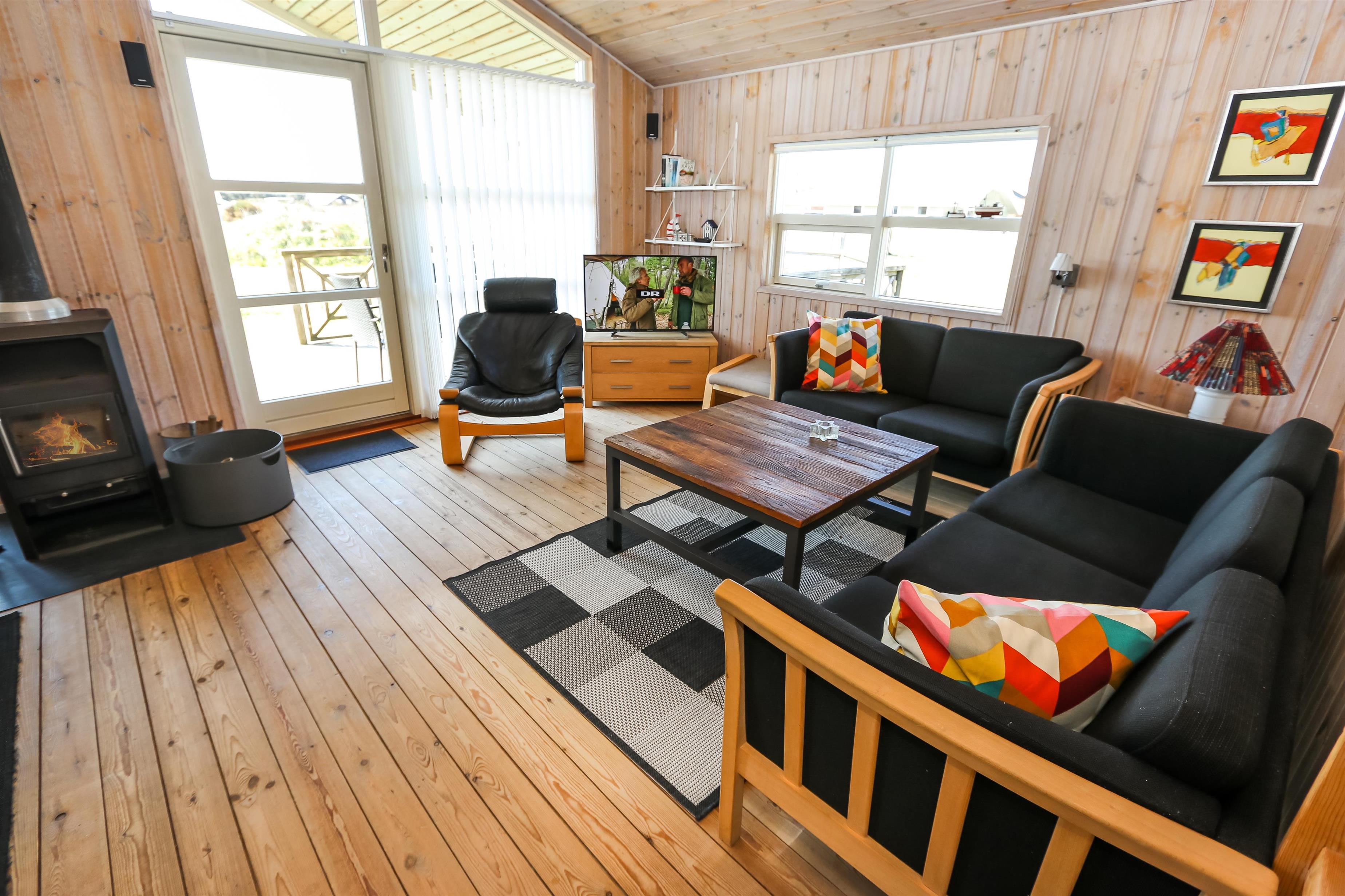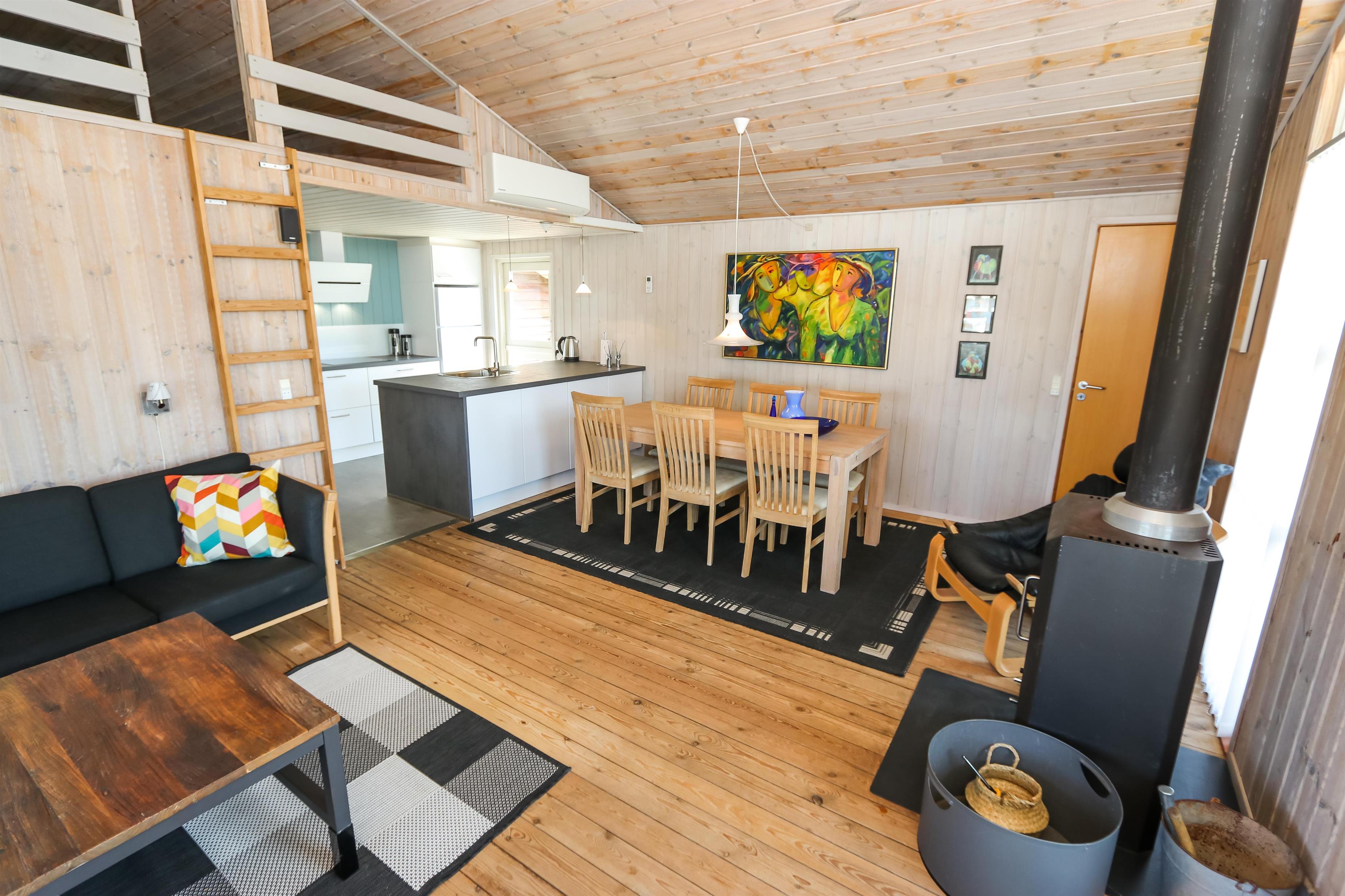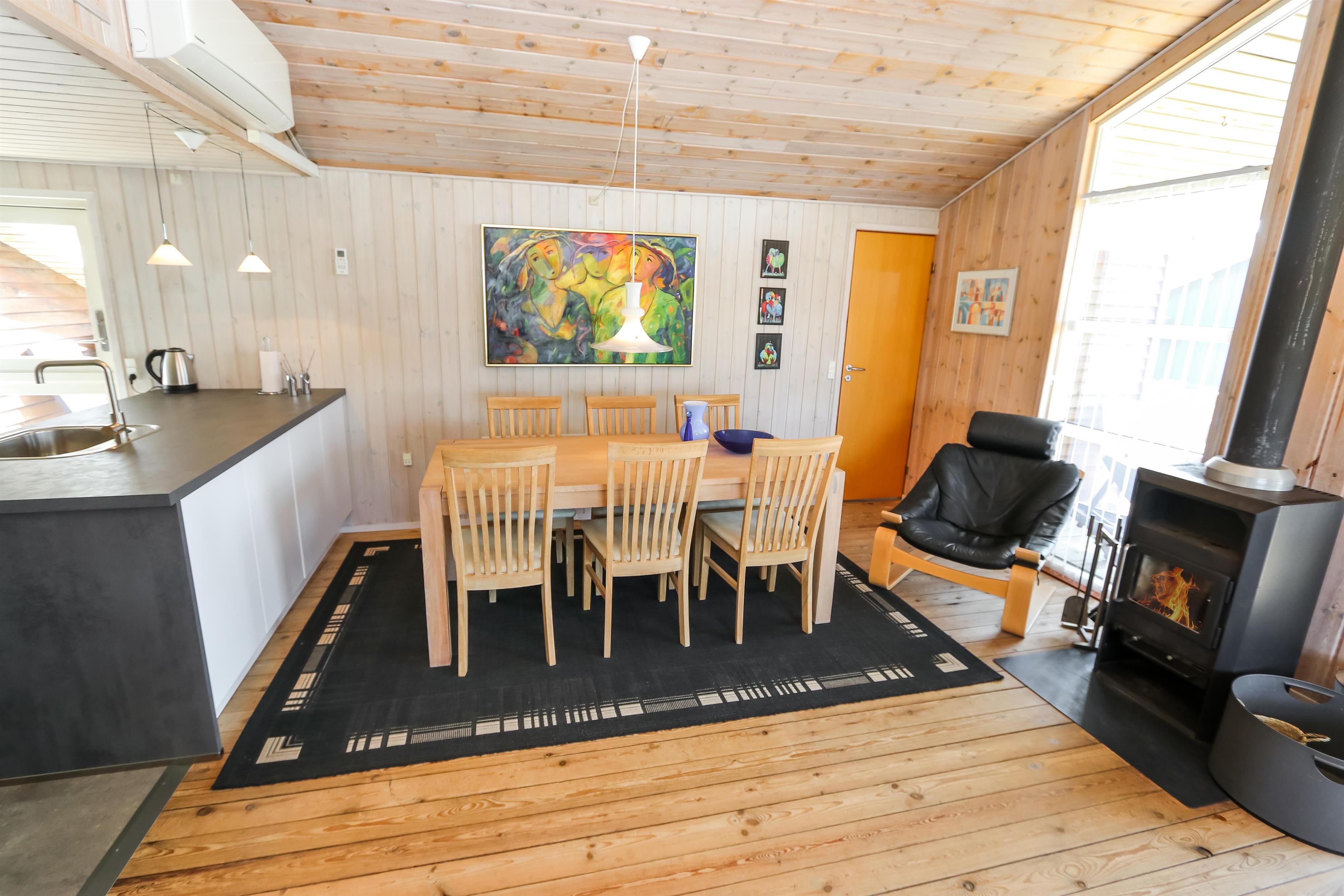 Der Wohnraum ist mit der Küche kombiniert und hat einen Kaminofen und eine Wärmepumpe, die beide für eine schöne Wärme und eine günstigere Nebenkostenrechnung sorgen. Außerdem gibt es DVD-Player, Stereoanlage mit CD-Player und F-TV mit dänischen und deutschen Programmen (über Parabolantenne). Hier gibt es freies WLAN. Es gibt 2 Badezimmer, beide mit Dusche, Toilette und Waschbecken. Eines von den Badezimmern hat Fußbodenheizung, Whirlpool und direkten Zugang zur Sauna. Es gibt 3 Schlafräume im Haus: 1DB + 2B + 2B und 2 Schlafmöglichkeiten auf dem offenen Schlafboden. Das Haus ist für max. 7 Personen. Die Küche ist gut ausgestattet mit Ceranfeld-Kochherd, Kühl-/Gefrierschrank, Geschirrspüler und Mikrowelle. Außerdem gibt es eine Waschmaschine, Trockner und Kinderstuhl im Haus. Ein sehr schönes Haus nur 700 m vom Supermarkt, das in der Saison geöffnet hat und nur 250 von der Nordsee entfernt. Max. 1 Haustier ist erlaubt. Nichtraucher-Haus.