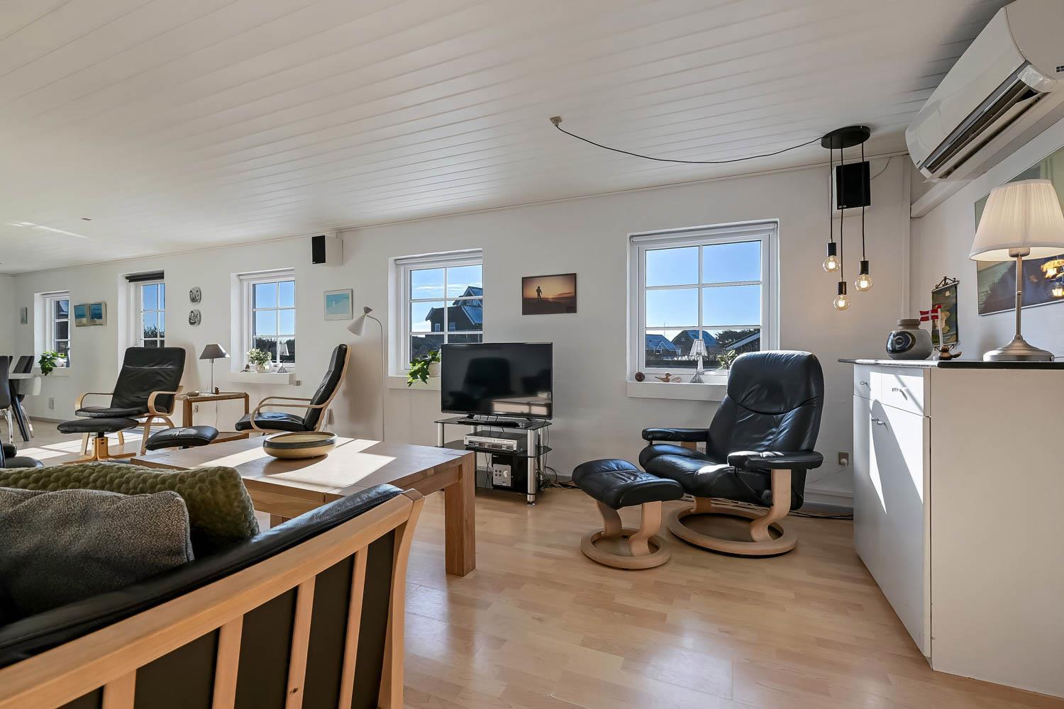 Dieses 120 m² große Haus wurde 1991 gebaut und im Jahr 2015 kontinuierlich renoviert. Es bietet ein helles und gemütliches Wohnzimmer mit Linoleumboden, das mit Ledermöbeln und einem Fernseher mit dänischen und deutschen Kanälen ausgestattet ist. Außerdem gibt es einen DVD- und CD-Player sowie ein Radio. Im Wohnzimmer befindet sich auch ein gemütlicher Kaminofen sowie eine Wärmepumpe, die zur Beheizung des Hauses beitragen. Die offene Küche ist in das Wohnzimmer und den Essbereich integriert, wo alle Gäste des Hauses Platz finden. Die Küche ist mit einem Glaskeramikherd, Abzugshaube, Mikrowelle, Kühl-/Gefrierschrank, Geschirrspüler und Fliesenboden ausgestattet. Das Haus verfügt über 3 gute Schlafzimmer, jedes mit einem Doppelbett. Im Wohnzimmer befindet sich der Aufgang zum Schlafboden, wo zwei weitere Schlafmöglichkeiten vorhanden sind. An beiden Enden des Hauses befindet sich ein Badezimmer. Eines der Badezimmer ist mit Toilette, Waschbecken, Dusche und Fliesenboden ausgestattet. Das andere Badezimmer verfügt ebenfalls über Toilette, Waschbecken, Dusche sowie einen Whirlpool und eine Sauna. Auch hier ist der Boden mit Fliesen belegt. Außerdem gibt es für die kleinsten Gäste einen Hochstuhl, ein Kinderbett, eine Babybadewanne und einen Wickeltisch. Sollte während des Urlaubs Wäsche gewaschen werden müssen, stehen Waschmaschine und Trockner zur Verfügung.