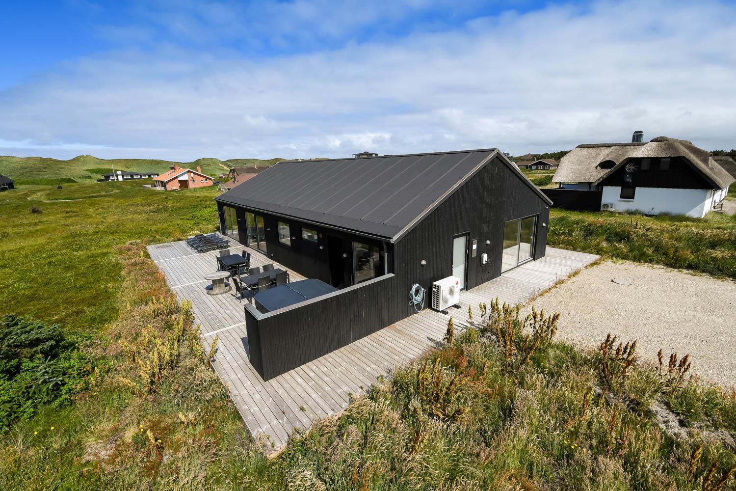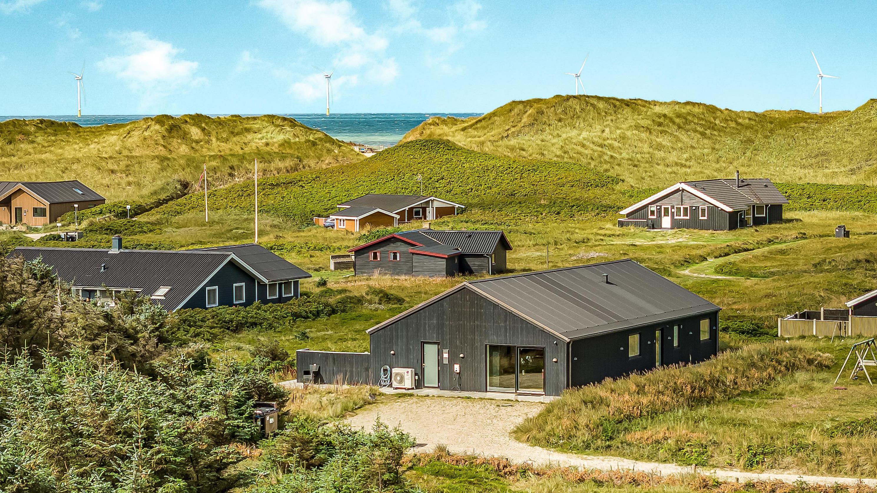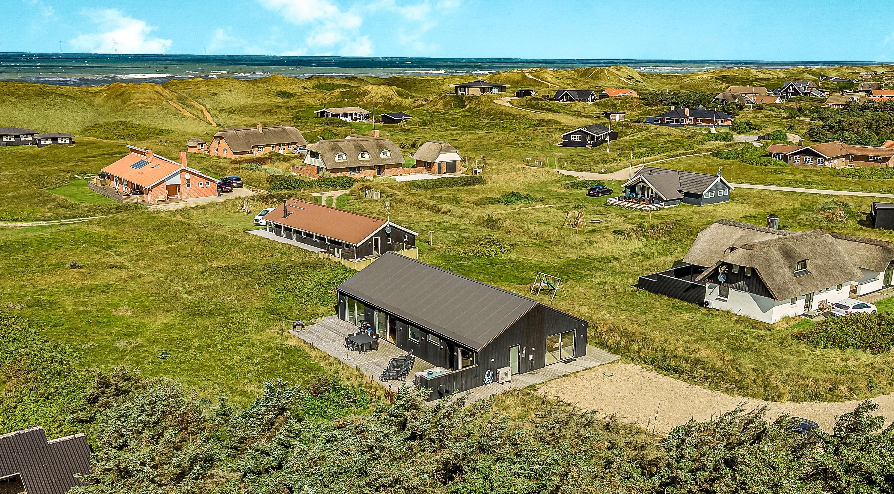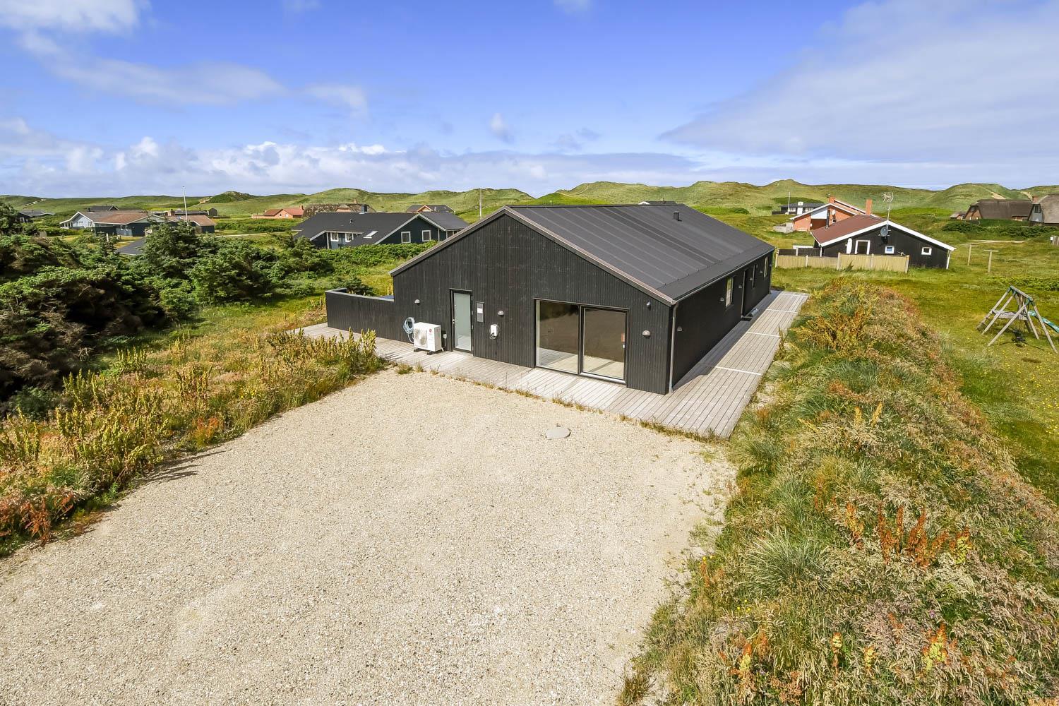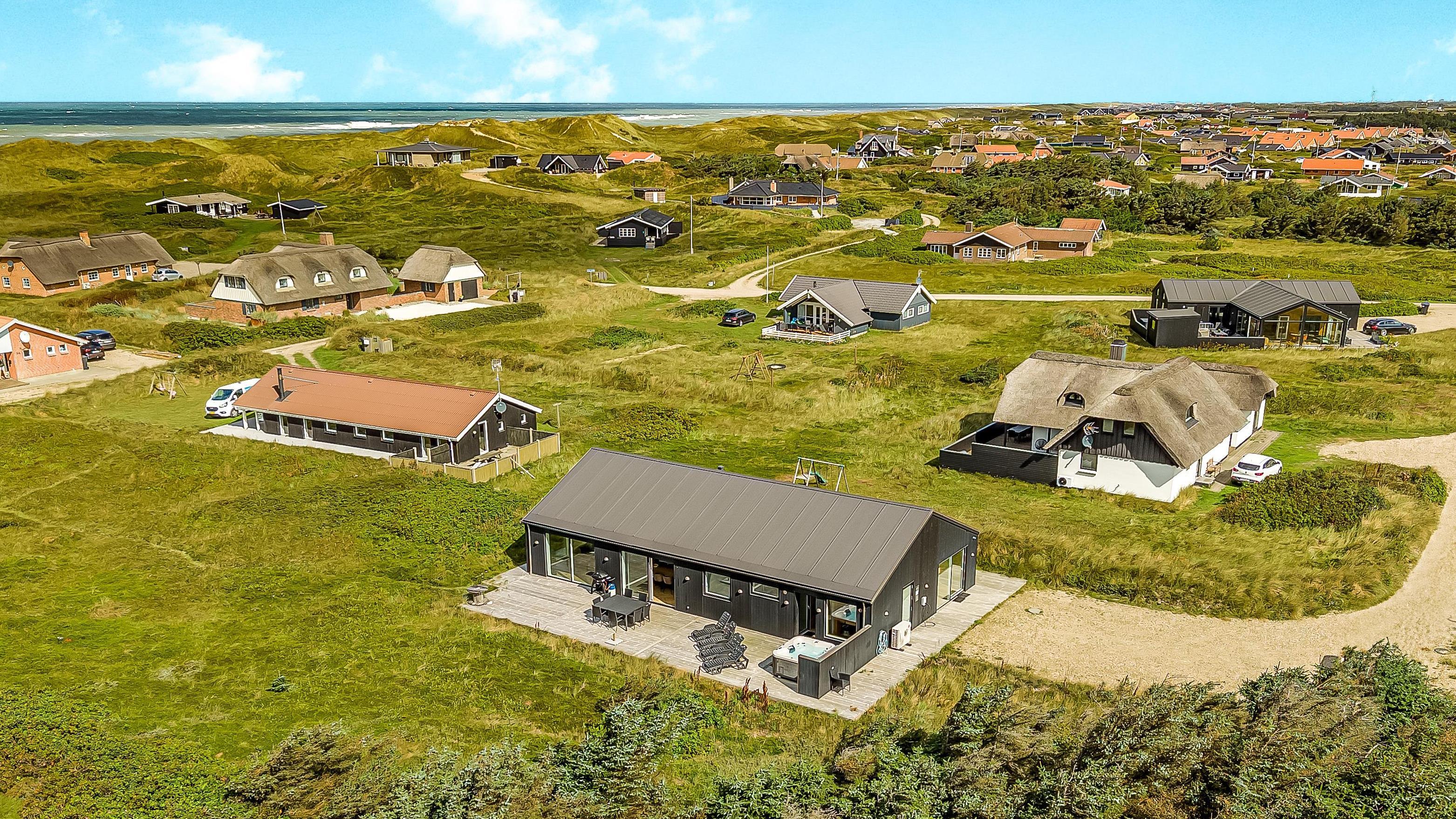 Schon wenn Sie den Kiesweg nur wenige Meter zum Haus begehen, merken Sie bereits, dass die Lage des Hauses ganz speziell ist. Das Haus liegt auf einem sehr für sich gelegenen Grundstück mit hoher Bepflanzung und am Ende einer geschlossenen Sackgasse. Das Haus ist 120 qm groß und hat 4 schöne Schlafräume: 1DB + 1DB + 1DB + 1DB – alle Zimmern sind mit Einzelbetten ausgestattet, die Sie nach Bedarf umstellen können. Im Herz des Hauses befindet sich eine große gut ausgestattete Küche/Wohnraum mit allem an Geschirr und Kochgeschirr. Die offene Küche hat z.B. einen Herd mit Cerankochfeld, einen eingebauten Ofen, große Abzugshaube, Geschirrspüler, Mikrowelle, Kühlschrank mit Gefrierfach, Weinkühler, Eiswürfelmaschine und vieles mehr. Genießen Sie Ihr zubereitetes Essen am Esstisch, der dicht an der Küche steht. Genießen Sie den tollen Blick zu den Dünen an der Nordsee. Entspannen Sie sich in den bequemen Qualitätsmöbeln. Schauen Sie auf einem der Smart-TV mit Soundbar, dänischen und deutschen TV-Programmen, Radio und Streaming-Diensten. Es gibt praktische Hartfußböden mit Fußbodenheizung im ganzen Haus, die auch sehr leicht zu reinigen sind. Schöne praktische Akustikpaneele sorgen für eine gedämpfte und angenehme Lautstärke für alle. Die Wellness-Abteilung hat z.B. einen Innenwhirlpool. Es gibt einen Ausgang zu der großen und wunderbaren Terrassenanlage, wo es auch einen Außenwhirlpool und eine Sauna gibt. Der separate Aktivitätsraum enthält: Tischfußball und Billard. Hier können Sie viele Stunden verbringen. 2 Badezimmer mit Doppel-Duschkabine in jedem Badezimmer, Toilette, Waschbecken und Fußbodenheizung. Waschmaschine und Trockner sind selbstverständlich. Eine Luft zu Wasser Wärmepumpe macht das Haus energiefreundlich und bewirkt auch einen günstigeren Energieverbrauch. Das Haus wird nicht an Jugendgruppen vermietet. Haben Sie ein Elektro-Auto oder Plug-in-Hybrid dann gibt es auch eine Ladebox für Typ 2 Ladestecker, die bis 11 kWh aufladen kann. Nichtraucher-Haus. Max. 1 Haustier ist erlaubt. Obligatorische Endreinigung