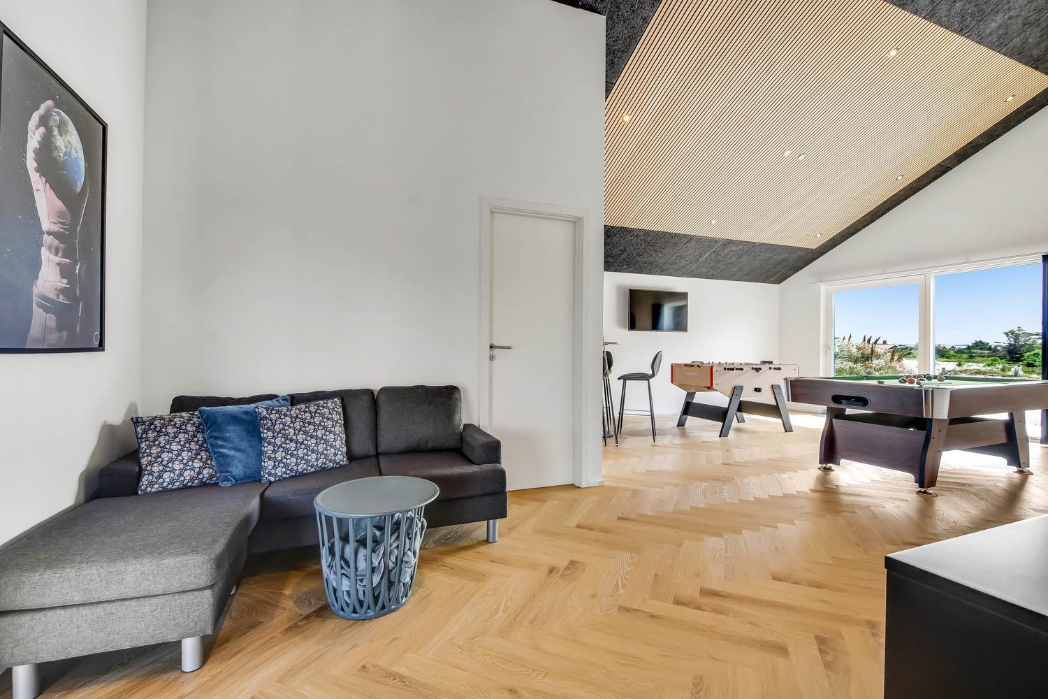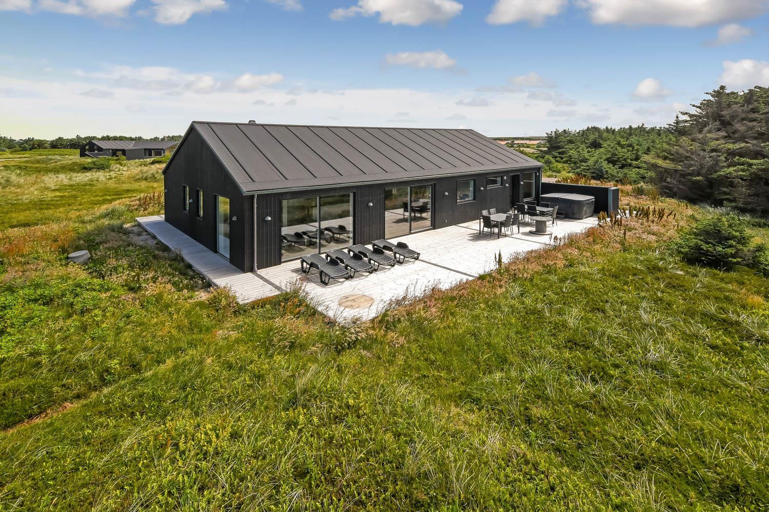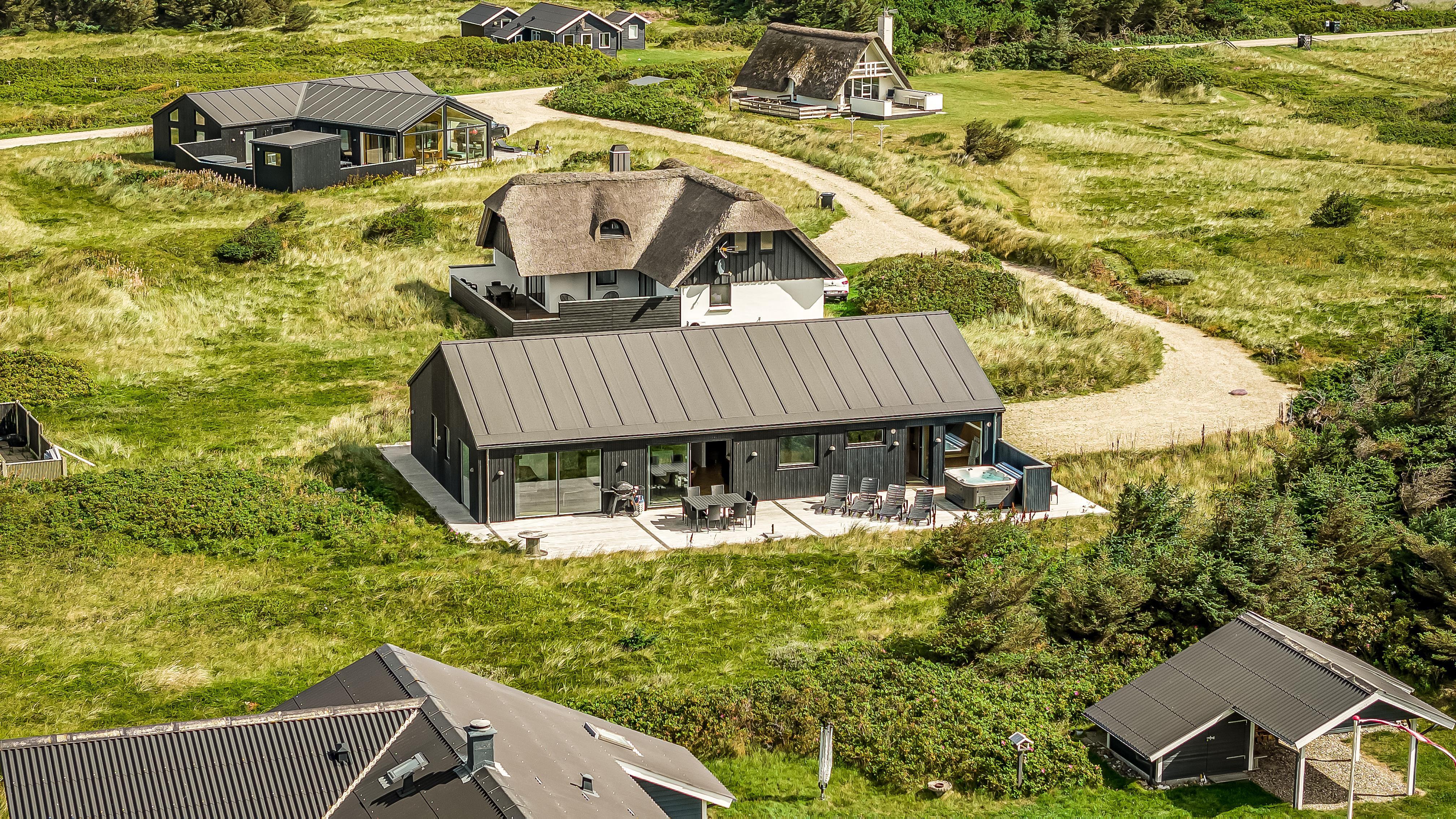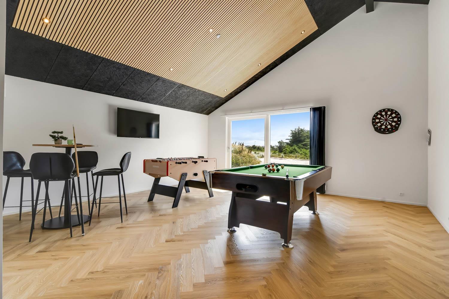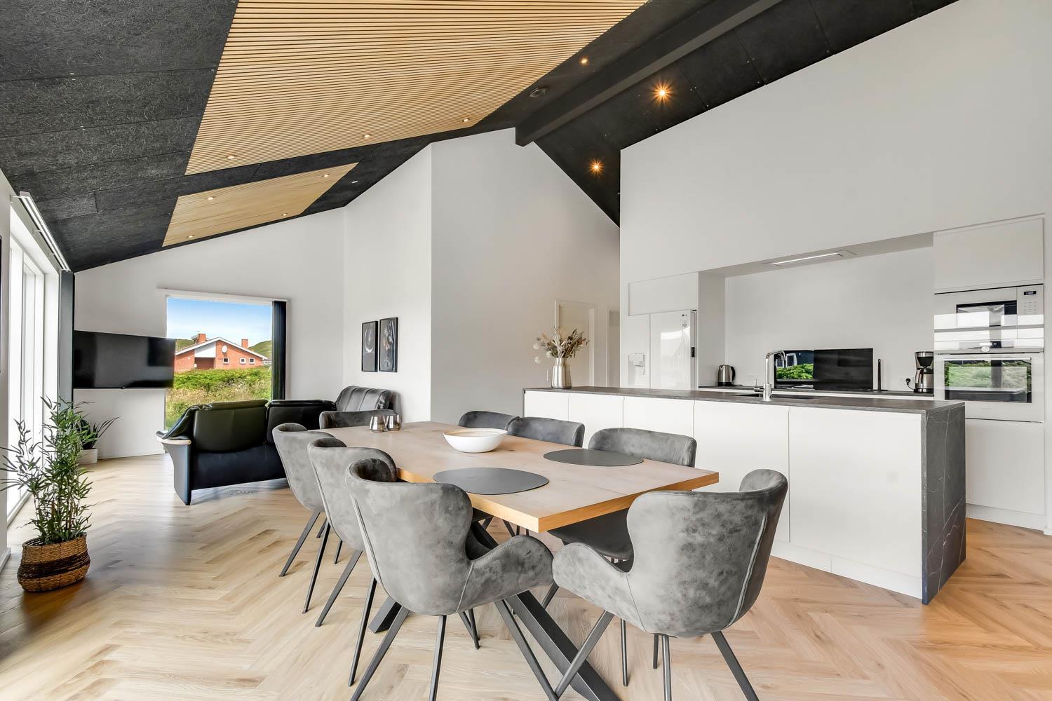 Schon wenn Sie den Kiesweg nur wenige Meter zum Haus begehen, merken Sie bereits, dass die Lage des Hauses ganz speziell ist. Das Haus liegt auf einem sehr für sich gelegenen Grundstück mit hoher Bepflanzung und am Ende einer geschlossenen Sackgasse. Das Haus ist 120 qm groß und hat 4 schöne Schlafräume: 1DB + 1DB + 1DB + 1DB – alle Zimmern sind mit Einzelbetten ausgestattet, die Sie nach Bedarf umstellen können. Im Herz des Hauses befindet sich eine große gut ausgestattete Küche/Wohnraum mit allem an Geschirr und Kochgeschirr. Die offene Küche hat z.B. einen Herd mit Cerankochfeld, einen eingebauten Ofen, große Abzugshaube, Geschirrspüler, Mikrowelle, Kühlschrank mit Gefrierfach, Weinkühler, Eiswürfelmaschine und vieles mehr. Genießen Sie Ihr zubereitetes Essen am Esstisch, der dicht an der Küche steht. Genießen Sie den tollen Blick zu den Dünen an der Nordsee. Entspannen Sie sich in den bequemen Qualitätsmöbeln. Schauen Sie auf einem der Smart-TV mit Soundbar, dänischen und deutschen TV-Programmen, Radio und Streaming-Diensten. Es gibt praktische Hartfußböden mit Fußbodenheizung im ganzen Haus, die auch sehr leicht zu reinigen sind. Schöne praktische Akustikpaneele sorgen für eine gedämpfte und angenehme Lautstärke für alle. Die Wellness-Abteilung hat z.B. einen Innenwhirlpool. Es gibt einen Ausgang zu der großen und wunderbaren Terrassenanlage, wo es auch einen Außenwhirlpool und eine Sauna gibt. Der separate Aktivitätsraum enthält: Tischfußball und Billard. Hier können Sie viele Stunden verbringen. 2 Badezimmer mit Doppel-Duschkabine in jedem Badezimmer, Toilette, Waschbecken und Fußbodenheizung. Waschmaschine und Trockner sind selbstverständlich. Eine Luft zu Wasser Wärmepumpe macht das Haus energiefreundlich und bewirkt auch einen günstigeren Energieverbrauch. Das Haus wird nicht an Jugendgruppen vermietet. Haben Sie ein Elektro-Auto oder Plug-in-Hybrid dann gibt es auch eine Ladebox für Typ 2 Ladestecker, die bis 11 kWh aufladen kann. Nichtraucher-Haus. Max. 1 Haustier ist erlaubt. Obligatorische Endreinigung