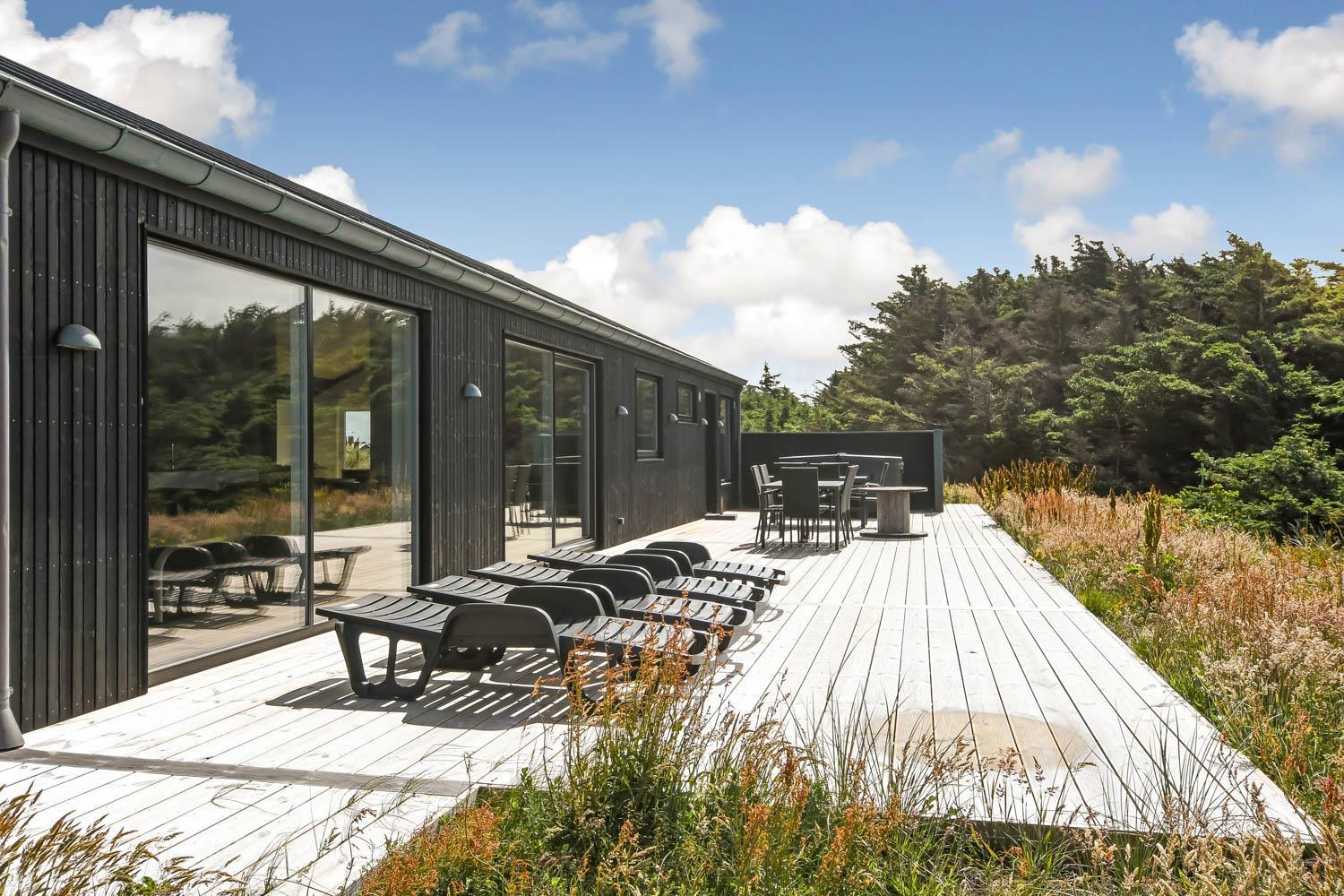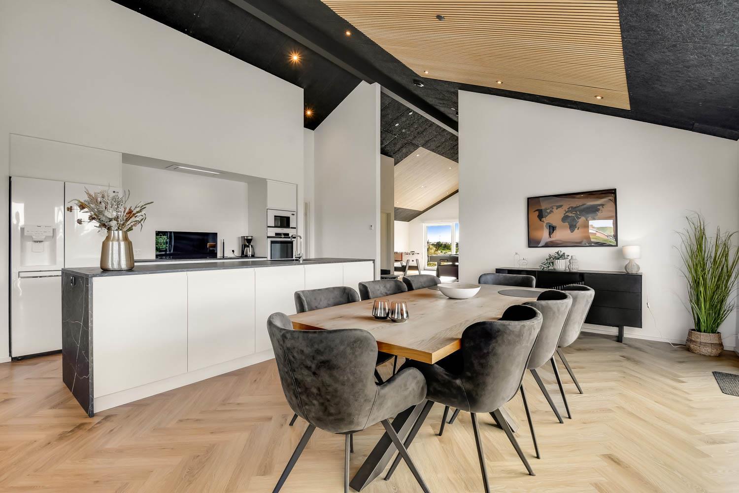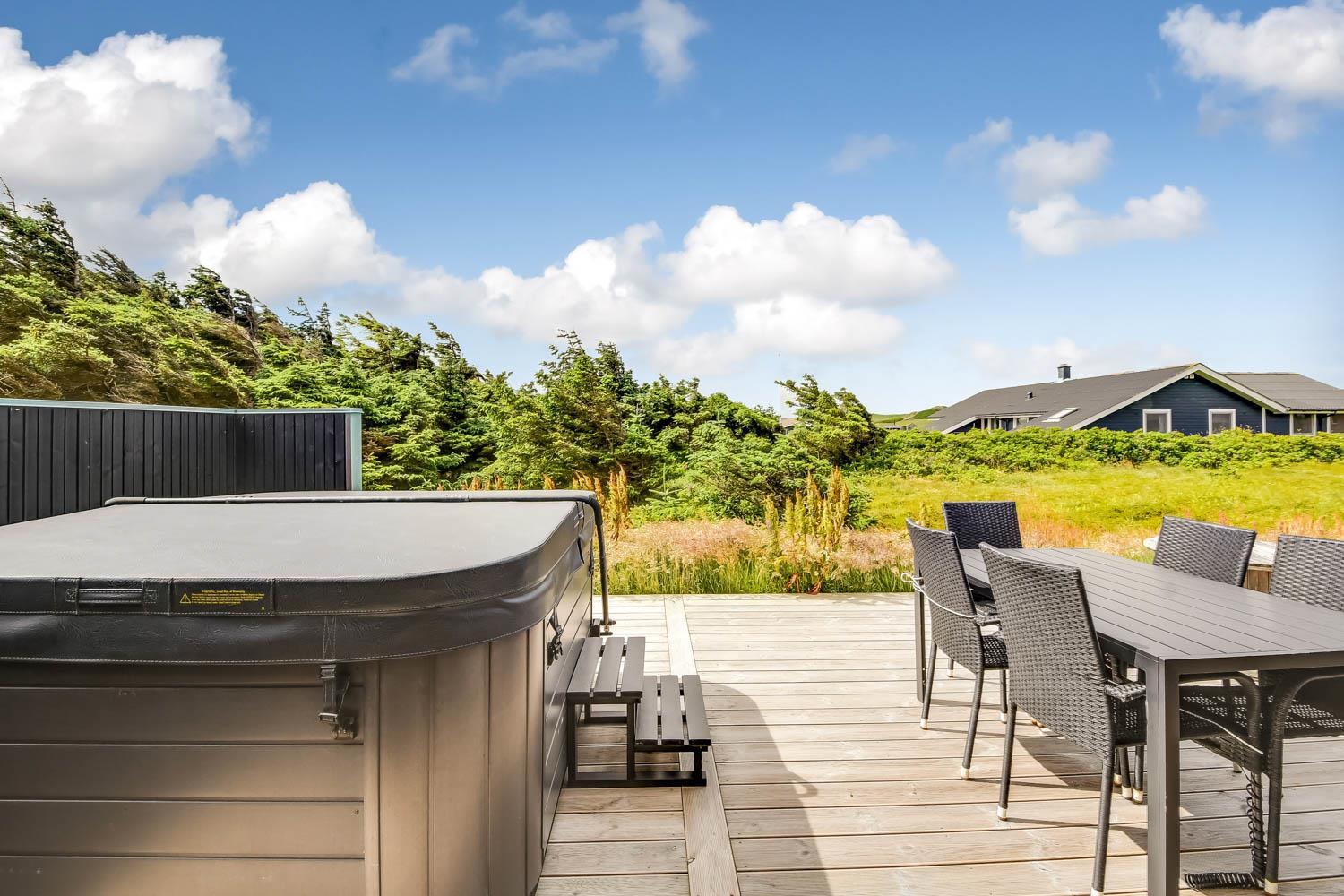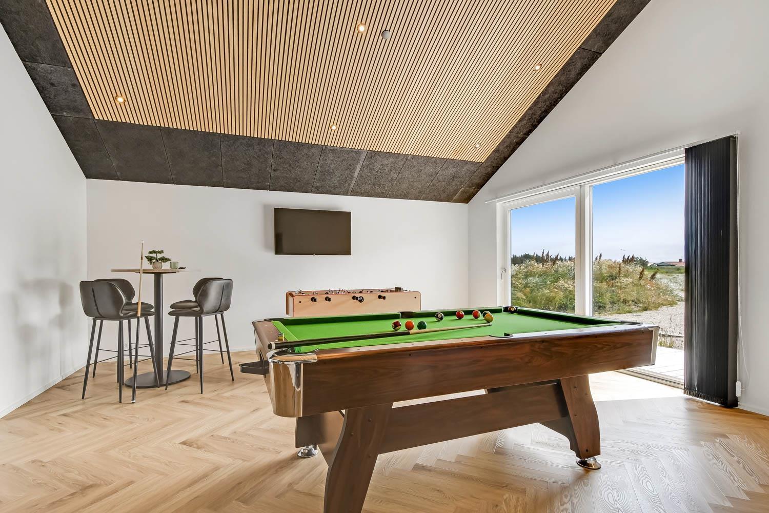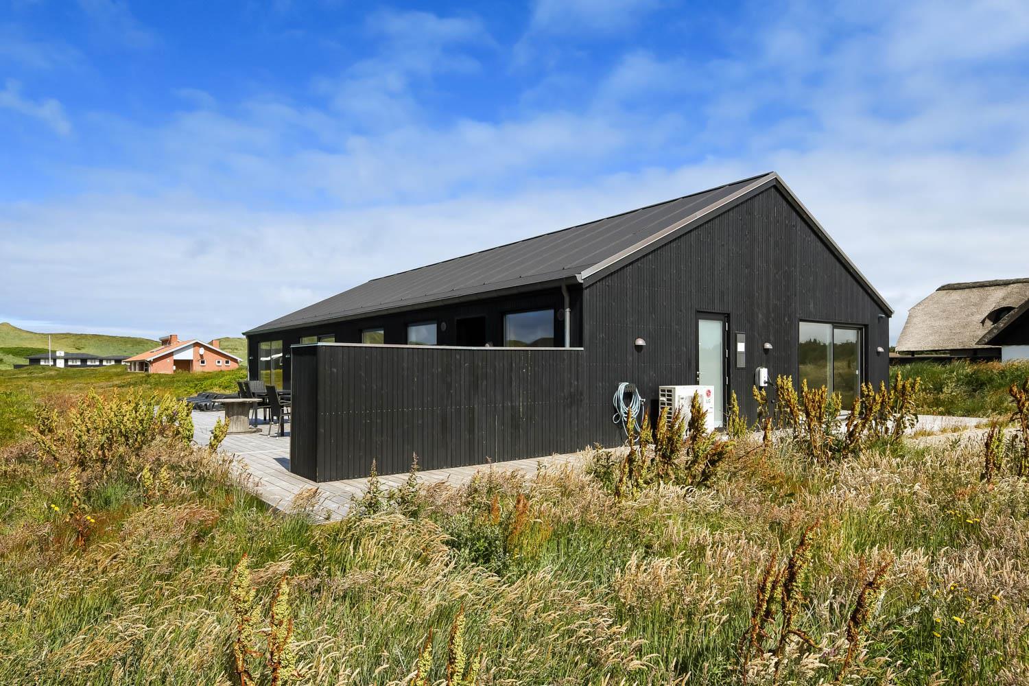 Schon wenn Sie den Kiesweg nur wenige Meter zum Haus begehen, merken Sie bereits, dass die Lage des Hauses ganz speziell ist. Das Haus liegt auf einem sehr für sich gelegenen Grundstück mit hoher Bepflanzung und am Ende einer geschlossenen Sackgasse. Das Haus ist 120 qm groß und hat 4 schöne Schlafräume: 1DB + 1DB + 1DB + 1DB – alle Zimmern sind mit Einzelbetten ausgestattet, die Sie nach Bedarf umstellen können. Im Herz des Hauses befindet sich eine große gut ausgestattete Küche/Wohnraum mit allem an Geschirr und Kochgeschirr. Die offene Küche hat z.B. einen Herd mit Cerankochfeld, einen eingebauten Ofen, große Abzugshaube, Geschirrspüler, Mikrowelle, Kühlschrank mit Gefrierfach, Weinkühler, Eiswürfelmaschine und vieles mehr. Genießen Sie Ihr zubereitetes Essen am Esstisch, der dicht an der Küche steht. Genießen Sie den tollen Blick zu den Dünen an der Nordsee. Entspannen Sie sich in den bequemen Qualitätsmöbeln. Schauen Sie auf einem der Smart-TV mit Soundbar, dänischen und deutschen TV-Programmen, Radio und Streaming-Diensten. Es gibt praktische Hartfußböden mit Fußbodenheizung im ganzen Haus, die auch sehr leicht zu reinigen sind. Schöne praktische Akustikpaneele sorgen für eine gedämpfte und angenehme Lautstärke für alle. Die Wellness-Abteilung hat z.B. einen Innenwhirlpool. Es gibt einen Ausgang zu der großen und wunderbaren Terrassenanlage, wo es auch einen Außenwhirlpool und eine Sauna gibt. Der separate Aktivitätsraum enthält: Tischfußball und Billard. Hier können Sie viele Stunden verbringen. 2 Badezimmer mit Doppel-Duschkabine in jedem Badezimmer, Toilette, Waschbecken und Fußbodenheizung. Waschmaschine und Trockner sind selbstverständlich. Eine Luft zu Wasser Wärmepumpe macht das Haus energiefreundlich und bewirkt auch einen günstigeren Energieverbrauch. Das Haus wird nicht an Jugendgruppen vermietet. Haben Sie ein Elektro-Auto oder Plug-in-Hybrid dann gibt es auch eine Ladebox für Typ 2 Ladestecker, die bis 11 kWh aufladen kann. Nichtraucher-Haus. Max. 1 Haustier ist erlaubt. Obligatorische Endreinigung