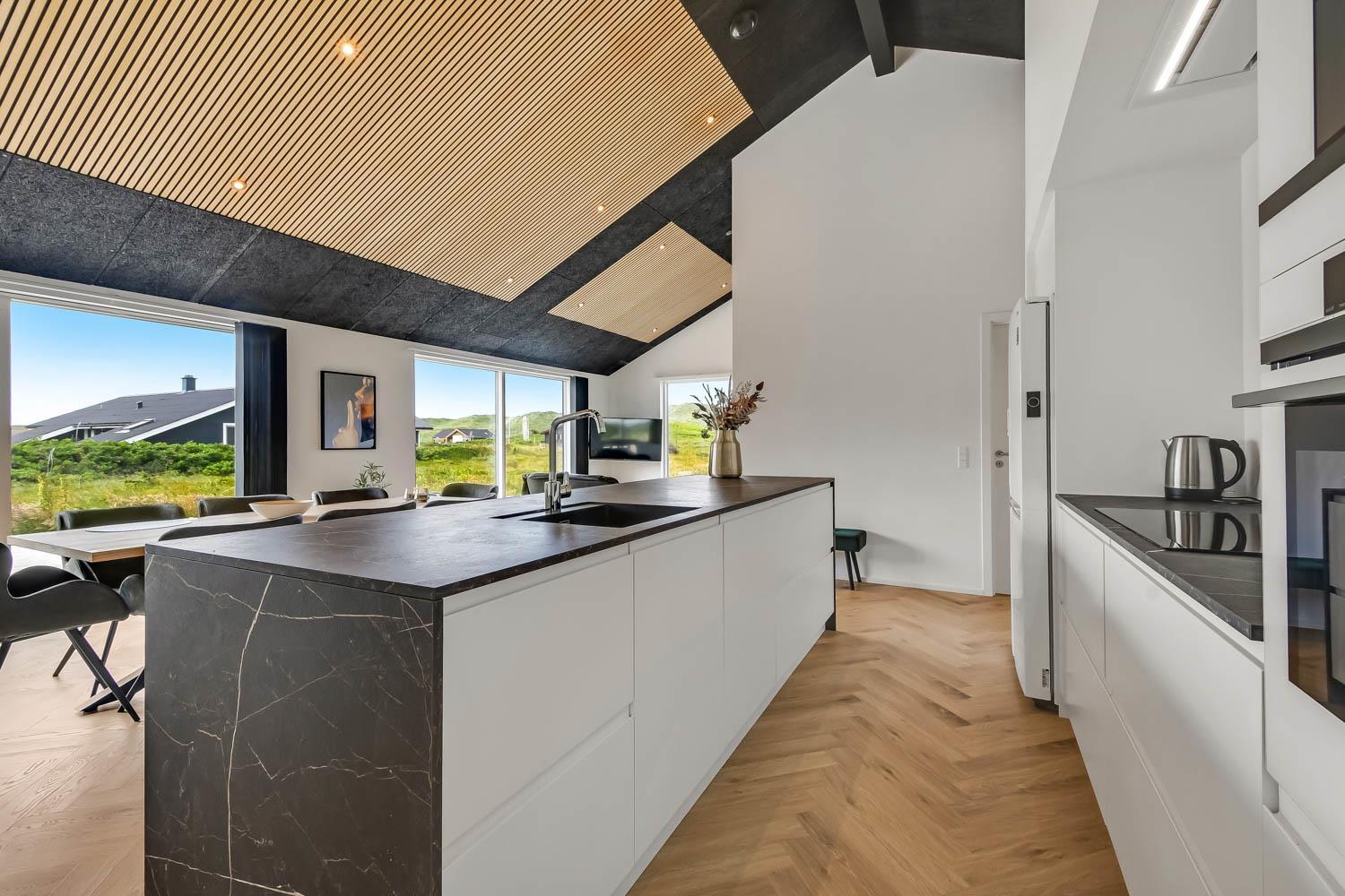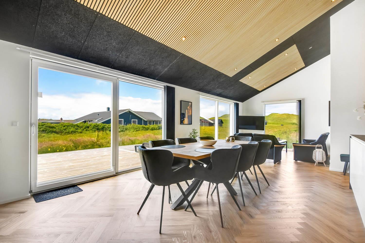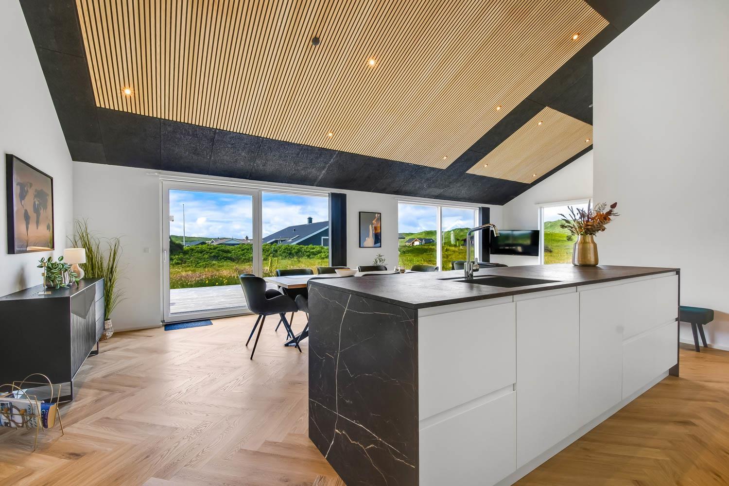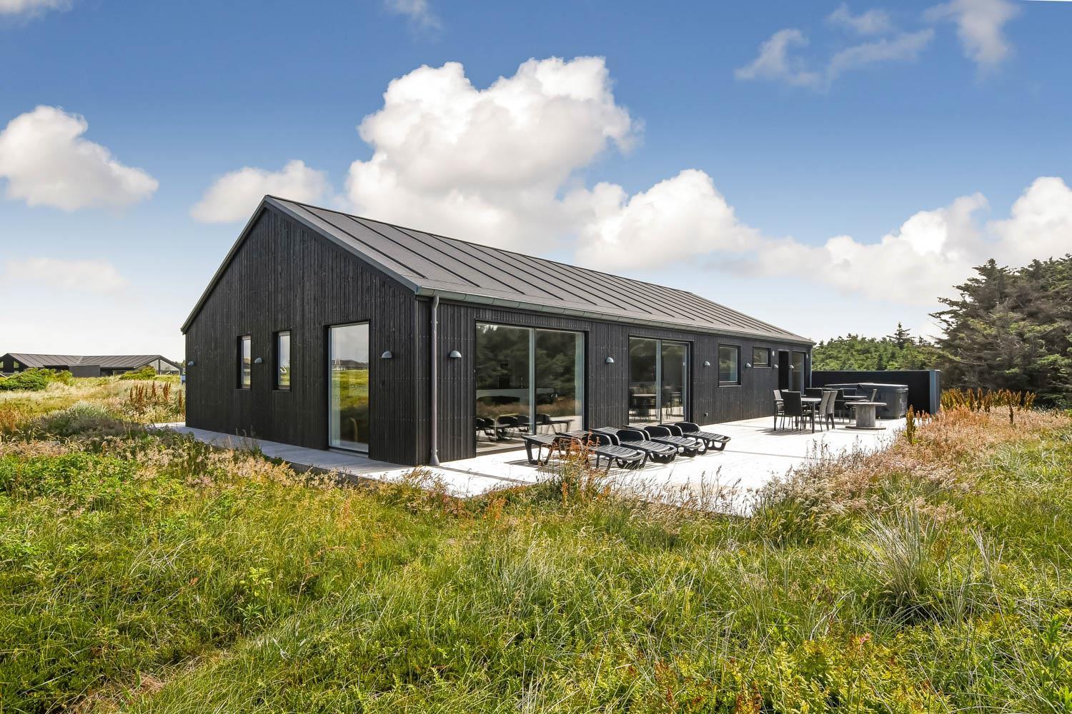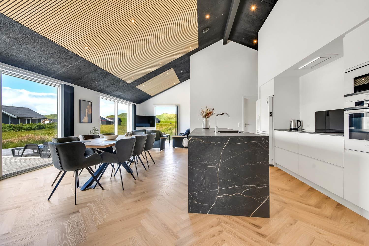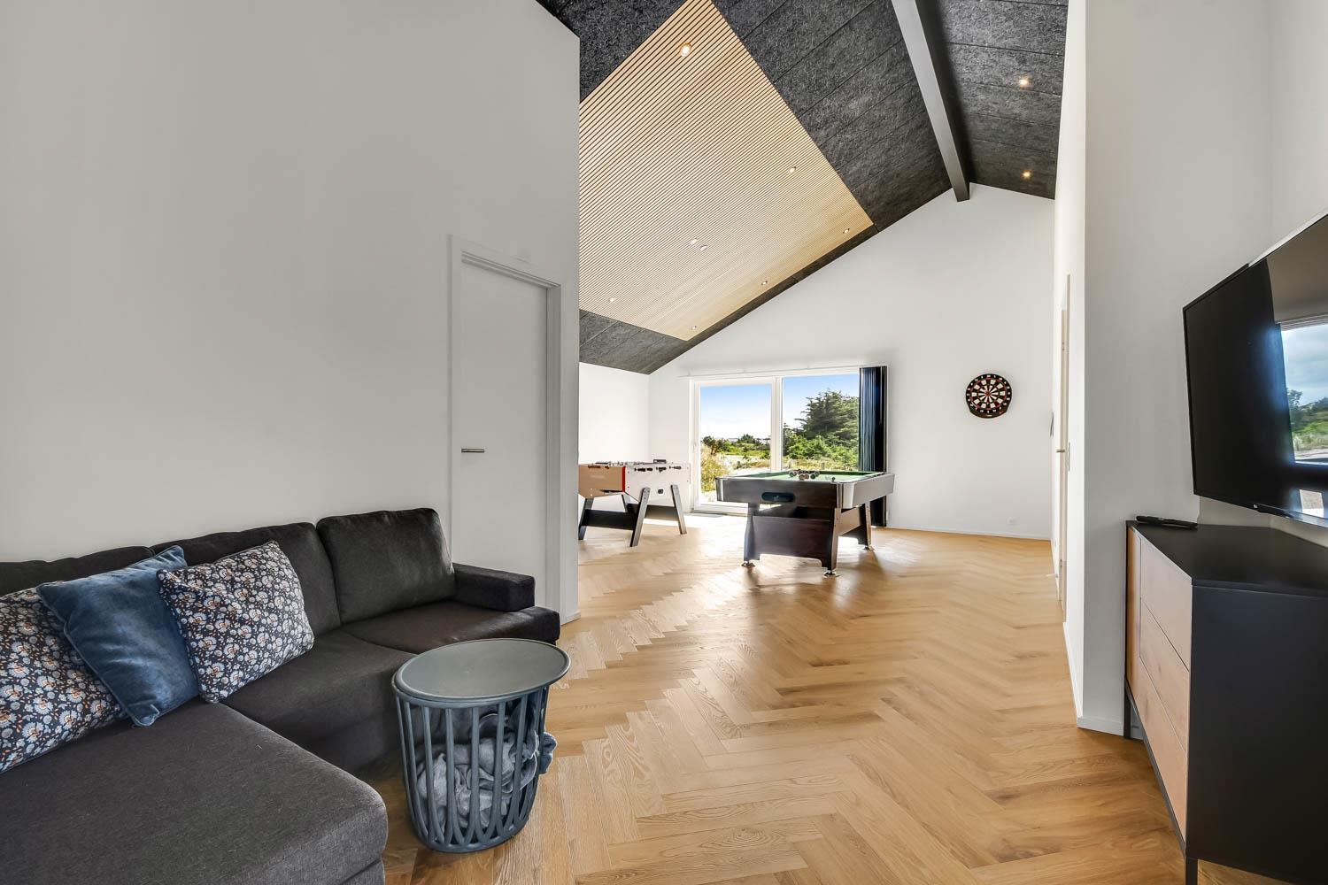 Schon wenn Sie den Kiesweg nur wenige Meter zum Haus begehen, merken Sie bereits, dass die Lage des Hauses ganz speziell ist. Das Haus liegt auf einem sehr für sich gelegenen Grundstück mit hoher Bepflanzung und am Ende einer geschlossenen Sackgasse. Das Haus ist 120 qm groß und hat 4 schöne Schlafräume: 1DB + 1DB + 1DB + 1DB – alle Zimmern sind mit Einzelbetten ausgestattet, die Sie nach Bedarf umstellen können. Im Herz des Hauses befindet sich eine große gut ausgestattete Küche/Wohnraum mit allem an Geschirr und Kochgeschirr. Die offene Küche hat z.B. einen Herd mit Cerankochfeld, einen eingebauten Ofen, große Abzugshaube, Geschirrspüler, Mikrowelle, Kühlschrank mit Gefrierfach, Weinkühler, Eiswürfelmaschine und vieles mehr. Genießen Sie Ihr zubereitetes Essen am Esstisch, der dicht an der Küche steht. Genießen Sie den tollen Blick zu den Dünen an der Nordsee. Entspannen Sie sich in den bequemen Qualitätsmöbeln. Schauen Sie auf einem der Smart-TV mit Soundbar, dänischen und deutschen TV-Programmen, Radio und Streaming-Diensten. Es gibt praktische Hartfußböden mit Fußbodenheizung im ganzen Haus, die auch sehr leicht zu reinigen sind. Schöne praktische Akustikpaneele sorgen für eine gedämpfte und angenehme Lautstärke für alle. Die Wellness-Abteilung hat z.B. einen Innenwhirlpool. Es gibt einen Ausgang zu der großen und wunderbaren Terrassenanlage, wo es auch einen Außenwhirlpool und eine Sauna gibt. Der separate Aktivitätsraum enthält: Tischfußball und Billard. Hier können Sie viele Stunden verbringen. 2 Badezimmer mit Doppel-Duschkabine in jedem Badezimmer, Toilette, Waschbecken und Fußbodenheizung. Waschmaschine und Trockner sind selbstverständlich. Eine Luft zu Wasser Wärmepumpe macht das Haus energiefreundlich und bewirkt auch einen günstigeren Energieverbrauch. Das Haus wird nicht an Jugendgruppen vermietet. Haben Sie ein Elektro-Auto oder Plug-in-Hybrid dann gibt es auch eine Ladebox für Typ 2 Ladestecker, die bis 11 kWh aufladen kann. Nichtraucher-Haus. Max. 1 Haustier ist erlaubt. Obligatorische Endreinigung