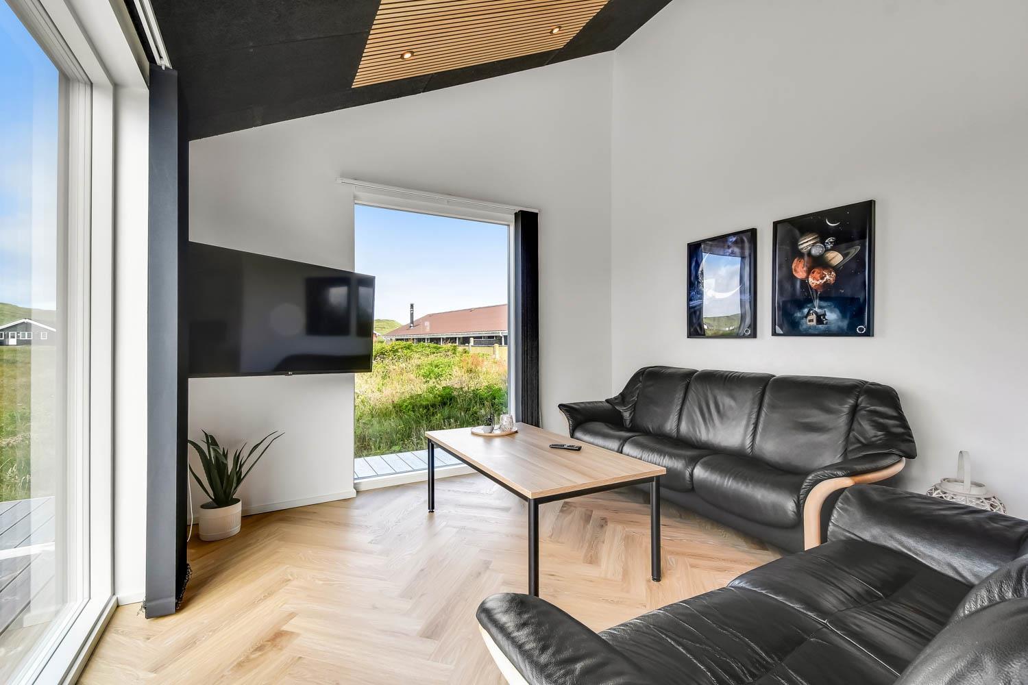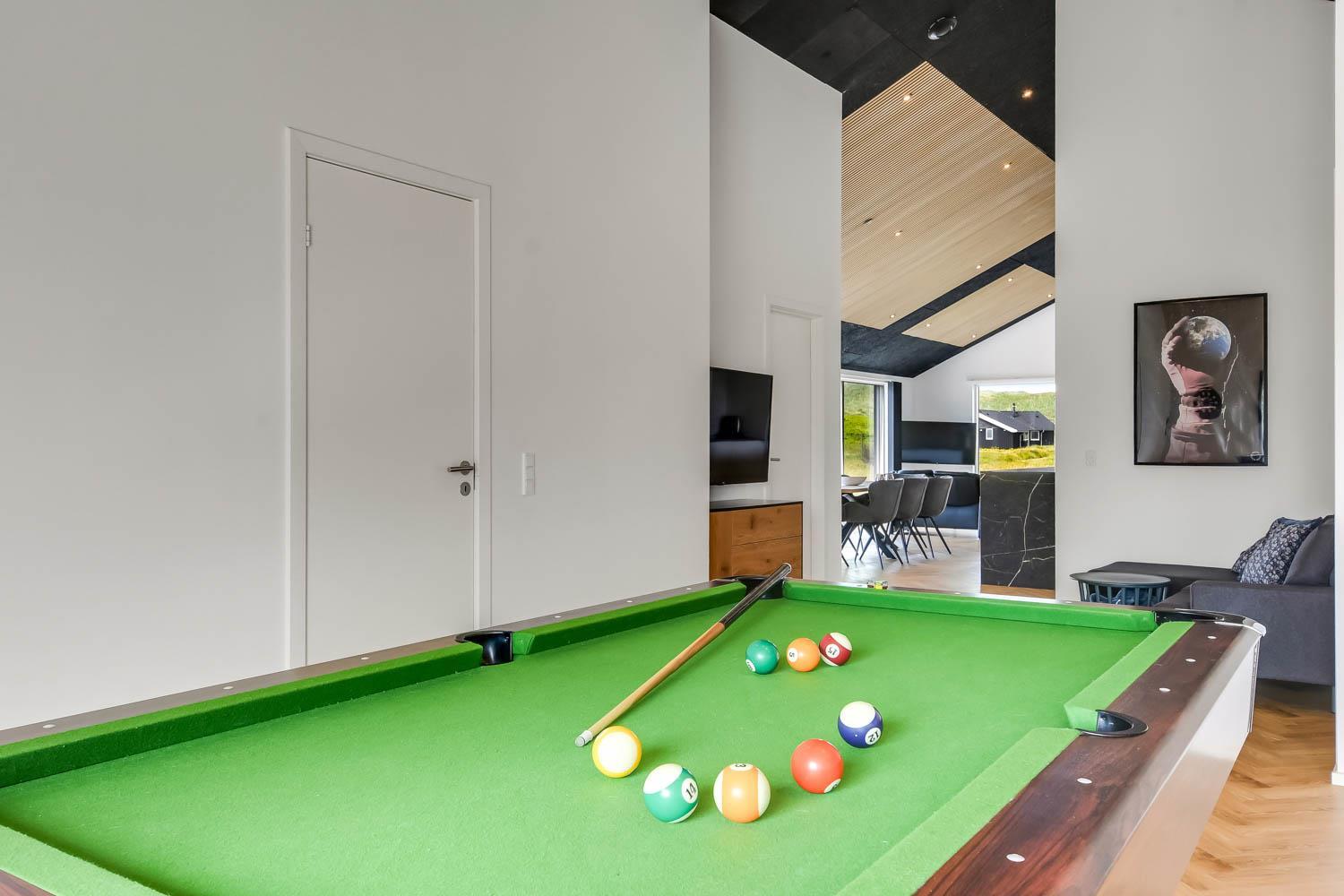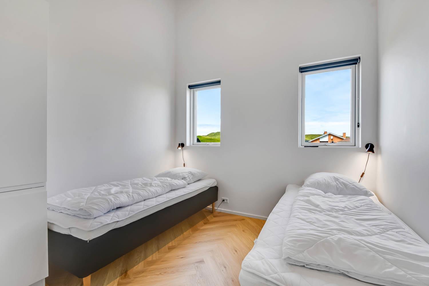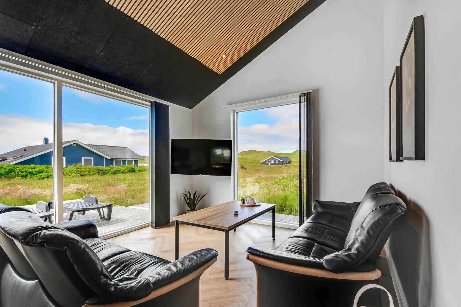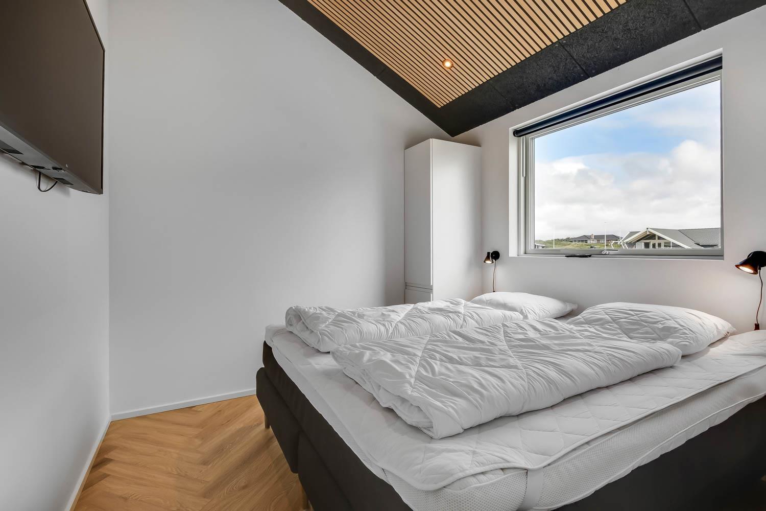 Schon wenn Sie den Kiesweg nur wenige Meter zum Haus begehen, merken Sie bereits, dass die Lage des Hauses ganz speziell ist. Das Haus liegt auf einem sehr für sich gelegenen Grundstück mit hoher Bepflanzung und am Ende einer geschlossenen Sackgasse. Das Haus ist 120 qm groß und hat 4 schöne Schlafräume: 1DB + 1DB + 1DB + 1DB – alle Zimmern sind mit Einzelbetten ausgestattet, die Sie nach Bedarf umstellen können. Im Herz des Hauses befindet sich eine große gut ausgestattete Küche/Wohnraum mit allem an Geschirr und Kochgeschirr. Die offene Küche hat z.B. einen Herd mit Cerankochfeld, einen eingebauten Ofen, große Abzugshaube, Geschirrspüler, Mikrowelle, Kühlschrank mit Gefrierfach, Weinkühler, Eiswürfelmaschine und vieles mehr. Genießen Sie Ihr zubereitetes Essen am Esstisch, der dicht an der Küche steht. Genießen Sie den tollen Blick zu den Dünen an der Nordsee. Entspannen Sie sich in den bequemen Qualitätsmöbeln. Schauen Sie auf einem der Smart-TV mit Soundbar, dänischen und deutschen TV-Programmen, Radio und Streaming-Diensten. Es gibt praktische Hartfußböden mit Fußbodenheizung im ganzen Haus, die auch sehr leicht zu reinigen sind. Schöne praktische Akustikpaneele sorgen für eine gedämpfte und angenehme Lautstärke für alle. Die Wellness-Abteilung hat z.B. einen Innenwhirlpool. Es gibt einen Ausgang zu der großen und wunderbaren Terrassenanlage, wo es auch einen Außenwhirlpool und eine Sauna gibt. Der separate Aktivitätsraum enthält: Tischfußball und Billard. Hier können Sie viele Stunden verbringen. 2 Badezimmer mit Doppel-Duschkabine in jedem Badezimmer, Toilette, Waschbecken und Fußbodenheizung. Waschmaschine und Trockner sind selbstverständlich. Eine Luft zu Wasser Wärmepumpe macht das Haus energiefreundlich und bewirkt auch einen günstigeren Energieverbrauch. Das Haus wird nicht an Jugendgruppen vermietet. Haben Sie ein Elektro-Auto oder Plug-in-Hybrid dann gibt es auch eine Ladebox für Typ 2 Ladestecker, die bis 11 kWh aufladen kann. Nichtraucher-Haus. Max. 1 Haustier ist erlaubt. Obligatorische Endreinigung