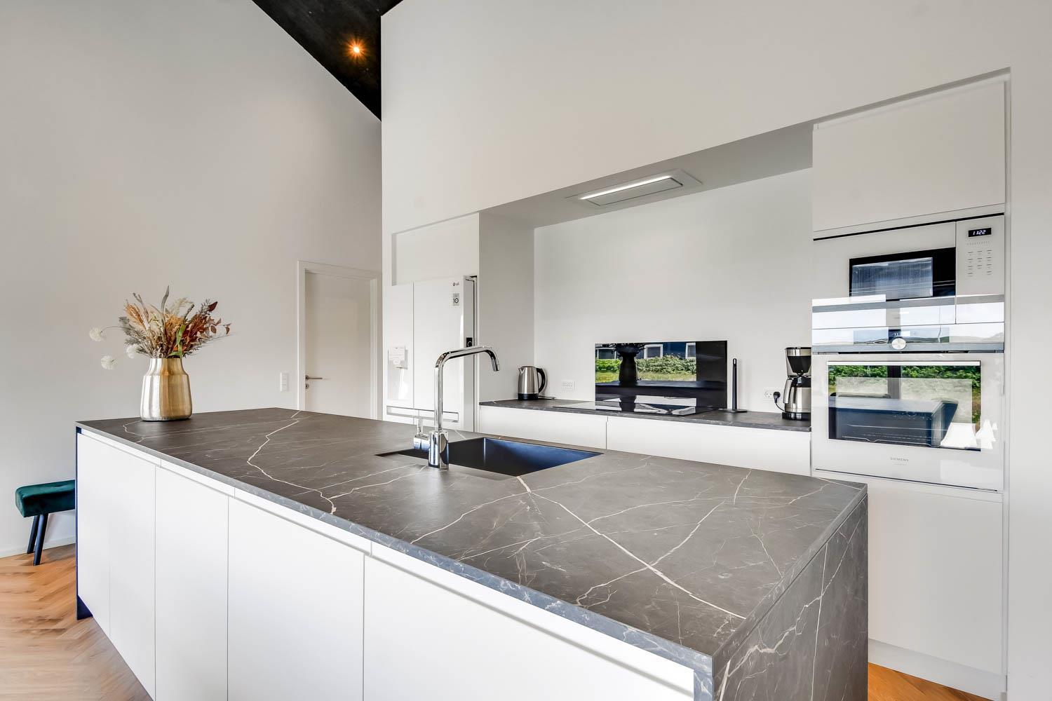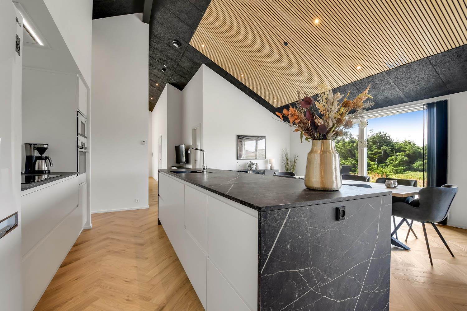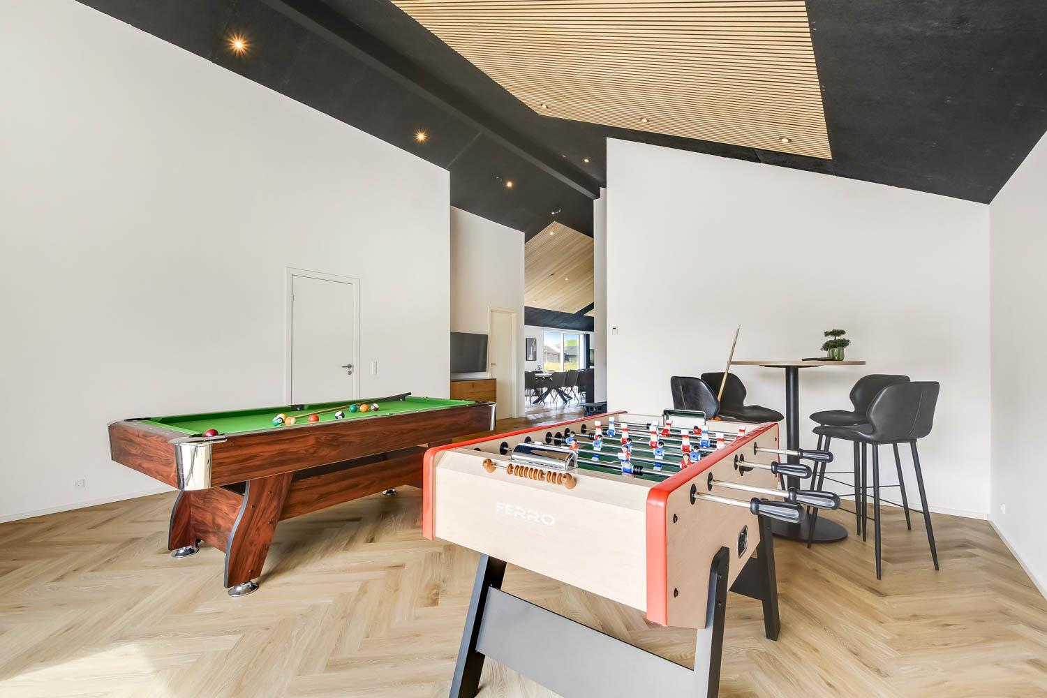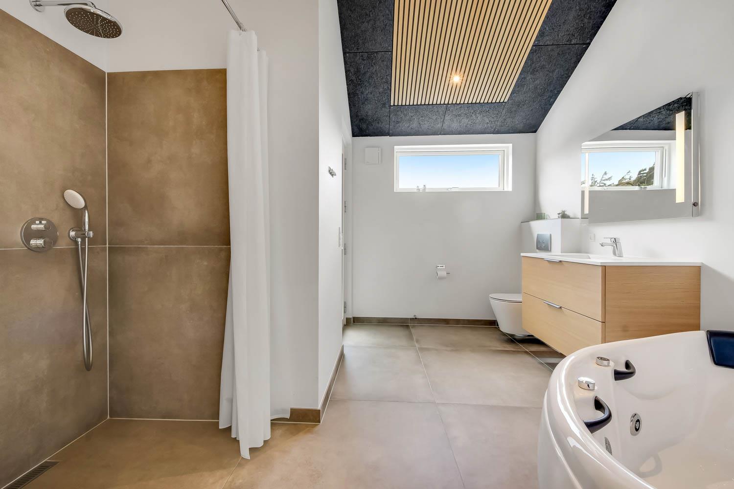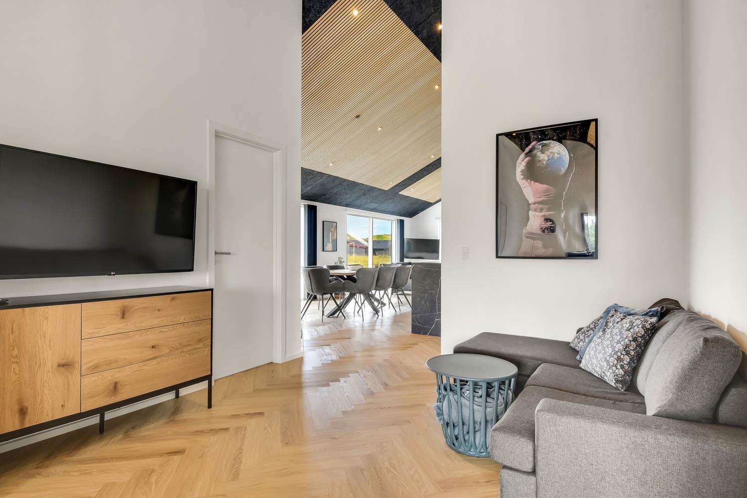 Schon wenn Sie den Kiesweg nur wenige Meter zum Haus begehen, merken Sie bereits, dass die Lage des Hauses ganz speziell ist. Das Haus liegt auf einem sehr für sich gelegenen Grundstück mit hoher Bepflanzung und am Ende einer geschlossenen Sackgasse. Das Haus ist 120 qm groß und hat 4 schöne Schlafräume: 1DB + 1DB + 1DB + 1DB – alle Zimmern sind mit Einzelbetten ausgestattet, die Sie nach Bedarf umstellen können. Im Herz des Hauses befindet sich eine große gut ausgestattete Küche/Wohnraum mit allem an Geschirr und Kochgeschirr. Die offene Küche hat z.B. einen Herd mit Cerankochfeld, einen eingebauten Ofen, große Abzugshaube, Geschirrspüler, Mikrowelle, Kühlschrank mit Gefrierfach, Weinkühler, Eiswürfelmaschine und vieles mehr. Genießen Sie Ihr zubereitetes Essen am Esstisch, der dicht an der Küche steht. Genießen Sie den tollen Blick zu den Dünen an der Nordsee. Entspannen Sie sich in den bequemen Qualitätsmöbeln. Schauen Sie auf einem der Smart-TV mit Soundbar, dänischen und deutschen TV-Programmen, Radio und Streaming-Diensten. Es gibt praktische Hartfußböden mit Fußbodenheizung im ganzen Haus, die auch sehr leicht zu reinigen sind. Schöne praktische Akustikpaneele sorgen für eine gedämpfte und angenehme Lautstärke für alle. Die Wellness-Abteilung hat z.B. einen Innenwhirlpool. Es gibt einen Ausgang zu der großen und wunderbaren Terrassenanlage, wo es auch einen Außenwhirlpool und eine Sauna gibt. Der separate Aktivitätsraum enthält: Tischfußball und Billard. Hier können Sie viele Stunden verbringen. 2 Badezimmer mit Doppel-Duschkabine in jedem Badezimmer, Toilette, Waschbecken und Fußbodenheizung. Waschmaschine und Trockner sind selbstverständlich. Eine Luft zu Wasser Wärmepumpe macht das Haus energiefreundlich und bewirkt auch einen günstigeren Energieverbrauch. Das Haus wird nicht an Jugendgruppen vermietet. Haben Sie ein Elektro-Auto oder Plug-in-Hybrid dann gibt es auch eine Ladebox für Typ 2 Ladestecker, die bis 11 kWh aufladen kann. Nichtraucher-Haus. Max. 1 Haustier ist erlaubt. Obligatorische Endreinigung