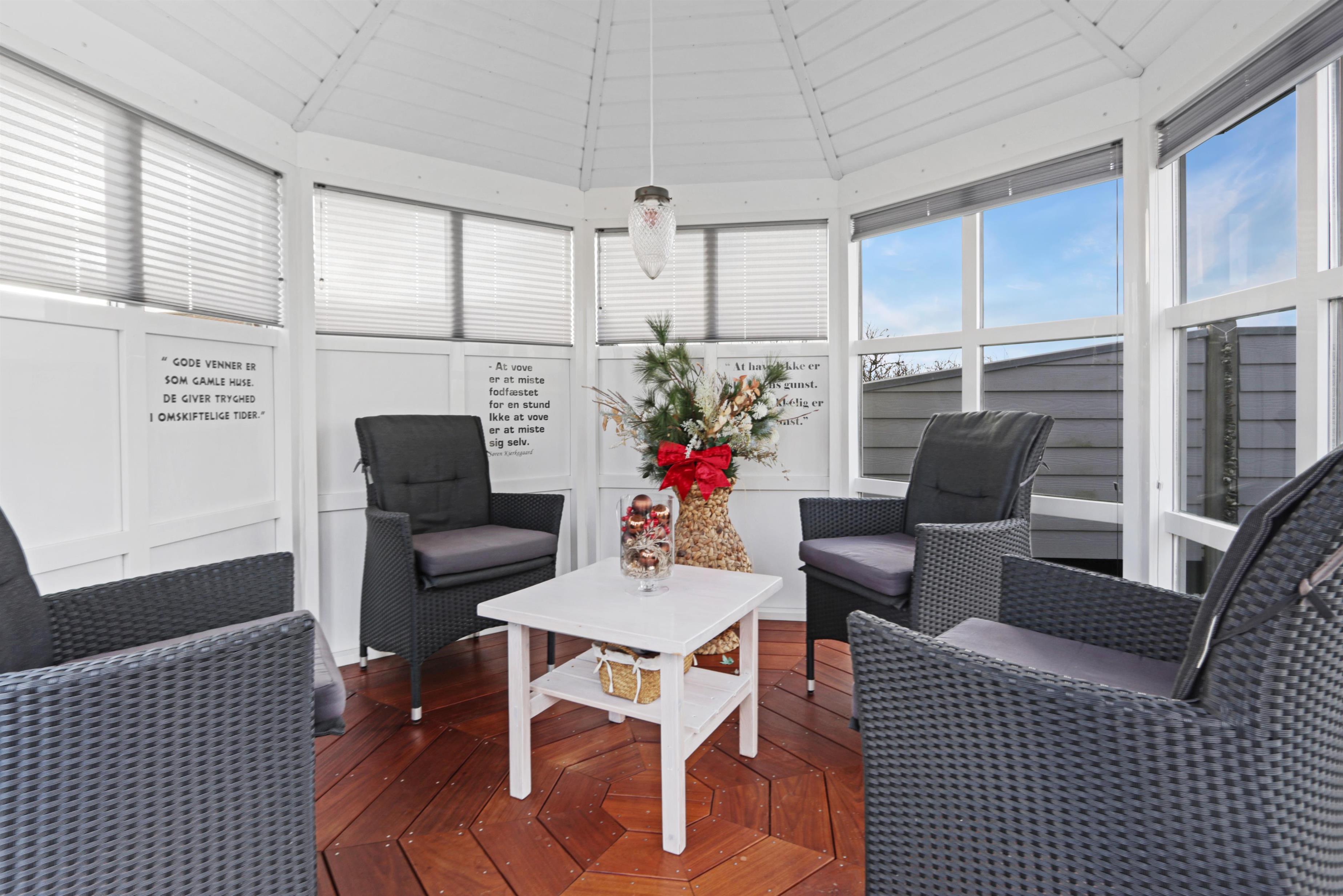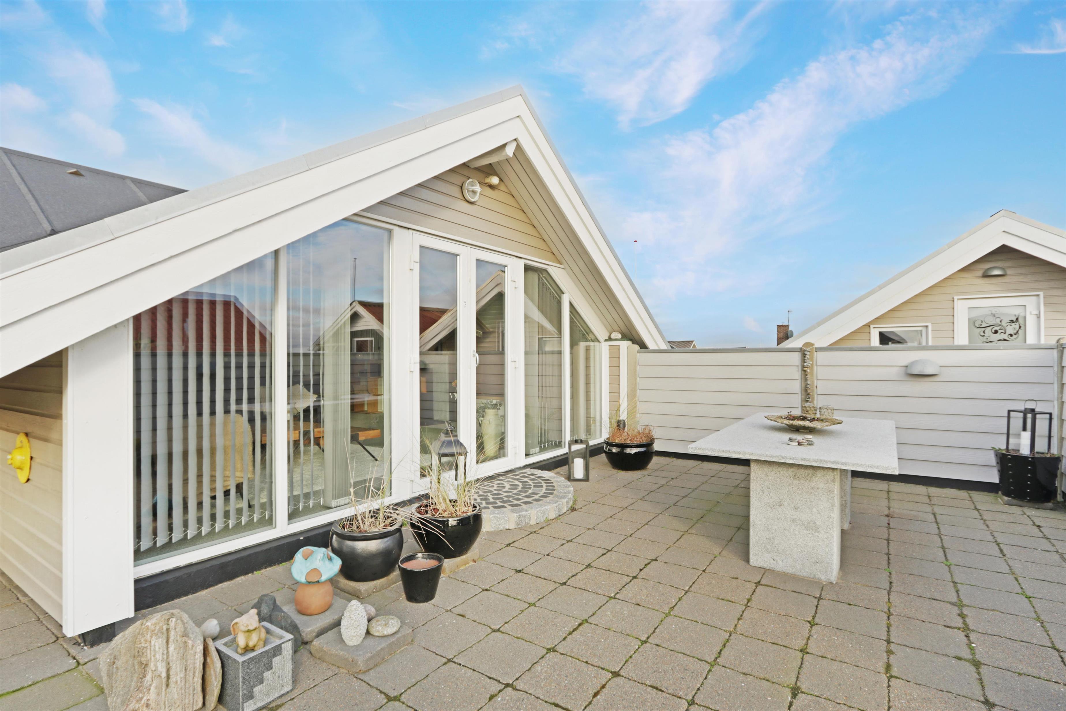 Das Haus liegt auf einem der absolut besten Grundstücke der Gegend. Schöne, nach Süden ausgerichtete, teilweise überdachte und eingezäunte Terrasse mit neuen Gartenmöbeln, Gasgrill und Sonnenliegen. Von hier aus genießt man ungestört einen herrlichen Blick auf den Ferring See, die hohen Dünen und die Umgebung insgesamt. Auf der Terrasse befindet sich außerdem ein schönes Orangerie-Gewächshaus mit Gartentisch und komfortablen, verstellbaren Stühlen.