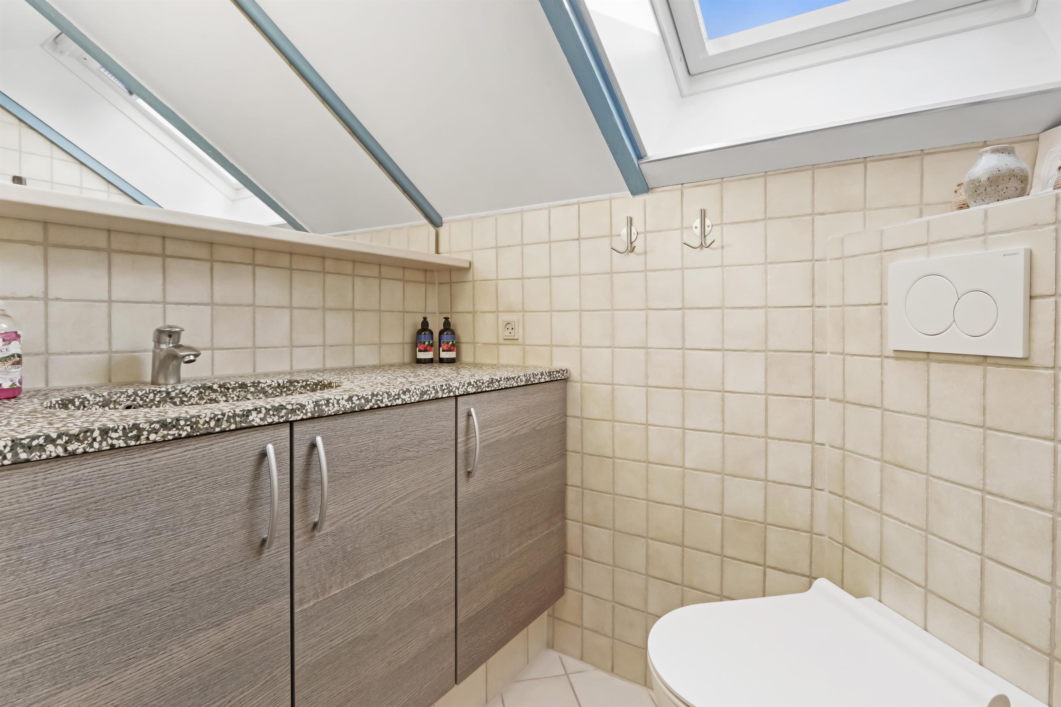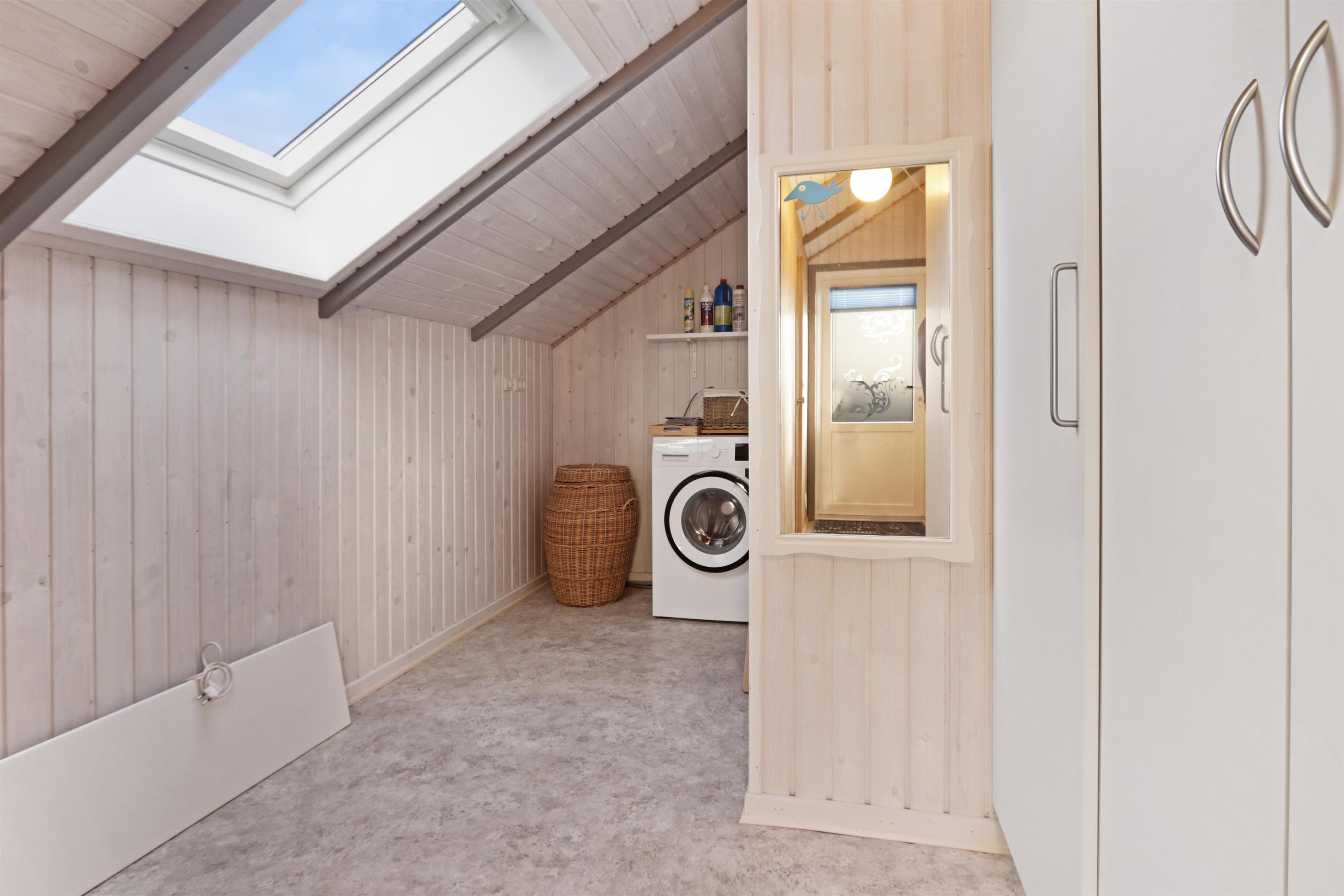 Modernes, kleineres Badezimmer mit WC, Dusche, Waschbecken und Fliesenboden mit Fußbodenheizung. Großer Hauswirtschaftsraum mit separatem Eingang. Hier befinden sich eine neue, hochwertige Sauna sowie Waschmaschine, Wäschetrockner, zusätzliche Arbeitsfläche und viel Platz für Koffer und Ähnliches.