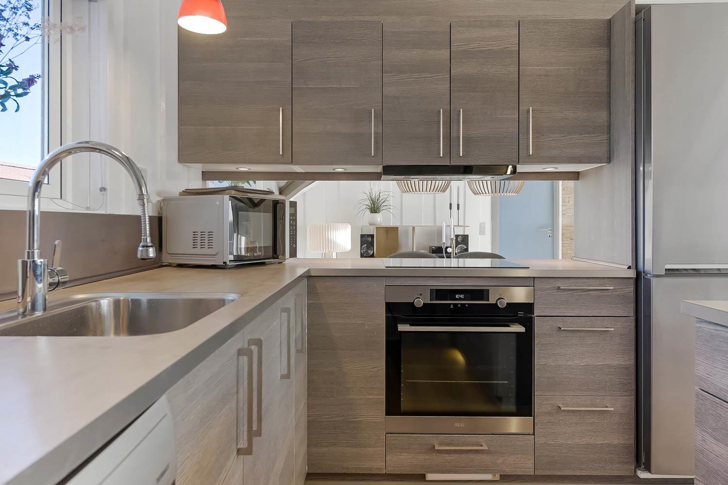 Die schöne Küche ist bestens ausgestattet mit Heißluftofen, keramischen Induktionskochfeldern, Dunstabzugshaube, Geschirrspüler, Mikrowelle sowie Kühlschrank mit Gefrierfach. Angrenzend an die offene Küche befindet sich eine gemütliche Essecke mit Radio und CD-Player.