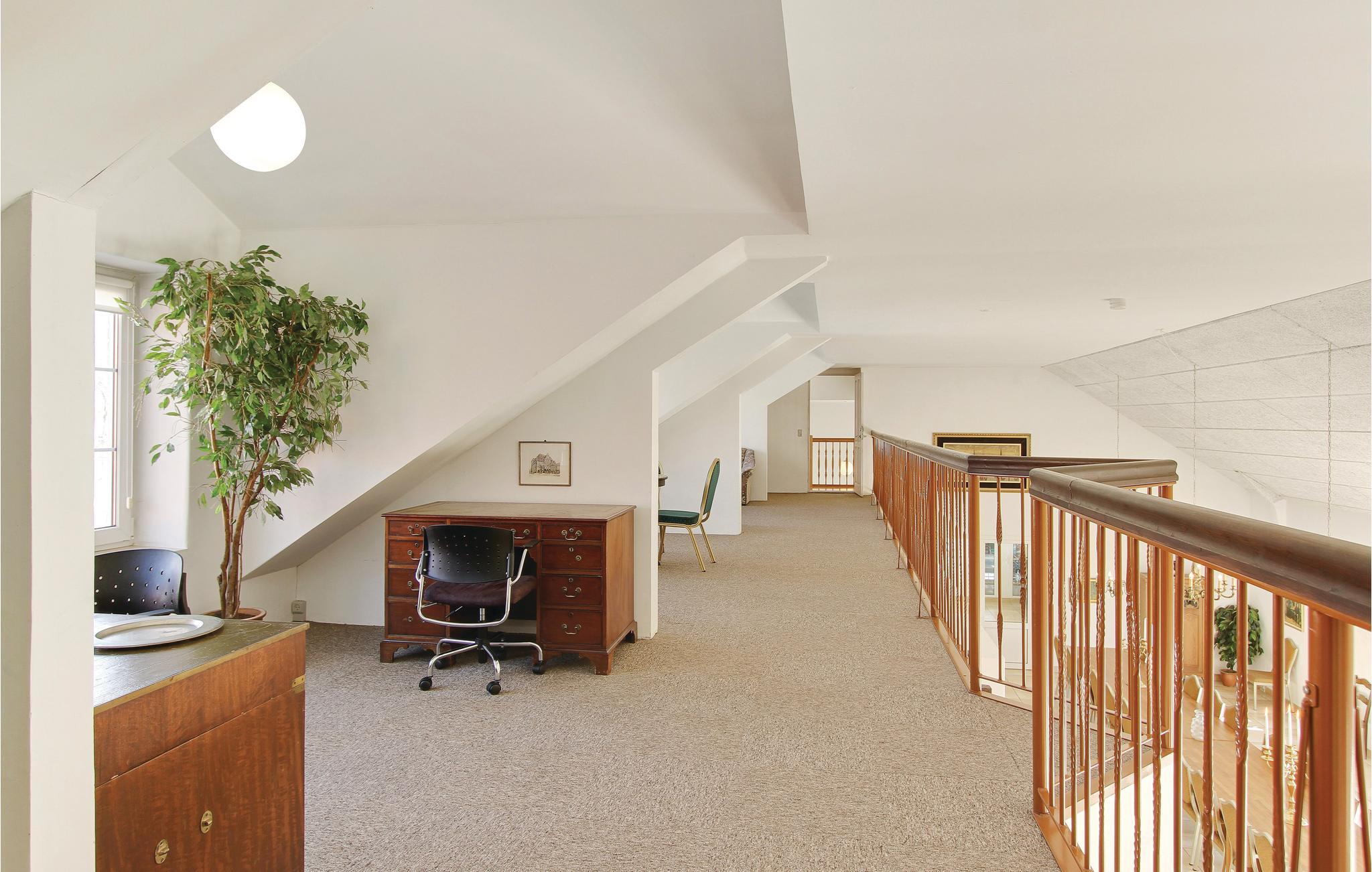 Alle Räumlichkeiten des Hauses, mit der Ausnahme von einem, befinden sich auf der gleichen Ebene. Der eine Aufenthaltsraum befindet sich über dem Koch- und Speisebereich, wo eine Decke eingezogen wurde, und ein Zimmer mit einer bis unter den First offenen Decke.
