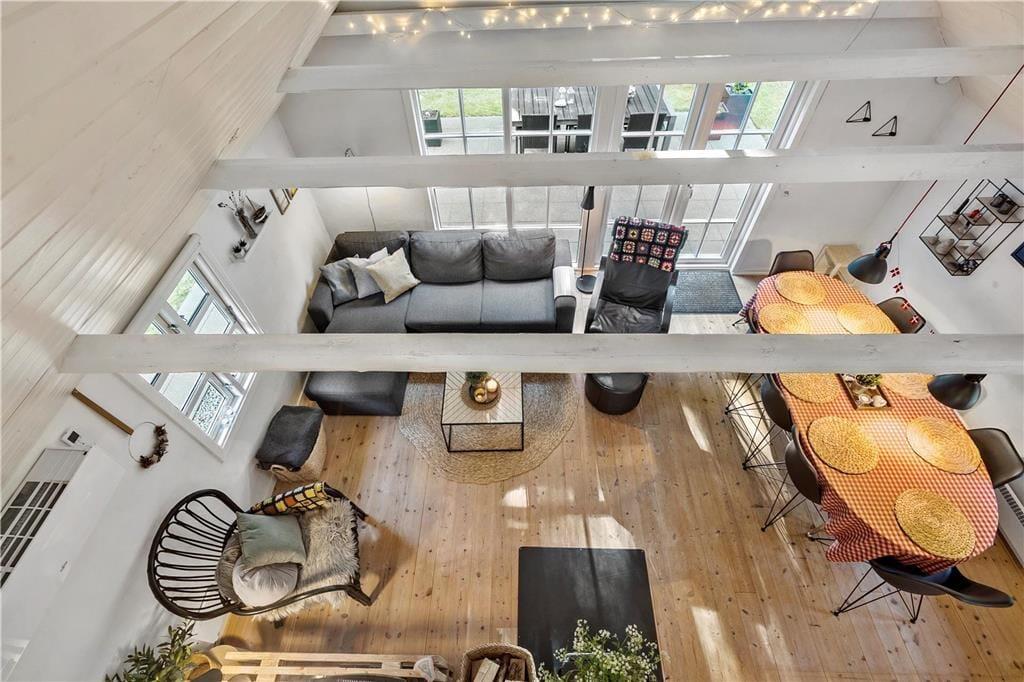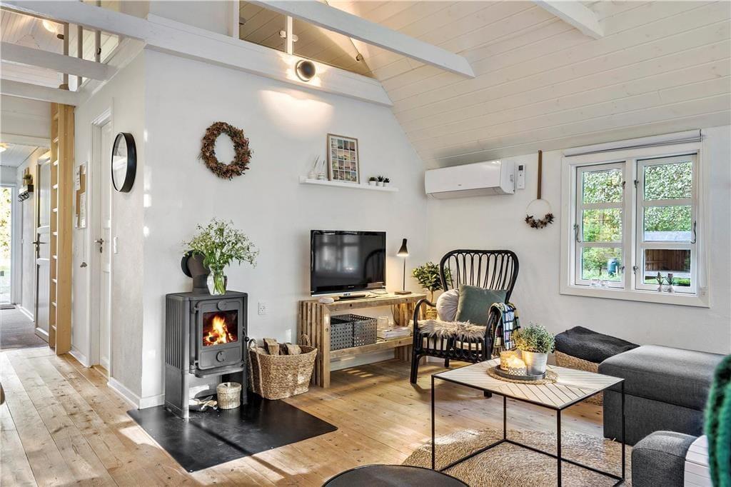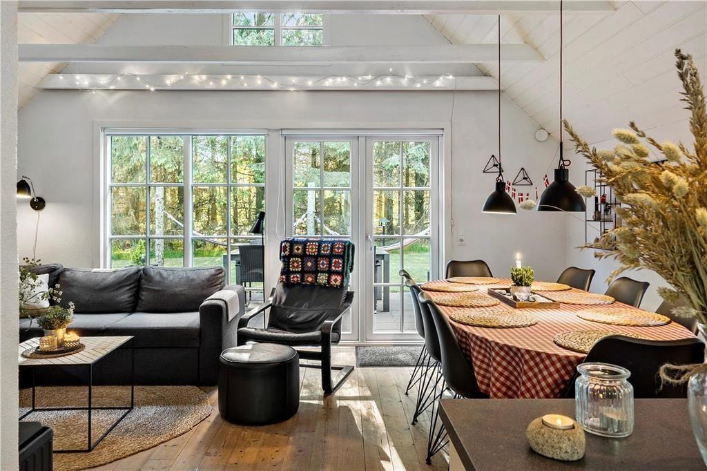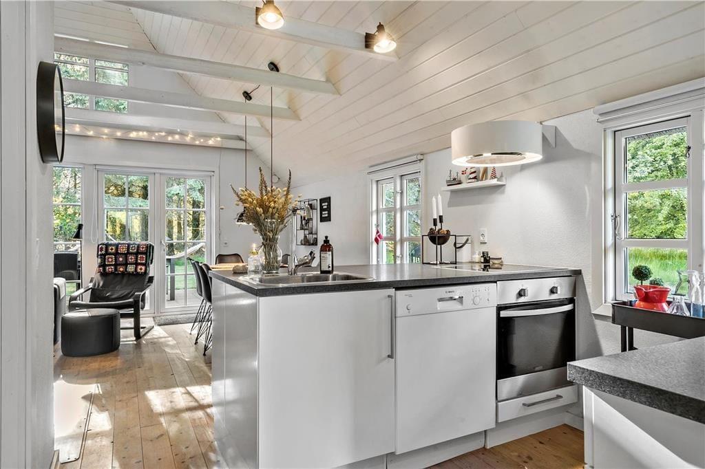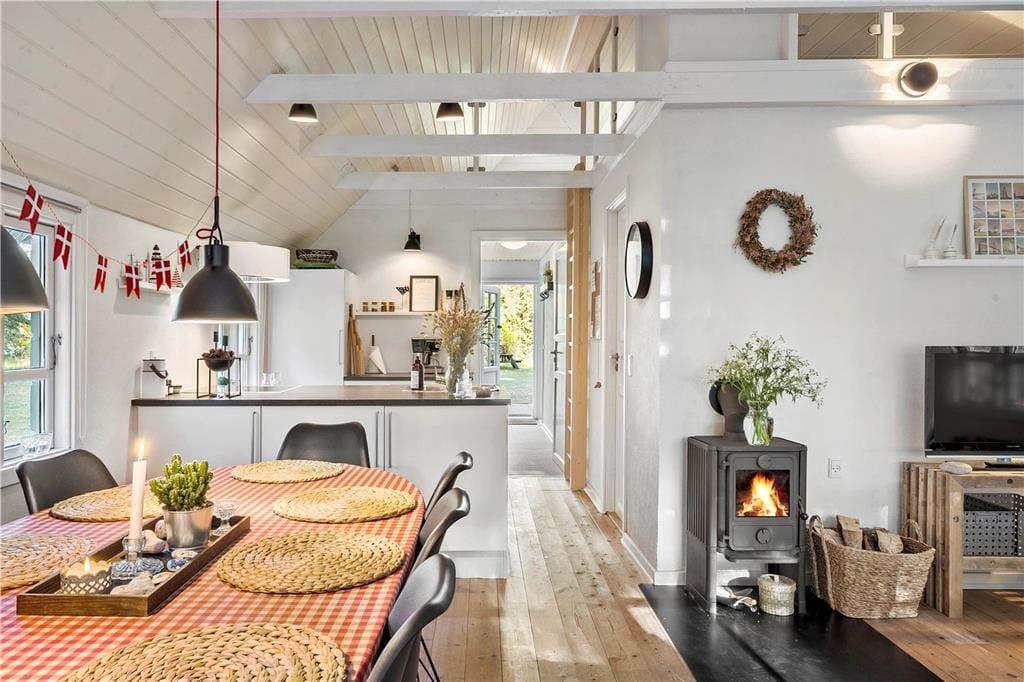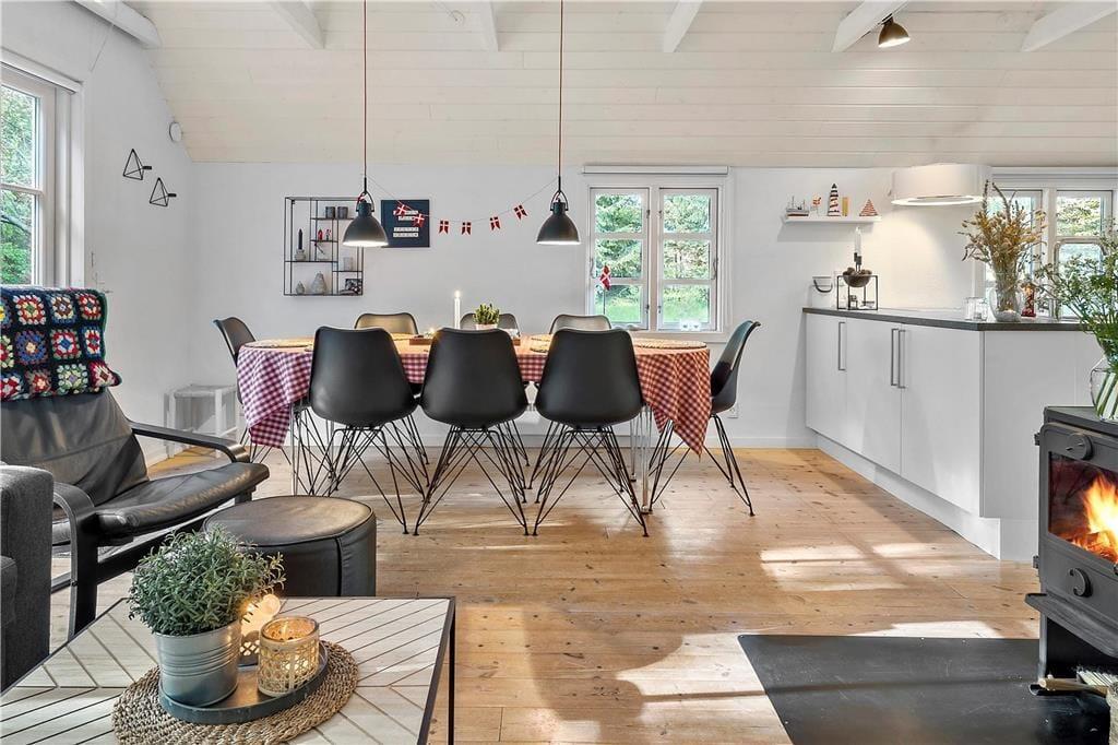 Unmittelbar nach dem ersten Betreten deines Ferienhauses spürst du, wie dich die schöne Wohnatmosphäre des Hauses einhüllt und dir unversehens ein Gefühl unbekannter Ruhe und Entspannung verleiht. Das Tageslicht bahnt sich seinen Weg durch die großen Fensterpartien und unterstreicht den gesamten Tag über die heimelige Atmosphäre. In diesem Ferienhaus genießt du das wertvolle Beisammensein mit deinen Lieben in vollen Zügen. Selbst wenn du in der Küche das Essen zubereitest, bist du mit deinen Familienmitgliedern verbunden, die beispielsweise am Esstisch Gesellschaftsspiele spielen oder es sich auf dem Sofa gemütlich gemacht haben. Du wirst schnell spüren, wie sich die Zeit dehnt, sodass viel Raum zum Reden, Lachen und für die kleinen Momente bleibt, die euch einander näherbringen. An kühlen Tagen und Abenden verwöhnt euch das behaglich knisternde Feuer im Kaminofen mit angenehmer Wärme und einer Ruhe, die den Urlaub noch erholsamer macht. Selbst euer Hund wird dieses Haus lieben und sich völlig entspannt zu deinen Füßen unter dem Tisch niederlassen.